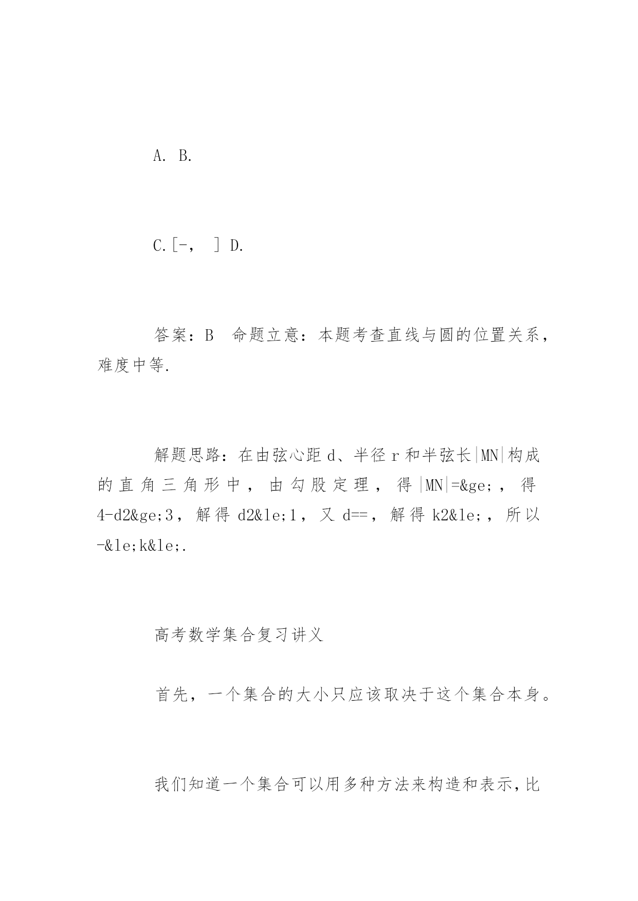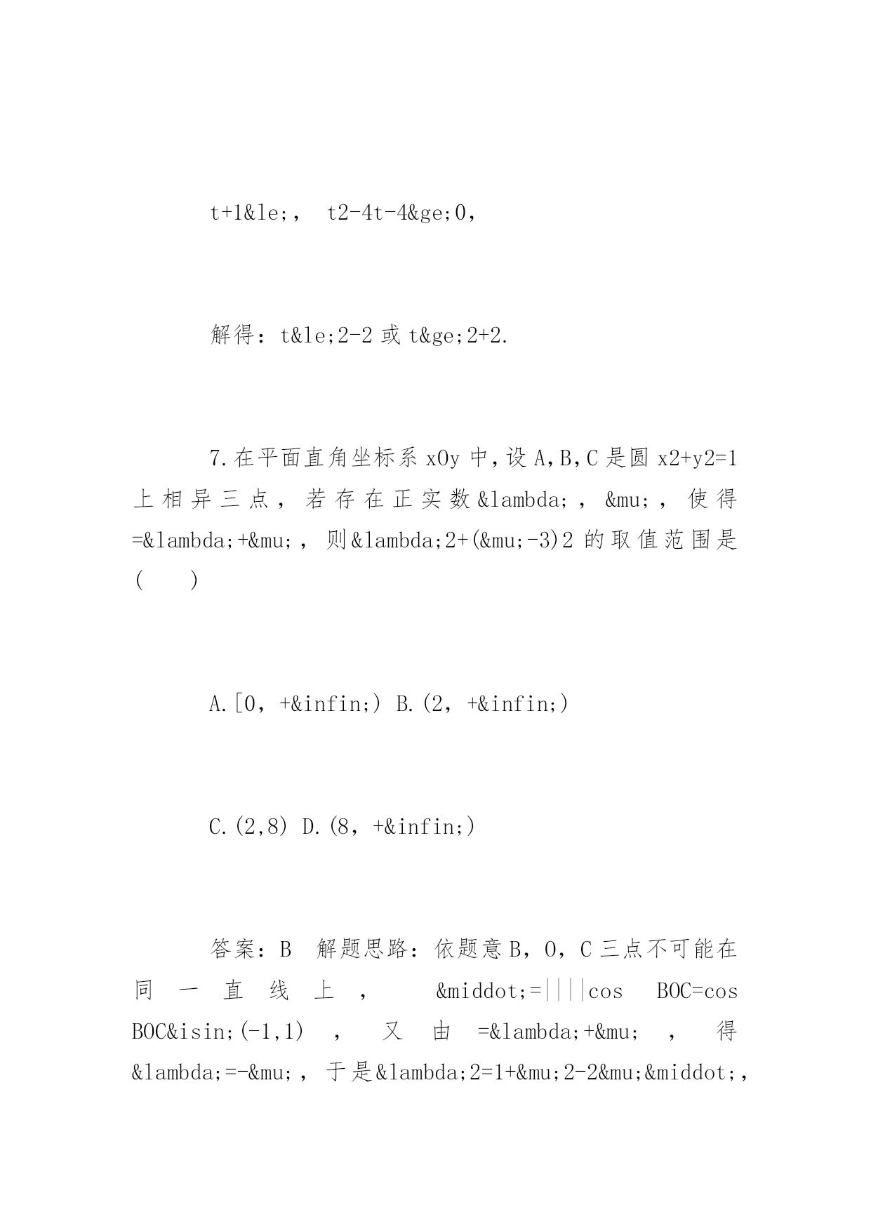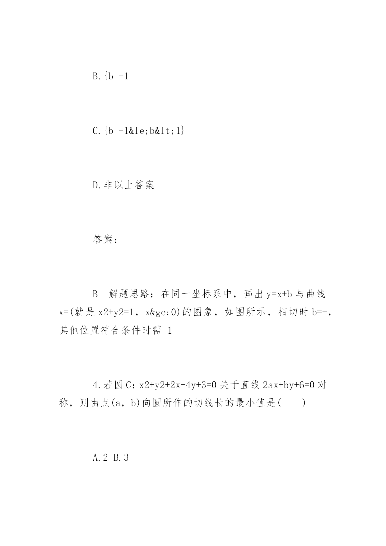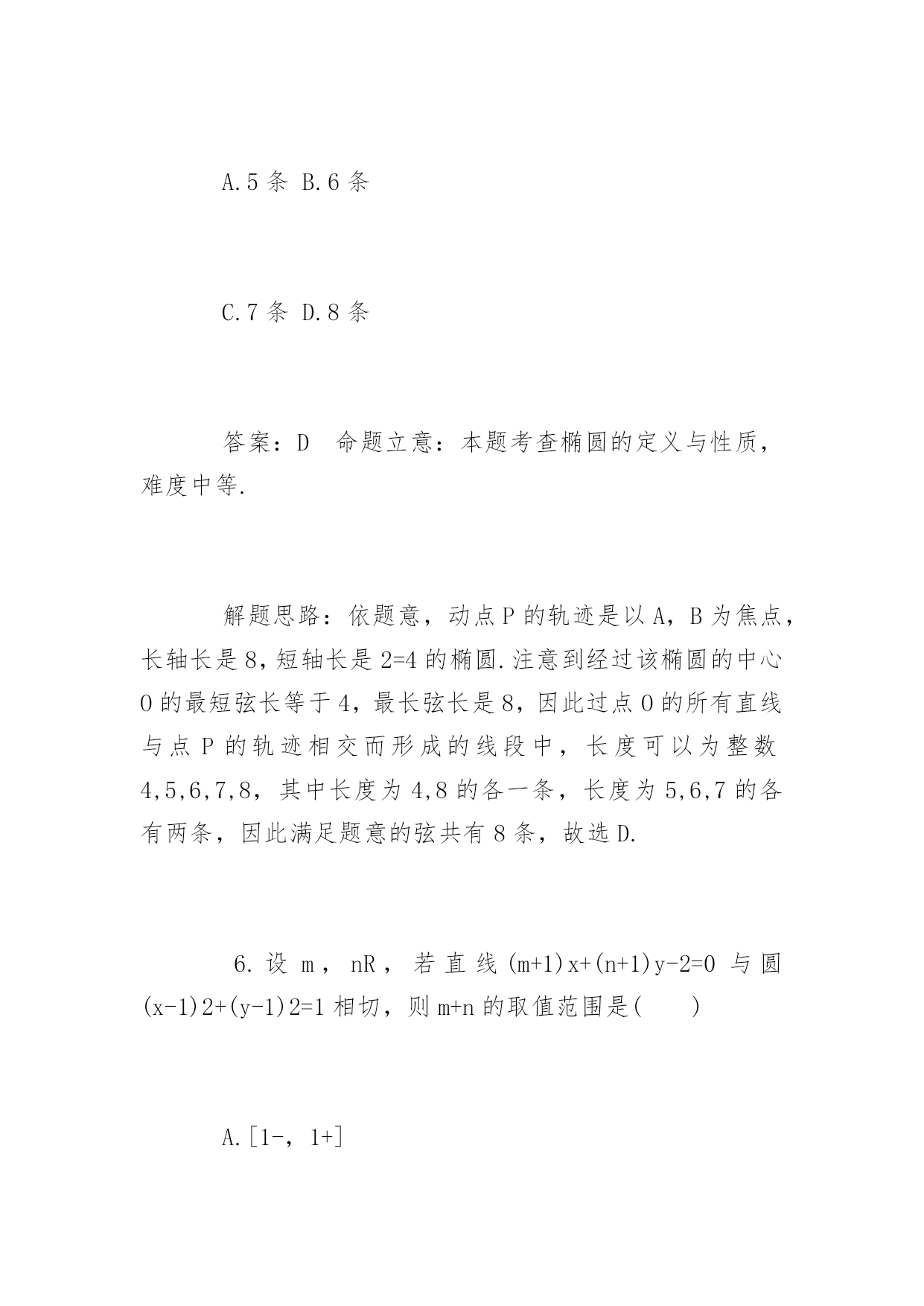 广东高考数学直线与圆的概念复习选择题2017广东高考数学直线与圆的概念复习选择题直线与圆是高考数学考试中的重要知识点,也是高考考试中比较容易拿分的知识点。以下是百分网小编给大家带来高考数学复习选择题,以供参阅。高考数学复习选择题1.平行四边形ABCD的一条对角线固定在A(3,-1),C(2,-3)两点,点D在直线3x-y+1=0上移动,则点B的轨迹方程为()A.3x-y-20=0B.3x-y+10=0C.3x-y-9=0D.3x-y-12=0答案:A解题思路:设AC的中点为O,即.设B(x,y)关于点O的对称点为(x0,y0),即D(x0,y0),则由3x0-y0+1=0,得3x-y-20=0.2.由直线y=x+1上的一点向圆(x-3)2+y2=1引切线,则切线长的最小值为()A.1B.2C.-2D.3答案:C解题思路:当该点是过圆心向直线引的垂线的交点时,切线长最小.因圆心(3,0)到直线的距离为d==2,所以切线长的最小值是l==.3.直线y=x+b与曲线x=有且只有一个交点,则b的取值范围是()A.{b||b|=}B.{b|-1C.{b|-1≤b<1}D.非以上答案答案:B解题思路:在同一坐标系中,画出y=x+b与曲线x=(就是x2+y2=1,x≥0)的图象,如图所示,相切时b=-,其他位置符合条件时需-14.若圆C:x2+y2+2x-4y+3=0关于直线2ax+by+6=0对称,则由点(a,b)向圆所作的切线长的最小值是()A.2B.3C.4D.6答案:C解题思路:圆的标准方程为(x+1)2+(y-2)2=2,所以圆心为(-1,2),半径为.因为圆关于直线2ax+by+6=0对称,所以圆心在直线2ax+by+6=0上,所以-2a+2b+6=0,即b=a-3,点(a,b)到圆心的距离为d====.所以当a=2时,d有最小值=3,此时切线长最小,为==4,故选C.5.已知动点P到两定点A,B的距离和为8,且|AB|=4,线段AB的中点为O,过点O的所有直线与点P的轨迹相交而形成的线段中,长度为整数的有()A.5条B.6条C.7条D.8条答案:D命题立意:本题考查椭圆的定义与性质,难度中等.解题思路:依题意,动点P的轨迹是以A,B为焦点,长轴长是8,短轴长是2=4的椭圆.注意到经过该椭圆的中心O的最短弦长等于4,最长弦长是8,因此过点O的所有直线与点P的轨迹相交而形成的线段中,长度可以为整数4,5,6,7,8,其中长度为4,8的各一条,长度为5,6,7的各有两条,因此满足题意的弦共有8条,故选D.6.设m,nR,若直线(m+1)x+(n+1)y-2=0与圆(x-1)2+(y-1)2=1相切,则m+n的取值范围是()A.[1-,1+]B.(-∞,1-][1+,+∞)C.[2-2,2+2]D.(-∞,2-2][2+2,+∞)答案:D解题思路:直线与圆相切,=1,|m+n|=,即mn=m+n+1,设m+n=t,则mn≤2=,t+1≤,t2-4t-4≥0,解得:t≤2-2或t≥2+2.7.在平面直角坐标系xOy中,设A,B,C是圆x2+y2=1上相异三点,若存在正实数λ,μ,使得=λ+μ,则λ2+(μ-3)2的取值范围是()A.[0,+∞)B.(2,+∞)C.(2,8)D.(8,+∞)答案:B解题思路:依题意B,O,C三点不可能在同一直线上,·=||||cosBOC=cosBOC∈(-1,1),又由=λ+μ,得λ=-μ,于是λ2=1+μ2-2μ·,记f(μ)=λ2+(μ-3)2.则f(μ)=1+μ2-2μ·+(μ-3)2=2μ2-6μ-2μ·+10,可知f(μ)>2μ2-8μ+10=2(μ-2)2+2≥2,且f(μ)<2μ2-4μ+10=2(μ-1)2+8无最大值,故λ2+(μ-3)2的取值范围为(2,+∞).8.已知圆C:x2+y2=1,点P(x0,y0)在直线x-y-2=0上,O为坐标原点,若圆C上存在一点Q,使得OPQ=30°,则x0的取值范围是()A.[-1,1]B.[0,1]C.[-2,2]D.[0,2]答案:D解析:由题知,在OPQ
