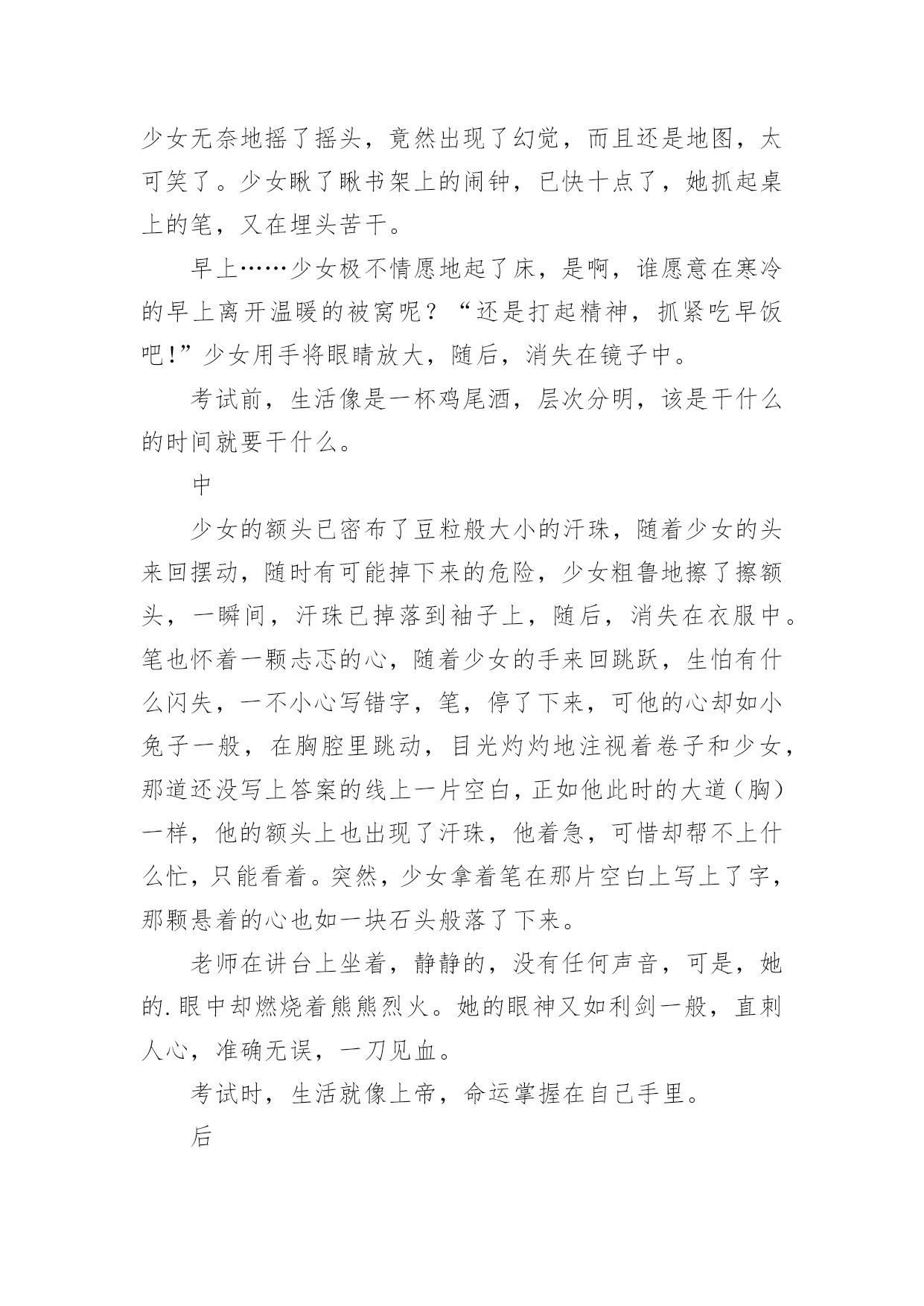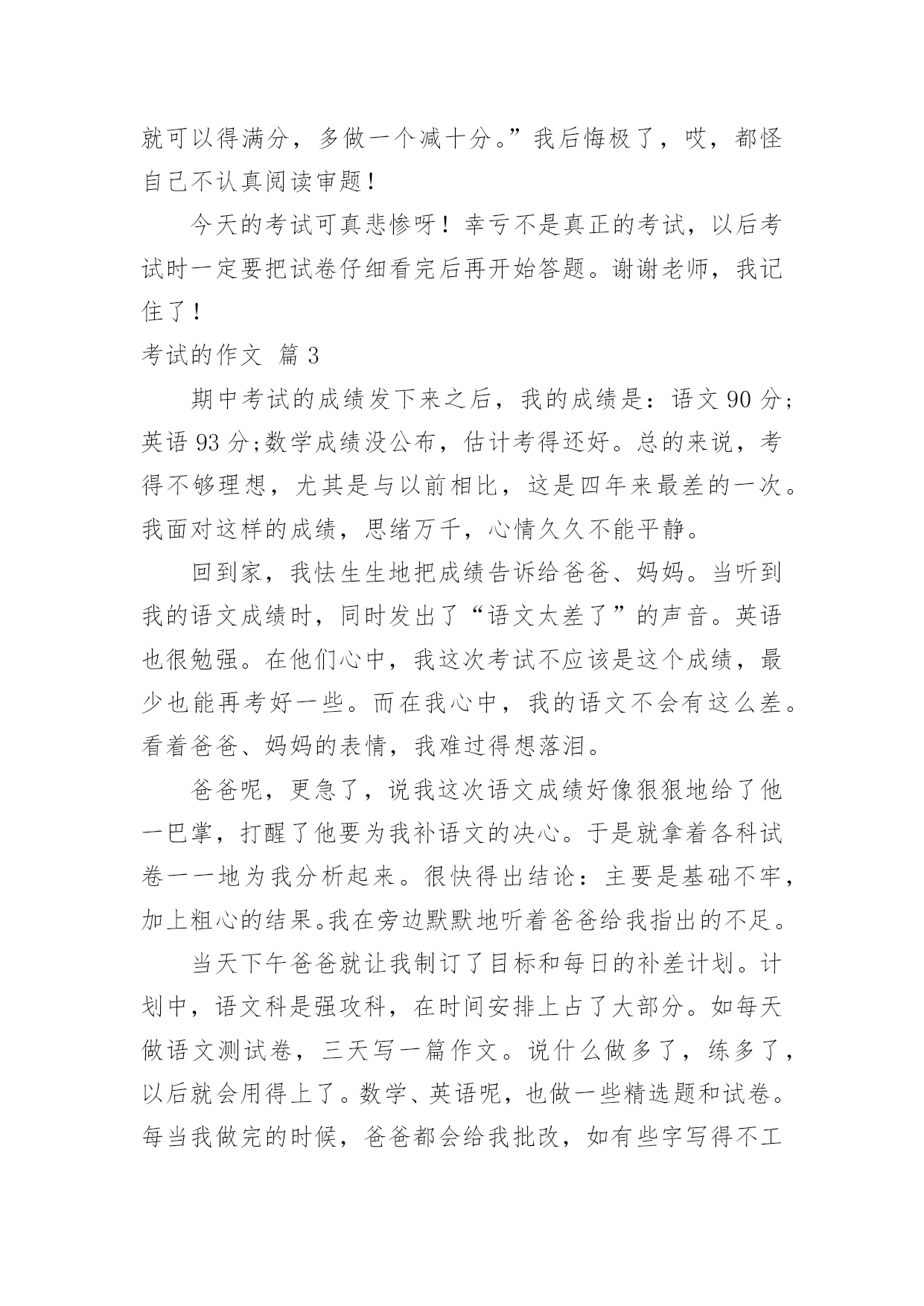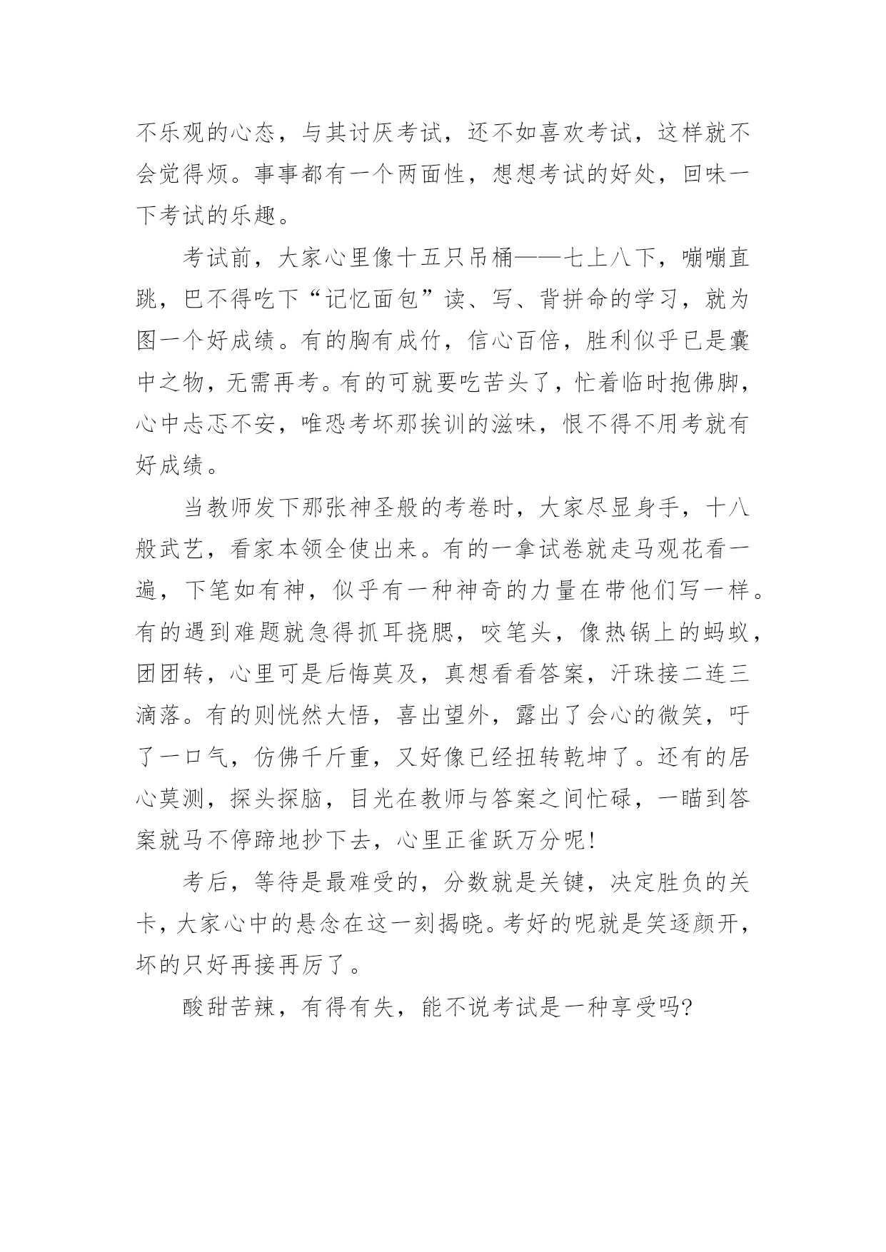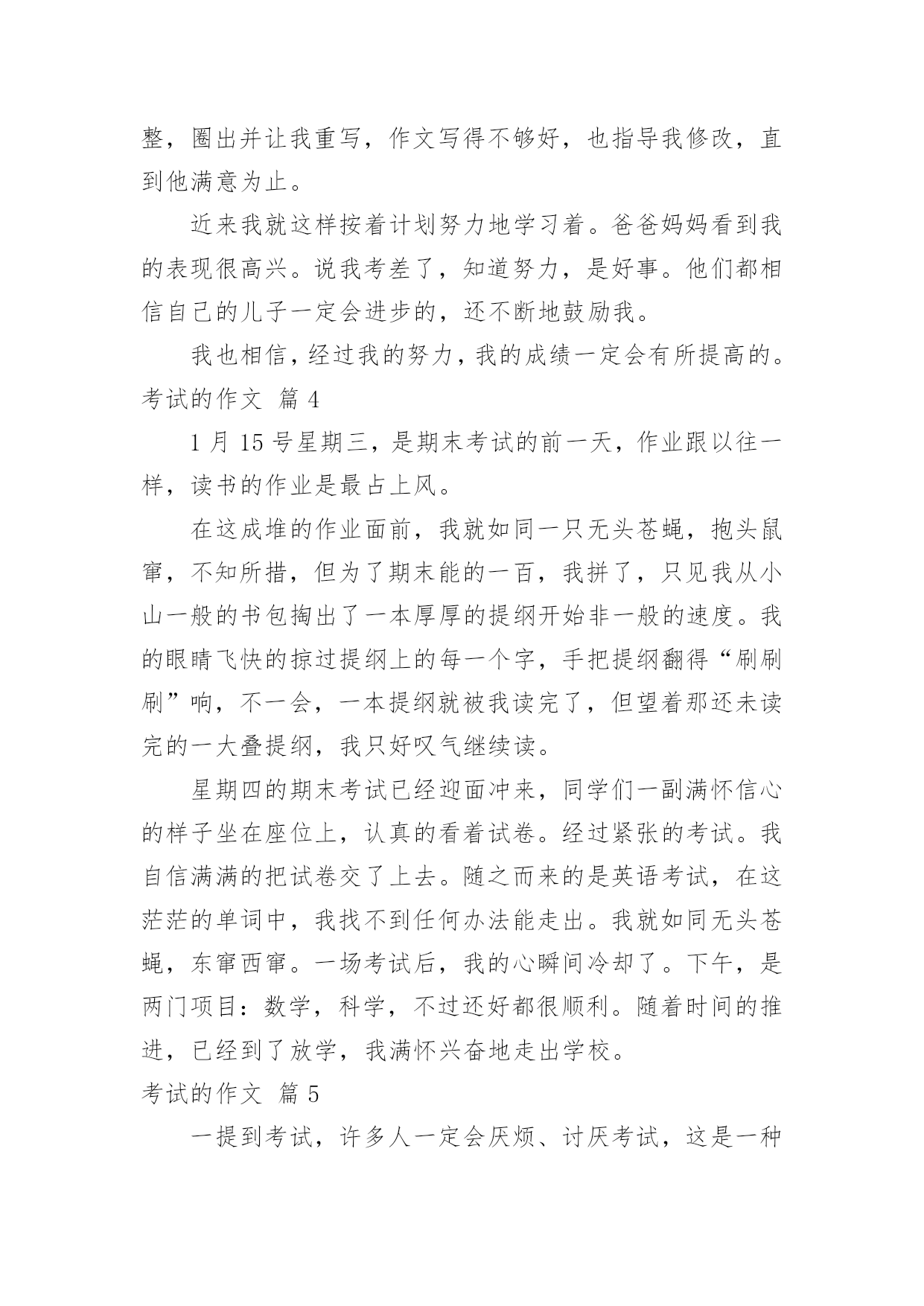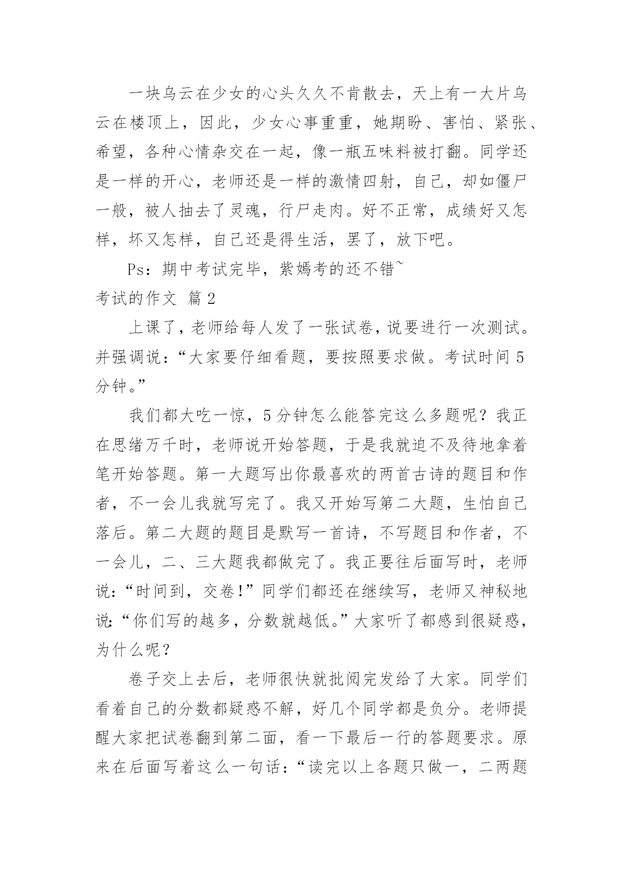 考试的作文【精华】考试的作文5篇在平平淡淡的学习、工作、生活中,大家都写过作文吧,借助作文可以提高我们的语言组织能力。你知道作文怎样才能写的好吗?以下是小编精心整理的考试的作文5篇,仅供参考,希望能够帮助到大家。考试的作文篇1细雨绵绵,小巧玲珑的雨点儿击打在窗上,如一只风铃被风吹拂,发出悦耳的声音。又如孩子大笑时发出的清脆的笑声。窗外的树木,也因风而舞动,如同雨中的精灵,在雨中跳舞,如此美景,若我是诗人的话,我一定会诗意大发,即兴发挥;若我是作家的话,我一定会大笔一挥,写出一篇优美的文章;若我是歌手的话,我一定会大展歌喉,唱出美妙的曲子;可惜,我什么也不是,只是一名普普通通的学生,而且,此时的我,也没那么多的雅兴,我的心情,正如窗外的天气一样,大雨倾盆。前回想考试前的场景,真的好像是一场梦,一场让人疲倦的梦。灯光微弱,照着一位苦读的人儿,她的手心已充满了汗水,笔已发出了痛苦的呻吟,孤独的背影映在了墙上,少女向窗外深情地看了一眼,阴云密布,“咦?天空上怎么有一幅地图?”少女难以置信的揉了揉,快要闭上了的双眼,再一看,没有,什么也没有,只有几颗星星发出微弱的光,少女无奈地摇了摇头,竟然出现了幻觉,而且还是地图,太可笑了。少女瞅了瞅书架上的闹钟,已快十点了,她抓起桌上的笔,又在埋头苦干。早上……少女极不情愿地起了床,是啊,谁愿意在寒冷的早上离开温暖的被窝呢?“还是打起精神,抓紧吃早饭吧!”少女用手将眼睛放大,随后,消失在镜子中。考试前,生活像是一杯鸡尾酒,层次分明,该是干什么的时间就要干什么。中少女的额头已密布了豆粒般大小的汗珠,随着少女的头来回摆动,随时有可能掉下来的危险,少女粗鲁地擦了擦额头,一瞬间,汗珠已掉落到袖子上,随后,消失在衣服中。笔也怀着一颗忐忑的心,随着少女的手来回跳跃,生怕有什么闪失,一不小心写错字,笔,停了下来,可他的心却如小兔子一般,在胸腔里跳动,目光灼灼地注视着卷子和少女,那道还没写上答案的线上一片空白,正如他此时的大道(胸)一样,他的额头上也出现了汗珠,他着急,可惜却帮不上什么忙,只能看着。突然,少女拿着笔在那片空白上写上了字,那颗悬着的心也如一块石头般落了下来。老师在讲台上坐着,静静的,没有任何声音,可是,她的.眼中却燃烧着熊熊烈火。她的眼神又如利剑一般,直刺人心,准确无误,一刀见血。考试时,生活就像上帝,命运掌握在自己手里。后一块乌云在少女的心头久久不肯散去,天上有一大片乌云在楼顶上,因此,少女心事重重,她期盼、害怕、紧张、希望,各种心情杂交在一起,像一瓶五味料被打翻。同学还是一样的开心,老师还是一样的激情四射,自己,却如僵尸一般,被人抽去了灵魂,行尸走肉。好不正常,成绩好又怎样,坏又怎样,自己还是得生活,罢了,放下吧。Ps:期中考试完毕,紫嫣考的还不错~考试的作文篇2上课了,老师给每人发了一张试卷,说要进行一次测试。并强调说:“大家要仔细看题,要按照要求做。考试时间5分钟。”我们都大吃一惊,5分钟怎么能答完这么多题呢?我正在思绪万千时,老师说开始答题,于是我就迫不及待地拿着笔开始答题。第一大题写出你最喜欢的两首古诗的题目和作者,不一会儿我就写完了。我又开始写第二大题,生怕自己落后。第二大题的题目是默写一首诗,不写题目和作者,不一会儿,二、三大题我都做完了。我正要往后面写时,老师说:“时间到,交卷!”同学们都还在继续写,老师又神秘地说:“你们写的越多,分数就越低。”大家听了都感到很疑惑,为什么呢?卷子交上去后,老师很快就批阅完发给了大家。同学们看着自己的分数都疑惑不解,好几个同学都是负分。老师提醒大家把试卷翻到第二面,看一下最后一行的答题要求。原来在后面写着这么一句话:“读完以上各题只做一,二两题就可以得满分,多做一个减十分。”我后悔极了,哎,都怪自己不认真阅读审题!今天的考试可真悲惨呀!幸亏不是真正的考试,以后考试时一定要把试卷仔细看完后再开始答题。谢谢老师,我记住了!考试的作文篇3期中考试的成绩发下来之后,我的成绩是:语文90分;英语93分;数学成绩没公布,估计考得还好。总的来说,考得不够理想,尤其是与以前相比,这是四年来最差的一次。我面对这样的成绩,思绪万千,心情久久不能平静。回到家,我怯生生地把成绩告诉给爸爸、妈妈。当听到我的语文成绩时,同时发出了“语文太差了”的声音。英语也很勉强。在他们心中,我这次考试不应该是这个成绩,最少也能再考好一些。而在我心中,我的语文不会有这么差。看着爸爸、妈妈的表情,我难过得想落泪。爸爸呢,更急了,说我这次语文成绩好像狠狠地给了他一巴掌,打醒了他要为我补语文的决心。于是就拿着各科试卷一一地为我分析起来。很快得出结论:主要是基础不牢,加上粗心的结果。我在旁边默默地听着爸爸给我指出的不足。当天下午爸爸就让我制订了目标和每日的补差计划。计划中,语文科是强攻科,在时间安