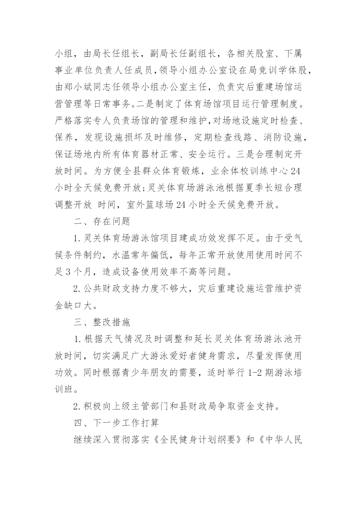 灾后重建设施运营管理工作总结灾后重建设施运营管理工作总结总结是在某一特定时间段对学习和工作生活或其完成情况,包括取得的成绩、存在的问题及得到的经验和教训加以回顾和分析的书面材料,它在我们的学习、工作中起到呈上启下的作用,不如我们来制定一份总结吧。那么总结应该包括什么内容呢?下面是小编精心整理的灾后重建设施运营管理工作总结,欢迎大家借鉴与参考,希望对大家有所帮助。县体育局灾后重建项目共2个:宝兴县业余体校训练中心和灵关体育场。宝兴县业余体校训练中心总投资800万元,总建筑面积1451.15平方米,固定升级看台521座,重建篮球场,改扩建公用厕所150平方米,新建1个旗台,升级相关配套功能用房600平方米,于20xx年8月投入使用并发挥效益;灵关体育场项目属灵关片区第二批打捆招标项目,规划总投资1249万,建设内容:游泳池1个(含全自动水处理设备、雨棚、洗浴、售票、管理等配套功能用房)、室外塑胶篮球场1个,项目于20xx年12月动工,20xx年12月完工,20xx年6月投入使用。现将相关运营管理情况汇报如下。一、管理使用情况一是成立了灾后重建公共体育设施运营管理工作领导小组,由局长任组长,副局长任副组长,各相关股室、下属事业单位负责人任成员,领导小组办公室设在局竞训学体股,由郑小斌同志任领导小组办公室主任,负责灾后重建场馆运营管理等日常事务。二是制定了体育场馆项目运行管理制度。严格落实专人负责场馆的管理和维护,对场地设施定时检查、保养,发现设施损坏及时维修,定期检查线路、消防设施,保证场地内所有体育器材正常、安全运行。三是合理制定开放时间。为方便全县群众体育锻炼,业余体校训练中心24小时全天候免费开放;灵关体育场游泳池根据夏季长短合理调整开放时间,室外篮球场24小时全天候免费开放。二、存在问题1.灵关体育场游泳馆项目建成功效发挥不足。由于受气候条件制约,水温常年偏低,每年正常开放使用使用时间不足3个月,造成设备使用效率不高等问题。2.公共财政支持力度不够大,灾后重建设施运营维护资金缺口大。三、整改措施1.根据天气情况及时调整和延长灵关体育场游泳池开放时间,切实满足广大游泳爱好者健身需求,尽量发挥使用功效。同时根据青少年朋友的需要,适时举行1-2期游泳培训班。2.积极向上级主管部门和县财政局争取资金支持。四、下一步工作打算继续深入贯彻落实《全民健身计划纲要》和《中华人民共和国体育法》等法律法规,提升体育场馆使用效率和社会效益,切实满足了广大健身爱好者的需求,推动我县全民健身事业健康持续发展。结合宝兴实际情况,拟对灵关游泳馆实行承包管理的经营模式引入竞争服务管理机制,将游泳馆的管理权和经营权交由公司或个人全权管理,实行自负盈亏模式,每年向政府缴纳一定的承包费,政府不给任何经费补贴。这样既减轻了政府的财政负担,也提高了体育场馆的对外开放利用率。