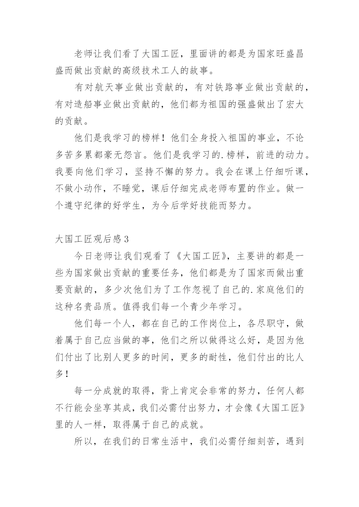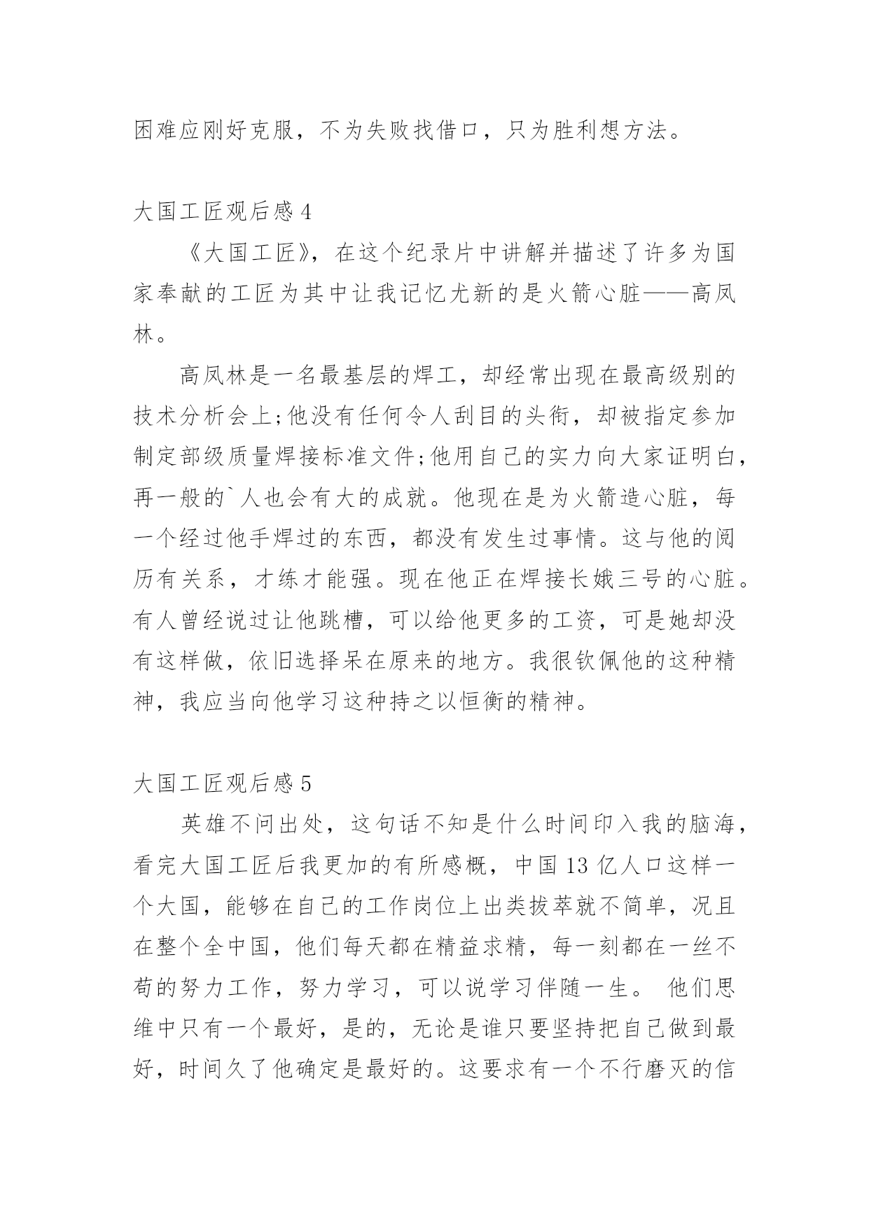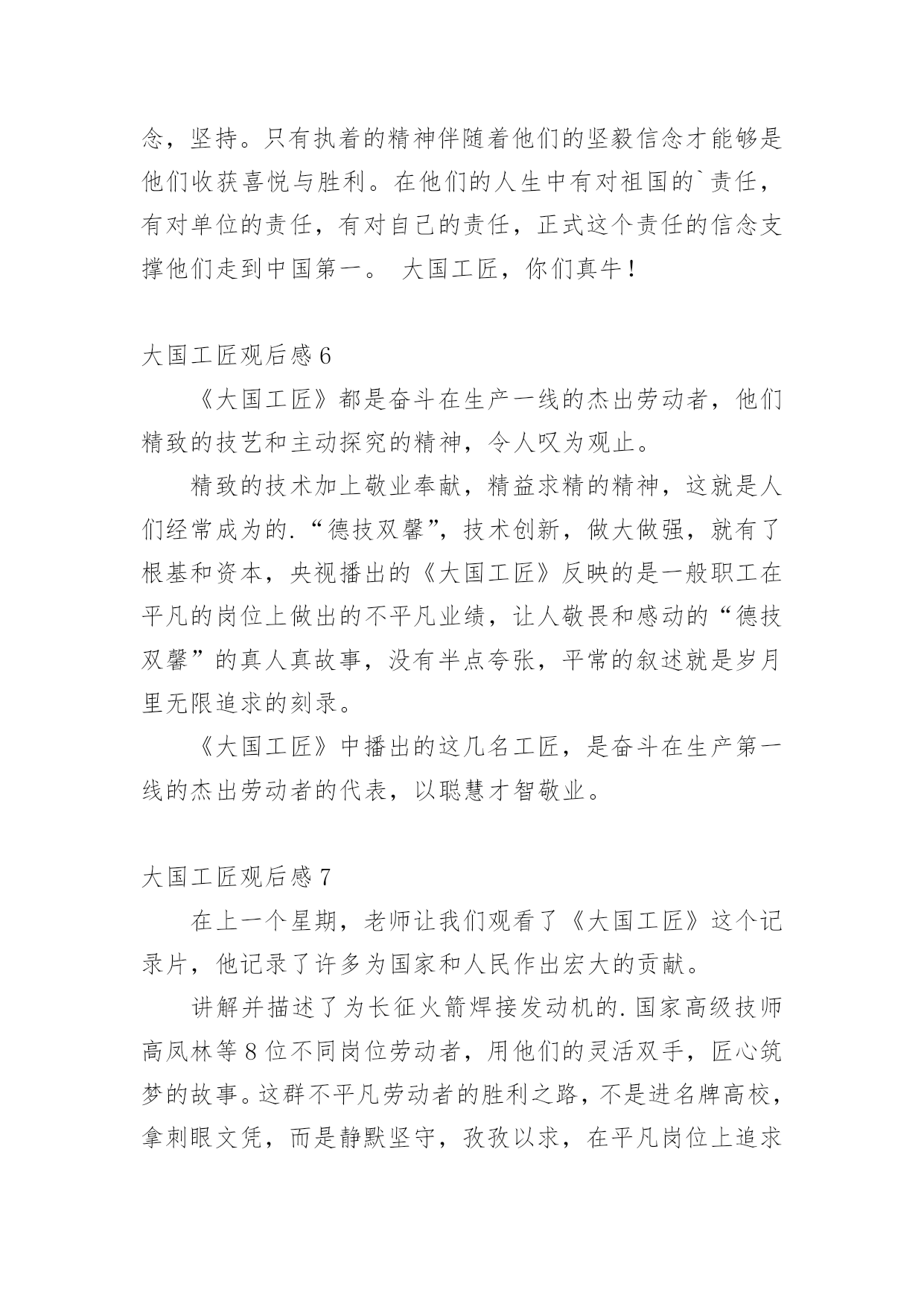 大国工匠观后感大国工匠观后感优选(7篇)在看完一部作品以后,一定有不少感悟吧,此时需要认真地做好记录,写写观后感了。你想知道观后感怎么写吗?以下是小编整理的大国工匠观后感,欢迎阅读,希望大家能够喜欢。大国工匠观后感1今日老师让我们观看了《大国工匠》,主要讲的都是一些为国家作出贡献的重要人物,他们都是为了国家而作出重要贡献的,多少次他们为了工作,忽视了自己的家庭,他们的'这种名贵品质值得我们每一个青少年学习。他们每一人,都在自己的工作岗位上,恪尽职守,做着属于自己应当做的事,他们之所以做的这么好,是因为他们付出了比别人更多的时间,更多的耐性,他们付出的比人多!每一分成就的取得,背上肯定会有非常的努力,任何人都不行能会坐享其成,我们必需付出努力,才会像《大国工匠》里得人一样,取得属于自己的胜利。所以,在我们的日常生活中,我们必需仔细刻苦,遇到困难应刚好克服,部位失败找借口,只为胜利想方法。大国工匠观后感2老师让我们看了大国工匠,里面讲的都是为国家旺盛昌盛而做出贡献的高级技术工人的故事。有对航天事业做出贡献的,有对铁路事业做出贡献的,有对造船事业做出贡献的,他们都为祖国的强盛做出了宏大的贡献。他们是我学习的榜样!他们全身投入祖国的事业,不论多苦多累都豪无怨言。他们是我学习的.榜样,前进的动力。我要向他们学习,坚持不懈的努力。我会在课上仔细听课,不做小动作,不睡觉,课后仔细完成老师布置的作业。做一个遵守纪律的好学生,为今后学好技能而努力。大国工匠观后感3今日老师让我们观看了《大国工匠》,主要讲的都是一些为国家做出贡献的重要任务,他们都是为了国家而做出重要贡献的,多少次他们为了工作忽视了自己的.家庭他们的这种名贵品质。值得我们每一个青少年学习。他们每一个人,都在自己的工作岗位上,各尽职守,做着属于自己应当做的事,他们之所以做得这么好,是因为他们付出了比别人更多的时间,更多的耐性,他们付出的比人多!每一分成就的取得,背上肯定会非常的努力,任何人都不行能会坐享其成,我们必需付出努力,才会像《大国工匠》里的人一样,取得属于自己的成就。所以,在我们的日常生活中,我们必需仔细刻苦,遇到困难应刚好克服,不为失败找借口,只为胜利想方法。大国工匠观后感4《大国工匠》,在这个纪录片中讲解并描述了许多为国家奉献的工匠为其中让我记忆尤新的是火箭心脏——高凤林。高凤林是一名最基层的焊工,却经常出现在最高级别的技术分析会上;他没有任何令人刮目的头衔,却被指定参加制定部级质量焊接标准文件;他用自己的实力向大家证明白,再一般的`人也会有大的成就。他现在是为火箭造心脏,每一个经过他手焊过的东西,都没有发生过事情。这与他的阅历有关系,才练才能强。现在他正在焊接长娥三号的心脏。有人曾经说过让他跳槽,可以给他更多的工资,可是她却没有这样做,依旧选择呆在原来的地方。我很钦佩他的这种精神,我应当向他学习这种持之以恒衡的精神。大国工匠观后感5英雄不问出处,这句话不知是什么时间印入我的脑海,看完大国工匠后我更加的有所感概,中国13亿人口这样一个大国,能够在自己的工作岗位上出类拔萃就不简单,况且在整个全中国,他们每天都在精益求精,每一刻都在一丝不苟的努力工作,努力学习,可以说学习伴随一生。他们思维中只有一个最好,是的,无论是谁只要坚持把自己做到最好,时间久了他确定是最好的。这要求有一个不行磨灭的信念,坚持。只有执着的精神伴随着他们的坚毅信念才能够是他们收获喜悦与胜利。在他们的人生中有对祖国的`责任,有对单位的责任,有对自己的责任,正式这个责任的信念支撑他们走到中国第一。大国工匠,你们真牛!大国工匠观后感6《大国工匠》都是奋斗在生产一线的杰出劳动者,他们精致的技艺和主动探究的精神,令人叹为观止。精致的技术加上敬业奉献,精益求精的精神,这就是人们经常成为的.“德技双馨”,技术创新,做大做强,就有了根基和资本,央视播出的《大国工匠》反映的是一般职工在平凡的岗位上做出的不平凡业绩,让人敬畏和感动的“德技双馨”的真人真故事,没有半点夸张,平常的叙述就是岁月里无限追求的刻录。《大国工匠》中播出的这几名工匠,是奋斗在生产第一线的杰出劳动者的代表,以聪慧才智敬业。大国工匠观后感7在上一个星期,老师让我们观看了《大国工匠》这个记录片,他记录了许多为国家和人民作出宏大的贡献。讲解并描述了为长征火箭焊接发动机的.国家高级技师高凤林等8位不同岗位劳动者,用他们的灵活双手,匠心筑梦的故事。这群不平凡劳动者的胜利之路,不是进名牌高校,拿刺眼文凭,而是静默坚守,孜孜以求,在平凡岗位上追求职业技能的完备和极致,最终脱颖而出,跻身“国家级”技工行列,成为一个领域不行或缺的人才。我们都应当像他们学习,做一个有用的人。