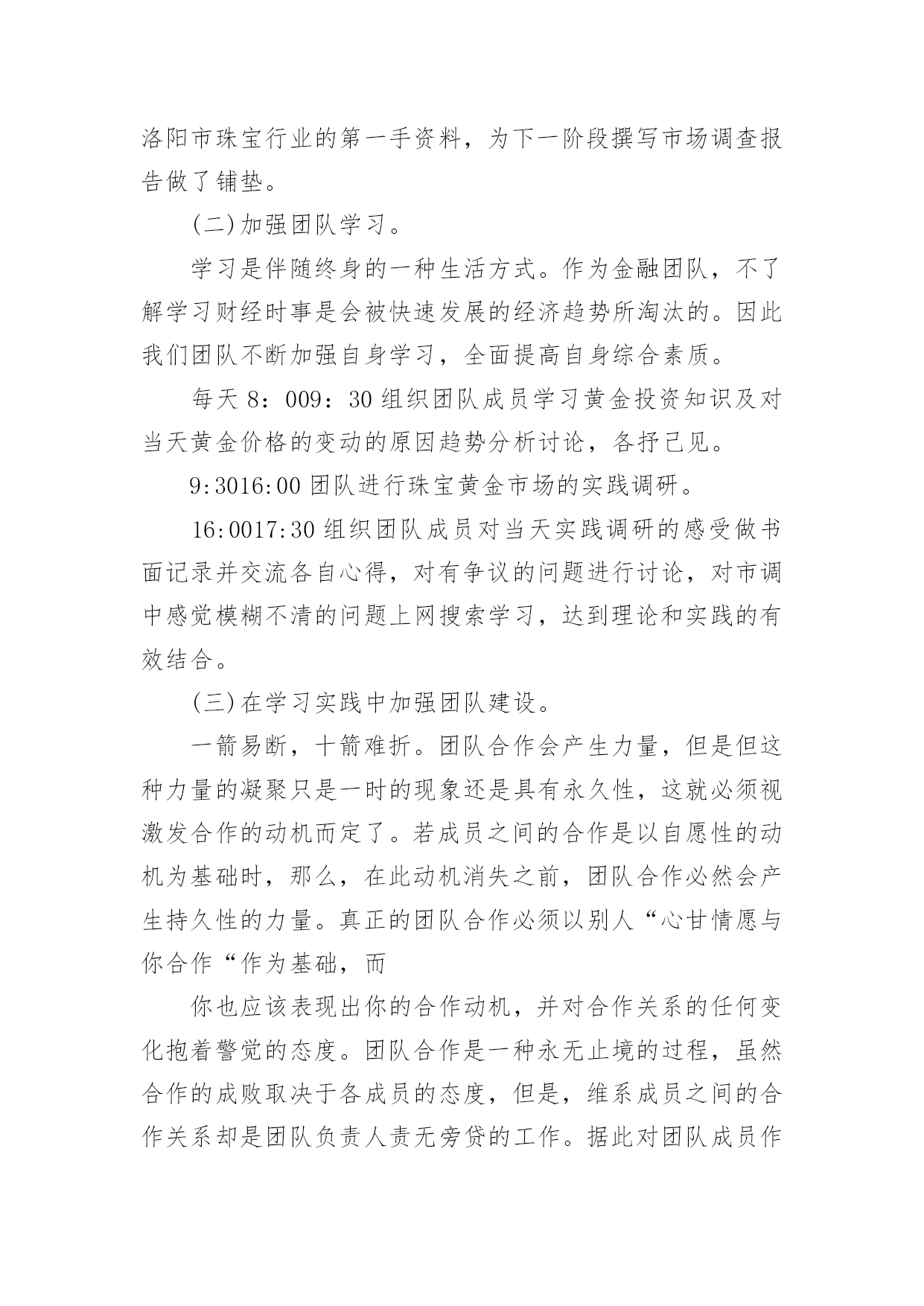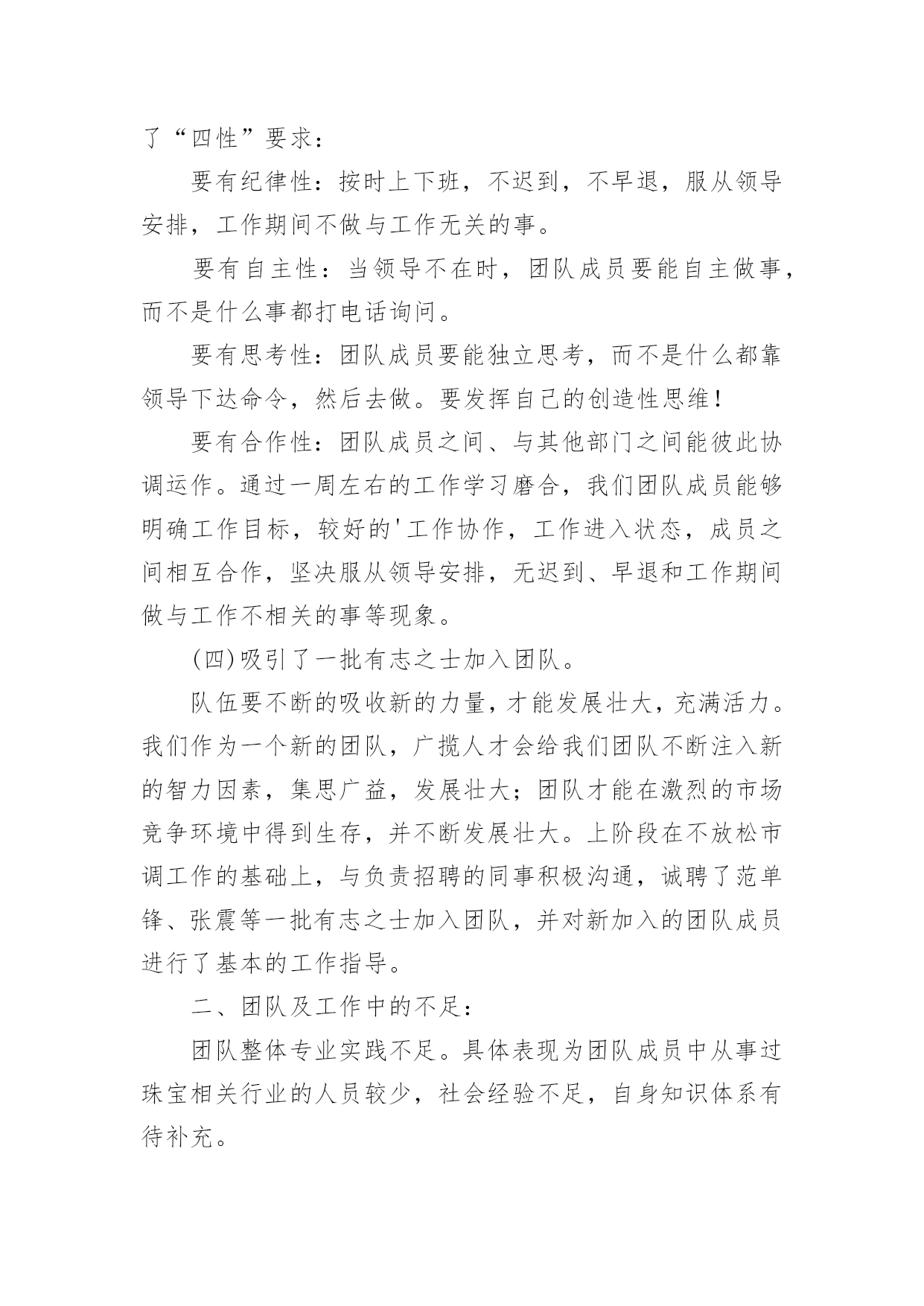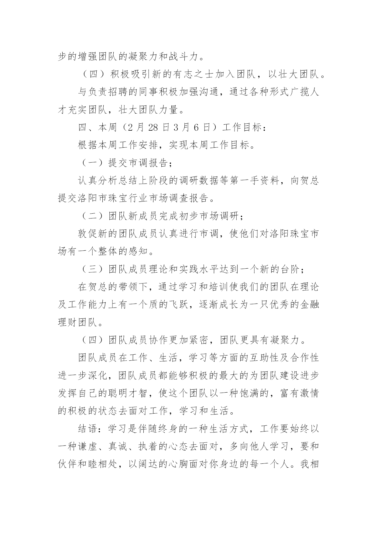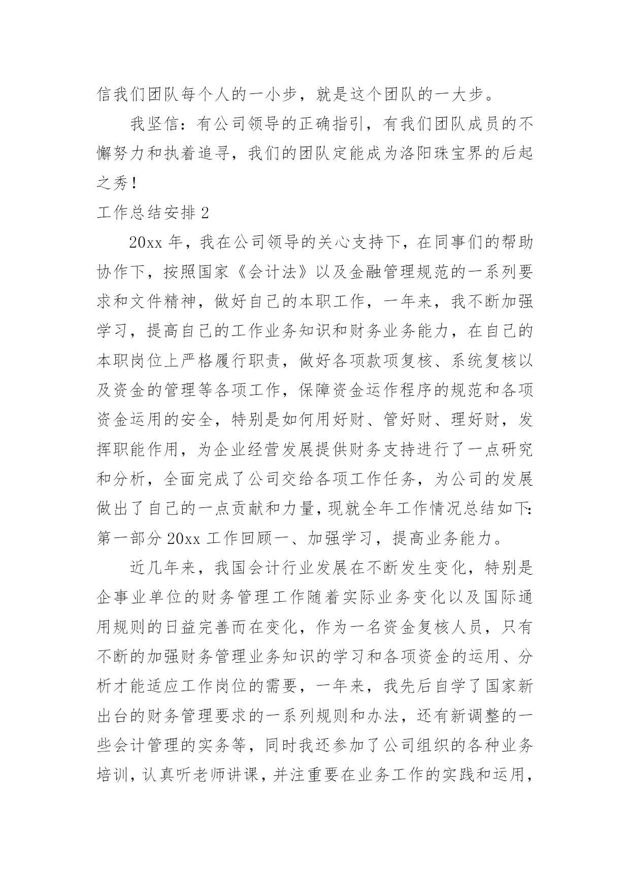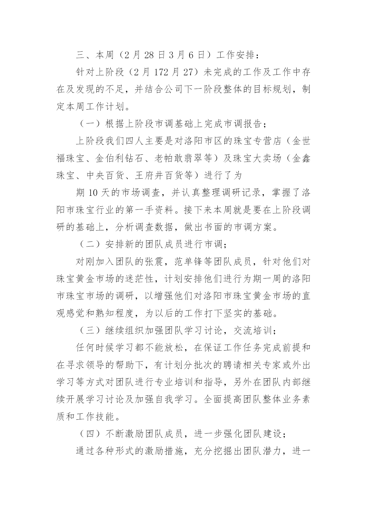 工作总结安排工作总结安排总结是事后对某一阶段的学习、工作或其完成情况加以回顾和分析的一种书面材料,通过它可以正确认识以往学习和工作中的优缺点,让我们一起来学习写总结吧。总结怎么写才是正确的呢?以下是小编为大家收集的工作总结安排,欢迎大家分享。工作总结安排1尊敬的x总:您好!作为黄金投资团队的暂时负责人,在这里我代表我们团队向您汇报一下上一阶段(2月172月27日)我们团队的总体工作情况和下周(2月283月6日)的主要工作安排。一、上阶段(2月172月27)主要工作:(一)实地调研。“实践是检验真理的唯一标准”。为了更直观的了解洛阳黄金珠宝市场,了解主要竞争对手状况,为了下一步做好工作做准备,也为了更好的把所学理论联系到实践的工作中去,铁真真、沈浩、孙智超和我对洛阳市区主要的珠宝专营店(金世福珠宝、金伯利钻石、老帕敢翡翠等)及珠宝大卖场(金鑫珠宝、中央百货、王府井百货等)通过各种方式进行了为期10天的市场调查,并认真整理调研记录,掌握了洛阳市珠宝行业的第一手资料,为下一阶段撰写市场调查报告做了铺垫。(二)加强团队学习。学习是伴随终身的一种生活方式。作为金融团队,不了解学习财经时事是会被快速发展的经济趋势所淘汰的。因此我们团队不断加强自身学习,全面提高自身综合素质。每天8:009:30组织团队成员学习黄金投资知识及对当天黄金价格的变动的原因趋势分析讨论,各抒己见。9:3016:00团队进行珠宝黄金市场的实践调研。16:0017:30组织团队成员对当天实践调研的感受做书面记录并交流各自心得,对有争议的问题进行讨论,对市调中感觉模糊不清的问题上网搜索学习,达到理论和实践的有效结合。(三)在学习实践中加强团队建设。一箭易断,十箭难折。团队合作会产生力量,但是但这种力量的凝聚只是一时的现象还是具有永久性,这就必须视激发合作的动机而定了。若成员之间的合作是以自愿性的动机为基础时,那么,在此动机消失之前,团队合作必然会产生持久性的力量。真正的团队合作必须以别人“心甘情愿与你合作“作为基础,而你也应该表现出你的合作动机,并对合作关系的任何变化抱着警觉的态度。团队合作是一种永无止境的过程,虽然合作的成败取决于各成员的态度,但是,维系成员之间的合作关系却是团队负责人责无旁贷的工作。据此对团队成员作了“四性”要求:要有纪律性:按时上下班,不迟到,不早退,服从领导安排,工作期间不做与工作无关的事。要有自主性:当领导不在时,团队成员要能自主做事,而不是什么事都打电话询问。要有思考性:团队成员要能独立思考,而不是什么都靠领导下达命令,然后去做。要发挥自己的创造性思维!要有合作性:团队成员之间、与其他部门之间能彼此协调运作。通过一周左右的工作学习磨合,我们团队成员能够明确工作目标,较好的'工作协作,工作进入状态,成员之间相互合作,坚决服从领导安排,无迟到、早退和工作期间做与工作不相关的事等现象。(四)吸引了一批有志之士加入团队。队伍要不断的吸收新的力量,才能发展壮大,充满活力。我们作为一个新的团队,广揽人才会给我们团队不断注入新的智力因素,集思广益,发展壮大;团队才能在激烈的市场竞争环境中得到生存,并不断发展壮大。上阶段在不放松市调工作的基础上,与负责招聘的同事积极沟通,诚聘了范单锋、张震等一批有志之士加入团队,并对新加入的团队成员进行了基本的工作指导。二、团队及工作中的不足:团队整体专业实践不足。具体表现为团队成员中从事过珠宝相关行业的人员较少,社会经验不足,自身知识体系有待补充。三、本周(2月28日3月6日)工作安排:针对上阶段(2月172月27)未完成的工作及工作中存在及发现的不足,并结合公司下一阶段整体的目标规划,制定本周工作计划。(一)根据上阶段市调基础上完成市调报告;上阶段我们四人主要是对洛阳市区的珠宝专营店(金世福珠宝、金伯利钻石、老帕敢翡翠等)及珠宝大卖场(金鑫珠宝、中央百货、王府井百货等)进行了为期10天的市场调查,并认真整理调研记录,掌握了洛阳市珠宝行业的第一手资料。接下来本周就是要在上阶段调研的基础上,分析调查数据,做出书面的市调方案。(二)安排新的团队成员进行市调;对刚加入团队的张震,范单锋等团队成员,针对他们对珠宝黄金市场的迷茫性,计划安排他们进行为期一周的洛阳市珠宝市场的调研,以增强他们对洛阳市珠宝黄金市场的直观感觉和熟知程度,为以后的工作打下坚实的基础。(三)继续组织加强团队学习讨论,交流培训;任何时候学习都不能放松,在保证工作任务完成前提和在寻求领导的帮助下,有计划分批次的聘请相关专家或外出学习等方式对团队进行专业培训和指导,另外在团队内部继续开展学习讨论及加强自我学习。全面提高团队整体业务素质和工作技能。(四)不断激励团队成员,进一步强化团队建设;通过各种形式的激励措施,充分挖掘出团队潜力,进一步的增强团队的凝聚力和战斗