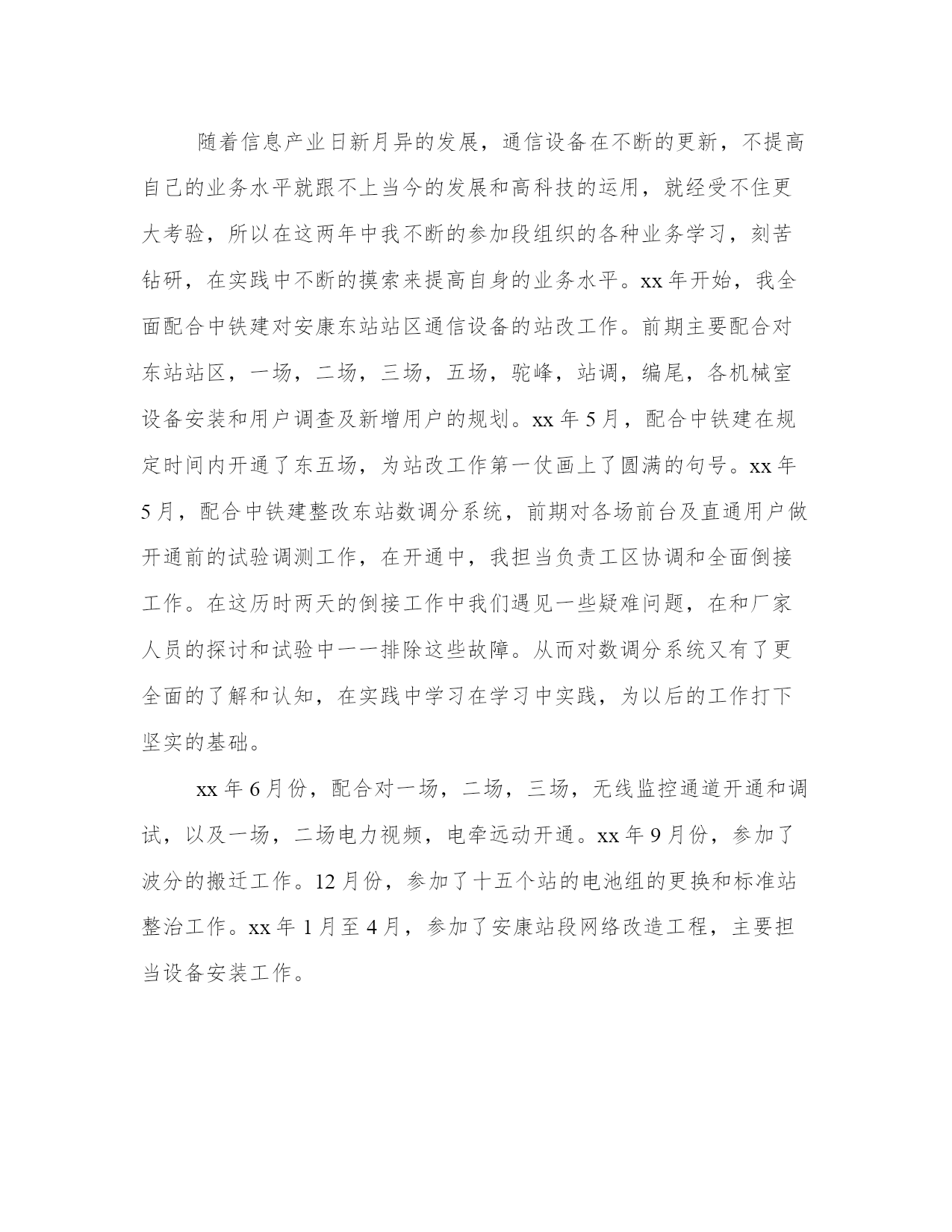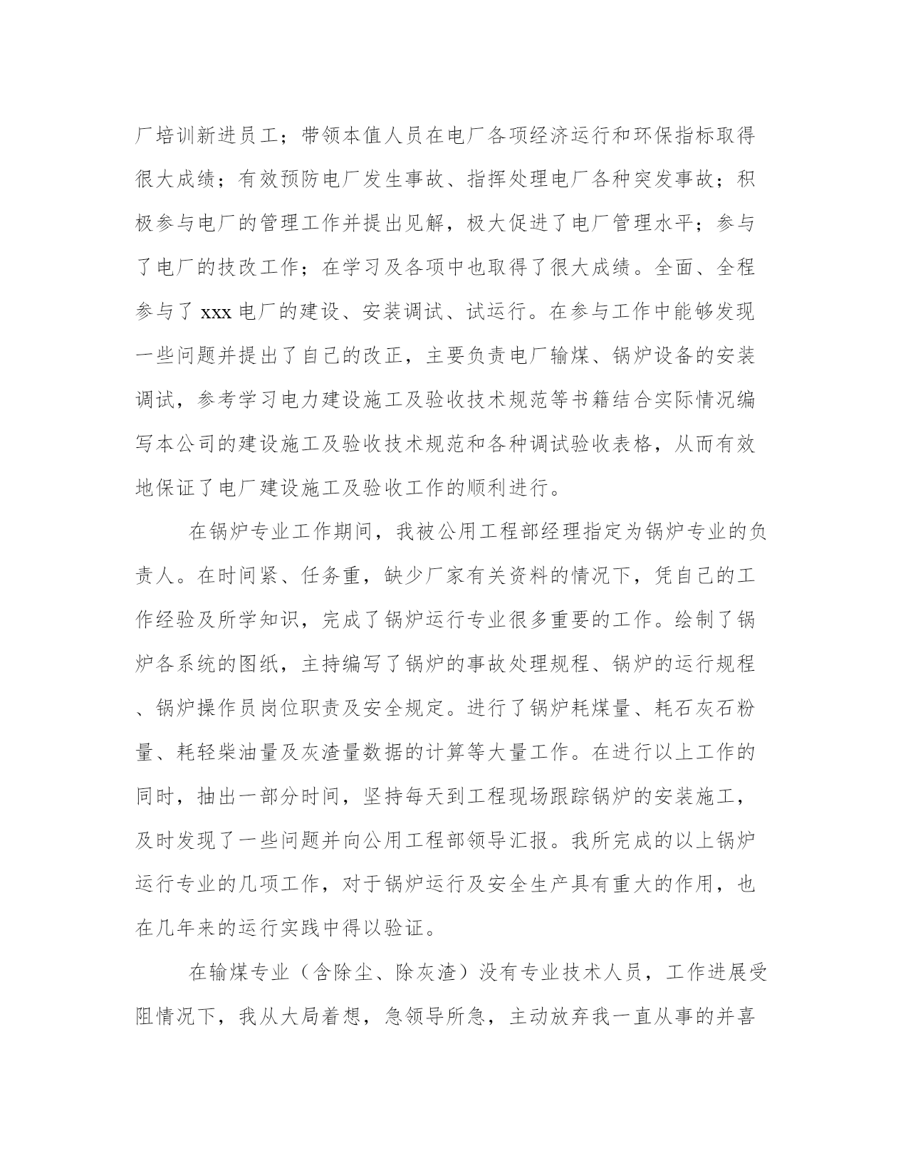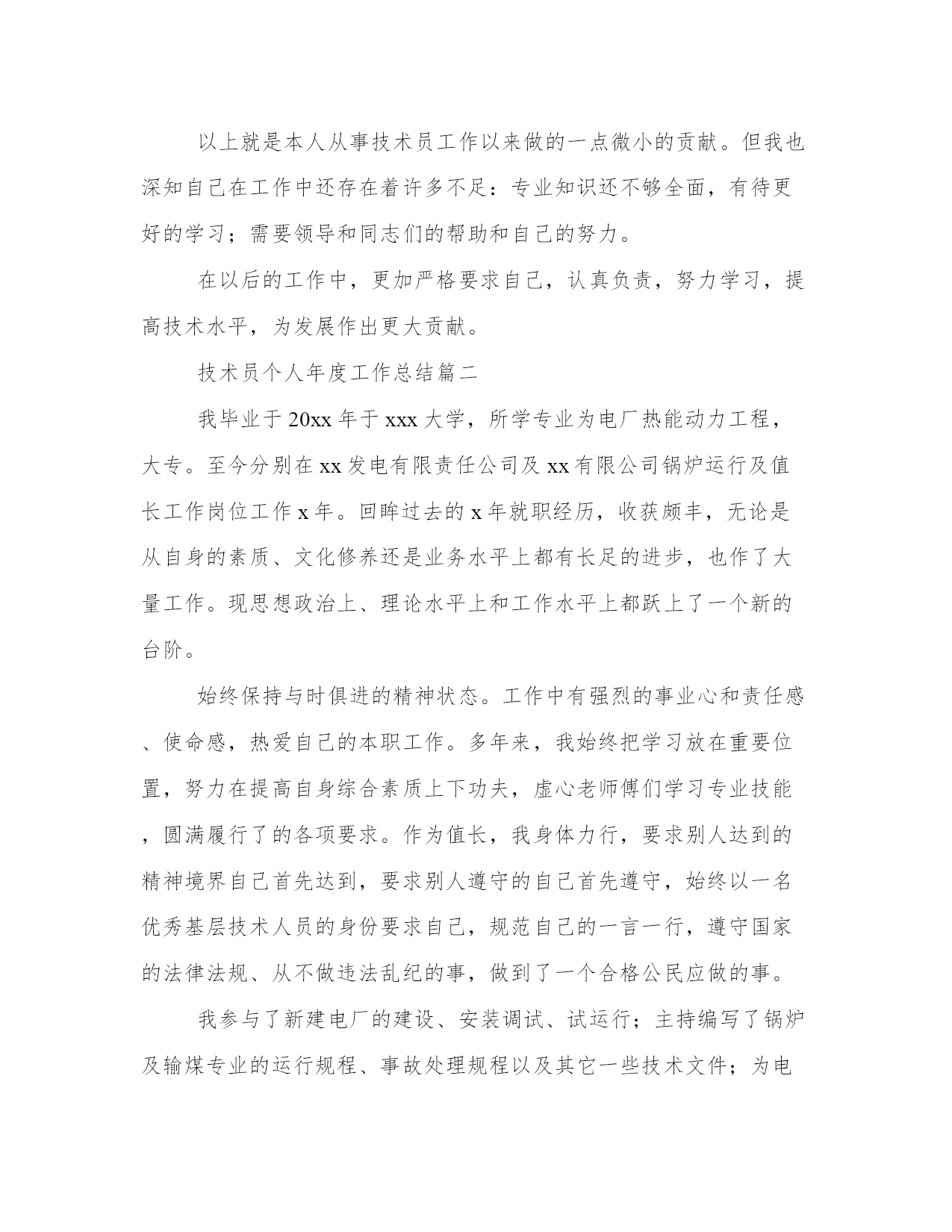 最新技术员个人年度工作总结(模板9篇)当工作或学习进行到一定阶段或告一段落时,需要回过头来对所做的工作认真地分析分析一下,肯定成绩,找出问题,归纳出经验教训,提高认识,明确方向,以便进一步做好工作,并把这些用文字表述出来,就叫做总结。大家想知道怎么样才能写一篇比较优质的总结吗?以下是小编为大家收集的总结范文,仅供参考,大家一起来看看吧。技术员个人年度工作总结篇一我叫,xx年参加工作,同年元月分配到电务段东站电缆,在各级领导的关怀和精心指导下,我勤奋工作,在通信工作岗位上始终本着以生产运输为中心,贯彻"安全第一,预防为主"的方针。工作期间先后接触了集中机、区转机、音频分机、自动电话、专用通信网络的维护工作,具备了较强的实际工作能力。xx年10月经上级考核被聘任为技术员。到现在我被授予技术员职务已有四年,且其它条件也符合评审助理工程师的资格,现将近几年的工作总结如下,请段领导审核评定。自xx年担任工长以来,工作认真,负责,敬业,并得到上级好评。期间被评为企业"优秀员工"称号,xx年7月,撤销,合并任技术员。随着信息产业日新月异的发展,通信设备在不断的更新,不提高自己的业务水平就跟不上当今的发展和高科技的运用,就经受不住更大考验,所以在这两年中我不断的参加段组织的各种业务学习,刻苦钻研,在实践中不断的摸索来提高自身的业务水平。xx年开始,我全面配合中铁建对安康东站站区通信设备的站改工作。前期主要配合对东站站区,一场,二场,三场,五场,驼峰,站调,编尾,各机械室设备安装和用户调查及新增用户的规划。xx年5月,配合中铁建在规定时间内开通了东五场,为站改工作第一仗画上了圆满的句号。xx年5月,配合中铁建整改东站数调分系统,前期对各场前台及直通用户做开通前的试验调测工作,在开通中,我担当负责工区协调和全面倒接工作。在这历时两天的倒接工作中我们遇见一些疑难问题,在和厂家人员的探讨和试验中一一排除这些故障。从而对数调分系统又有了更全面的了解和认知,在实践中学习在学习中实践,为以后的工作打下坚实的基础。xx年6月份,配合对一场,二场,三场,无线监控通道开通和调试,以及一场,二场电力视频,电牵远动开通。xx年9月份,参加了波分的搬迁工作。12月份,参加了十五个站的电池组的更换和标准站整治工作。xx年1月至4月,参加了安康站段网络改造工程,主要担当设备安装工作。以上就是本人从事技术员工作以来做的一点微小的贡献。但我也深知自己在工作中还存在着许多不足:专业知识还不够全面,有待更好的学习;需要领导和同志们的帮助和自己的努力。在以后的工作中,更加严格要求自己,认真负责,努力学习,提高技术水平,为发展作出更大贡献。技术员个人年度工作总结篇二我毕业于20xx年于xxx大学,所学专业为电厂热能动力工程,大专。至今分别在xx发电有限责任公司及xx有限公司锅炉运行及值长工作岗位工作x年。回眸过去的x年就职经历,收获颇丰,无论是从自身的素质、文化修养还是业务水平上都有长足的进步,也作了大量工作。现思想政治上、理论水平上和工作水平上都跃上了一个新的台阶。始终保持与时俱进的精神状态。工作中有强烈的事业心和责任感、使命感,热爱自己的本职工作。多年来,我始终把学习放在重要位置,努力在提高自身综合素质上下功夫,虚心老师傅们学习专业技能,圆满履行了的各项要求。作为值长,我身体力行,要求别人达到的精神境界自己首先达到,要求别人遵守的自己首先遵守,始终以一名优秀基层技术人员的身份要求自己,规范自己的一言一行,遵守国家的法律法规、从不做违法乱纪的事,做到了一个合格公民应做的事。我参与了新建电厂的建设、安装调试、试运行;主持编写了锅炉及输煤专业的运行规程、事故处理规程以及其它一些技术文件;为电厂培训新进员工;带领本值人员在电厂各项经济运行和环保指标取得很大成绩;有效预防电厂发生事故、指挥处理电厂各种突发事故;积极参与电厂的管理工作并提出见解,极大促进了电厂管理水平;参与了电厂的技改工作;在学习及各项中也取得了很大成绩。全面、全程参与了xxx电厂的建设、安装调试、试运行。在参与工作中能够发现一些问题并提出了自己的改正,主要负责电厂输煤、锅炉设备的安装调试,参考学习电力建设施工及验收技术规范等书籍结合实际情况编写本公司的建设施工及验收技术规范和各种调试验收表格,从而有效地保证了电厂建设施工及验收工作的顺利进行。在锅炉专业工作期间,我被公用工程部经理指定为锅炉专业的负责人。在时间紧、任务重,缺少厂家有关资料的情况下,凭自己的工作经验及所学知识,完成了锅炉运行专业很多重要的工作。绘制了锅炉各系统的图纸,主持编写了锅炉的事故处理规程、锅炉的运行规程、锅炉操作员岗位职责及安全规定。进行了锅炉耗煤量、耗石灰石粉量、耗轻柴油量及灰渣量数据的计算等大量工作。在进行以上工作的同时