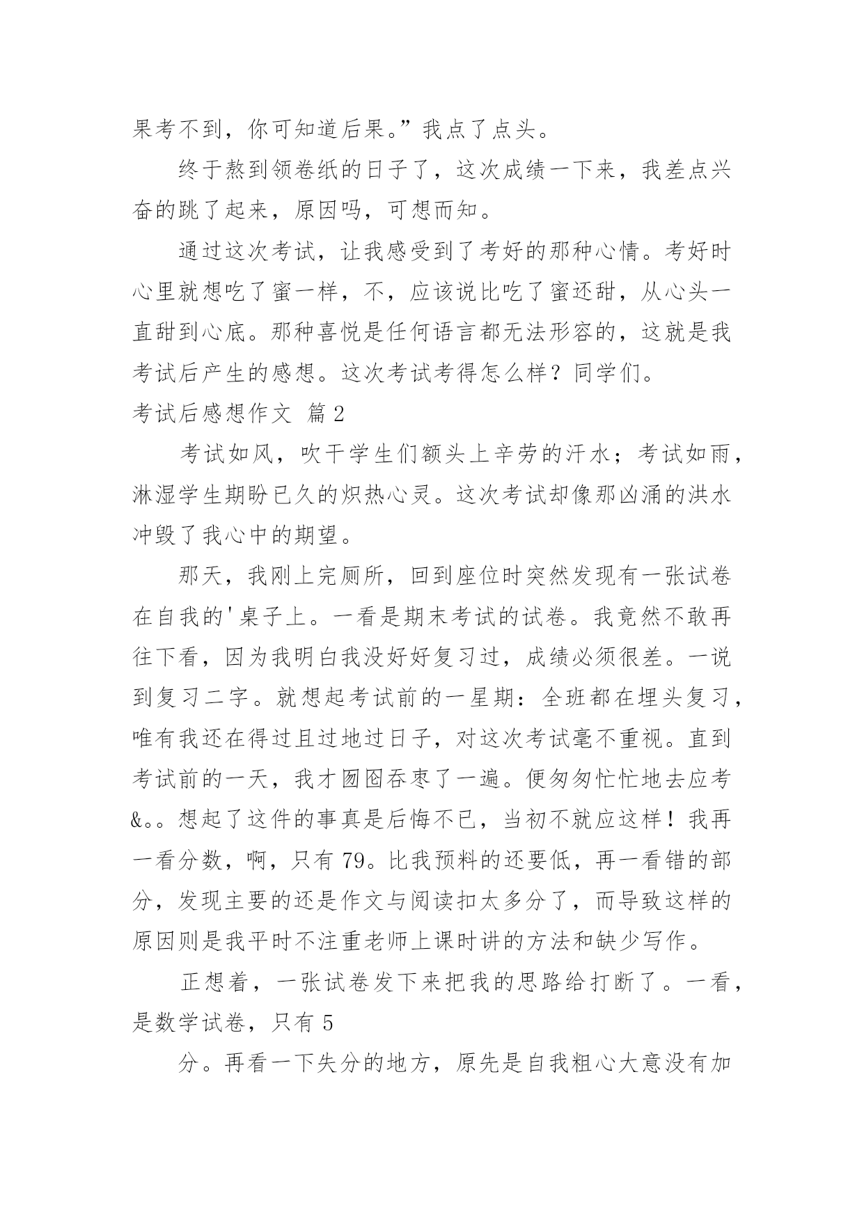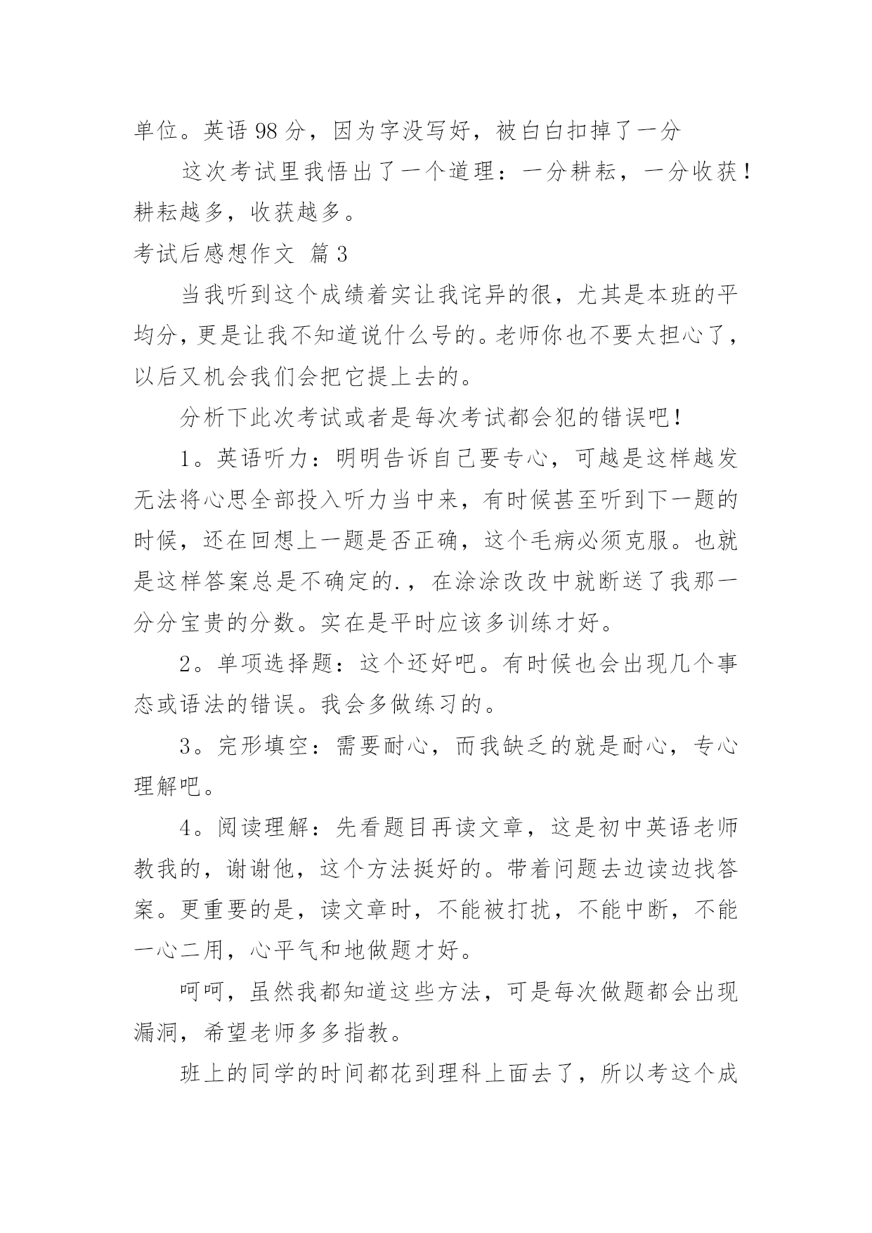 考试后感想作文【精选】考试后感想作文3篇在日常生活或是工作学习中,大家总少不了接触作文吧,借助作文可以提高我们的语言组织能力。怎么写作文才能避免踩雷呢?下面是小编整理的考试后感想作文3篇,仅供参考,希望能够帮助到大家。考试后感想作文篇1通过这次期末考试,让我有很多感唔,也让我明白了考好的心情是那么快乐,那么高兴。最重要的是每当别人问你考多少分时,如果你考得不好,你就会吞吞吐吐的说不出来,搞不好还会赤耳面红。如果你考好的话,你就会顺顺溜溜的报出你经过不断努力而得到成果,你会有一种很享受的感觉。我每次期中、期末考试,考的都不怎么好。记得一次期末考试,我的数学才考了69分,语文和英语也都不怎么理想,为这,妈妈还说:“你这闺女啊,让我怎么说你呢。不是这错就是那错,你就不能用一点心吗?”爸爸带着帮腔的调说:“你说填空、判断、选择你不理解,那也就算了。你赖好把计算题作对呀,计算题你也不理解、做不对吗?”那一个暑假,我几乎每天都在补习数学,我后悔莫及。在这次期末考试来临前,妈妈对我说:“小雨,你这次考试你数学考到85分以上、语文考到90分以上,尽量考到95分以上、英语必须考到95分以上,如果考到了妈妈就带你去郑州玩,但是有前提条件,刚放假的.时候必须能做的作业做完。如果考不到,你可知道后果。”我点了点头。终于熬到领卷纸的日子了,这次成绩一下来,我差点兴奋的跳了起来,原因吗,可想而知。通过这次考试,让我感受到了考好的那种心情。考好时心里就想吃了蜜一样,不,应该说比吃了蜜还甜,从心头一直甜到心底。那种喜悦是任何语言都无法形容的,这就是我考试后产生的感想。这次考试考得怎么样?同学们。考试后感想作文篇2考试如风,吹干学生们额头上辛劳的汗水;考试如雨,淋湿学生期盼已久的炽热心灵。这次考试却像那凶涌的洪水冲毁了我心中的期望。那天,我刚上完厕所,回到座位时突然发现有一张试卷在自我的'桌子上。一看是期末考试的试卷。我竟然不敢再往下看,因为我明白我没好好复习过,成绩必须很差。一说到复习二字。就想起考试前的一星期:全班都在埋头复习,唯有我还在得过且过地过日子,对这次考试毫不重视。直到考试前的一天,我才囫囵吞枣了一遍。便匆匆忙忙地去应考&。。想起了这件的事真是后悔不已,当初不就应这样!我再一看分数,啊,只有79。比我预料的还要低,再一看错的部分,发现主要的还是作文与阅读扣太多分了,而导致这样的原因则是我平时不注重老师上课时讲的方法和缺少写作。正想着,一张试卷发下来把我的思路给打断了。一看,是数学试卷,只有5分。再看一下失分的地方,原先是自我粗心大意没有加单位。英语98分,因为字没写好,被白白扣掉了一分这次考试里我悟出了一个道理:一分耕耘,一分收获!耕耘越多,收获越多。考试后感想作文篇3当我听到这个成绩着实让我诧异的很,尤其是本班的平均分,更是让我不知道说什么号的。老师你也不要太担心了,以后又机会我们会把它提上去的。分析下此次考试或者是每次考试都会犯的错误吧!1。英语听力:明明告诉自己要专心,可越是这样越发无法将心思全部投入听力当中来,有时候甚至听到下一题的时候,还在回想上一题是否正确,这个毛病必须克服。也就是这样答案总是不确定的.,在涂涂改改中就断送了我那一分分宝贵的分数。实在是平时应该多训练才好。2。单项选择题:这个还好吧。有时候也会出现几个事态或语法的错误。我会多做练习的。3。完形填空:需要耐心,而我缺乏的就是耐心,专心理解吧。4。阅读理解:先看题目再读文章,这是初中英语老师教我的,谢谢他,这个方法挺好的。带着问题去边读边找答案。更重要的是,读文章时,不能被打扰,不能中断,不能一心二用,心平气和地做题才好。呵呵,虽然我都知道这些方法,可是每次做题都会出现漏洞,希望老师多多指教。班上的同学的时间都花到理科上面去了,所以考这个成绩也是情有可原的吧,希望老师原谅。再之,不质疑老师的教学能力,只是纪律好,会更有效率。