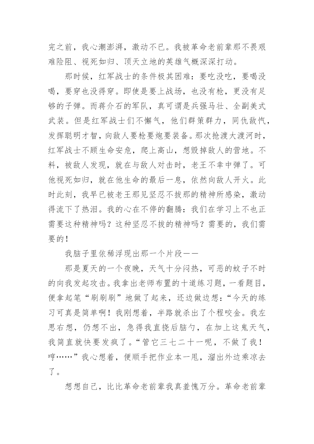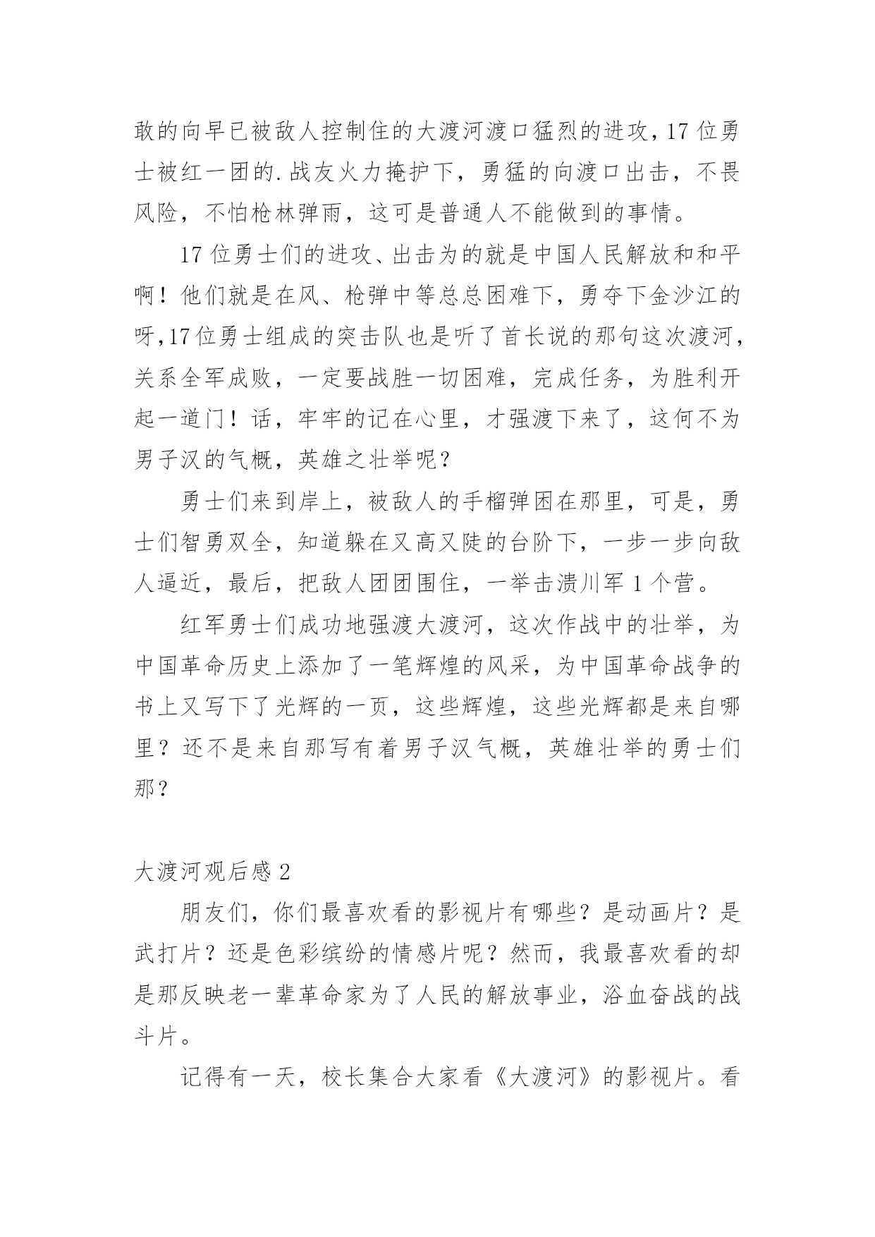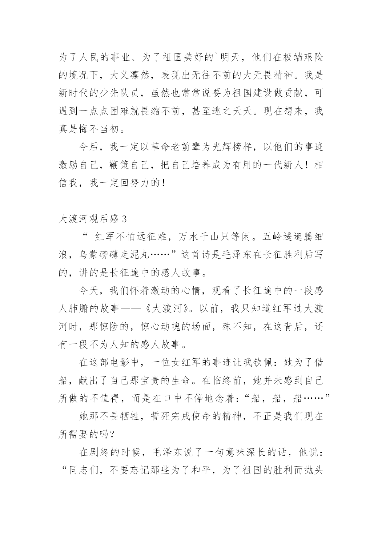 大渡河观后感在观赏了后,心中感慨万千,不禁为作品所深深折服,这次观看让你心中有什么感想呢?需要回过头来写一写观后感了。现在你是否对观后感一筹莫展呢?下面是小编收集整理的大渡河观后感,欢迎大家分享。大渡河观后感11935年5月24日晚上,中央红军先头部队第一师第一团,经过长时间的行走,来到了安顺场,和此川军驻守的2个连发起了20多分钟的战斗,战斗结束后,川军第五旅第七团1个营抢占了这一地区。25日早晨,红一团开始强渡大渡河。刘伯承、聂荣臻亲临前沿阵地指挥。红一团第一营营长孙继先从第二连挑选17名勇士组成渡河突击队,7时,强渡开始,岸上轻重武器同时开火,红一团掩护突击队渡河。突击队冒着川军的密集枪弹和炮火,在激流中前进。快接近对岸时,川军向渡口反冲击,十七勇士战胜了惊涛骇浪,冲过了敌人的重重火网,终于登上了对岸。敌人见红军冲上岸滩,便往下甩手榴弹。智能双全的勇士们,利用又高又陡的台阶死角作掩护,沿台阶向上猛烈冲杀。在右岸火力的支援下,勇士们击退了川军的反扑,控制了渡口,一举击溃川军1个营,巩固了渡河点。《强渡大渡河》是红军勇士们的一次生死之战,刘伯承和聂荣臻已经所有勇士们为了中华人民解放,为了和平,勇敢的向早已被敌人控制住的大渡河渡口猛烈的进攻,17位勇士被红一团的.战友火力掩护下,勇猛的向渡口出击,不畏风险,不怕枪林弹雨,这可是普通人不能做到的事情。17位勇士们的进攻、出击为的就是中国人民解放和和平啊!他们就是在风、枪弹中等总总困难下,勇夺下金沙江的呀,17位勇士组成的突击队也是听了首长说的那句这次渡河,关系全军成败,一定要战胜一切困难,完成任务,为胜利开起一道门!话,牢牢的记在心里,才强渡下来了,这何不为男子汉的气概,英雄之壮举呢?勇士们来到岸上,被敌人的手榴弹困在那里,可是,勇士们智勇双全,知道躲在又高又陡的台阶下,一步一步向敌人逼近,最后,把敌人团团围住,一举击溃川军1个营。红军勇士们成功地强渡大渡河,这次作战中的壮举,为中国革命历史上添加了一笔辉煌的风采,为中国革命战争的书上又写下了光辉的一页,这些辉煌,这些光辉都是来自哪里?还不是来自那写有着男子汉气概,英雄壮举的勇士们那?大渡河观后感2朋友们,你们最喜欢看的影视片有哪些?是动画片?是武打片?还是色彩缤纷的情感片呢?然而,我最喜欢看的却是那反映老一辈革命家为了人民的解放事业,浴血奋战的战斗片。记得有一天,校长集合大家看《大渡河》的影视片。看完之前,我心潮澎湃,激动不已。我被革命老前辈那不畏艰难险阻、视死如归、顶天立地的英雄气概深深打动。那时候,红军战士的条件极其困难:要吃没吃,要喝没喝,要穿也没得穿。即使是要上战场,也没有枪,更没有足够的子弹。而蒋介石的军队,真可谓是兵强马壮、全副美式武装。但是红军战士们不懈气,他们群策群力,同仇敌忾,发挥聪明才智,向敌人要枪要炮要装备。那次抢渡大渡河时,红军战士不顾生命安危,爬上高山,想毁掉敌人的营地。不料,被敌人发现,就在与敌人对击时,老王不幸中弹了。可他视死如归,就在他生命的最后一息,依然向敌人开火。此时此刻,我早已被老王那见坚忍不拔那的精神所感染,激动得流下了热泪。我的心在不停的翻腾:我们在学习上不也正需要这种精神吗?这种坚忍不拔的精神吗?需要的,我们需要的!我脑子里依稀浮现出那一个片段――那是夏天的一个夜晚,天气十分闷热,可恶的蚊子不时的向我发起攻击。我拿出老师布置的十道练习题,一看题目,便拿起笔“刷刷刷”地做了起来,还边做边想:“今天的练习可真是简单啊!我刚想着,半路就杀出了个程咬金。我左思右想,仍想不出,急得我直挠后脑勺,在加上这鬼天气,我简直就快要发疯了。“管它三七二十一呢,不做了我!哼……”我心想着,便顺手把作业本一甩,溜出外边乘凉去了。想想自己,比比革命老前辈我真羞愧万分。革命老前辈为了人民的事业、为了祖国美好的`明天,他们在极端艰险的境况下,大义凛然,表现出无往不前的大无畏精神。我是新时代的少先队员,虽然也常常说要为祖国建设做贡献,可遇到一点点困难就畏缩不前,甚至逃之夭夭。现在想来,我真是悔不当初。今后,我一定以革命老前辈为光辉榜样,以他们的事迹激励自己,鞭策自己,把自己培养成为有用的一代新人!相信我,我一定回努力的!大渡河观后感3“红军不怕远征难,万水千山只等闲。五岭逶迤腾细浪,乌蒙磅礴走泥丸……”这首诗是毛泽东在长征胜利后写的,讲的是长征途中的感人故事。今天,我们怀着激动的心情,观看了长征途中的一段感人肺腑的故事——《大渡河》。以前,我只知道红军过大渡河时,那惊险的,惊心动魄的场面,殊不知,在这背后,还有一段不为人知的感人故事。在这部电影中,一位女红军的事迹让我钦佩:她为了借船,献出了自己那宝贵的生命。在临终前,她并未感到自己所做的不值得,而是在口中不停地念着:“船,船,船……”她那不畏牺牲,誓死完成使命的