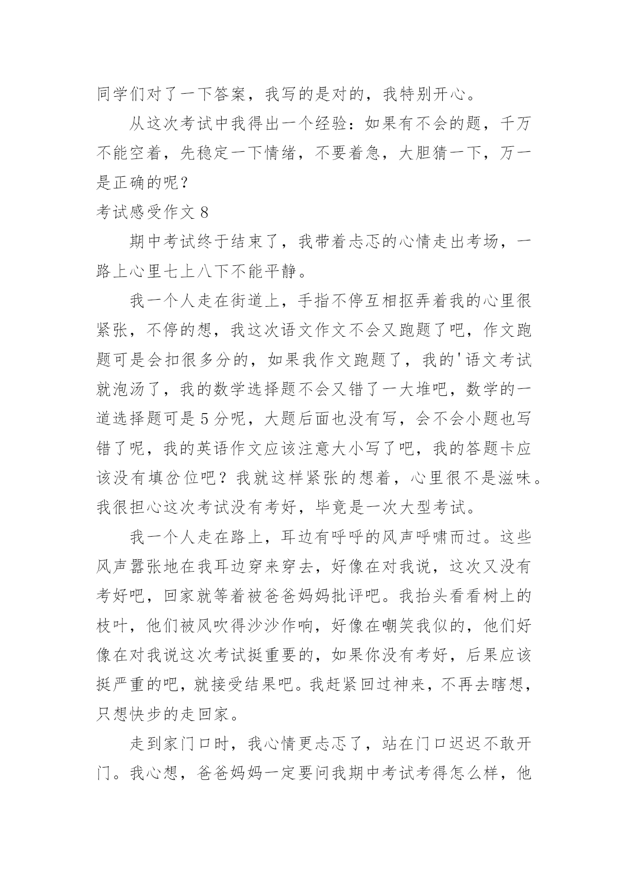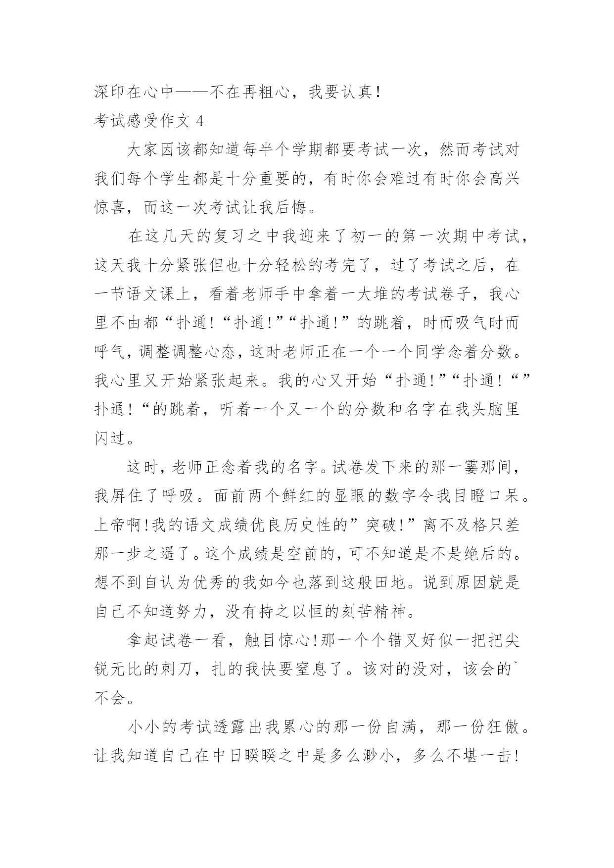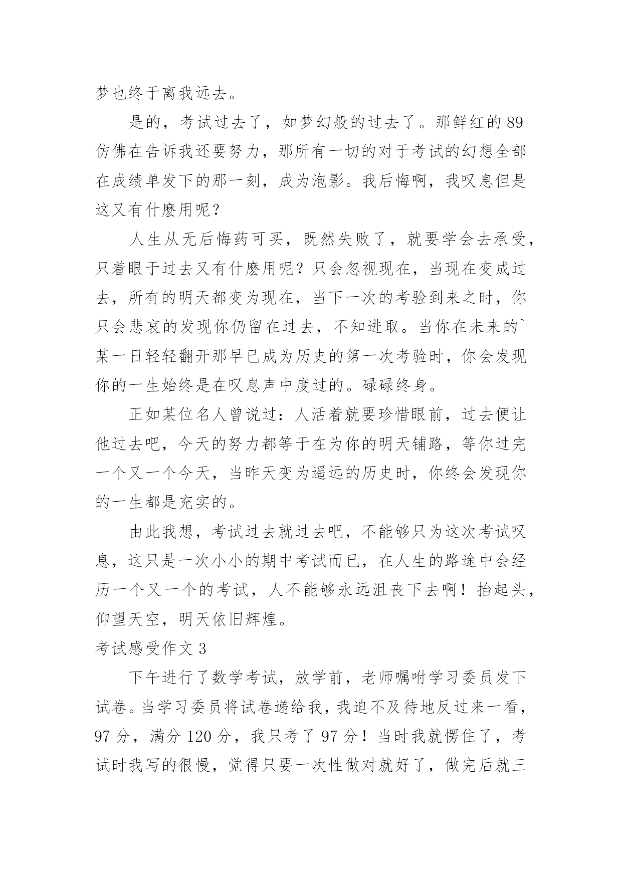 考试感受作文考试感受作文在学习、工作或生活中,大家都写过作文吧,借助作文人们可以反映客观事物、表达思想感情、传递知识信息。写起作文来就毫无头绪?下面是小编整理的考试感受作文,欢迎阅读与收藏。考试感受作文1每次考试,我都会有狠多感受,无论成功与否,它都将成为我生命中得一部分,从而影响我得生活。努力不一定能成功,但仔细想想,或许会有很多收获,每一次努力得结果总是失败多于成功,我深知作为一个失败者得滋味,从未有过把人踩在足低油然而生得胜利感,失败那是一种悲伤、痛苦或是绝望得感觉,但有时我也会安慰自己,逆境反而更有利于自己得成长。失败了我又能怎么样!考不好已成定局,失败归失败,过后还要继续往前走,时光永远不会倒流。我也不会再生!只有脚踏实地地往前走,才会记得在哪受过伤,坦然接受失败,正真得认识到自己在学习中、生活中的失败。才会从内心激起学习得动力和对成功的渴望,对成功的渴望当然是取得理想成绩最好得方法。不受外界得干扰,从内心感悟成功、失败,总结学习得方法、经验,适当地改变自己,努力去适应新的学习的环境。这次的考试,我更加清楚地认识到自己所处得位置,知己知彼,方能百战不殆,这次考试虽不理想,但我总结出了考不好得原因:复习得不够透彻,表达、描写方式记不清楚。搅浑了……作文不够连贯,现实。而英语和数学就更不用说了,简直是一堆烂泥扶不上墙,心里后悔不已,却已无济于事了。经过这次后,我会更加严格要求自己,认真学好每已课,决不放弃。哪怕只是一点点得进步,也是我用汗水换取来的,在今后的两个月里,我将重新制定学习计划,我要和别人拼时间,比效率。穿别人得鞋走自己得路,让他们找去吧——!恳请老师多多监督我,当我犯错误得时候帮我指出,金无足赤,人无完人。相信暗透了便是光明,生活的'路不总会一帆风顺,总会有让人失意时,但我相信挫折是暂时的,当勇敢德走过时,一切都变得微不足道,我会以饱满的激情进入每一天得学习,为了每一个起点,我必须跨过终点,一切从零开始。考试感受作文2时光流逝,岁月如梭。从我身边悄然而过。不知不觉中期中考试却在同学们的期盼声中赶来了,我将迎来我第一次正规的期中考试。考试的时间非常短,好像在梦境之中一般,考试过后我还在每天晚上做着噩梦。天哪,这太可怕了,这是落到我头上我可受不了。这是我在噩梦中惊醒后最常说的一句话。但是在星期一我接到数学考砸的消息后我反而平静多了,怎么这么奇怪呢?不过管他呢,心里的一块石头终于落地了。噩梦也终于离我远去。是的,考试过去了,如梦幻般的过去了。那鲜红的89仿佛在告诉我还要努力,那所有一切的对于考试的幻想全部在成绩单发下的那一刻,成为泡影。我后悔啊,我叹息但是这又有什麽用呢?人生从无后悔药可买,既然失败了,就要学会去承受,只着眼于过去又有什麽用呢?只会忽视现在,当现在变成过去,所有的明天都变为现在,当下一次的考验到来之时,你只会悲哀的发现你仍留在过去,不知进取。当你在未来的`某一日轻轻翻开那早已成为历史的第一次考验时,你会发现你的一生始终是在叹息声中度过的。碌碌终身。正如某位名人曾说过:人活着就要珍惜眼前,过去便让他过去吧,今天的努力都等于在为你的明天铺路,等你过完一个又一个今天,当昨天变为遥远的历史时,你终会发现你的一生都是充实的。由此我想,考试过去就过去吧,不能够只为这次考试叹息,这只是一次小小的期中考试而已,在人生的路途中会经历一个又一个的考试,人不能够永远沮丧下去啊!抬起头,仰望天空,明天依旧辉煌。考试感受作文3下午进行了数学考试,放学前,老师嘱咐学习委员发下试卷。当学习委员将试卷递给我,我迫不及待地反过来一看,97分,满分120分,我只考了97分!当时我就愣住了,考试时我写的很慢,觉得只要一次性做对就好了,做完后就三心二意地检查起来,没一会儿就到交卷的时间了,但我突然发现有一道错题,学习委员早已走到我跟前催促我交卷,:“等一下,让我把这道题改了。”我急得像热锅上的蚂蚁,可老天偏偏和我作对,在关键时刻,我想不出这道题对应的'法则了,看着急着收卷子的学习委员,而自己又想不出答案,我只好无奈地将卷子上交了。我看着卷子上醒目的红叉叉,心里内疚的说不出话来,我知道,因为自己对学习的不重视,和平时粗心马虎的坏习惯,所以才有了这个羞耻的成绩,回到家,我和父母分析了我考不好的原因。首先,妈妈询问了我这些题,老师讲过没有?会不会?我胆怯地回答说:“都……都讲过。”,妈妈告诉我:“既然讲过,就该得满分像这样的题就不应该错,实在太亏了!”爸爸也对我说:“粗心一直是你最大的敌人也是你的坏习惯以后要改正。”其次,我对自己这次成绩分析了许久,如果做那些题,能再认真点,就不会粗心马虎了,错误真的是很低级、很不该的,大部分就是看错了个运算符号,一个数字什么的。真后悔,只要我检查到这儿,就会发现低级错误,但为什么没有检查到这呢?肯定是因为