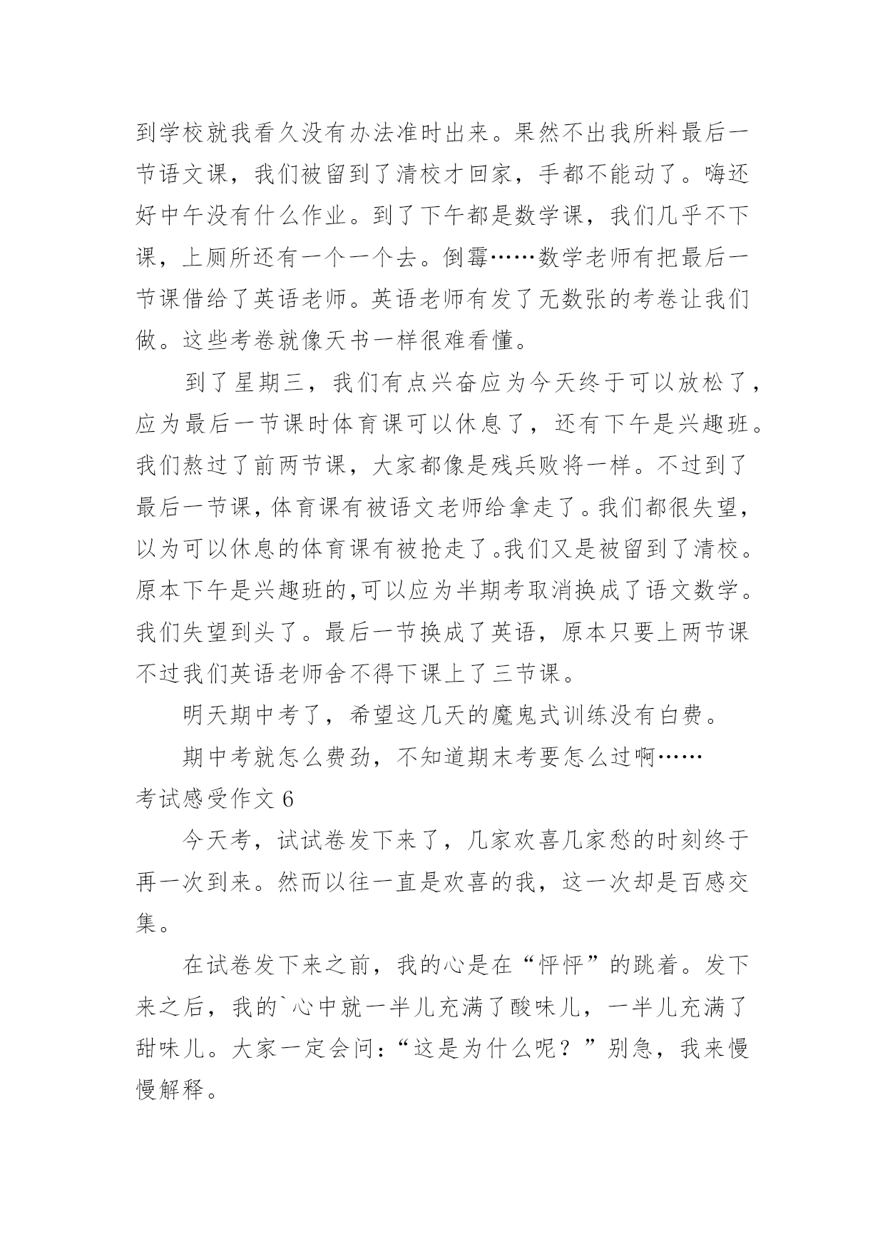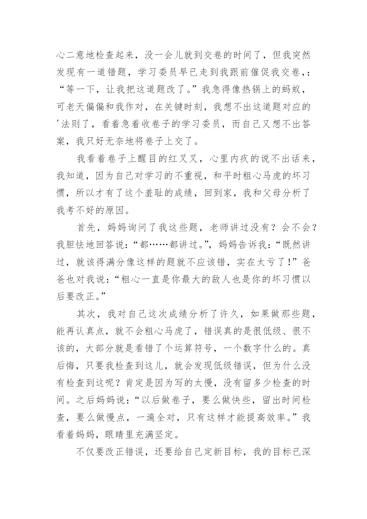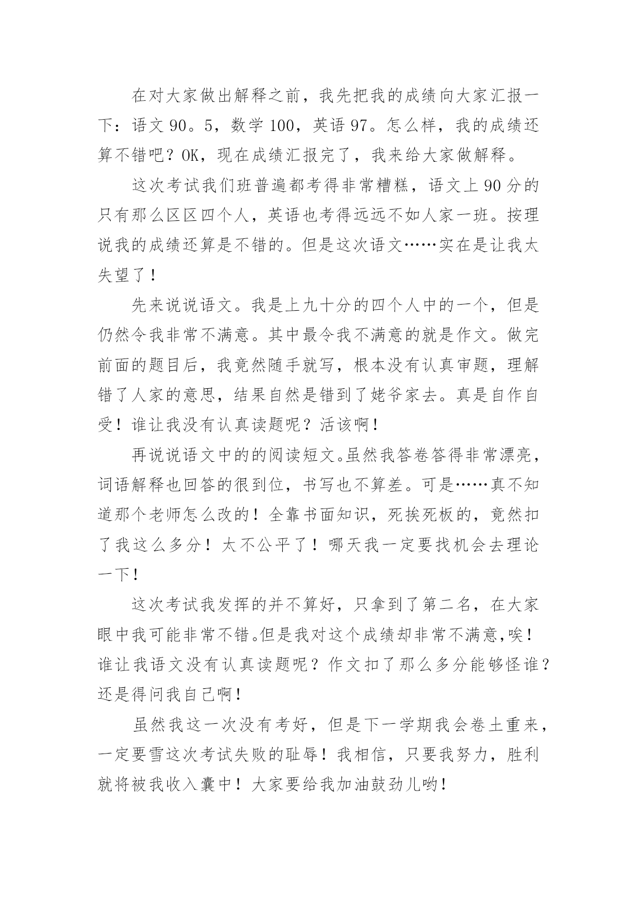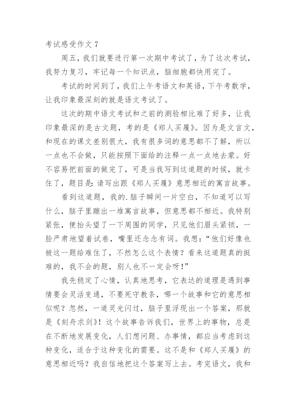 考试感受作文考试感受作文在学习、工作或生活中,大家都写过作文吧,借助作文人们可以反映客观事物、表达思想感情、传递知识信息。写起作文来就毫无头绪?下面是小编整理的考试感受作文,欢迎阅读与收藏。考试感受作文1每次考试,我都会有狠多感受,无论成功与否,它都将成为我生命中得一部分,从而影响我得生活。努力不一定能成功,但仔细想想,或许会有很多收获,每一次努力得结果总是失败多于成功,我深知作为一个失败者得滋味,从未有过把人踩在足低油然而生得胜利感,失败那是一种悲伤、痛苦或是绝望得感觉,但有时我也会安慰自己,逆境反而更有利于自己得成长。失败了我又能怎么样!考不好已成定局,失败归失败,过后还要继续往前走,时光永远不会倒流。我也不会再生!只有脚踏实地地往前走,才会记得在哪受过伤,坦然接受失败,正真得认识到自己在学习中、生活中的失败。才会从内心激起学习得动力和对成功的渴望,对成功的渴望当然是取得理想成绩最好得方法。不受外界得干扰,从内心感悟成功、失败,总结学习得方法、经验,适当地改变自己,努力去适应新的学习的环境。这次的考试,我更加清楚地认识到自己所处得位置,知己知彼,方能百战不殆,这次考试虽不理想,但我总结出了考不好得原因:复习得不够透彻,表达、描写方式记不清楚。搅浑了……作文不够连贯,现实。而英语和数学就更不用说了,简直是一堆烂泥扶不上墙,心里后悔不已,却已无济于事了。经过这次后,我会更加严格要求自己,认真学好每已课,决不放弃。哪怕只是一点点得进步,也是我用汗水换取来的,在今后的两个月里,我将重新制定学习计划,我要和别人拼时间,比效率。穿别人得鞋走自己得路,让他们找去吧——!恳请老师多多监督我,当我犯错误得时候帮我指出,金无足赤,人无完人。相信暗透了便是光明,生活的'路不总会一帆风顺,总会有让人失意时,但我相信挫折是暂时的,当勇敢德走过时,一切都变得微不足道,我会以饱满的激情进入每一天得学习,为了每一个起点,我必须跨过终点,一切从零开始。考试感受作文2时光流逝,岁月如梭。从我身边悄然而过。不知不觉中期中考试却在同学们的期盼声中赶来了,我将迎来我第一次正规的期中考试。考试的时间非常短,好像在梦境之中一般,考试过后我还在每天晚上做着噩梦。天哪,这太可怕了,这是落到我头上我可受不了。这是我在噩梦中惊醒后最常说的一句话。但是在星期一我接到数学考砸的消息后我反而平静多了,怎么这么奇怪呢?不过管他呢,心里的一块石头终于落地了。噩梦也终于离我远去。是的,考试过去了,如梦幻般的过去了。那鲜红的89仿佛在告诉我还要努力,那所有一切的对于考试的幻想全部在成绩单发下的那一刻,成为泡影。我后悔啊,我叹息但是这又有什麽用呢?人生从无后悔药可买,既然失败了,就要学会去承受,只着眼于过去又有什麽用呢?只会忽视现在,当现在变成过去,所有的明天都变为现在,当下一次的考验到来之时,你只会悲哀的发现你仍留在过去,不知进取。当你在未来的`某一日轻轻翻开那早已成为历史的第一次考验时,你会发现你的一生始终是在叹息声中度过的。碌碌终身。正如某位名人曾说过:人活着就要珍惜眼前,过去便让他过去吧,今天的努力都等于在为你的明天铺路,等你过完一个又一个今天,当昨天变为遥远的历史时,你终会发现你的一生都是充实的。由此我想,考试过去就过去吧,不能够只为这次考试叹息,这只是一次小小的期中考试而已,在人生的路途中会经历一个又一个的考试,人不能够永远沮丧下去啊!抬起头,仰望天空,明天依旧辉煌。考试感受作文3下午进行了数学考试,放学前,老师嘱咐学习委员发下试卷。当学习委员将试卷递给我,我迫不及待地反过来一看,97分,满分120分,我只考了97分!当时我就愣住了,考试时我写的很慢,觉得只要一次性做对就好了,做完后就三心二意地检查起来,没一会儿就到交卷的时间了,但我突然发现有一道错题,学习委员早已走到我跟前催促我交卷,:“等一下,让我把这道题改了。”我急得像热锅上的蚂蚁,可老天偏偏和我作对,在关键时刻,我想不出这道题对应的'法则了,看着急着收卷子的学习委员,而自己又想不出答案,我只好无奈地将卷子上交了。我看着卷子上醒目的红叉叉,心里内疚的说不出话来,我知道,因为自己对学习的不重视,和平时粗心马虎的坏习惯,所以才有了这个羞耻的成绩,回到家,我和父母分析了我考不好的原因。首先,妈妈询问了我这些题,老师讲过没有?会不会?我胆怯地回答说:“都……都讲过。”,妈妈告诉我:“既然讲过,就该得满分像这样的题就不应该错,实在太亏了!”爸爸也对我说:“粗心一直是你最大的敌人也是你的坏习惯以后要改正。”其次,我对自己这次成绩分析了许久,如果做那些题,能再认真点,就不会粗心马虎了,错误真的是很低级、很不该的,大部分就是看错了个运算符号,一个数字什么的。真后悔,只要我检查到这儿,就会发现低级错误,但为什么没有检查到这呢?肯定是因为