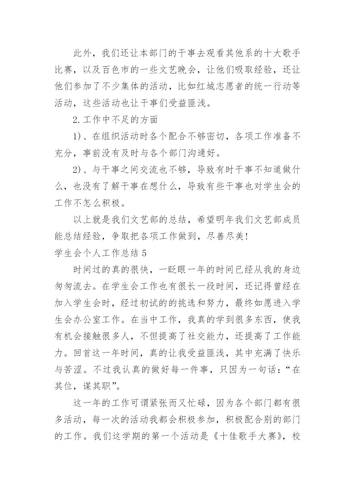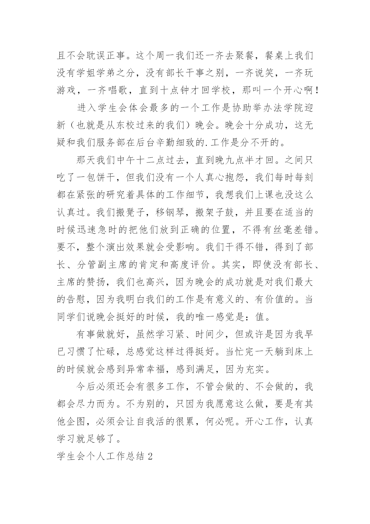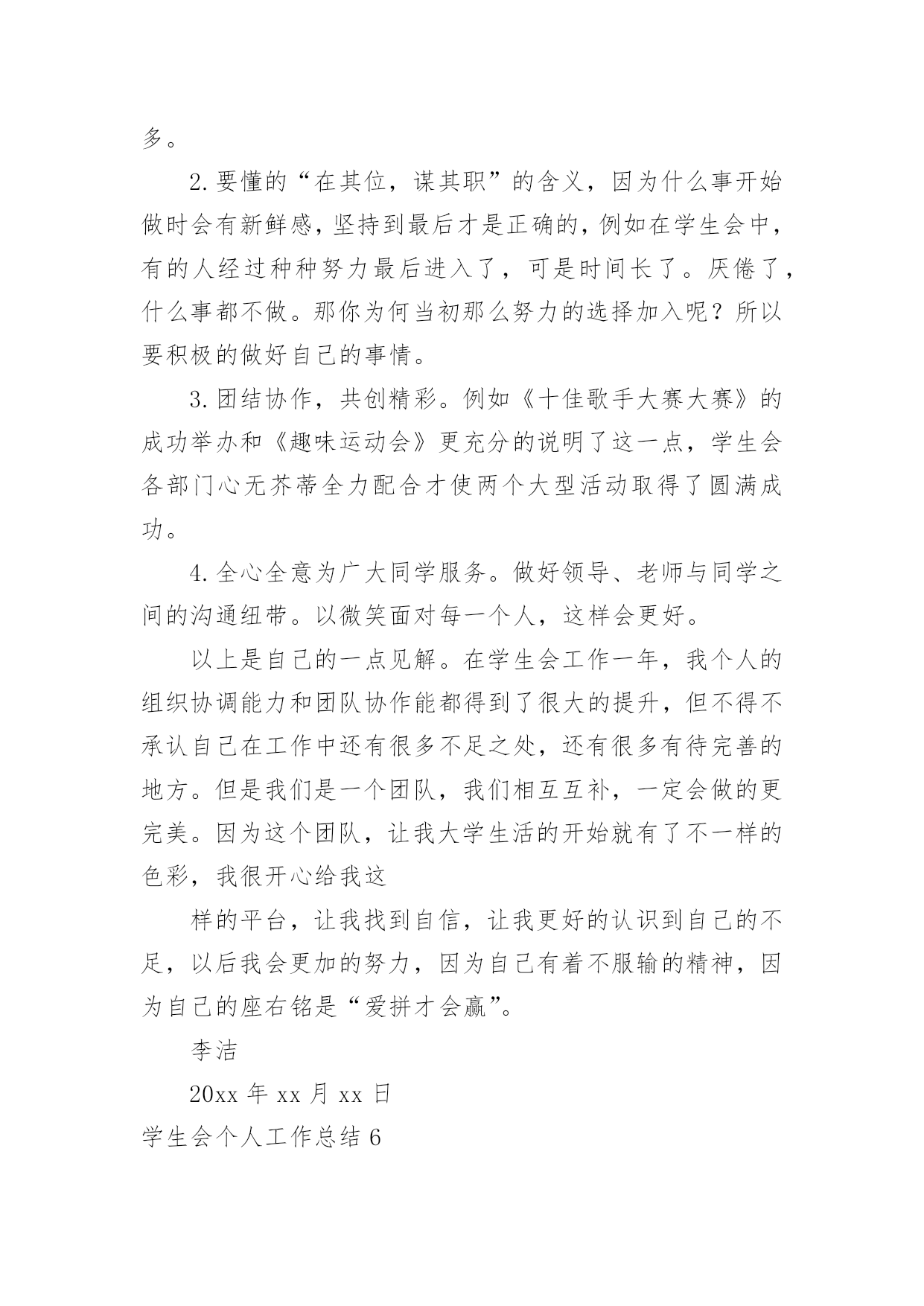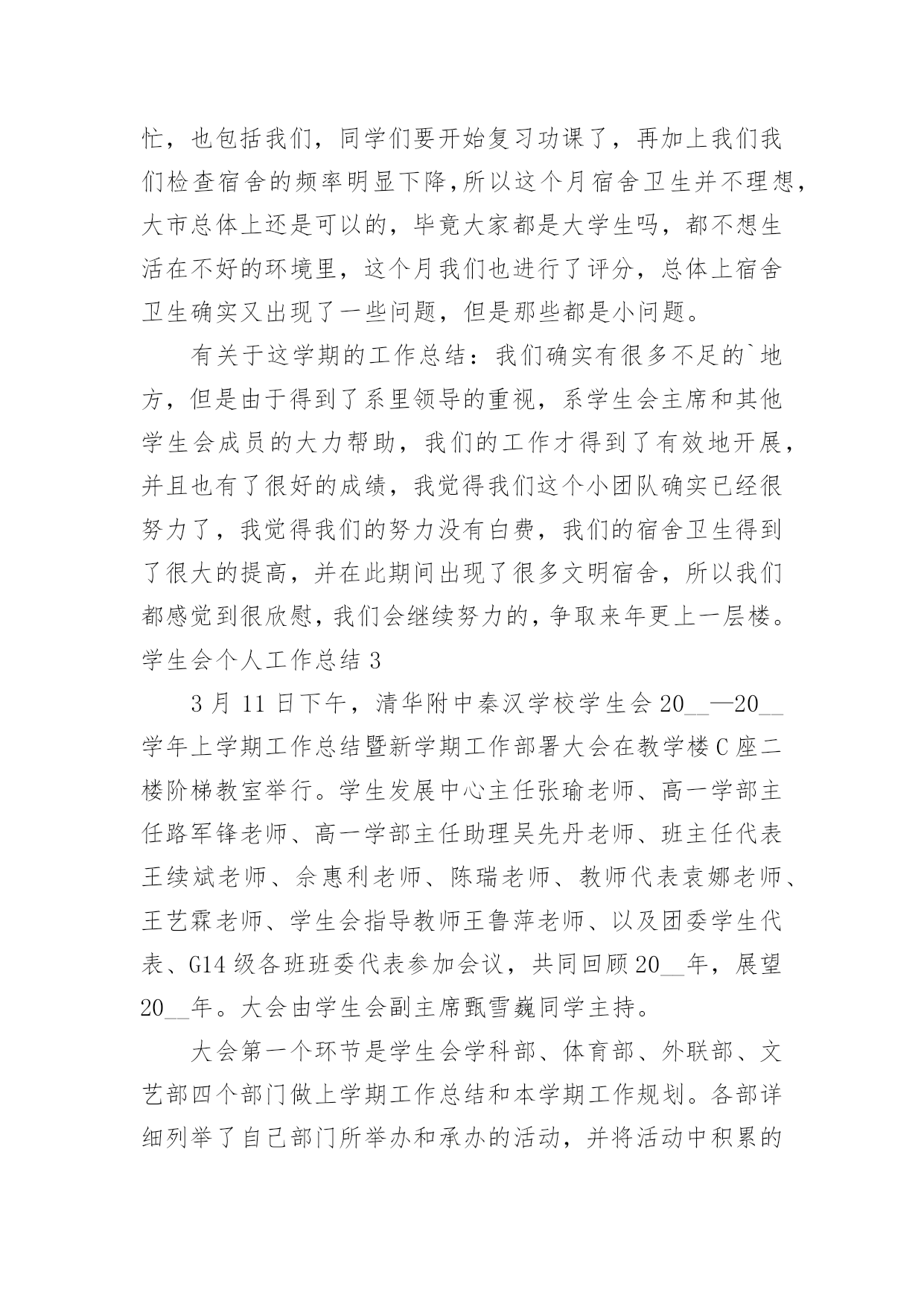 学生会个人工作总结【优选】学生会个人工作总结总结是对某一阶段的工作、学习或思想中的经验或情况进行分析研究的书面材料,它在我们的学习、工作中起到呈上启下的作用,让我们抽出时间写写总结吧。那么总结应该包括什么内容呢?下面是小编整理的学生会个人工作总结,仅供参考,大家一起来看看吧。学生会个人工作总结1其实,大学开始之前就期望能当个班长或进学生会。之后班长没当成就更想进学生会了。但大一在东部校区时,学生会面试也没过关,不免更觉得遗憾。不明白为什么要进学生会,反正就是不想在学习外无事可做。还好,来到中心校区后,法学院学生会又纳新了,很荣幸,我进了生活服务部,成为学生会的一员。继纳新会议后我们就正式开始工作了。我们部每周二开例会(当然有时会因工作需要加开或换时间开),我们的常务工作是检查卫生,每周一次,由于男生分两组,所以我只在双周和高宝龙一齐检查。检查卫生其实也能煅练很多东西。比如跟楼管大爷和同学们的交流相处本事,对卫生的衡量评价本事等。我们部真的很和谐,感情挺好。都不会自私,都能够互帮互助而不会借口推托。每次开例会我们都会有说有笑,并且不会耽误正事。这个周一我们还一齐去聚餐,餐桌上我们没有学姐学弟之分,没有部长干事之别,一齐说笑,一齐玩游戏,一齐唱歌,直到十点钟才回学校,那叫一个开心啊!进入学生会体会最多的一个工作是协助举办法学院迎新(也就是从东校过来的我们)晚会。晚会十分成功,这无疑和我们服务部在后台辛勤细致的.工作是分不开的。那天我们中午十二点过去,直到晚九点半才回。之间只吃了一包饼干,但我们没有一个人真心抱怨,我们每时每刻都在紧张的研究着具体的工作细节,我想我们上课也没这么认真过。我们搬凳子,移钢琴,搬架子鼓,并且要在适当的时候迅速急时的把他们放到正确的位置,不得有丝毫差错。要不,整个演出效果就会受影响。我们干得不错,得到了部长、分管副主席的肯定和高度评价。其实,即使没有部长、主席的赞扬,我们也高兴,因为晚会的成功就是对我们最大的告慰,因为我明白我们的工作是有意义的、有价值的。当同学们说晚会挺好的时候,我的唯一感觉是:值。有事做就好,虽然学习紧、时间少,但或许是因为我早已习惯了忙碌,总感觉这样过得挺好。当忙完一天躺到床上的时候就会感到异常幸福,感到满足,因为充实。今后必须还会有很多工作,不管会做的、不会做的,我都会尽力而为。不为别的,只因为我愿意这么做,要是有其他企图,必须会让自我活的很累,何必呢。开心工作,认真学习就足够了。学生会个人工作总结2我系学生会于20xx年X月开始换届,纪检部和生活部成员全部是新的学生会成员,两个部门工作范围基本一样,主要是监督本系学生宿舍卫生情况。这学期的工作时间为XX月。以下是这三个月的工作总结。X月份:这个月是学校的文明月,所以这个月我们的工作很重,学校和系里关于宿舍卫生这方面检查的很严,学校那边每周得检查好几次,然后我们纪检部和生活部每周检查XX次几乎每天都要检查宿舍卫生,每周三系里都有老师随同去检查,检查卫生时并随时记下每个宿舍的优点和不足,然后进行评分,并在系里的黑板上公布各个宿舍的得分,让同学们知道自己有哪些不足,然后再改正,在此期间同学们都十分积极,努力搞好宿舍卫生,并且互相进行对比;再加上系里领导的高度重视,和我们的认真检查,这个月学生宿舍卫生有了很大的提高,在院里也有很好的评价,我们的工作也得到了很高的评价.5月份:由于刚刚过了文明月,系里怕同学们变得松懈了,所以还要我们严格检查宿舍卫生,由于有些同学以为文明月过了就不会天天查宿舍了,所以这个月刚开始有些宿舍卫生并不怎么好,但是由于上个月有些同学养成了好习惯,所以整体还是不错的,这个月我们每周查2-3次,周三还是会有老师随同,同学们的表现也是越来越好,宿舍卫生一天比一天好,我们还是将每个宿舍的成绩写在黑板上,督促同学们继续努力,我们要让同学们养成好习惯。6月份:由于即将临近期末了,所以这个月同学们都很忙,也包括我们,同学们要开始复习功课了,再加上我们我们检查宿舍的频率明显下降,所以这个月宿舍卫生并不理想,大市总体上还是可以的,毕竟大家都是大学生吗,都不想生活在不好的环境里,这个月我们也进行了评分,总体上宿舍卫生确实又出现了一些问题,但是那些都是小问题。有关于这学期的工作总结:我们确实有很多不足的`地方,但是由于得到了系里领导的重视,系学生会主席和其他学生会成员的大力帮助,我们的工作才得到了有效地开展,并且也有了很好的成绩,我觉得我们这个小团队确实已经很努力了,我觉得我们的努力没有白费,我们的宿舍卫生得到了很大的提高,并在此期间出现了很多文明宿舍,所以我们都感觉到很欣慰,我们会继续努力的,争取来年更上一层楼。学生会个人工作总结33月11日下午,清华附中秦汉学校学生会20__—20__学年上学期工作总结暨新学期工作部署大会在教学楼C