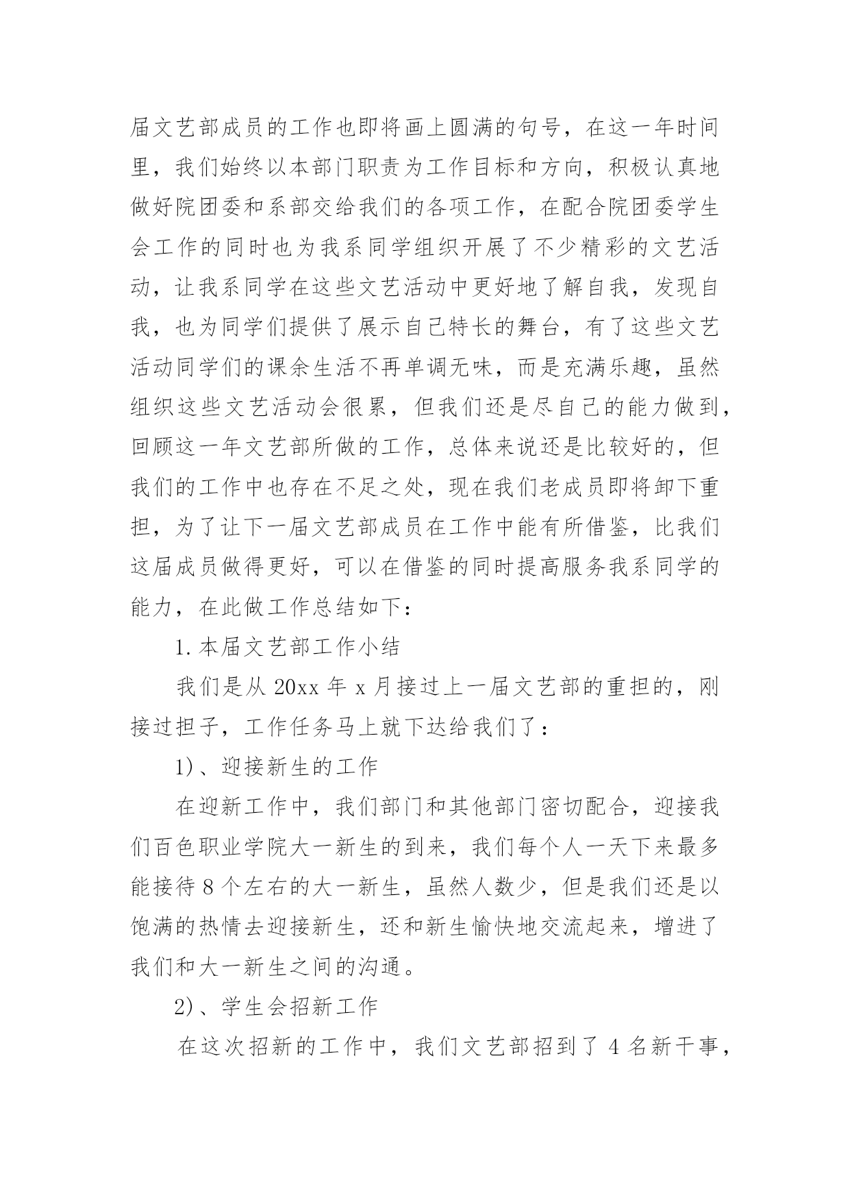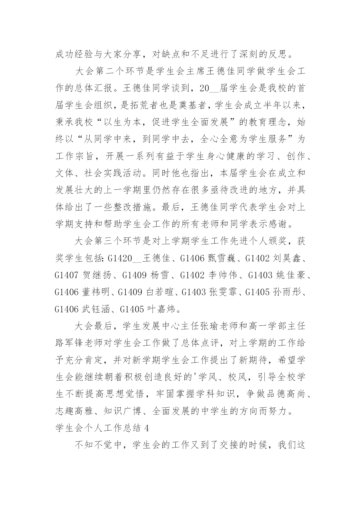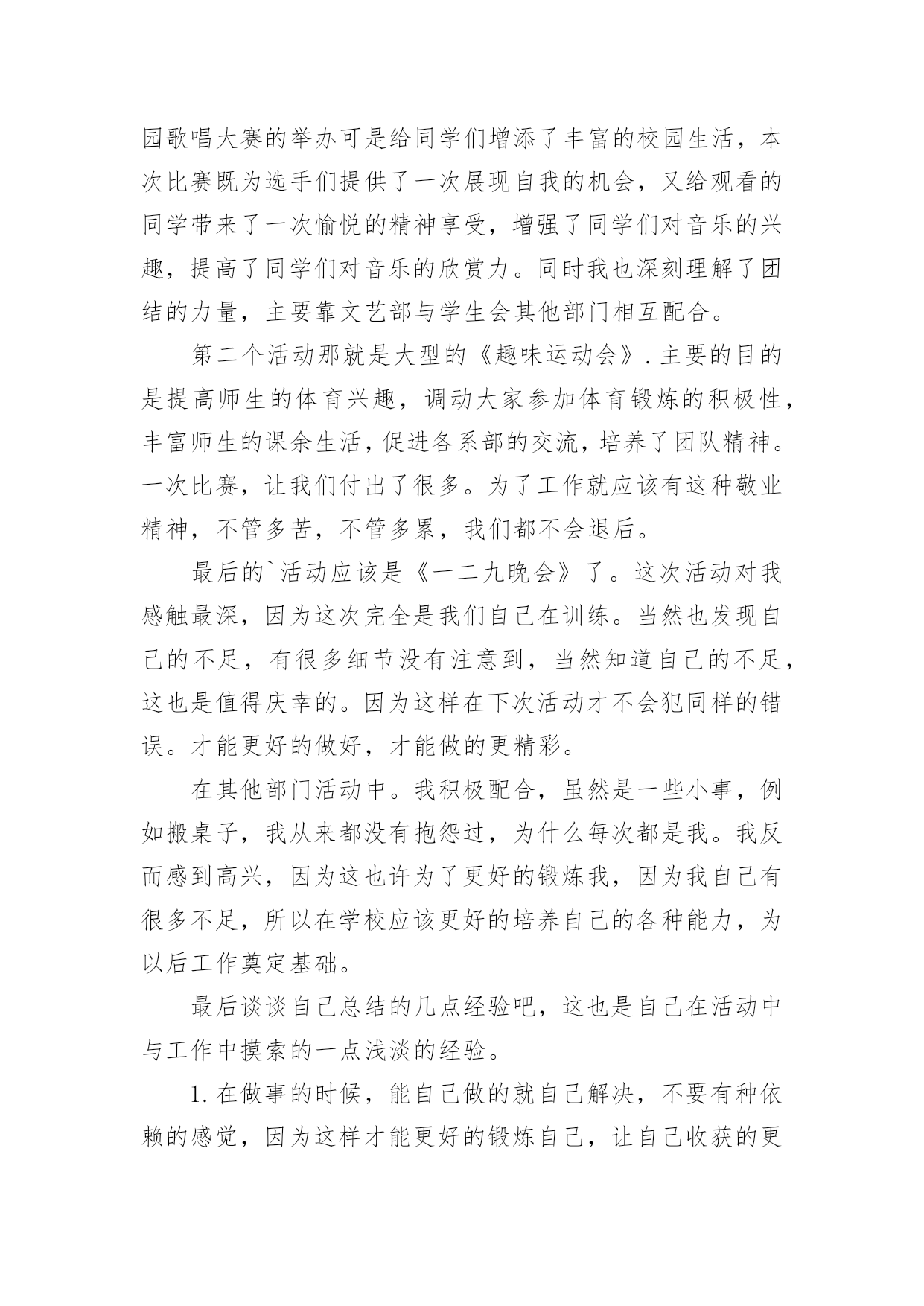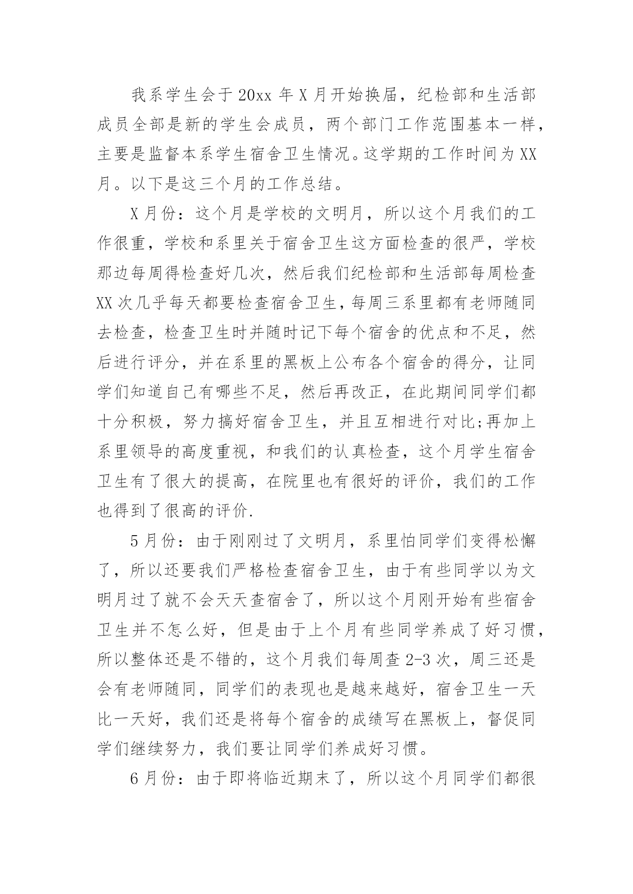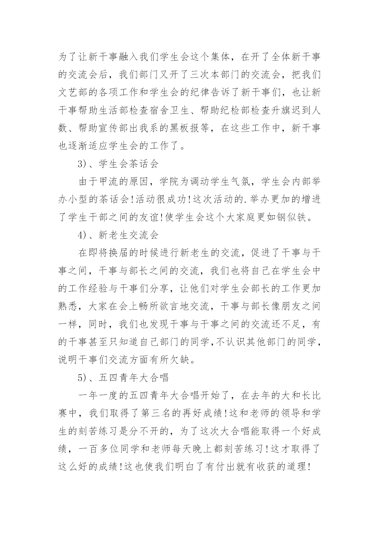 学生会个人工作总结【优选】学生会个人工作总结总结是对某一阶段的工作、学习或思想中的经验或情况进行分析研究的书面材料,它在我们的学习、工作中起到呈上启下的作用,让我们抽出时间写写总结吧。那么总结应该包括什么内容呢?下面是小编整理的学生会个人工作总结,仅供参考,大家一起来看看吧。学生会个人工作总结1其实,大学开始之前就期望能当个班长或进学生会。之后班长没当成就更想进学生会了。但大一在东部校区时,学生会面试也没过关,不免更觉得遗憾。不明白为什么要进学生会,反正就是不想在学习外无事可做。还好,来到中心校区后,法学院学生会又纳新了,很荣幸,我进了生活服务部,成为学生会的一员。继纳新会议后我们就正式开始工作了。我们部每周二开例会(当然有时会因工作需要加开或换时间开),我们的常务工作是检查卫生,每周一次,由于男生分两组,所以我只在双周和高宝龙一齐检查。检查卫生其实也能煅练很多东西。比如跟楼管大爷和同学们的交流相处本事,对卫生的衡量评价本事等。我们部真的很和谐,感情挺好。都不会自私,都能够互帮互助而不会借口推托。每次开例会我们都会有说有笑,并且不会耽误正事。这个周一我们还一齐去聚餐,餐桌上我们没有学姐学弟之分,没有部长干事之别,一齐说笑,一齐玩游戏,一齐唱歌,直到十点钟才回学校,那叫一个开心啊!进入学生会体会最多的一个工作是协助举办法学院迎新(也就是从东校过来的我们)晚会。晚会十分成功,这无疑和我们服务部在后台辛勤细致的.工作是分不开的。那天我们中午十二点过去,直到晚九点半才回。之间只吃了一包饼干,但我们没有一个人真心抱怨,我们每时每刻都在紧张的研究着具体的工作细节,我想我们上课也没这么认真过。我们搬凳子,移钢琴,搬架子鼓,并且要在适当的时候迅速急时的把他们放到正确的位置,不得有丝毫差错。要不,整个演出效果就会受影响。我们干得不错,得到了部长、分管副主席的肯定和高度评价。其实,即使没有部长、主席的赞扬,我们也高兴,因为晚会的成功就是对我们最大的告慰,因为我明白我们的工作是有意义的、有价值的。当同学们说晚会挺好的时候,我的唯一感觉是:值。有事做就好,虽然学习紧、时间少,但或许是因为我早已习惯了忙碌,总感觉这样过得挺好。当忙完一天躺到床上的时候就会感到异常幸福,感到满足,因为充实。今后必须还会有很多工作,不管会做的、不会做的,我都会尽力而为。不为别的,只因为我愿意这么做,要是有其他企图,必须会让自我活的很累,何必呢。开心工作,认真学习就足够了。学生会个人工作总结2我系学生会于20xx年X月开始换届,纪检部和生活部成员全部是新的学生会成员,两个部门工作范围基本一样,主要是监督本系学生宿舍卫生情况。这学期的工作时间为XX月。以下是这三个月的工作总结。X月份:这个月是学校的文明月,所以这个月我们的工作很重,学校和系里关于宿舍卫生这方面检查的很严,学校那边每周得检查好几次,然后我们纪检部和生活部每周检查XX次几乎每天都要检查宿舍卫生,每周三系里都有老师随同去检查,检查卫生时并随时记下每个宿舍的优点和不足,然后进行评分,并在系里的黑板上公布各个宿舍的得分,让同学们知道自己有哪些不足,然后再改正,在此期间同学们都十分积极,努力搞好宿舍卫生,并且互相进行对比;再加上系里领导的高度重视,和我们的认真检查,这个月学生宿舍卫生有了很大的提高,在院里也有很好的评价,我们的工作也得到了很高的评价.5月份:由于刚刚过了文明月,系里怕同学们变得松懈了,所以还要我们严格检查宿舍卫生,由于有些同学以为文明月过了就不会天天查宿舍了,所以这个月刚开始有些宿舍卫生并不怎么好,但是由于上个月有些同学养成了好习惯,所以整体还是不错的,这个月我们每周查2-3次,周三还是会有老师随同,同学们的表现也是越来越好,宿舍卫生一天比一天好,我们还是将每个宿舍的成绩写在黑板上,督促同学们继续努力,我们要让同学们养成好习惯。6月份:由于即将临近期末了,所以这个月同学们都很忙,也包括我们,同学们要开始复习功课了,再加上我们我们检查宿舍的频率明显下降,所以这个月宿舍卫生并不理想,大市总体上还是可以的,毕竟大家都是大学生吗,都不想生活在不好的环境里,这个月我们也进行了评分,总体上宿舍卫生确实又出现了一些问题,但是那些都是小问题。有关于这学期的工作总结:我们确实有很多不足的`地方,但是由于得到了系里领导的重视,系学生会主席和其他学生会成员的大力帮助,我们的工作才得到了有效地开展,并且也有了很好的成绩,我觉得我们这个小团队确实已经很努力了,我觉得我们的努力没有白费,我们的宿舍卫生得到了很大的提高,并在此期间出现了很多文明宿舍,所以我们都感觉到很欣慰,我们会继续努力的,争取来年更上一层楼。学生会个人工作总结33月11日下午,清华附中秦汉学校学生会20__—20__学年上学期工作总结暨新学期工作部署大会在教学楼C