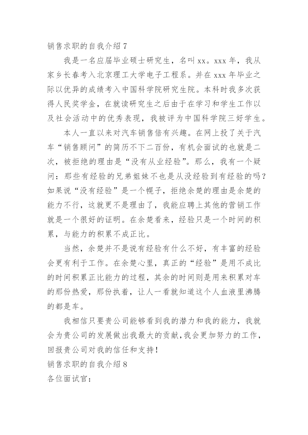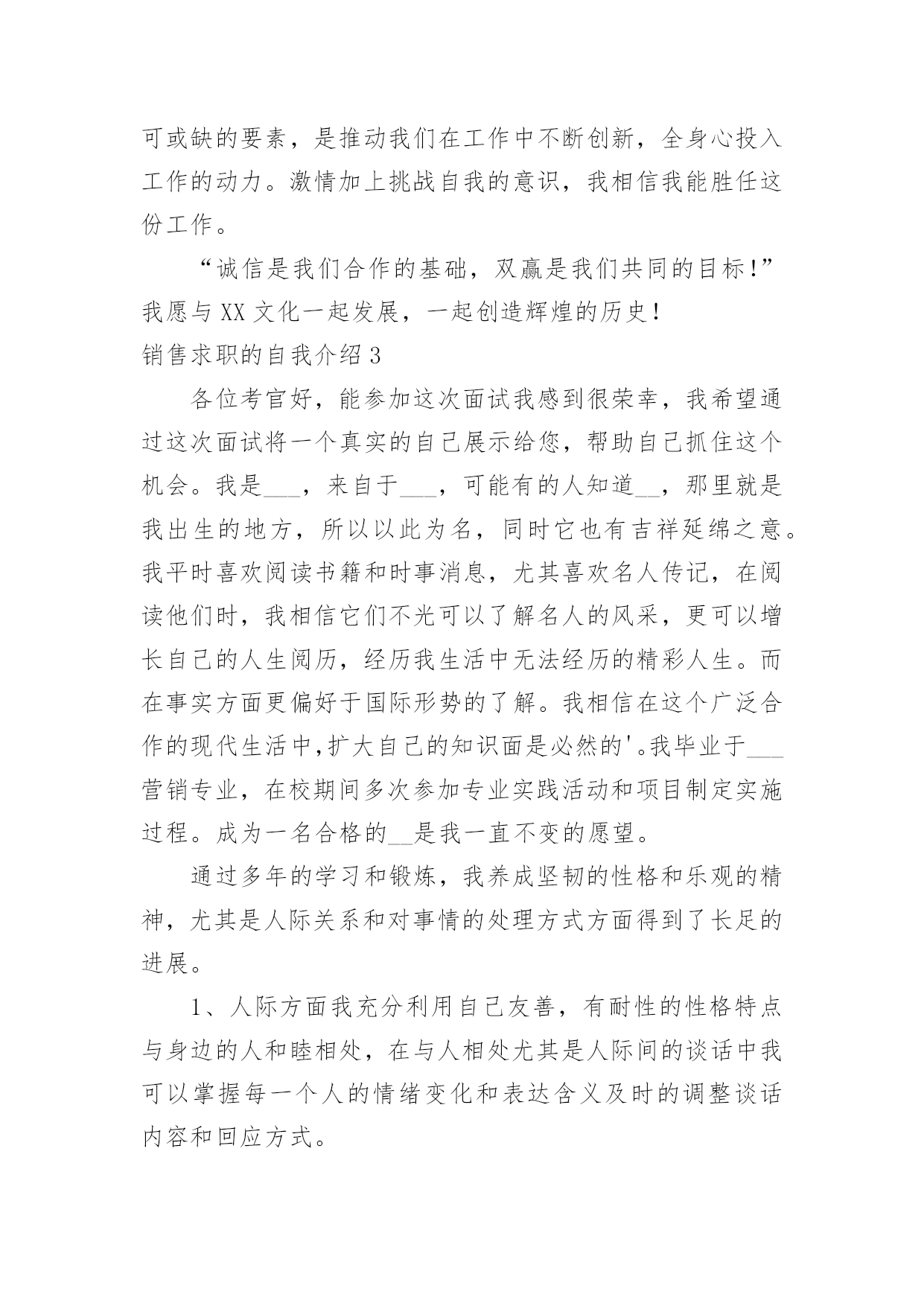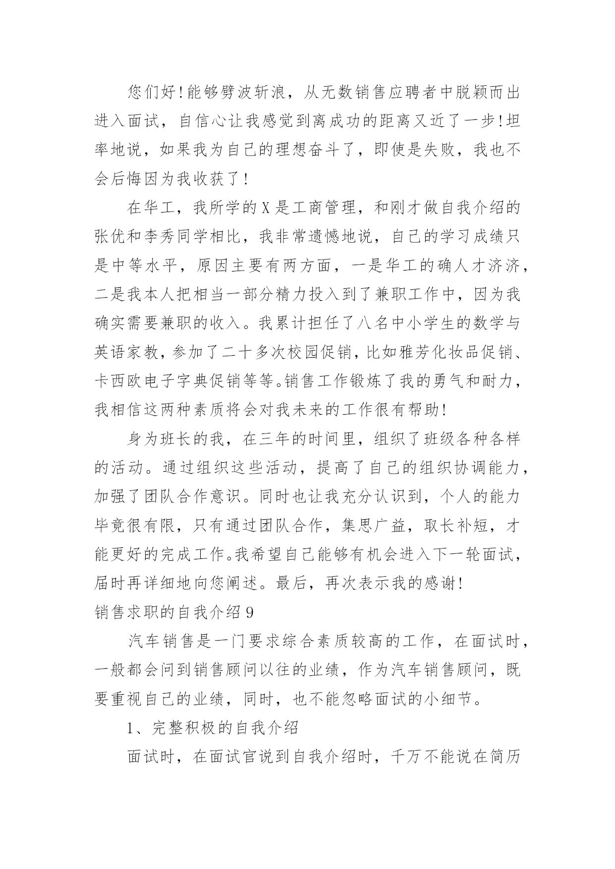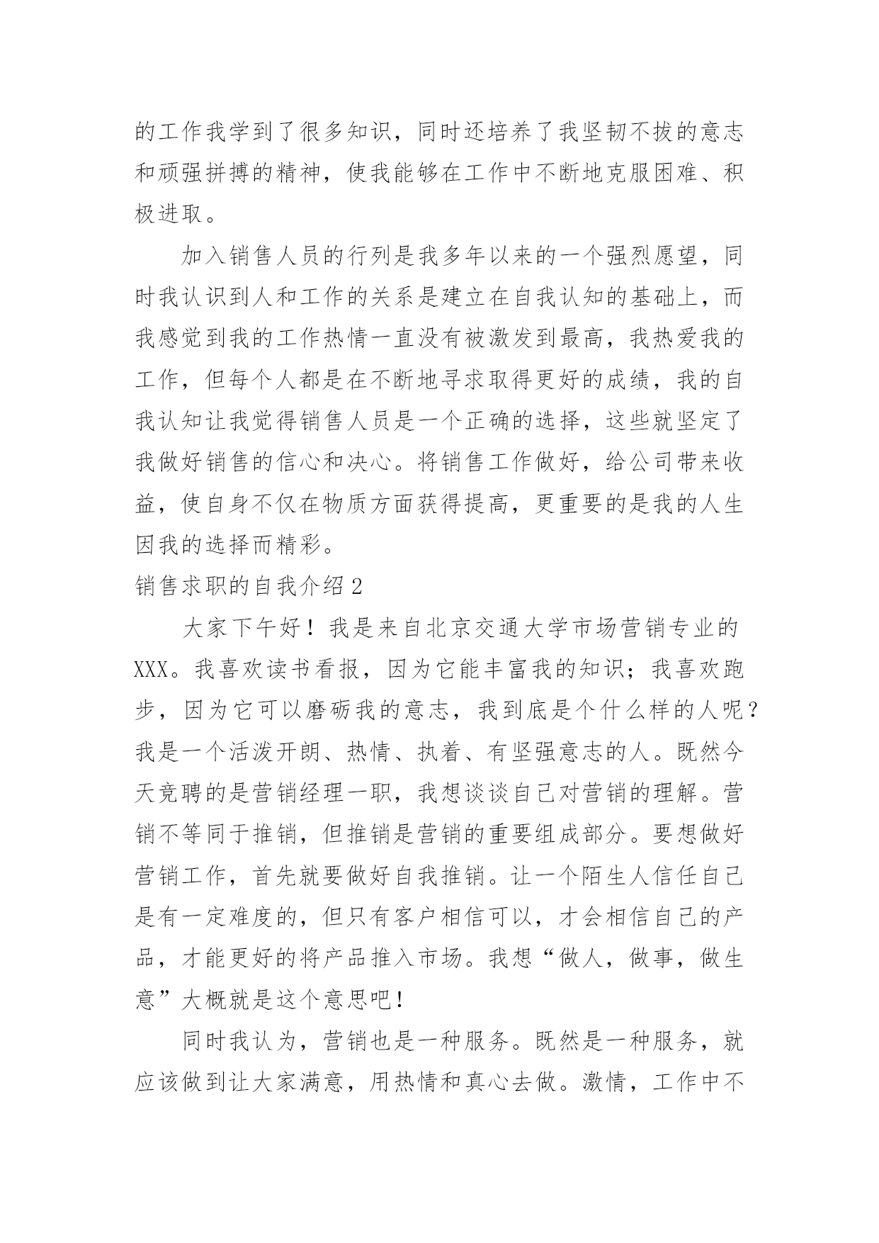 销售求职的自我介绍销售求职的自我介绍当换了一个新环境后,我们总归要向他人介绍自己,自我介绍可以给陌生人留下一个好的印象。相信大家又在为写自我介绍犯愁了吧!以下是小编帮大家整理的销售求职的自我介绍,仅供参考,欢迎大家阅读。销售求职的自我介绍1您好!本人欲申请贵公司招聘的医药代表的职位.我自信符合贵公司的要求.今年7月,我将从北京医学高等专科学校毕业.所学专业为临床医学.通过3年的在校学习,掌握了基本的医学知识,并多次参加学校组织的各种实习活动.在学校内,积极担任班干部、学生会成员、校报学生记者等并先后组织策划了班级元旦晚会以及“奥运记者谁来当”等活动;在社会实践方面,我参加了第十一届全运会的志愿服务工作,并积极利用假期在迪信通做手机销售等。这些经历锻炼了我自学能力、语言表达能力、沟通能力、组织策划以及亲和力等的同时也形成了我“高调做事、低调做人”的原则。一切让事实说话。最后,我发自内心的喜欢医药代表的工作,虽然医药代表的工作比较辛苦,但在这种充满挑战的氛围中努力奋斗,我会感受到自己的价值和对事业的满足感。加之我对贵公司这种“家”文化的向往。我今天非常兴奋且自信的来应聘这个职位。作为汽车专业的一名应届毕业生。在学校期间,我始终以提高自身的综合素质为目标,以自我的全面发展为努力方向,树立正确的人生观、价值观和世界观。通过四年的学习和生活,并参加了多次社会实践,我有健全的人生观,个人简历wdjl.net,正确的政治方向,有一定的分析问题、解决问题的能力,有较强的动手能力。本人了解中国汽车产业发展动态方向,特别是汽车后市场服务领域。知道汽车维修行业发展现状及趋势。善于学习新的知识方法工艺,分析和解决问题的能力强,能够熟练的利用互联网查询汽车维修资料,收集本行业最新信息。脚踏实地是一个立足社会的根本,也是我时刻铭记的一句话。拥有良好的职业素质和职业操守,能够忠于自己的企业,将个人的职业生涯规划与企业的发展紧密的结合。勇于创新,善于开创,能承受较高的工作压力;吃苦耐劳,注重合作,具有年轻人火一样的工作热情和活力。我叫cnrencai,现年XX岁,X族,大专文化,平时我喜欢看书和上网流览信息,性格活泼开朗,能关心身边的人和事,和亲人朋友融洽相处,能做到理解和原谅,我对生活充满信心。我曾经在XX,在公司里先后在不同的岗位工作过,开始我从事XX工作,随后因公司需要到XX,有一定的经验,在工作上取得一些的成绩,同时也得到公司的认可。通过几年的工作我学到了很多知识,同时还培养了我坚韧不拔的意志和顽强拼搏的精神,使我能够在工作中不断地克服困难、积极进取。加入销售人员的行列是我多年以来的一个强烈愿望,同时我认识到人和工作的关系是建立在自我认知的基础上,而我感觉到我的工作热情一直没有被激发到最高,我热爱我的工作,但每个人都是在不断地寻求取得更好的成绩,我的自我认知让我觉得销售人员是一个正确的选择,这些就坚定了我做好销售的信心和决心。将销售工作做好,给公司带来收益,使自身不仅在物质方面获得提高,更重要的是我的人生因我的选择而精彩。销售求职的自我介绍2大家下午好!我是来自北京交通大学市场营销专业的XXX。我喜欢读书看报,因为它能丰富我的知识;我喜欢跑步,因为它可以磨砺我的意志,我到底是个什么样的人呢?我是一个活泼开朗、热情、执着、有坚强意志的人。既然今天竞聘的是营销经理一职,我想谈谈自己对营销的理解。营销不等同于推销,但推销是营销的重要组成部分。要想做好营销工作,首先就要做好自我推销。让一个陌生人信任自己是有一定难度的,但只有客户相信可以,才会相信自己的产品,才能更好的将产品推入市场。我想“做人,做事,做生意”大概就是这个意思吧!同时我认为,营销也是一种服务。既然是一种服务,就应该做到让大家满意,用热情和真心去做。激情,工作中不可或缺的要素,是推动我们在工作中不断创新,全身心投入工作的动力。激情加上挑战自我的意识,我相信我能胜任这份工作。“诚信是我们合作的基础,双赢是我们共同的目标!”我愿与XX文化一起发展,一起创造辉煌的历史!销售求职的自我介绍3各位考官好,能参加这次面试我感到很荣幸,我希望通过这次面试将一个真实的自己展示给您,帮助自己抓住这个机会。我是___,来自于___,可能有的人知道__,那里就是我出生的地方,所以以此为名,同时它也有吉祥延绵之意。我平时喜欢阅读书籍和时事消息,尤其喜欢名人传记,在阅读他们时,我相信它们不光可以了解名人的风采,更可以增长自己的人生阅历,经历我生活中无法经历的精彩人生。而在事实方面更偏好于国际形势的了解。我相信在这个广泛合作的现代生活中,扩大自己的知识面是必然的'。我毕业于___营销专业,在校期间多次参加专业实践活动和项目制定实施过程。成为一名合格的__是我一直不变的愿望。通过多年的学习和锻炼,我养成坚韧的性格和乐观的