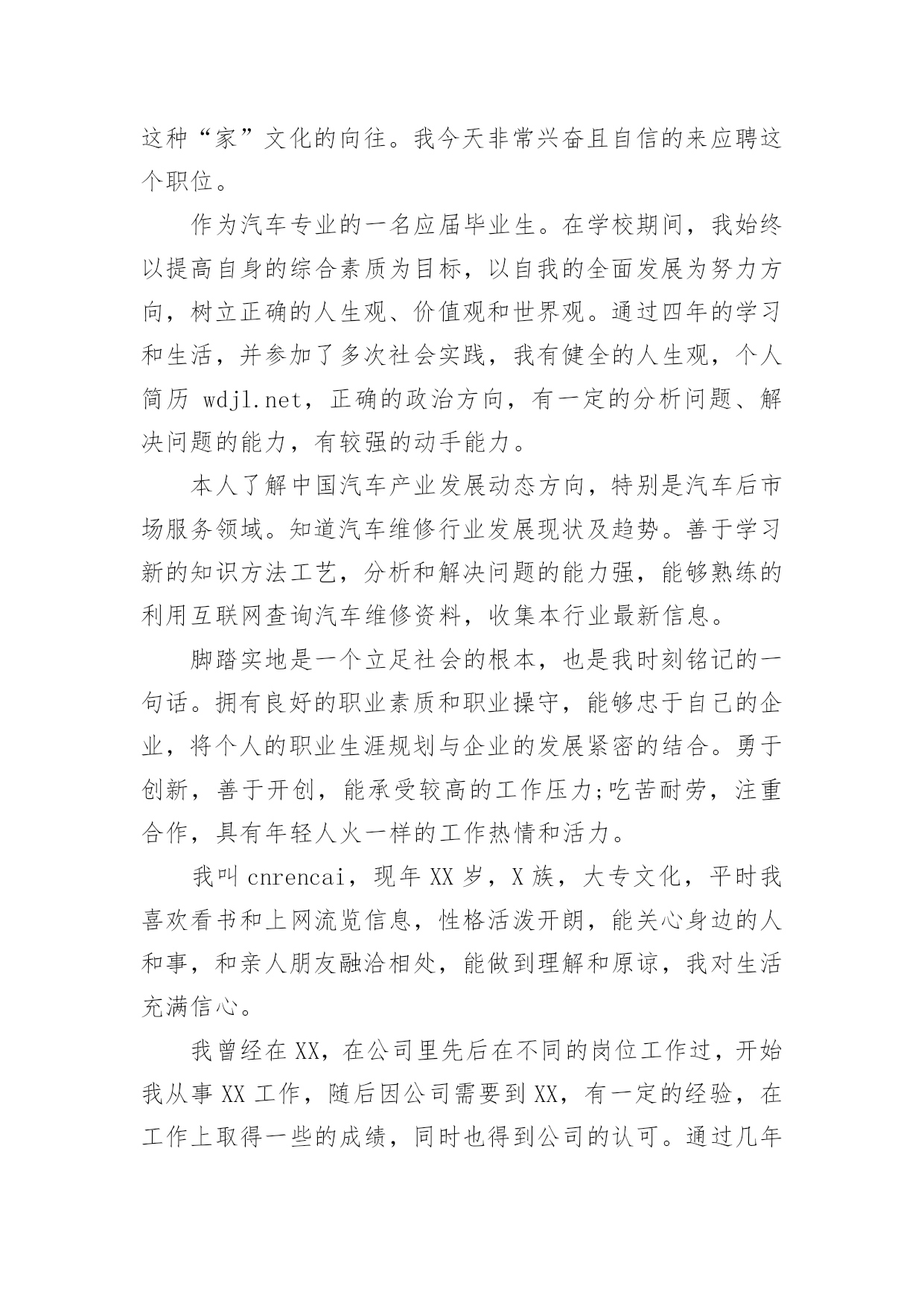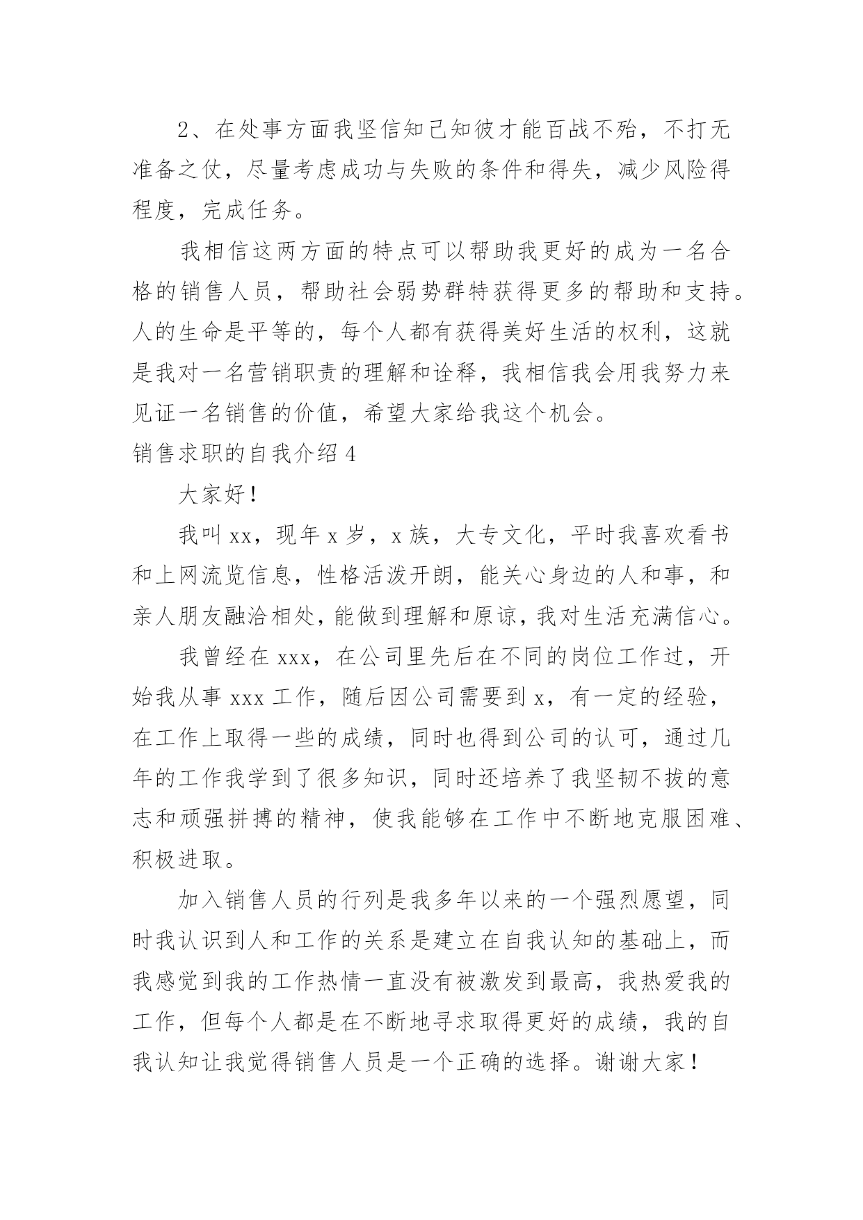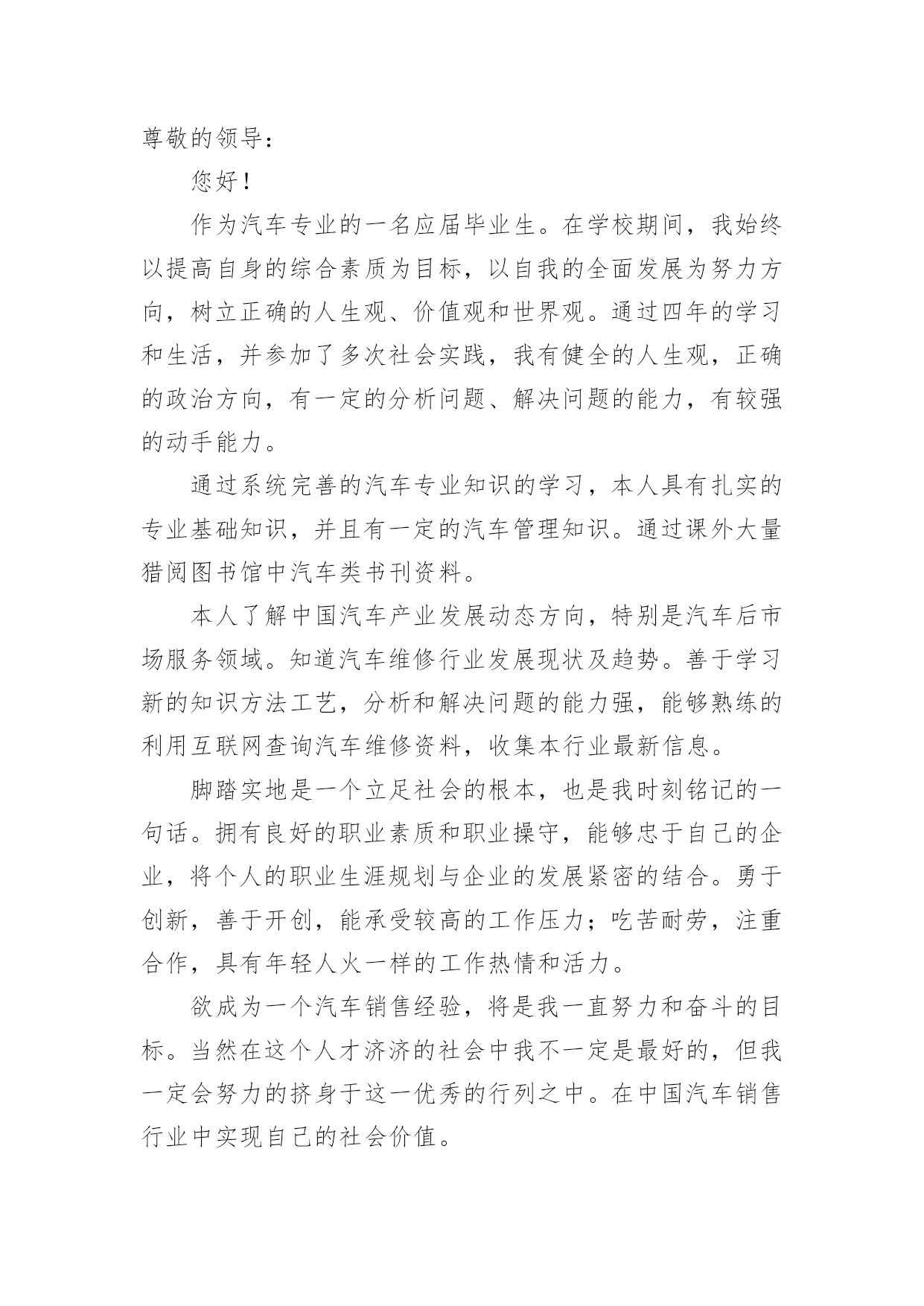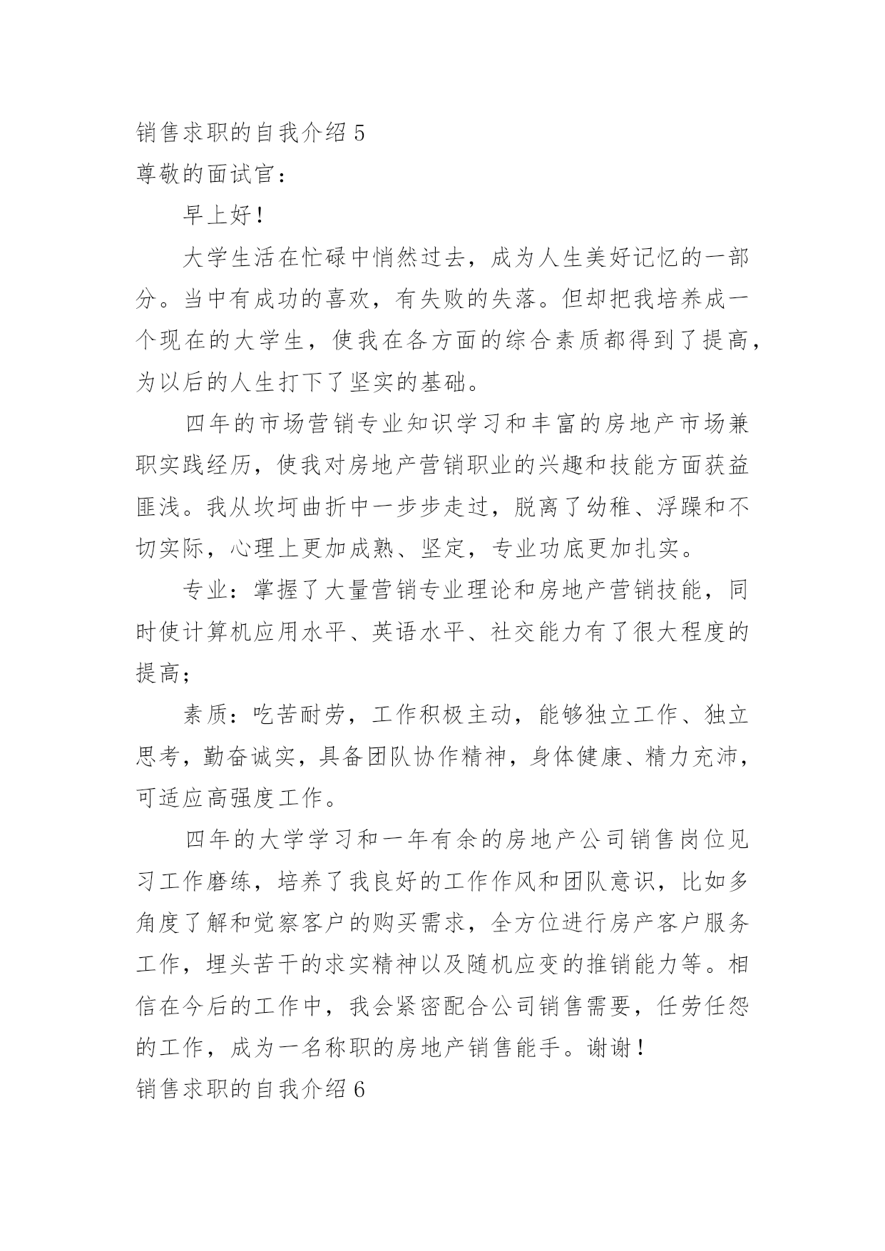 销售求职的自我介绍销售求职的自我介绍当换了一个新环境后,我们总归要向他人介绍自己,自我介绍可以给陌生人留下一个好的印象。相信大家又在为写自我介绍犯愁了吧!以下是小编帮大家整理的销售求职的自我介绍,仅供参考,欢迎大家阅读。销售求职的自我介绍1您好!本人欲申请贵公司招聘的医药代表的职位.我自信符合贵公司的要求.今年7月,我将从北京医学高等专科学校毕业.所学专业为临床医学.通过3年的在校学习,掌握了基本的医学知识,并多次参加学校组织的各种实习活动.在学校内,积极担任班干部、学生会成员、校报学生记者等并先后组织策划了班级元旦晚会以及“奥运记者谁来当”等活动;在社会实践方面,我参加了第十一届全运会的志愿服务工作,并积极利用假期在迪信通做手机销售等。这些经历锻炼了我自学能力、语言表达能力、沟通能力、组织策划以及亲和力等的同时也形成了我“高调做事、低调做人”的原则。一切让事实说话。最后,我发自内心的喜欢医药代表的工作,虽然医药代表的工作比较辛苦,但在这种充满挑战的氛围中努力奋斗,我会感受到自己的价值和对事业的满足感。加之我对贵公司这种“家”文化的向往。我今天非常兴奋且自信的来应聘这个职位。作为汽车专业的一名应届毕业生。在学校期间,我始终以提高自身的综合素质为目标,以自我的全面发展为努力方向,树立正确的人生观、价值观和世界观。通过四年的学习和生活,并参加了多次社会实践,我有健全的人生观,个人简历wdjl.net,正确的政治方向,有一定的分析问题、解决问题的能力,有较强的动手能力。本人了解中国汽车产业发展动态方向,特别是汽车后市场服务领域。知道汽车维修行业发展现状及趋势。善于学习新的知识方法工艺,分析和解决问题的能力强,能够熟练的利用互联网查询汽车维修资料,收集本行业最新信息。脚踏实地是一个立足社会的根本,也是我时刻铭记的一句话。拥有良好的职业素质和职业操守,能够忠于自己的企业,将个人的职业生涯规划与企业的发展紧密的结合。勇于创新,善于开创,能承受较高的工作压力;吃苦耐劳,注重合作,具有年轻人火一样的工作热情和活力。我叫cnrencai,现年XX岁,X族,大专文化,平时我喜欢看书和上网流览信息,性格活泼开朗,能关心身边的人和事,和亲人朋友融洽相处,能做到理解和原谅,我对生活充满信心。我曾经在XX,在公司里先后在不同的岗位工作过,开始我从事XX工作,随后因公司需要到XX,有一定的经验,在工作上取得一些的成绩,同时也得到公司的认可。通过几年的工作我学到了很多知识,同时还培养了我坚韧不拔的意志和顽强拼搏的精神,使我能够在工作中不断地克服困难、积极进取。加入销售人员的行列是我多年以来的一个强烈愿望,同时我认识到人和工作的关系是建立在自我认知的基础上,而我感觉到我的工作热情一直没有被激发到最高,我热爱我的工作,但每个人都是在不断地寻求取得更好的成绩,我的自我认知让我觉得销售人员是一个正确的选择,这些就坚定了我做好销售的信心和决心。将销售工作做好,给公司带来收益,使自身不仅在物质方面获得提高,更重要的是我的人生因我的选择而精彩。销售求职的自我介绍2大家下午好!我是来自北京交通大学市场营销专业的XXX。我喜欢读书看报,因为它能丰富我的知识;我喜欢跑步,因为它可以磨砺我的意志,我到底是个什么样的人呢?我是一个活泼开朗、热情、执着、有坚强意志的人。既然今天竞聘的是营销经理一职,我想谈谈自己对营销的理解。营销不等同于推销,但推销是营销的重要组成部分。要想做好营销工作,首先就要做好自我推销。让一个陌生人信任自己是有一定难度的,但只有客户相信可以,才会相信自己的产品,才能更好的将产品推入市场。我想“做人,做事,做生意”大概就是这个意思吧!同时我认为,营销也是一种服务。既然是一种服务,就应该做到让大家满意,用热情和真心去做。激情,工作中不可或缺的要素,是推动我们在工作中不断创新,全身心投入工作的动力。激情加上挑战自我的意识,我相信我能胜任这份工作。“诚信是我们合作的基础,双赢是我们共同的目标!”我愿与XX文化一起发展,一起创造辉煌的历史!销售求职的自我介绍3各位考官好,能参加这次面试我感到很荣幸,我希望通过这次面试将一个真实的自己展示给您,帮助自己抓住这个机会。我是___,来自于___,可能有的人知道__,那里就是我出生的地方,所以以此为名,同时它也有吉祥延绵之意。我平时喜欢阅读书籍和时事消息,尤其喜欢名人传记,在阅读他们时,我相信它们不光可以了解名人的风采,更可以增长自己的人生阅历,经历我生活中无法经历的精彩人生。而在事实方面更偏好于国际形势的了解。我相信在这个广泛合作的现代生活中,扩大自己的知识面是必然的'。我毕业于___营销专业,在校期间多次参加专业实践活动和项目制定实施过程。成为一名合格的__是我一直不变的愿望。通过多年的学习和锻炼,我养成坚韧的性格和乐观的