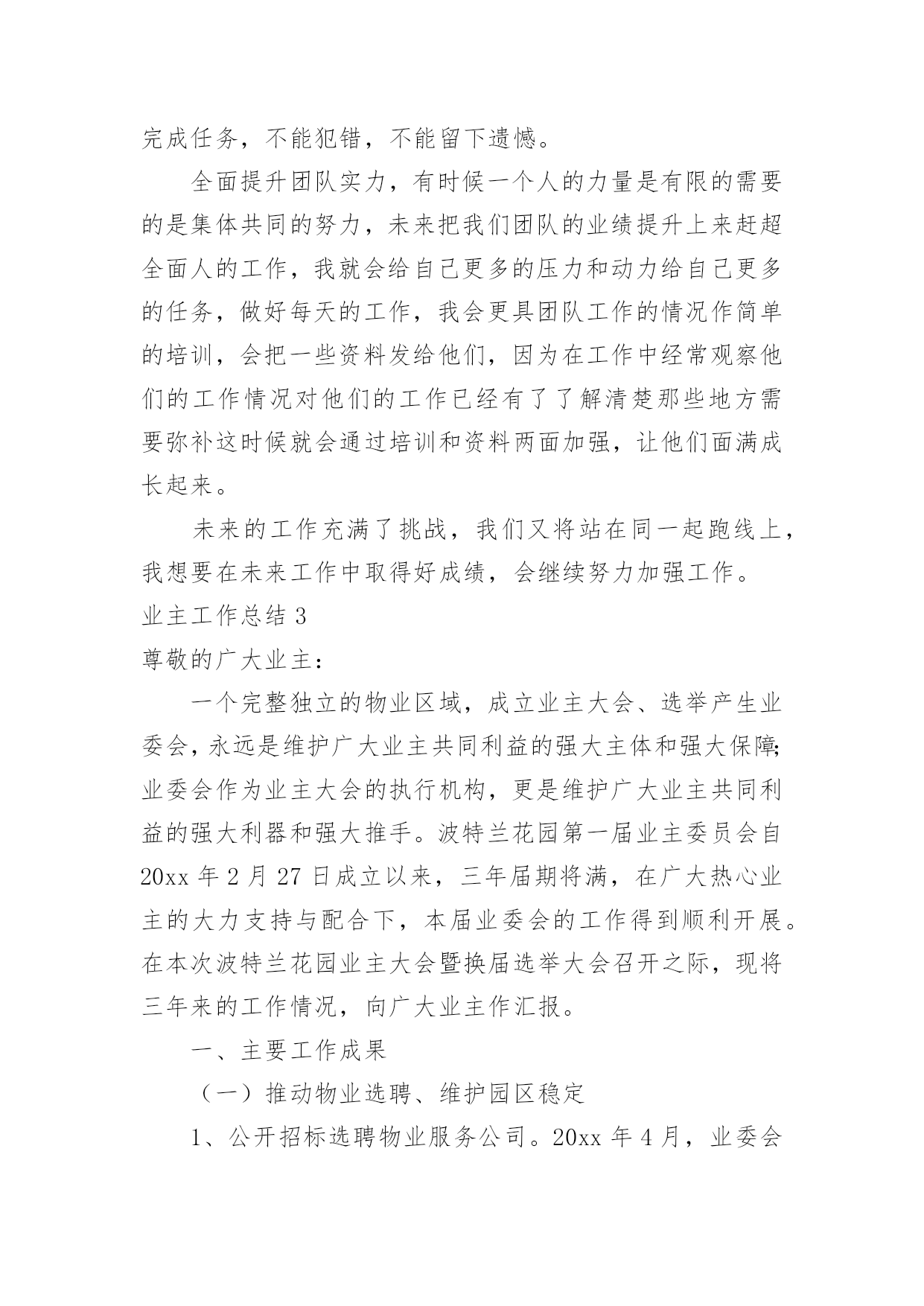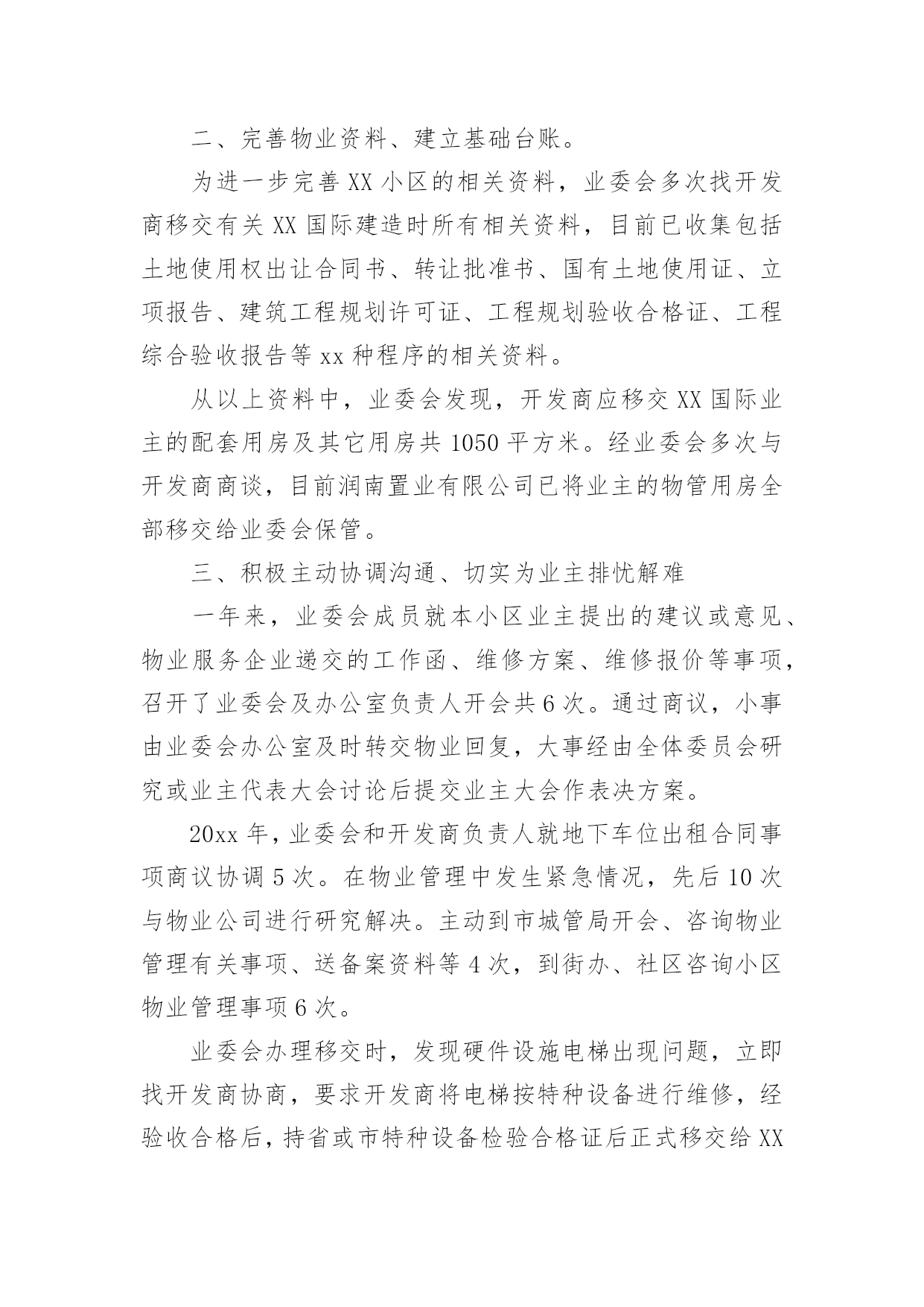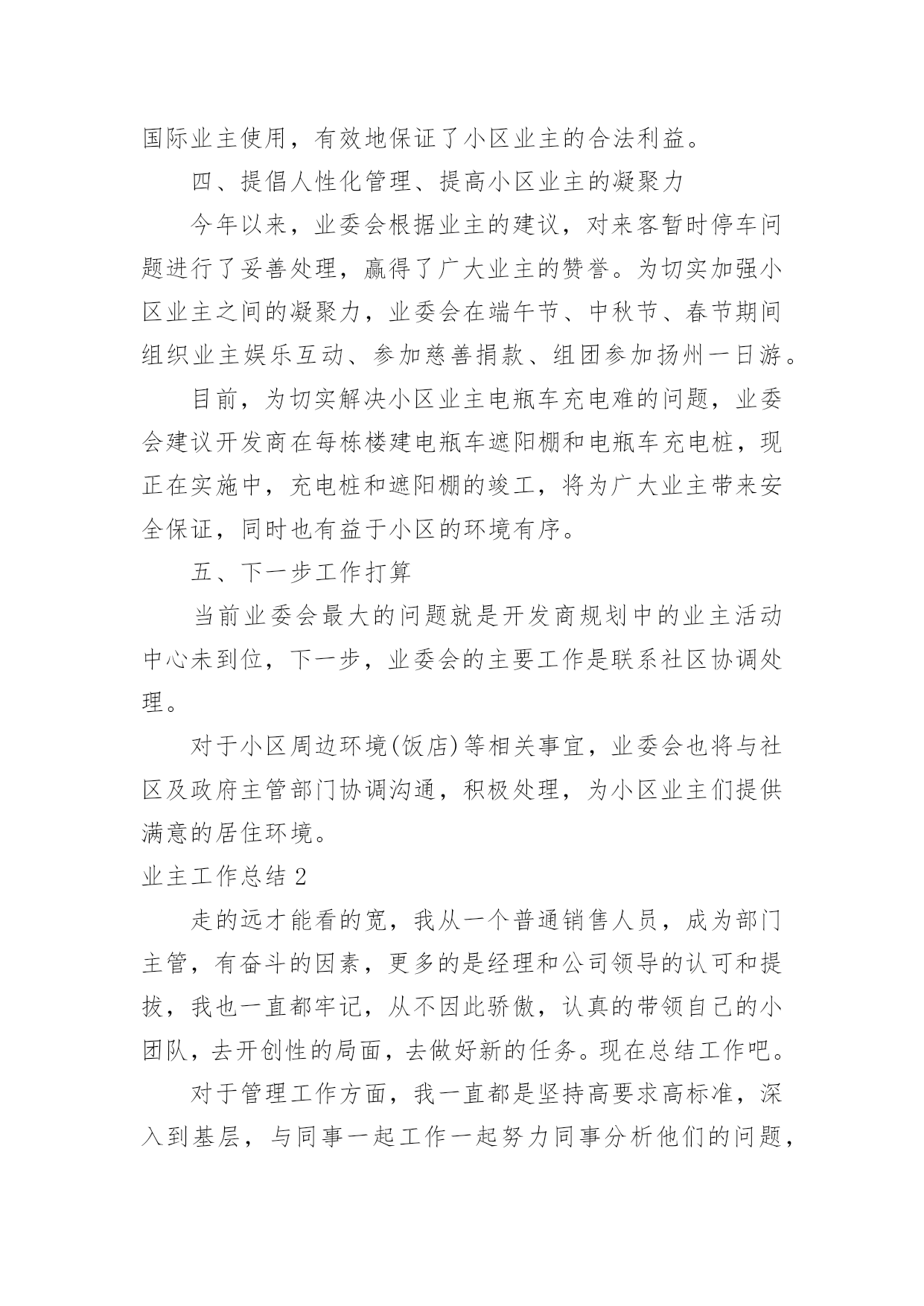 业主工作总结业主工作总结总结是在一段时间内对学习和工作生活等表现加以总结和概括的一种书面材料,它可以帮助我们有寻找学习和工作中的规律,是时候写一份总结了。那么如何把总结写出新花样呢?下面是小编收集整理的业主工作总结,仅供参考,大家一起来看看吧。业主工作总结120xx年XX国际小区业委会本着构建“和谐、文明、安全、卫生”小区的原则,在有关部门领导的关怀和指导下,在广大业主的大力支持下,积极开展维护全体业主利益和监督物业公司认真履行《物业合同》等各项工作,取得了一定的工作成绩,得到了上级领导和广大业主的认可,现将一年来的主要工作汇报如下:一、建章立制、成立组织领导机构。20xx年,根据《物业管理条例》和《业主大会规程》,在广大业主的`支持下,XX国际小区通过选举成立了第一届业主委员会,产生了主任一名、副主任两名、委员六名。业委会成立后,首先明确了业委会的职责,制订了业委会委员守则,先后修订完善了印章管理制度、财务制度、会议学习制度以及档案管理等制度,使业委会的各项工作能有有条不紊地顺利开展。二、完善物业资料、建立基础台账。为进一步完善XX小区的相关资料,业委会多次找开发商移交有关XX国际建造时所有相关资料,目前已收集包括土地使用权出让合同书、转让批准书、国有土地使用证、立项报告、建筑工程规划许可证、工程规划验收合格证、工程综合验收报告等xx种程序的相关资料。从以上资料中,业委会发现,开发商应移交XX国际业主的配套用房及其它用房共1050平方米。经业委会多次与开发商商谈,目前润南置业有限公司已将业主的物管用房全部移交给业委会保管。三、积极主动协调沟通、切实为业主排忧解难一年来,业委会成员就本小区业主提出的建议或意见、物业服务企业递交的工作函、维修方案、维修报价等事项,召开了业委会及办公室负责人开会共6次。通过商议,小事由业委会办公室及时转交物业回复,大事经由全体委员会研究或业主代表大会讨论后提交业主大会作表决方案。20xx年,业委会和开发商负责人就地下车位出租合同事项商议协调5次。在物业管理中发生紧急情况,先后10次与物业公司进行研究解决。主动到市城管局开会、咨询物业管理有关事项、送备案资料等4次,到街办、社区咨询小区物业管理事项6次。业委会办理移交时,发现硬件设施电梯出现问题,立即找开发商协商,要求开发商将电梯按特种设备进行维修,经验收合格后,持省或市特种设备检验合格证后正式移交给XX国际业主使用,有效地保证了小区业主的合法利益。四、提倡人性化管理、提高小区业主的凝聚力今年以来,业委会根据业主的建议,对来客暂时停车问题进行了妥善处理,赢得了广大业主的赞誉。为切实加强小区业主之间的凝聚力,业委会在端午节、中秋节、春节期间组织业主娱乐互动、参加慈善捐款、组团参加扬州一日游。目前,为切实解决小区业主电瓶车充电难的问题,业委会建议开发商在每栋楼建电瓶车遮阳棚和电瓶车充电桩,现正在实施中,充电桩和遮阳棚的竣工,将为广大业主带来安全保证,同时也有益于小区的环境有序。五、下一步工作打算当前业委会最大的问题就是开发商规划中的业主活动中心未到位,下一步,业委会的主要工作是联系社区协调处理。对于小区周边环境(饭店)等相关事宜,业委会也将与社区及政府主管部门协调沟通,积极处理,为小区业主们提供满意的居住环境。业主工作总结2走的远才能看的宽,我从一个普通销售人员,成为部门主管,有奋斗的因素,更多的是经理和公司领导的认可和提拔,我也一直都牢记,从不因此骄傲,认真的带领自己的小团队,去开创性的局面,去做好新的任务。现在总结工作吧。对于管理工作方面,我一直都是坚持高要求高标准,深入到基层,与同事一起工作一起努力同事分析他们的问题,给他们指明方向,对待他们有同事之情,但是到了岗位上之后就不会因为私下交情好就徇私舞弊,任何时候都保持一个公平工正的心,因为我清楚知道自己的责任,在岗位上大家不患寡患不均,一旦有失公允则会失去人心一个队伍就散了,并且一个团队最终要的就是有凝聚力,有积极奋斗的动力,而我就是他们的核心,在大方向给他们指定好,在细节上给他们适当帮助,让部门的人做到共同发展,总是团队荣誉,为了加强团队成员之间的合作和竞争,我制定了竞争制度,每个人都会两两竞争,我会作为裁判,会在每周列会的时候判断他们的成绩,给他们相应的奖励,毕竟如果想让马儿跑,却不给他们好的福利只会让他们停滞不前,我们要的是他们继续努力去发展,去创造而不是让他们停止不前,努力靠的是所有人齐心协力,但是每一个人都必须尽全力做好,这才能够取得好成绩,这才能有好结果,毕竟我们想要发展,就要把他们管理得当。自我工作上面,我会认真做好自己,完成工作,很多时候员工都愿意想我看齐,我就必须要做出成绩,做好事情,把这个榜样做的更好让手下的人以后一个前进的目标,对于自己的工作我喜欢的是做细做全,同时会把自己