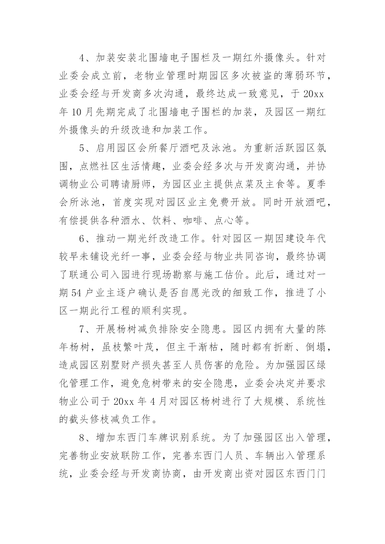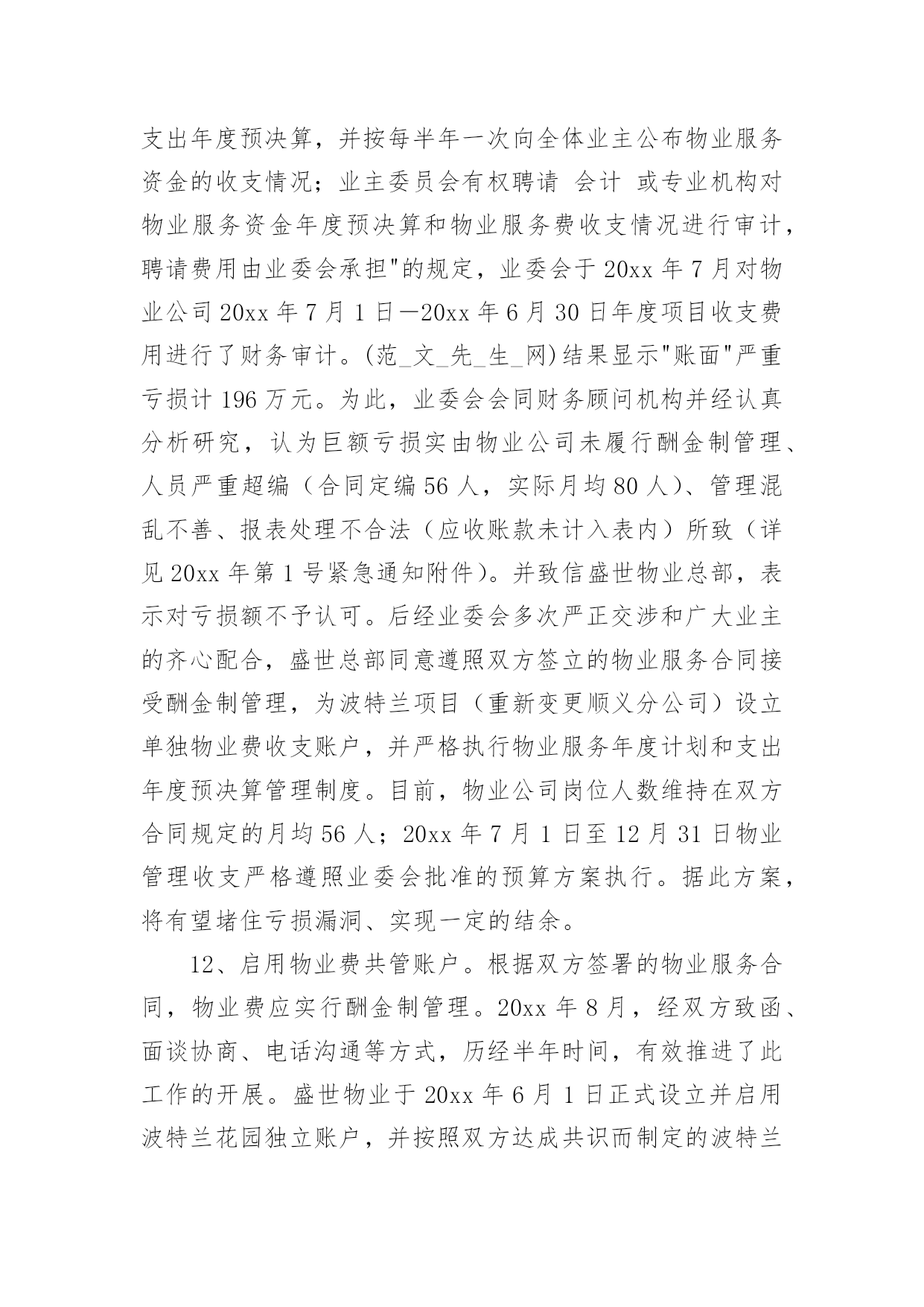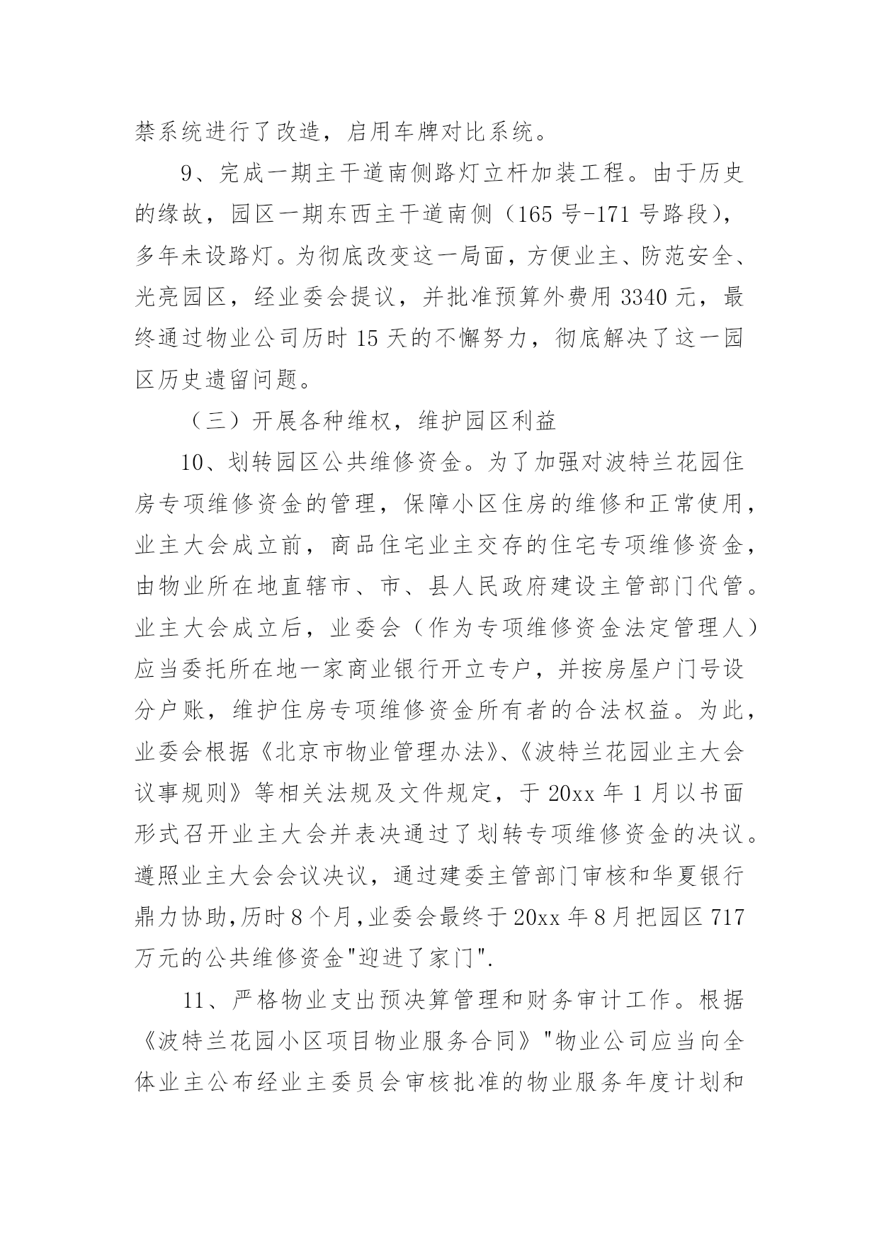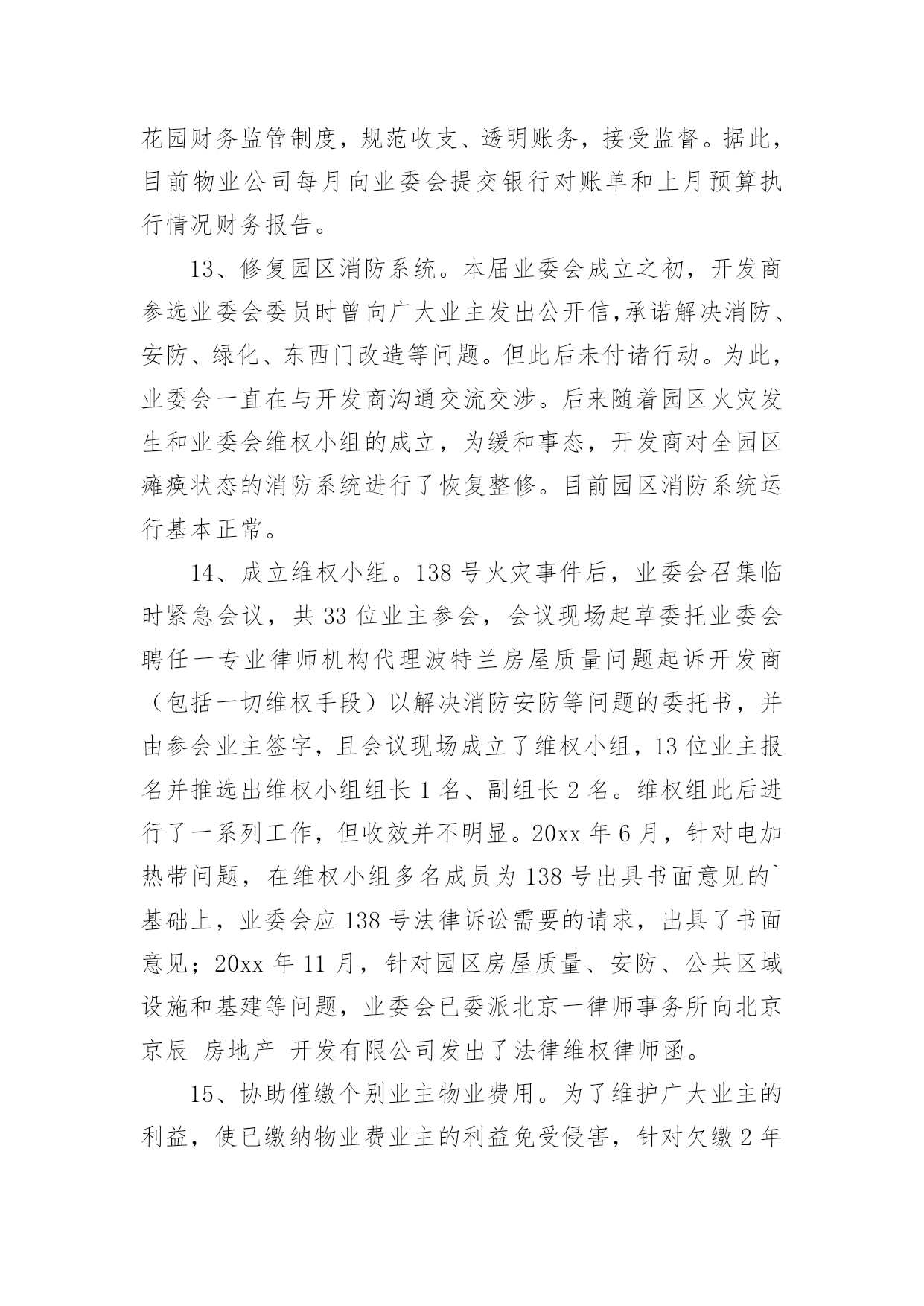 业主工作总结业主工作总结总结是在一段时间内对学习和工作生活等表现加以总结和概括的一种书面材料,它可以帮助我们有寻找学习和工作中的规律,是时候写一份总结了。那么如何把总结写出新花样呢?下面是小编收集整理的业主工作总结,仅供参考,大家一起来看看吧。业主工作总结120xx年XX国际小区业委会本着构建“和谐、文明、安全、卫生”小区的原则,在有关部门领导的关怀和指导下,在广大业主的大力支持下,积极开展维护全体业主利益和监督物业公司认真履行《物业合同》等各项工作,取得了一定的工作成绩,得到了上级领导和广大业主的认可,现将一年来的主要工作汇报如下:一、建章立制、成立组织领导机构。20xx年,根据《物业管理条例》和《业主大会规程》,在广大业主的`支持下,XX国际小区通过选举成立了第一届业主委员会,产生了主任一名、副主任两名、委员六名。业委会成立后,首先明确了业委会的职责,制订了业委会委员守则,先后修订完善了印章管理制度、财务制度、会议学习制度以及档案管理等制度,使业委会的各项工作能有有条不紊地顺利开展。二、完善物业资料、建立基础台账。为进一步完善XX小区的相关资料,业委会多次找开发商移交有关XX国际建造时所有相关资料,目前已收集包括土地使用权出让合同书、转让批准书、国有土地使用证、立项报告、建筑工程规划许可证、工程规划验收合格证、工程综合验收报告等xx种程序的相关资料。从以上资料中,业委会发现,开发商应移交XX国际业主的配套用房及其它用房共1050平方米。经业委会多次与开发商商谈,目前润南置业有限公司已将业主的物管用房全部移交给业委会保管。三、积极主动协调沟通、切实为业主排忧解难一年来,业委会成员就本小区业主提出的建议或意见、物业服务企业递交的工作函、维修方案、维修报价等事项,召开了业委会及办公室负责人开会共6次。通过商议,小事由业委会办公室及时转交物业回复,大事经由全体委员会研究或业主代表大会讨论后提交业主大会作表决方案。20xx年,业委会和开发商负责人就地下车位出租合同事项商议协调5次。在物业管理中发生紧急情况,先后10次与物业公司进行研究解决。主动到市城管局开会、咨询物业管理有关事项、送备案资料等4次,到街办、社区咨询小区物业管理事项6次。业委会办理移交时,发现硬件设施电梯出现问题,立即找开发商协商,要求开发商将电梯按特种设备进行维修,经验收合格后,持省或市特种设备检验合格证后正式移交给XX国际业主使用,有效地保证了小区业主的合法利益。四、提倡人性化管理、提高小区业主的凝聚力今年以来,业委会根据业主的建议,对来客暂时停车问题进行了妥善处理,赢得了广大业主的赞誉。为切实加强小区业主之间的凝聚力,业委会在端午节、中秋节、春节期间组织业主娱乐互动、参加慈善捐款、组团参加扬州一日游。目前,为切实解决小区业主电瓶车充电难的问题,业委会建议开发商在每栋楼建电瓶车遮阳棚和电瓶车充电桩,现正在实施中,充电桩和遮阳棚的竣工,将为广大业主带来安全保证,同时也有益于小区的环境有序。五、下一步工作打算当前业委会最大的问题就是开发商规划中的业主活动中心未到位,下一步,业委会的主要工作是联系社区协调处理。对于小区周边环境(饭店)等相关事宜,业委会也将与社区及政府主管部门协调沟通,积极处理,为小区业主们提供满意的居住环境。业主工作总结2走的远才能看的宽,我从一个普通销售人员,成为部门主管,有奋斗的因素,更多的是经理和公司领导的认可和提拔,我也一直都牢记,从不因此骄傲,认真的带领自己的小团队,去开创性的局面,去做好新的任务。现在总结工作吧。对于管理工作方面,我一直都是坚持高要求高标准,深入到基层,与同事一起工作一起努力同事分析他们的问题,给他们指明方向,对待他们有同事之情,但是到了岗位上之后就不会因为私下交情好就徇私舞弊,任何时候都保持一个公平工正的心,因为我清楚知道自己的责任,在岗位上大家不患寡患不均,一旦有失公允则会失去人心一个队伍就散了,并且一个团队最终要的就是有凝聚力,有积极奋斗的动力,而我就是他们的核心,在大方向给他们指定好,在细节上给他们适当帮助,让部门的人做到共同发展,总是团队荣誉,为了加强团队成员之间的合作和竞争,我制定了竞争制度,每个人都会两两竞争,我会作为裁判,会在每周列会的时候判断他们的成绩,给他们相应的奖励,毕竟如果想让马儿跑,却不给他们好的福利只会让他们停滞不前,我们要的是他们继续努力去发展,去创造而不是让他们停止不前,努力靠的是所有人齐心协力,但是每一个人都必须尽全力做好,这才能够取得好成绩,这才能有好结果,毕竟我们想要发展,就要把他们管理得当。自我工作上面,我会认真做好自己,完成工作,很多时候员工都愿意想我看齐,我就必须要做出成绩,做好事情,把这个榜样做的更好让手下的人以后一个前进的目标,对于自己的工作我喜欢的是做细做全,同时会把自己