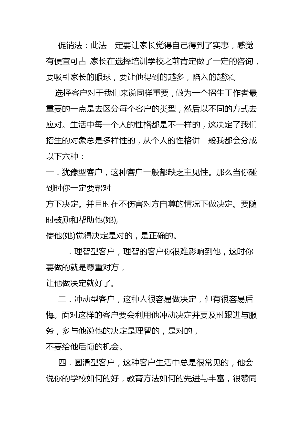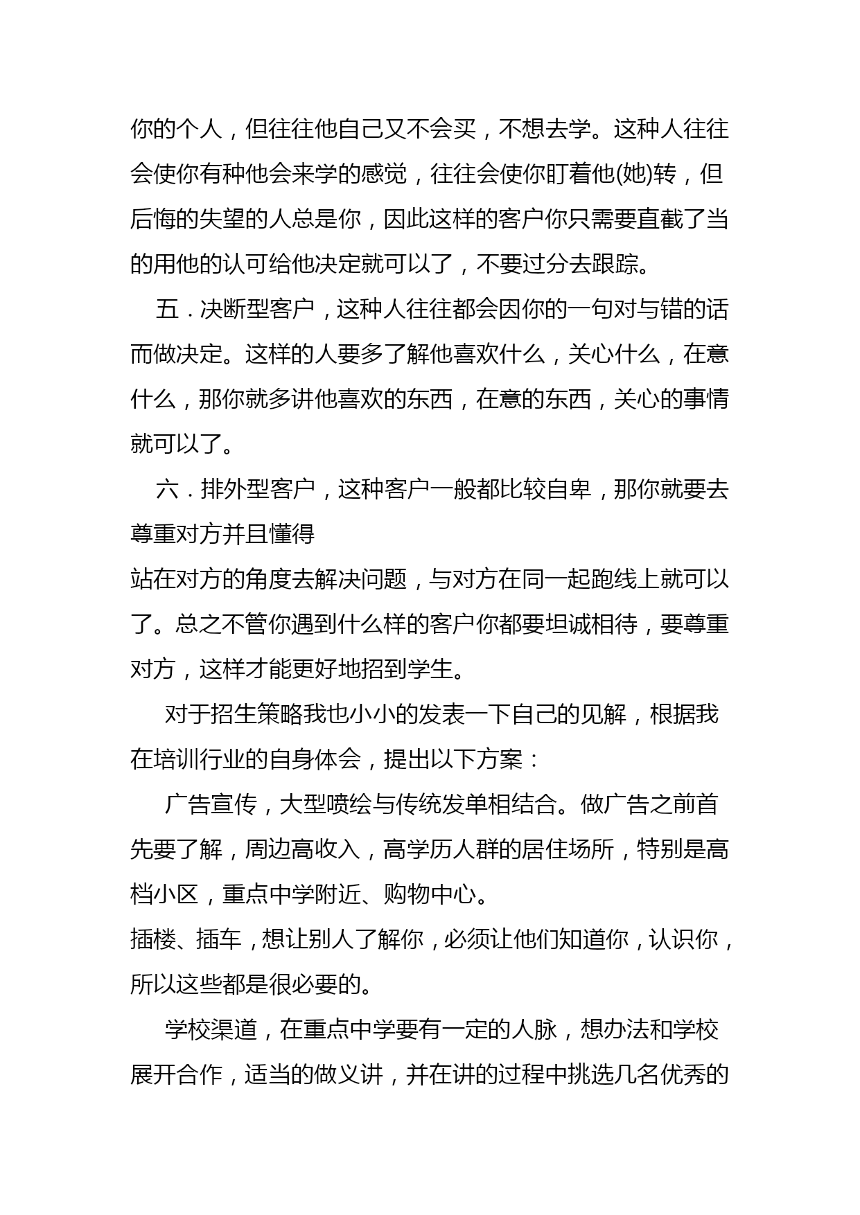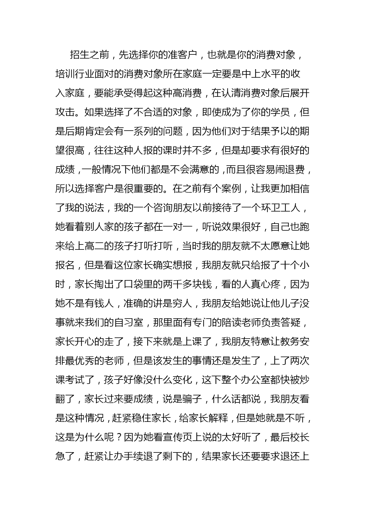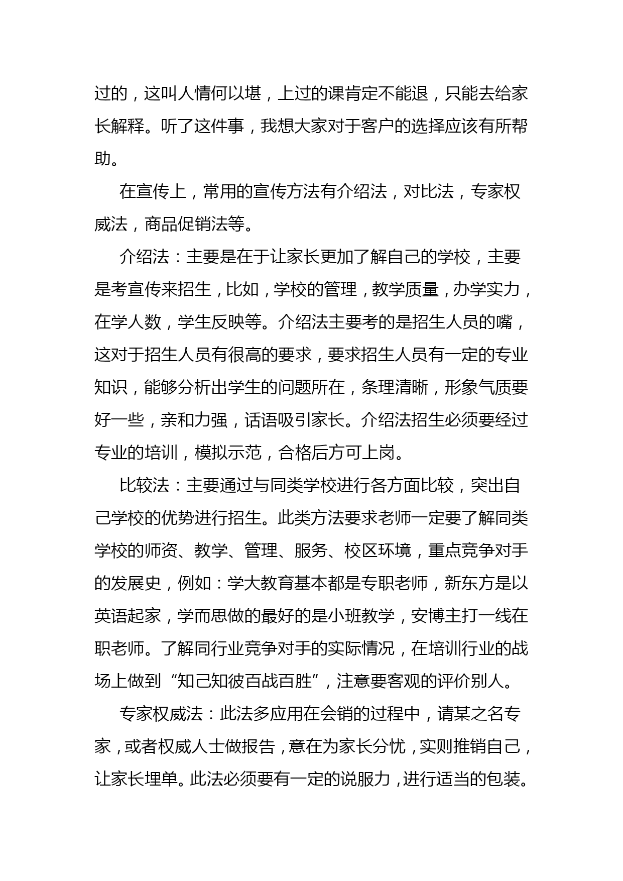 培训机构的招生方案(完整版)资料(可以直接使用,可编辑优秀版资料,欢迎下载)培训机构的灵魂好久没有写东西了,前些天我一个朋友想自己开个辅导班,向我咨询了一些招生和咨询的问题,自己在培训行业也混了好几年了,我也就根据自己这些年的经验大致总结了几点,这些也只是我的个人观点,希望对周围做培训行业的朋友有所帮助。我先大致介绍一下,我叫康小龙,之前在安博教育做小学奥数、初中数学老师,不仅做过老师还做过教务、市场。安博基本都是兼职老师,我是当时我们校区当时唯一的两个专职老师中的一个,所以做的事比较多,干的活比较杂,但是确实在这行学到了不少东西。由于个人原因离开了我的家乡、抛弃了把我培养起来的公司来到了宁波,进入了龙文教育。下面我就针对我朋友向我咨询的问题,把我的经验介绍给大家。首先他问我怎么去招生,对于招生有什么好的办法:在培训行业干,学生就是这个机构存活的血液,生源的好坏直接决定一个培训机构的命运,好的生源就算你不会做也能做好,面对差的生源你也只能是巧妇难为无米之炊。对于每个成熟的机构都有他固定的招生模式,这对于业务的扩张有良好的促进作用,只需要复制粘贴。下面我介绍几种常用的招生方法:招生之前,先选择你的准客户,也就是你的消费对象,培训行业面对的消费对象所在家庭一定要是中上水平的收入家庭,要能承受得起这种高消费,在认清消费对象后展开攻击。如果选择了不合适的对象,即使成为了你的学员,但是后期肯定会有一系列的问题,因为他们对于结果予以的期望很高,往往这种人报的课时并不多,但是却要求有很好的成绩,一般情况下他们都是不会满意的,而且很容易闹退费,所以选择客户是很重要的。在之前有个案例,让我更加相信了我的说法,我的一个咨询朋友以前接待了一个环卫工人,她看着别人家的孩子都在一对一,听说效果很好,自己也跑来给上高二的孩子打听打听,当时我的朋友就不太愿意让她报名,但是看这位家长确实想报,我朋友就只给报了十个小时,家长掏出了口袋里的两千多块钱,看的人真心疼,因为她不是有钱人,准确的讲是穷人,我朋友给她说让他儿子没事就来我们的自习室,那里面有专门的陪读老师负责答疑,家长开心的走了,接下来就是上课了,我朋友特意让教务安排最优秀的老师,但是该发生的事情还是发生了,上了两次课考试了,孩子好像没什么变化,这下整个办公室都快被炒翻了,家长过来要成绩,说是骗子,什么话都说,我朋友看是这种情况,赶紧稳住家长,给家长解释,但是她就是不听,这是为什么呢?因为她看宣传页上说的太好听了,最后校长急了,赶紧让办手续退了剩下的,结果家长还要要求退还上过的,这叫人情何以堪,上过的课肯定不能退,只能去给家长解释。听了这件事,我想大家对于客户的选择应该有所帮助。在宣传上,常用的宣传方法有介绍法,对比法,专家权威法,商品促销法等。介绍法:主要是在于让家长更加了解自己的学校,主要是考宣传来招生,比如,学校的管理,教学质量,办学实力,在学人数,学生反映等。介绍法主要考的是招生人员的嘴,这对于招生人员有很高的要求,要求招生人员有一定的专业知识,能够分析出学生的问题所在,条理清晰,形象气质要好一些,亲和力强,话语吸引家长。介绍法招生必须要经过专业的培训,模拟示范,合格后方可上岗。比较法:主要通过与同类学校进行各方面比较,突出自己学校的优势进行招生。此类方法要求老师一定要了解同类学校的师资、教学、管理、服务、校区环境,重点竞争对手的发展史,例如:学大教育基本都是专职老师,新东方是以英语起家,学而思做的最好的是小班教学,安博主打一线在职老师。了解同行业竞争对手的实际情况,在培训行业的战场上做到“知己知彼百战百胜”,注意要客观的评价别人。专家权威法:此法多应用在会销的过程中,请某之名专家,或者权威人士做报告,意在为家长分忧,实则推销自己,让家长埋单。此法必须要有一定的说服力,进行适当的包装。促销法:此法一定要让家长觉得自己得到了实惠,感觉有便宜可占,家长在选择培训学校之前肯定做了一定的咨询,要吸引家长的眼球,要让他得到的越多,陷入的越深。选择客户对于我们来说同样重要,做为一个招生工作者最重要的一点是去区分每个客户的类型,然后以不同的方式去应对。生活中每一个人的性格都是不一样的,这决定了我们招生的对象总是多样性的,从个人的性格讲一般我都会分成以下六种:一.犹豫型客户,这种客户一般都缺乏主见性。那么当你碰到时你一定要帮对方下决定。并且时在不伤害对方自尊的情况下做决定。要随时鼓励和帮助他(她),使他(她)觉得决定是对的,是正确的。二.理智型客户,理智的客户你很难影响到他,这时你要做的就是尊重对方,让他做决定就好了。三.冲动型客户,这种人很容易做决定,但有很容易后悔。面对这样的客户要会利用他冲动决定并要及时跟进与服务,多与他说他的决定是理智的,是对的,不要给他后悔