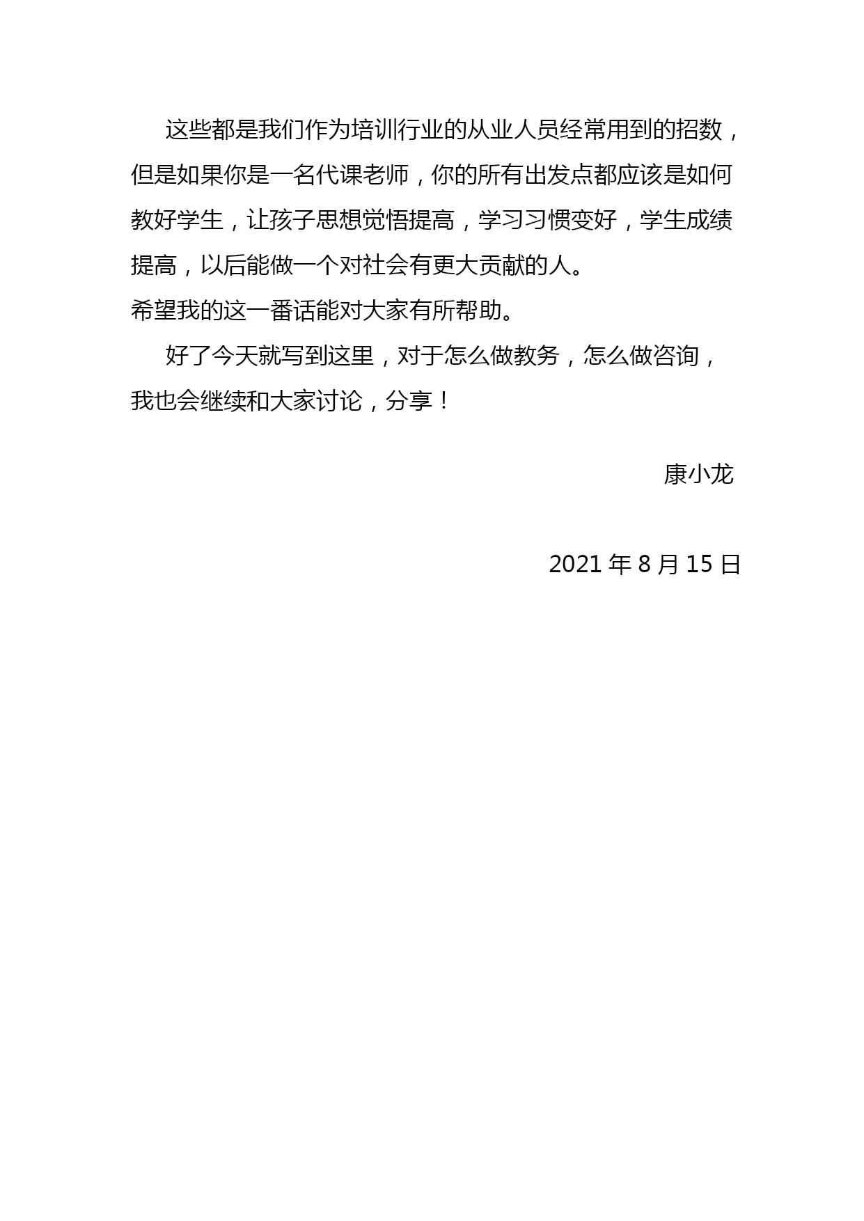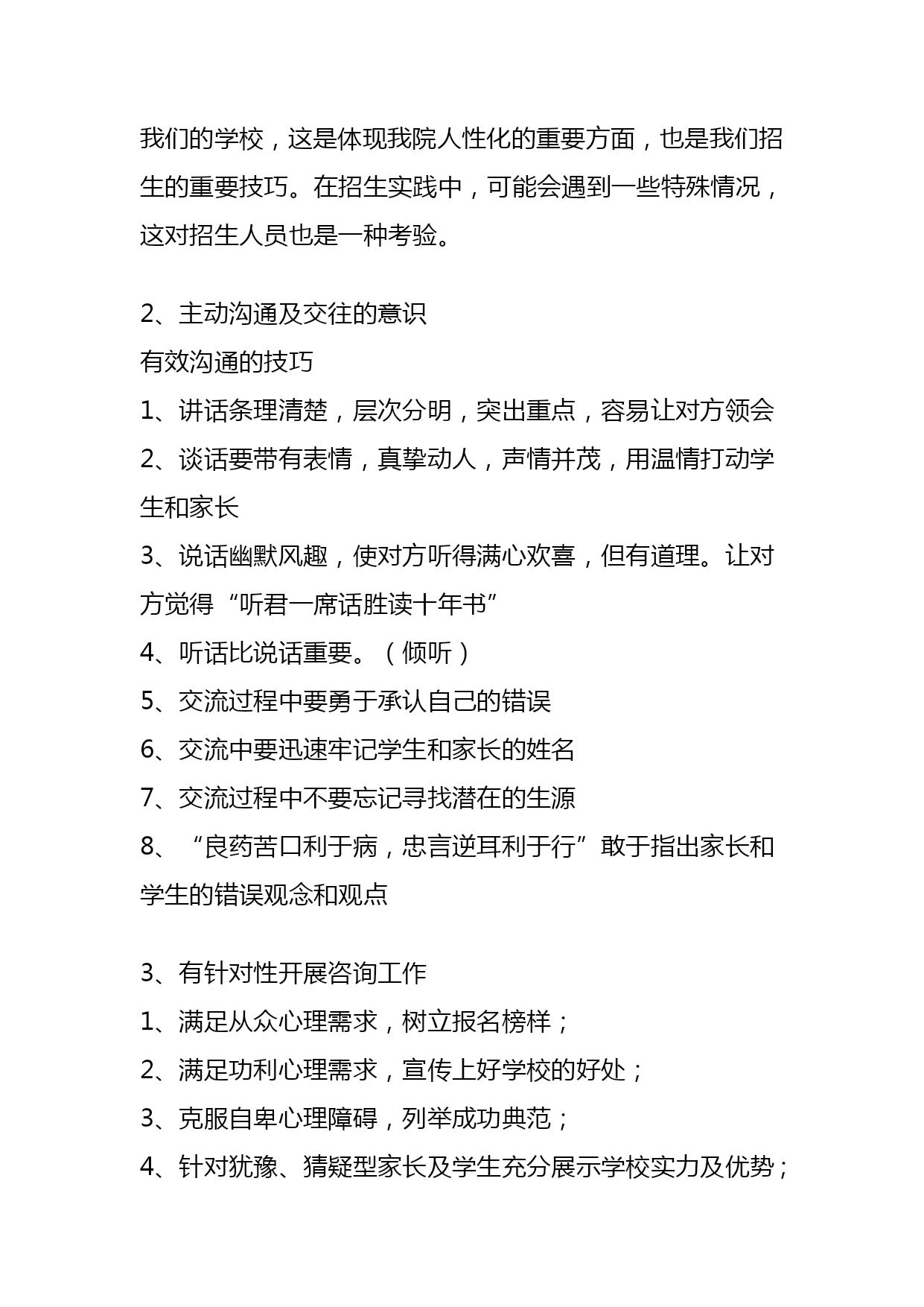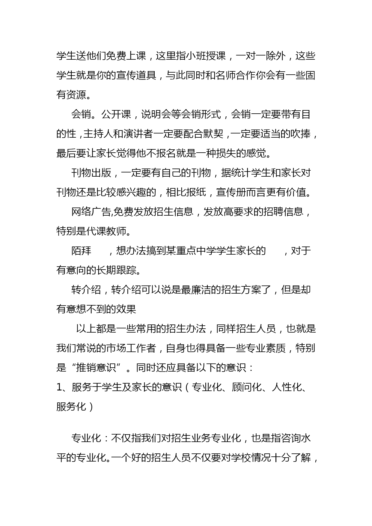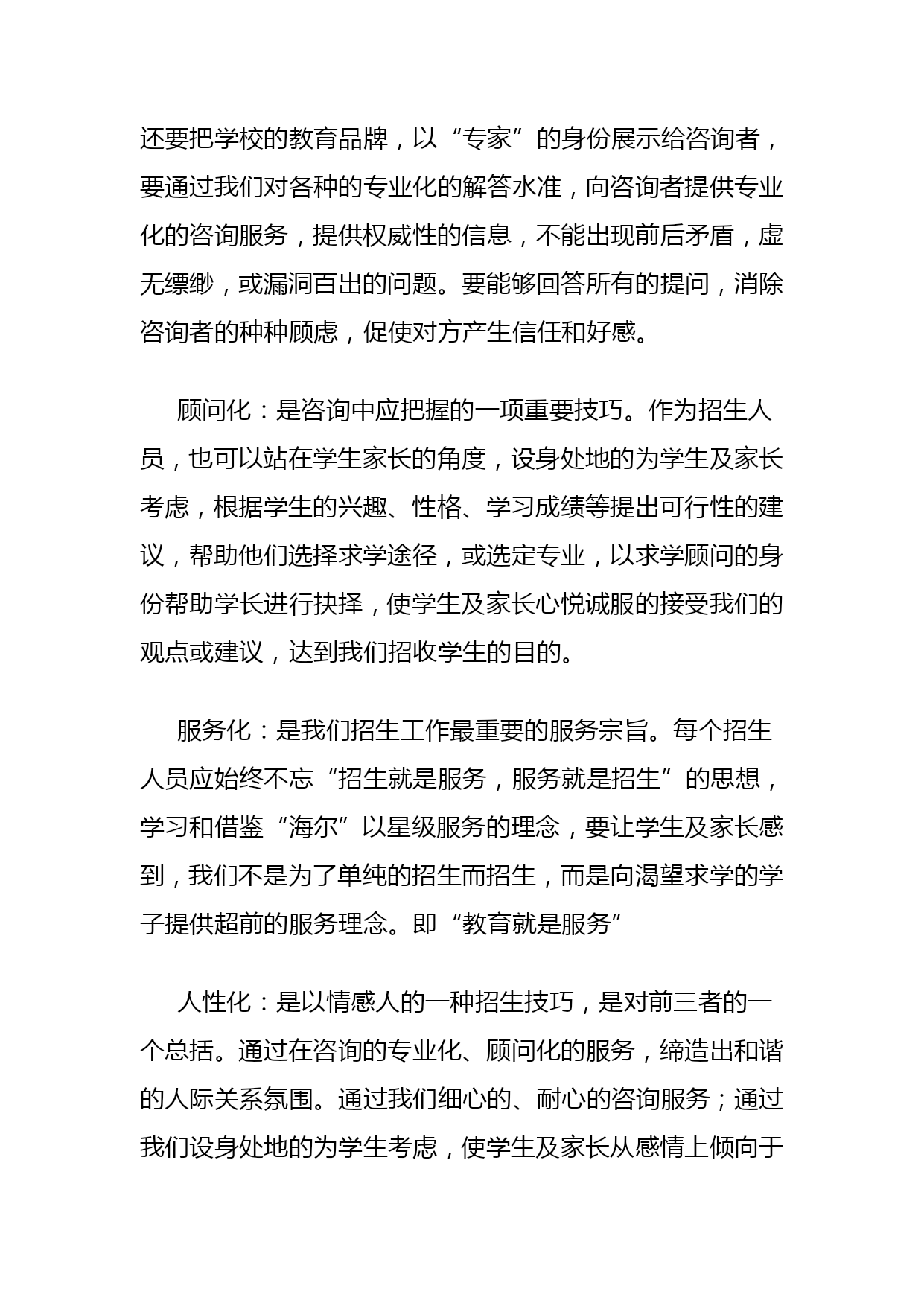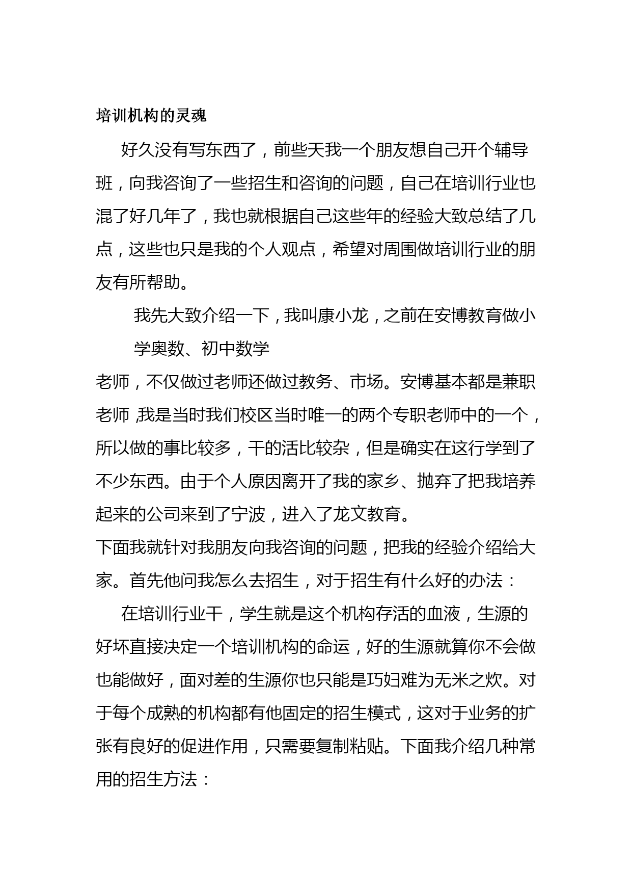 培训机构的招生方案(完整版)资料(可以直接使用,可编辑优秀版资料,欢迎下载)培训机构的灵魂好久没有写东西了,前些天我一个朋友想自己开个辅导班,向我咨询了一些招生和咨询的问题,自己在培训行业也混了好几年了,我也就根据自己这些年的经验大致总结了几点,这些也只是我的个人观点,希望对周围做培训行业的朋友有所帮助。我先大致介绍一下,我叫康小龙,之前在安博教育做小学奥数、初中数学老师,不仅做过老师还做过教务、市场。安博基本都是兼职老师,我是当时我们校区当时唯一的两个专职老师中的一个,所以做的事比较多,干的活比较杂,但是确实在这行学到了不少东西。由于个人原因离开了我的家乡、抛弃了把我培养起来的公司来到了宁波,进入了龙文教育。下面我就针对我朋友向我咨询的问题,把我的经验介绍给大家。首先他问我怎么去招生,对于招生有什么好的办法:在培训行业干,学生就是这个机构存活的血液,生源的好坏直接决定一个培训机构的命运,好的生源就算你不会做也能做好,面对差的生源你也只能是巧妇难为无米之炊。对于每个成熟的机构都有他固定的招生模式,这对于业务的扩张有良好的促进作用,只需要复制粘贴。下面我介绍几种常用的招生方法:招生之前,先选择你的准客户,也就是你的消费对象,培训行业面对的消费对象所在家庭一定要是中上水平的收入家庭,要能承受得起这种高消费,在认清消费对象后展开攻击。如果选择了不合适的对象,即使成为了你的学员,但是后期肯定会有一系列的问题,因为他们对于结果予以的期望很高,往往这种人报的课时并不多,但是却要求有很好的成绩,一般情况下他们都是不会满意的,而且很容易闹退费,所以选择客户是很重要的。在之前有个案例,让我更加相信了我的说法,我的一个咨询朋友以前接待了一个环卫工人,她看着别人家的孩子都在一对一,听说效果很好,自己也跑来给上高二的孩子打听打听,当时我的朋友就不太愿意让她报名,但是看这位家长确实想报,我朋友就只给报了十个小时,家长掏出了口袋里的两千多块钱,看的人真心疼,因为她不是有钱人,准确的讲是穷人,我朋友给她说让他儿子没事就来我们的自习室,那里面有专门的陪读老师负责答疑,家长开心的走了,接下来就是上课了,我朋友特意让教务安排最优秀的老师,但是该发生的事情还是发生了,上了两次课考试了,孩子好像没什么变化,这下整个办公室都快被炒翻了,家长过来要成绩,说是骗子,什么话都说,我朋友看是这种情况,赶紧稳住家长,给家长解释,但是她就是不听,这是为什么呢?因为她看宣传页上说的太好听了,最后校长急了,赶紧让办手续退了剩下的,结果家长还要要求退还上过的,这叫人情何以堪,上过的课肯定不能退,只能去给家长解释。听了这件事,我想大家对于客户的选择应该有所帮助。在宣传上,常用的宣传方法有介绍法,对比法,专家权威法,商品促销法等。介绍法:主要是在于让家长更加了解自己的学校,主要是考宣传来招生,比如,学校的管理,教学质量,办学实力,在学人数,学生反映等。介绍法主要考的是招生人员的嘴,这对于招生人员有很高的要求,要求招生人员有一定的专业知识,能够分析出学生的问题所在,条理清晰,形象气质要好一些,亲和力强,话语吸引家长。介绍法招生必须要经过专业的培训,模拟示范,合格后方可上岗。比较法:主要通过与同类学校进行各方面比较,突出自己学校的优势进行招生。此类方法要求老师一定要了解同类学校的师资、教学、管理、服务、校区环境,重点竞争对手的发展史,例如:学大教育基本都是专职老师,新东方是以英语起家,学而思做的最好的是小班教学,安博主打一线在职老师。了解同行业竞争对手的实际情况,在培训行业的战场上做到“知己知彼百战百胜”,注意要客观的评价别人。专家权威法:此法多应用在会销的过程中,请某之名专家,或者权威人士做报告,意在为家长分忧,实则推销自己,让家长埋单。此法必须要有一定的说服力,进行适当的包装。促销法:此法一定要让家长觉得自己得到了实惠,感觉有便宜可占,家长在选择培训学校之前肯定做了一定的咨询,要吸引家长的眼球,要让他得到的越多,陷入的越深。选择客户对于我们来说同样重要,做为一个招生工作者最重要的一点是去区分每个客户的类型,然后以不同的方式去应对。生活中每一个人的性格都是不一样的,这决定了我们招生的对象总是多样性的,从个人的性格讲一般我都会分成以下六种:一.犹豫型客户,这种客户一般都缺乏主见性。那么当你碰到时你一定要帮对方下决定。并且时在不伤害对方自尊的情况下做决定。要随时鼓励和帮助他(她),使他(她)觉得决定是对的,是正确的。二.理智型客户,理智的客户你很难影响到他,这时你要做的就是尊重对方,让他做决定就好了。三.冲动型客户,这种人很容易做决定,但有很容易后悔。面对这样的客户要会利用他冲动决定并要及时跟进与服务,多与他说他的决定是理智的,是对的,不要给他后悔
