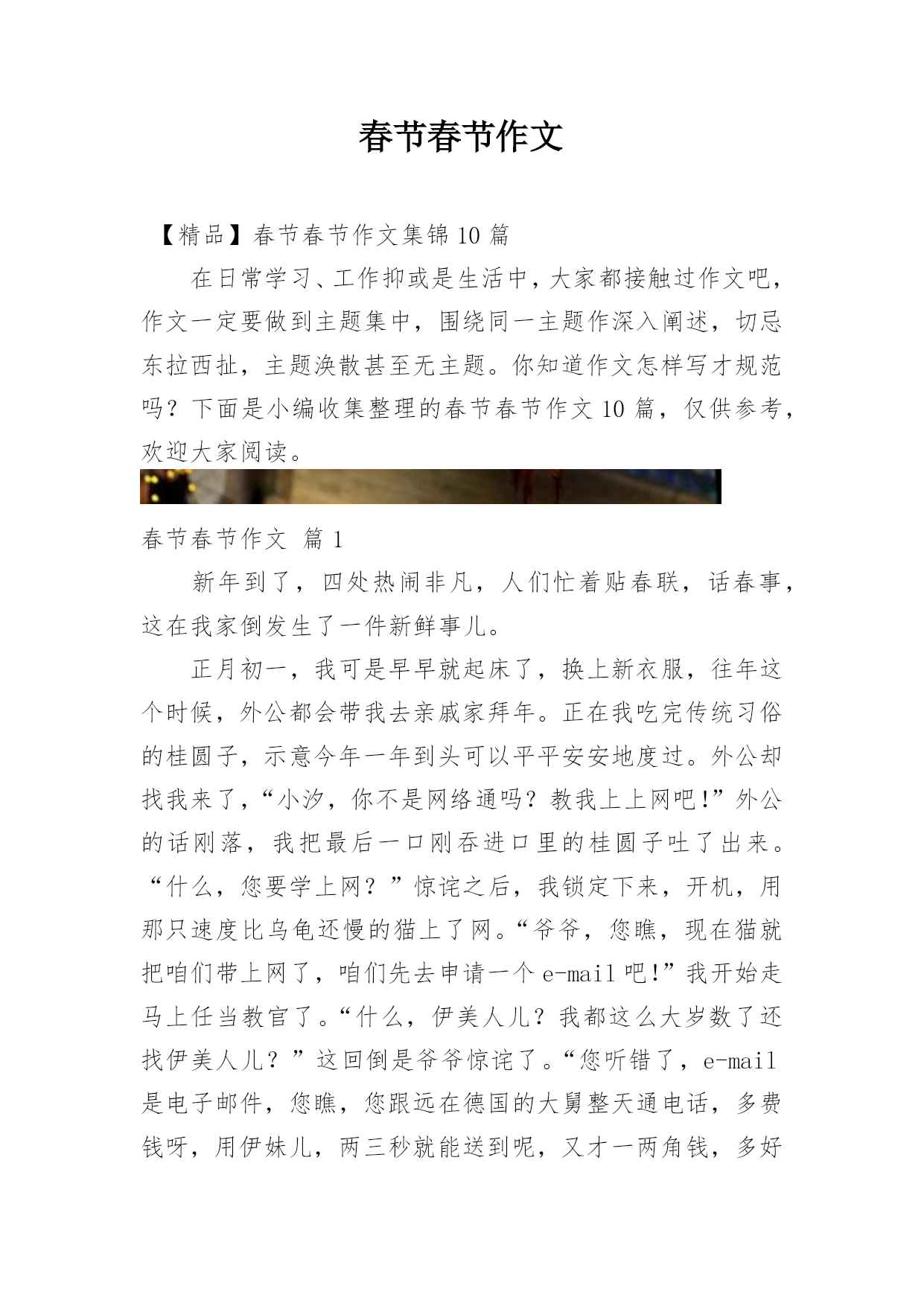 春节春节作文【精品】春节春节作文集锦10篇在日常学习、工作抑或是生活中,大家都接触过作文吧,作文一定要做到主题集中,围绕同一主题作深入阐述,切忌东拉西扯,主题涣散甚至无主题。你知道作文怎样写才规范吗?下面是小编收集整理的春节春节作文10篇,仅供参考,欢迎大家阅读。春节春节作文篇1新年到了,四处热闹非凡,人们忙着贴春联,话春事,这在我家倒发生了一件新鲜事儿。正月初一,我可是早早就起床了,换上新衣服,往年这个时候,外公都会带我去亲戚家拜年。正在我吃完传统习俗的桂圆子,示意今年一年到头可以平平安安地度过。外公却