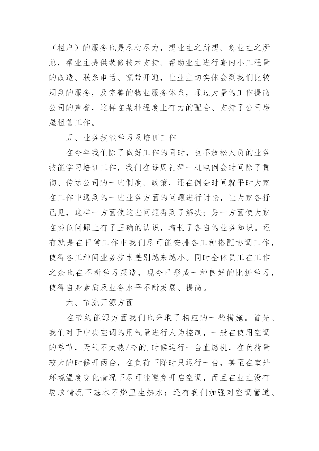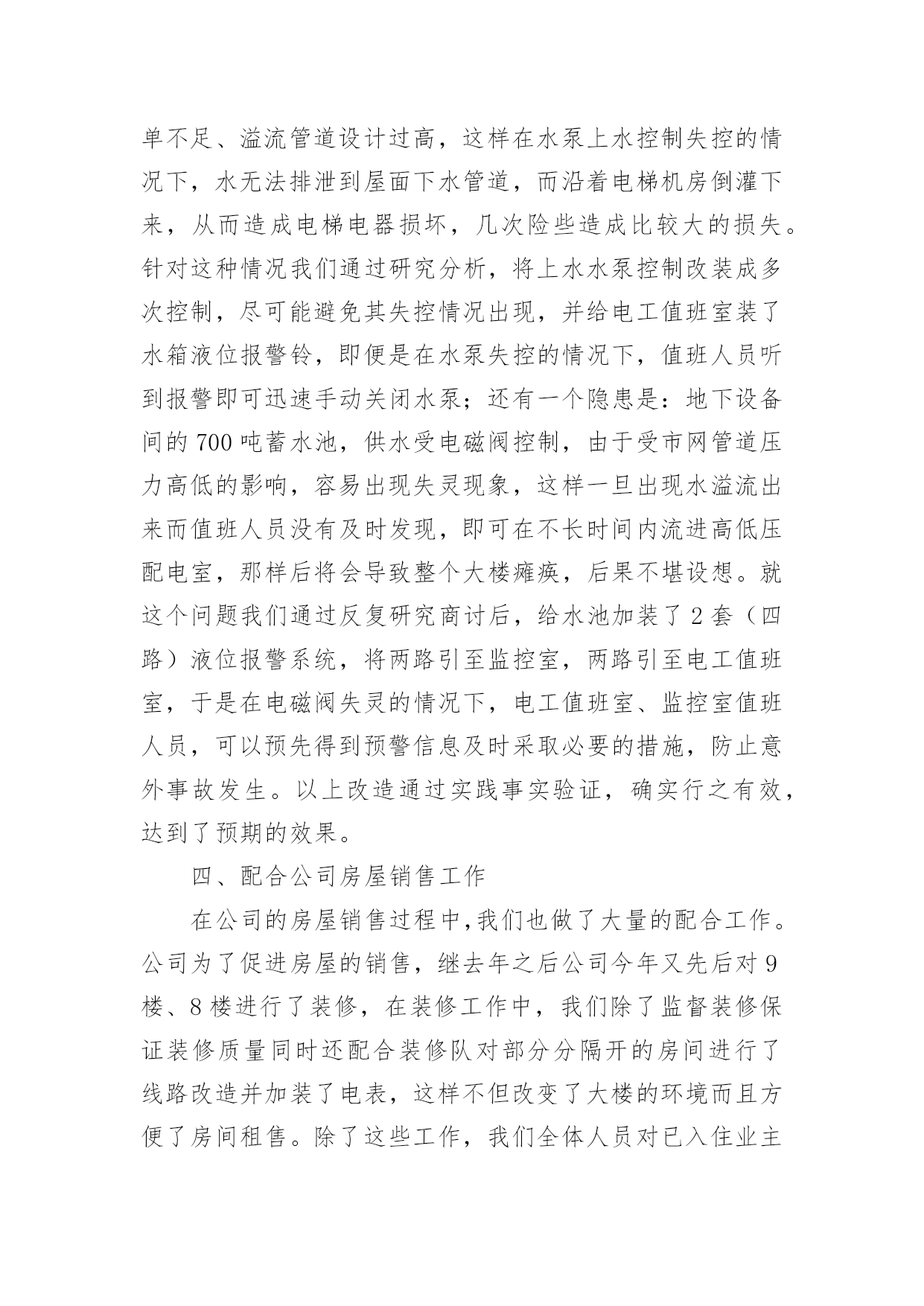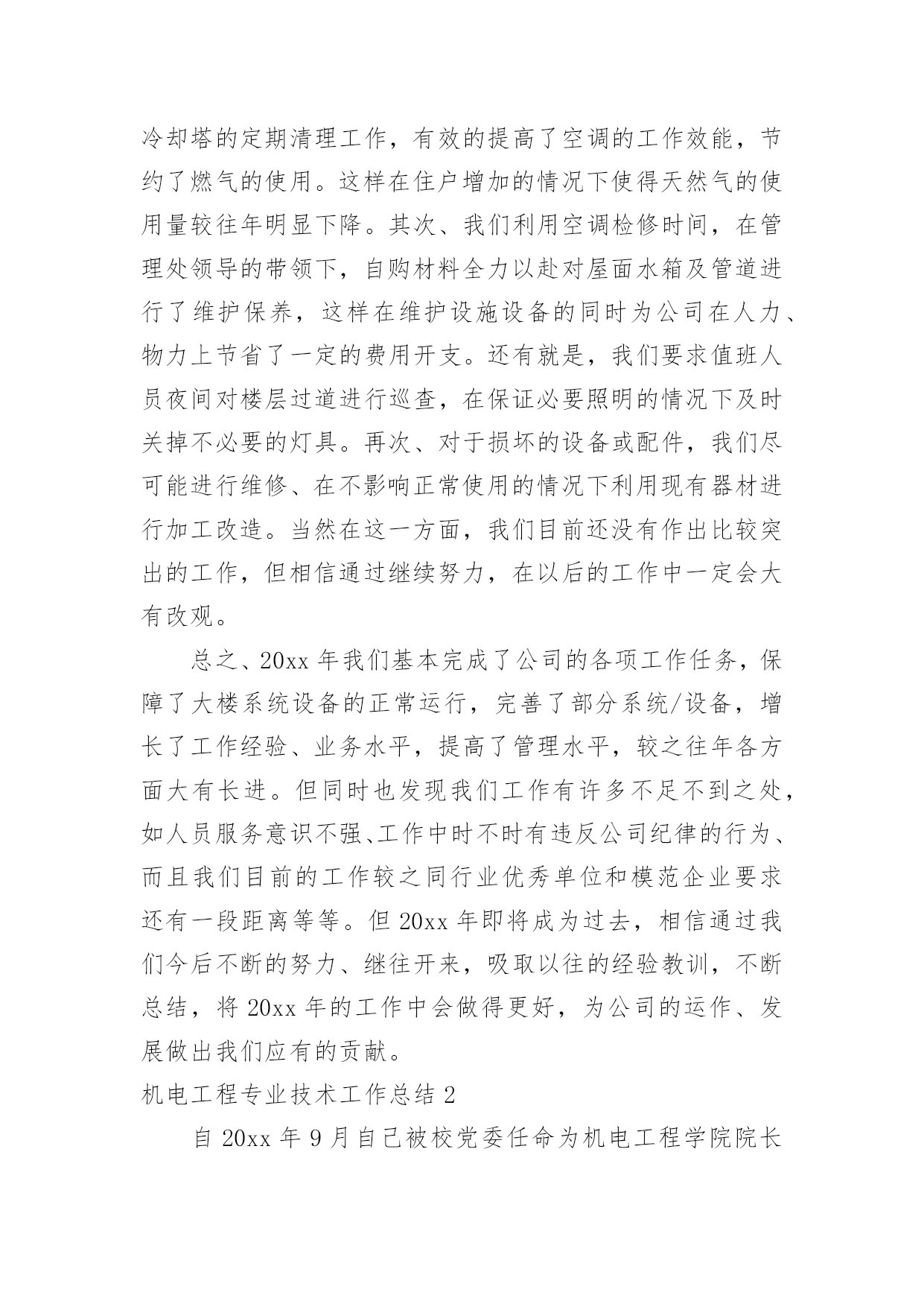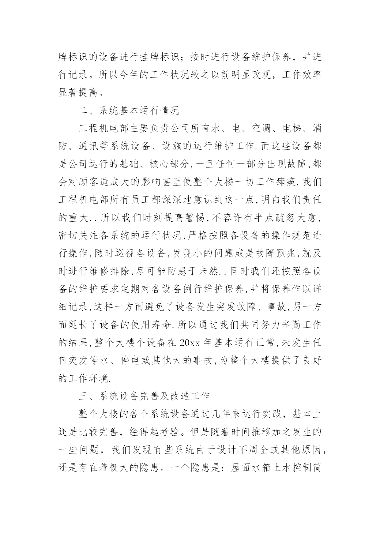 机电工程专业技术工作总结机电工程专业技术工作总结总结是对某一特定时间段内的学习和工作生活等表现情况加以回顾和分析的一种书面材料,它可以帮助我们总结以往思想,发扬成绩,不妨让我们认真地完成总结吧。那么如何把总结写出新花样呢?下面是小编为大家整理的机电工程专业技术工作总结,欢迎大家借鉴与参考,希望对大家有所帮助。机电工程专业技术工作总结120xx年即将过去,回顾这一年,工程机电部全体人员在主管领导的领导下,坚守岗位、努力工作,保障了各个系统设备正常运行,为公司正常工作提供了良好的环境。虽然本部门对于公司并没有什么突出的贡献,但是通过这一年的工作,大家积累了大量的工作经验,各方面都得到了相应的充实和提高。现就工程机电部全年的工作情况作以总结汇报.本部门全年来的工作大体可归结为以下几个方面:一、完善落实各项制度公司在去年已经通过了ISO9000质量管理体系认证,所以今年我们的工作则严格按照质量管理体系要求办事,全面贯彻和落实公司的各项规章制度。设备的运行、操作、保养,遵守文件程序的要求:设备操作程序规范化;定期对水箱水池进行消毒清洗;定期对化粪池进行清理疏通;应该进行挂牌标识的设备进行挂牌标识;按时进行设备维护保养,并进行记录。所以今年的工作状况较之以前明显改观,工作效率显著提高。二、系统基本运行情况工程机电部主要负责公司所有水、电、空调、电梯、消防、通讯等系统设备、设施的运行维护工作.而这些设备都是公司运行的基础、核心部分,一旦任何一部分出现故障,都会对顾客造成大的影响甚至使整个大楼一切工作瘫痪.我们工程机电部所有员工都深深地意识到这一点,明白我们责任的重大..所以我们时刻提高警惕,不容许有半点疏忽大意,密切关注各系统的运行状况,严格按照各设备的操作规范进行操作,随时巡视各设备,发现小的问题或是故障预兆,就及时进行维修排除,尽可能防患于未然..同时我们还按照各设备的维护要求定期对各设备例行维护保养,并将保养作以详细记录,这样一方面避免了设备发生突发故障、事故,另一方面延长了设备的使用寿命.所以通过我们共同努力辛勤工作的结果,整个大楼个设备在20xx年基本运行正常,未发生任何突发停水、停电或其他大的事故,为整个大楼提供了良好的工作环境.三、系统设备完善及改造工作整个大楼的各个系统设备通过几年来运行实践,基本上还是比较完善,经得起考验。但是随着时间推移加之发生的一些问题,我们发现有些系统由于设计不周全或其他原因,还是存在着极大的隐患。一个隐患是:屋面水箱上水控制简单不足、溢流管道设计过高,这样在水泵上水控制失控的情况下,水无法排泄到屋面下水管道,而沿着电梯机房倒灌下来,从而造成电梯电器损坏,几次险些造成比较大的损失。针对这种情况我们通过研究分析,将上水水泵控制改装成多次控制,尽可能避免其失控情况出现,并给电工值班室装了水箱液位报警铃,即便是在水泵失控的情况下,值班人员听到报警即可迅速手动关闭水泵;还有一个隐患是:地下设备间的700吨蓄水池,供水受电磁阀控制,由于受市网管道压力高低的影响,容易出现失灵现象,这样一旦出现水溢流出来而值班人员没有及时发现,即可在不长时间内流进高低压配电室,那样后将会导致整个大楼瘫痪,后果不堪设想。就这个问题我们通过反复研究商讨后,给水池加装了2套(四路)液位报警系统,将两路引至监控室,两路引至电工值班室,于是在电磁阀失灵的情况下,电工值班室、监控室值班人员,可以预先得到预警信息及时采取必要的措施,防止意外事故发生。以上改造通过实践事实验证,确实行之有效,达到了预期的效果。四、配合公司房屋销售工作在公司的房屋销售过程中,我们也做了大量的配合工作。公司为了促进房屋的销售,继去年之后公司今年又先后对9楼、8楼进行了装修,在装修工作中,我们除了监督装修保证装修质量同时还配合装修队对部分分隔开的房间进行了线路改造并加装了电表,这样不但改变了大楼的环境而且方便了房间租售。除了这些工作,我们全体人员对已入住业主(租户)的服务也是尽心尽力,想业主之所想、急业主之所急,帮业主提供装修技术支持、帮助业主进行套内小工程量的改造、联系电话、宽带开通,让业主切实体会到我们比较周到的服务,及完善的物业服务体系,通过大量的工作提高公司的声誉,这样在某种程度上有力的配合、支持了公司房屋租售工作。五、业务技能学习及培训工作在今年我们除了做好工作的同时,也不放松人员的业务技能学习培训工作,我们在每周礼拜一机电例会时间除了贯彻、传达公司的一些制度、政策,还在例会时间就平时大家在工作中遇到的一些业务方面的问题进行讨论,让大家各抒己见,这样一方面使这些问题得到了解决;另一方面使大家在类似问题上有了正确的认识,增长了各自的业务知识。还有就是在日常工作中我们尽可能安排各工种搭配协调工作,使得各工种间业务技术差别越来越小。同时全体员工在工作之余也在不断
