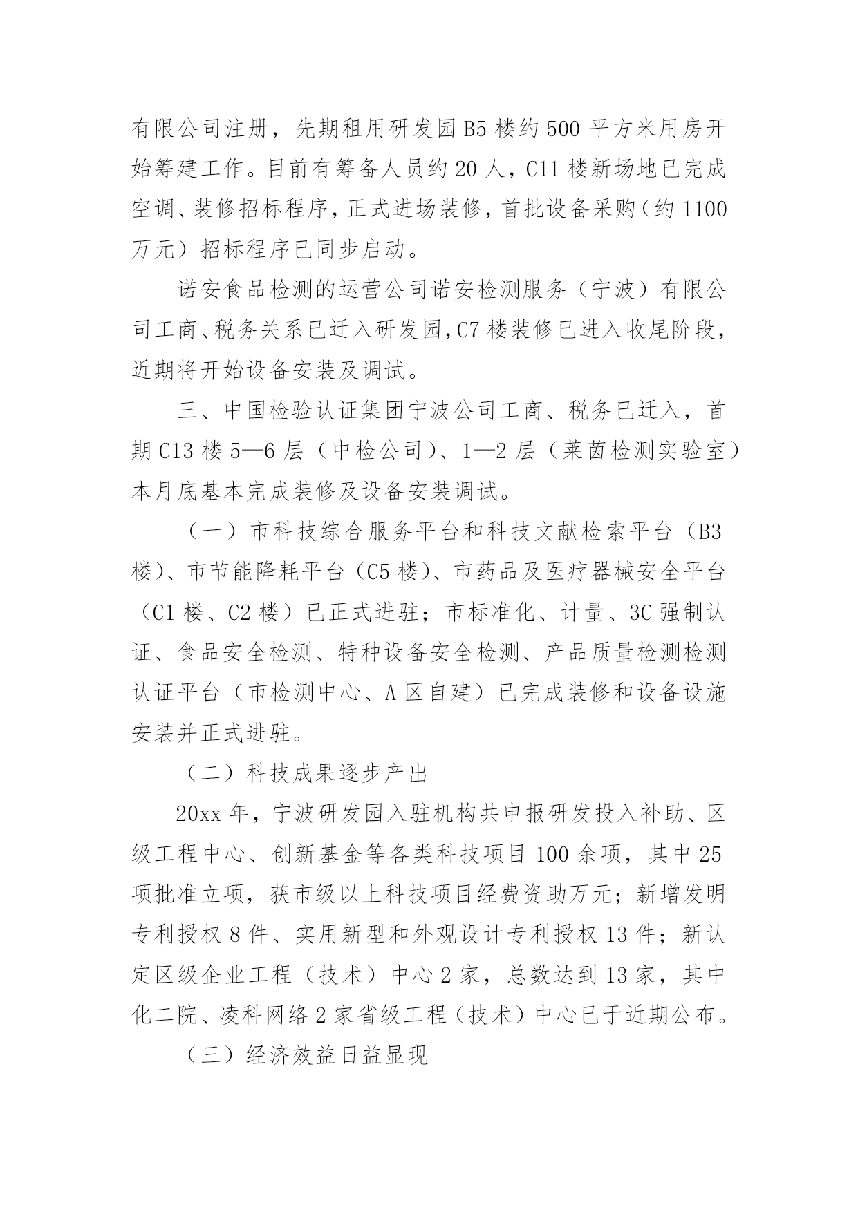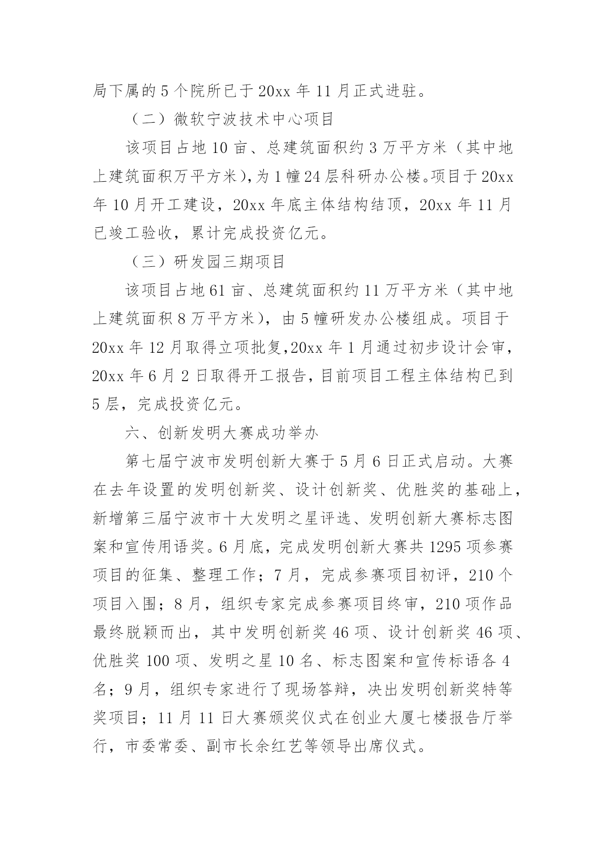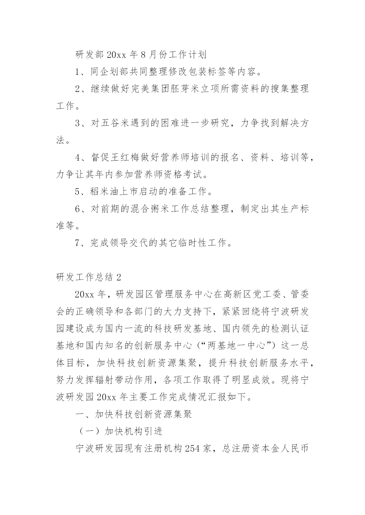研发工作总结总结是对取得的成绩、存在的问题及得到的经验和教训等方面情况进行评价与描述的一种书面材料,它在我们的学习、工作中起到呈上启下的作用,因此我们需要回头归纳,写一份总结了。那么总结要注意有什么内容呢?以下是小编帮大家整理的研发工作总结,仅供参考,希望能够帮助到大家。研发工作总结1工作总结:1、同品控中心和生产部共同完成了胚芽米和混合粥米的企业标准制定、报审和验收工作。2、同采购部和企划部共同整理各种包装的各项指标并进行包装的修改工作。3、对五谷米进行研发工作,遇到的.难题是原料之间的同煮不同熟。目前这一问题没有找到好的解决方法。4、和中国营养协会对接报考营养师培训的工作,目前已派王红梅进行这一工作。5、同完美集团对接胚芽米的立项所需资料,资料已经做完并发给完美集团。有些问题正在电话沟通之中。6、稻米油贴牌委托加工考察工作进行中,目前领导没有做出明确指示。所搜集的部分材料已经通过PPT上报领导。7、完成接待工作内容的PPT制作。研发部20xx年8月份工作计划1、同企划部共同整理修改包装标签等内容。2、继续做好完美集团胚芽米立项所需资料的搜集整理工作。3、对五谷米遇到的困难进一步研究,力争找到解决方法。4、督促王红梅做好营养师培训的报名、资料、培训等,力争让其年内参加营养师资格考试。5、稻米油上市启动的准备工作。6、对前期的混合粥米工作总结整理,制定出其生产标准等。7、完成领导交代的其它临时性工作。研发工作总结220xx年,研发园区管理服务中心在高新区党工委、管委会的正确领导和各部门的大力支持下,紧紧回绕将宁波研发园建设成为国内一流的科技研发基地、国内领先的检测认证基地和国内知名的创新服务中心(“两基地一中心”)这一总体目标,加快科技创新资源集聚,提升科技创新服务水平,努力发挥辐射带动作用,各项工作取得了明显成效。现将宁波研发园20xx年主要工作完成情况汇报如下。一、加快科技创新资源集聚(一)加快机构引进宁波研发园现有注册机构254家,总注册资本金人民币亿元、美元816万元。其中20xx年新引进各类机构50家,总注册资本金亿元。包括IBM宁波研发中心、微软宁波技术中心、诺安食品检测中心等跨国公司区域性研发中心,工信部电子第五研究所宁波分所、电子科技大学宁波研究院等成建制研发创新机构,谭建荣、柴天佑、郭孔辉、李启虎、熊有伦等5家院士工作室,科技综合服务与科技文献检索、特种设备安全、“3C”强制认证、质量检测、标准化、计量、食品安全、药品及医疗器械、节能降耗等十大公共技术服务平台,以及浙江大学、复旦大学、同济大学、上海交通大学、中科院金属所、中科院声学所等12家大院名校技术转移中心和宁波海缆研究院、海天创新研究院、方太创新研究院、天安电气研究院等一大批企业工程(技术)中心和企业技术研究院。宁波研发园正成为我市科技创新资源的集聚区。(二)推动机构进驻目前,宁波研发园B区91家机构中已有84家装修进驻,装修进驻率92%;C区126家购房机构中已有94家装修进驻,装修进驻率74%。同时,为规范流程、加强管理、加快进驻,制定出台了《宁波研发园购房入驻机构装修进驻管理暂行规定》,对所有购房机构装修进驻实行备案审核制度,并与区房管中心、工商分局建立联动机制,将产权证的办理发放与装修进驻挂钩,同时杜绝通过股权转让过户研发园房产。(三)落实重点项目工信部电子第五研究所宁波中小企业质量保证公共服务平台项目已完成运营公司宁波赛宝信息产业技术研究院有限公司注册,先期租用研发园B5楼约500平方米用房开始筹建工作。目前有筹备人员约20人,C11楼新场地已完成空调、装修招标程序,正式进场装修,首批设备采购(约1100万元)招标程序已同步启动。诺安食品检测的运营公司诺安检测服务(宁波)有限公司工商、税务关系已迁入研发园,C7楼装修已进入收尾阶段,近期将开始设备安装及调试。三、中国检验认证集团宁波公司工商、税务已迁入,首期C13楼5—6层(中检公司)、1—2层(莱茵检测实验室)本月底基本完成装修及设备安装调试。(一)市科技综合服务平台和科技文献检索平台(B3楼)、市节能降耗平台(C5楼)、市药品及医疗器械安全平台(C1楼、C2楼)已正式进驻;市标准化、计量、3C强制认证、食品安全检测、特种设备安全检测、产品质量检测检测认证平台(市检测中心、A区自建)已完成装修和设备设施安装并正式进驻。(二)科技成果逐步产出20xx年,宁波研发园入驻机构共申报研发投入补助、区级工程中心、创新基金等各类科技项目100余项,其中25项批准立项,获市级以上科技项目经费资助万元;新增发明专利授权8件、实用新型和外观设计专利授权13件;新认定区级企业工程(技术)中心2家,总数达到13家,其中化二院、凌科网络2家省级工程(技术)中心已于近期公布。(三)经济效益日益显现随着宁波研发园B