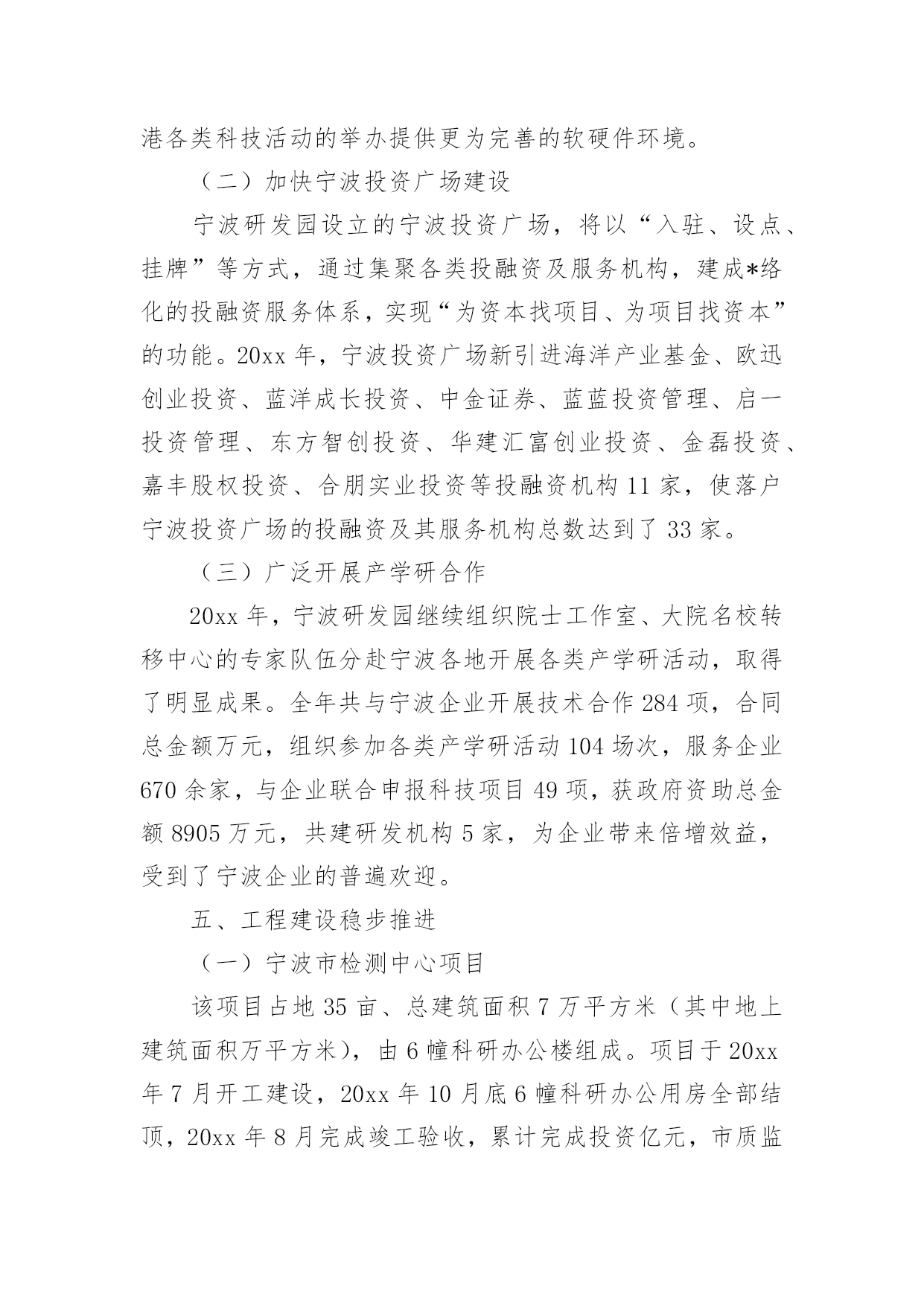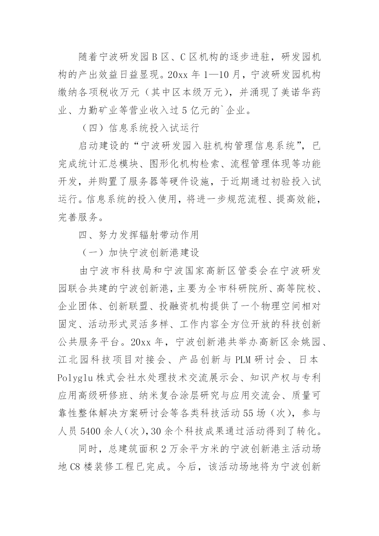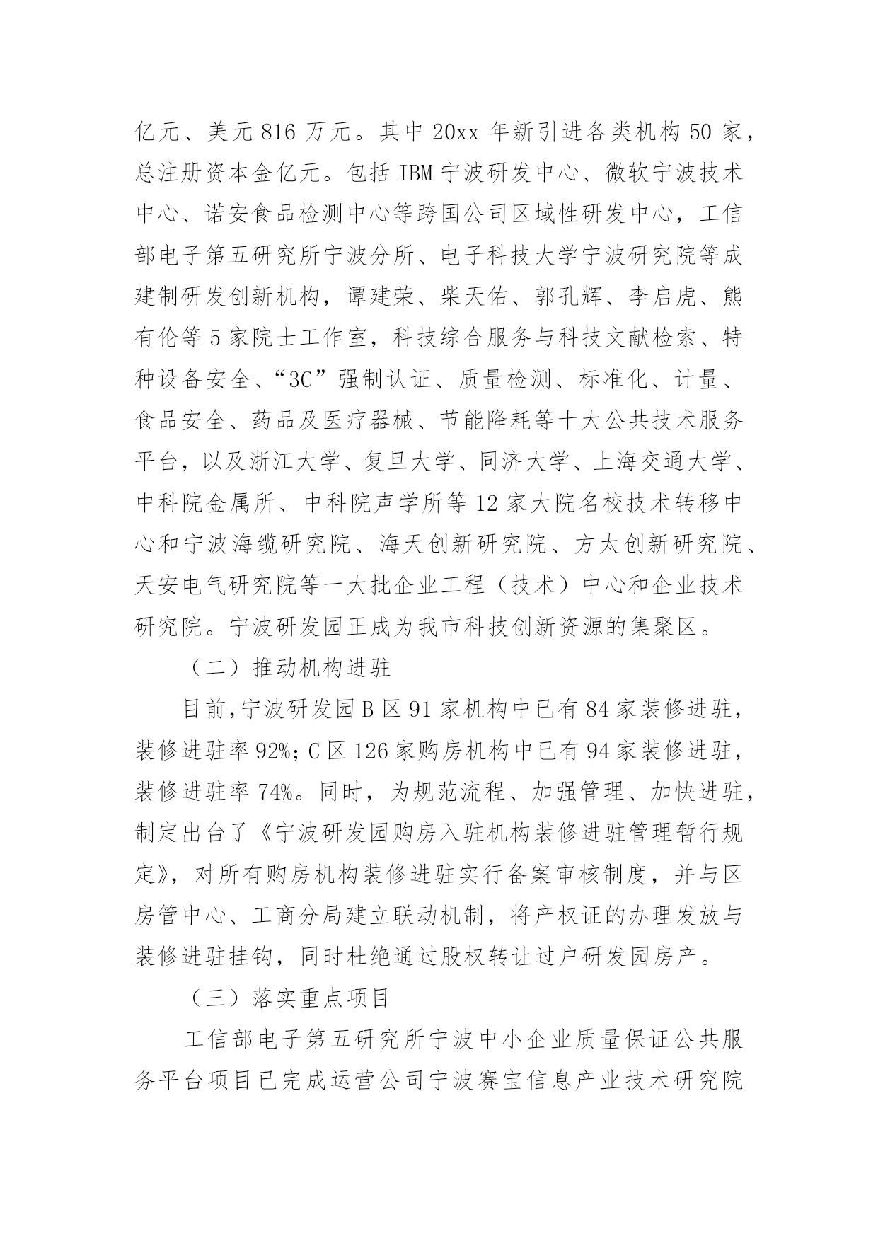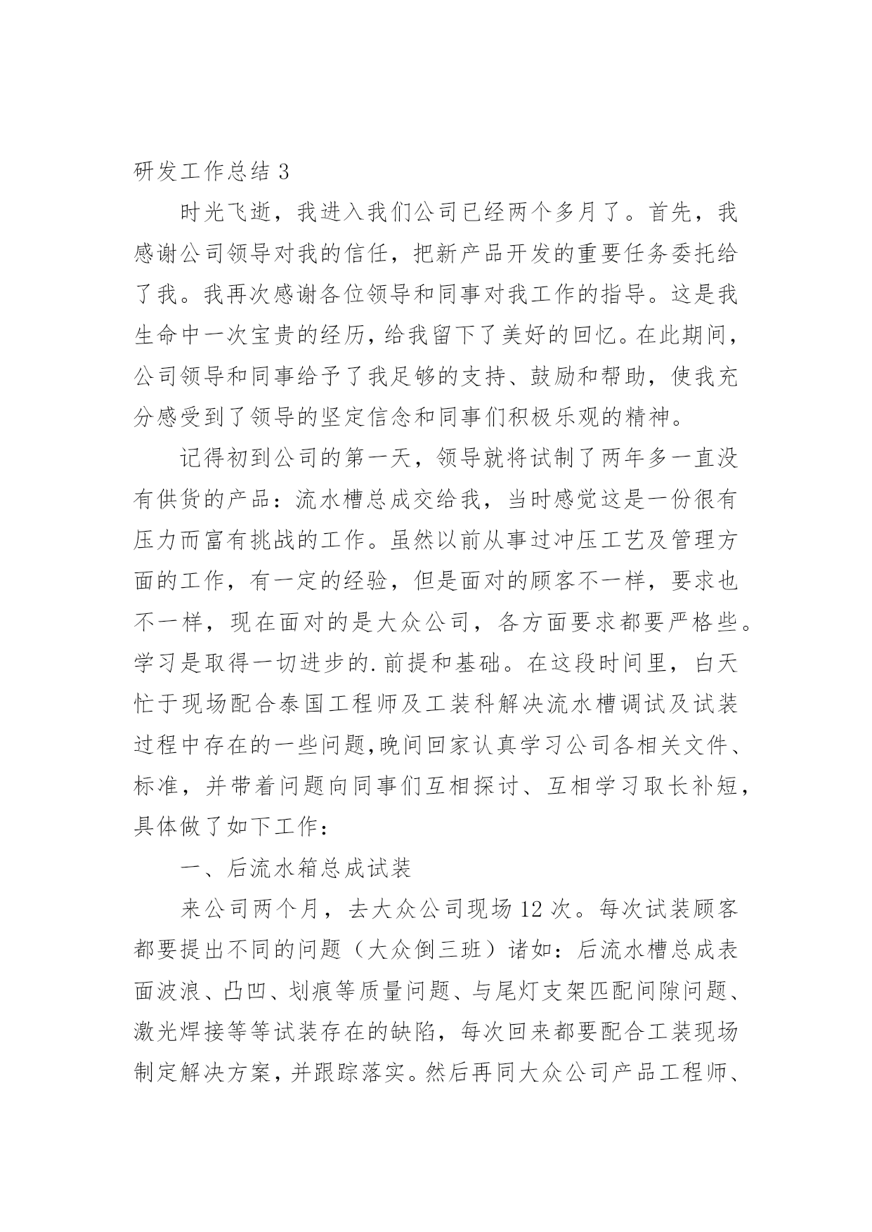 研发工作总结总结是对取得的成绩、存在的问题及得到的经验和教训等方面情况进行评价与描述的一种书面材料,它在我们的学习、工作中起到呈上启下的作用,因此我们需要回头归纳,写一份总结了。那么总结要注意有什么内容呢?以下是小编帮大家整理的研发工作总结,仅供参考,希望能够帮助到大家。研发工作总结1工作总结:1、同品控中心和生产部共同完成了胚芽米和混合粥米的企业标准制定、报审和验收工作。2、同采购部和企划部共同整理各种包装的各项指标并进行包装的修改工作。3、对五谷米进行研发工作,遇到的.难题是原料之间的同煮不同熟。目前这一问题没有找到好的解决方法。4、和中国营养协会对接报考营养师培训的工作,目前已派王红梅进行这一工作。5、同完美集团对接胚芽米的立项所需资料,资料已经做完并发给完美集团。有些问题正在电话沟通之中。6、稻米油贴牌委托加工考察工作进行中,目前领导没有做出明确指示。所搜集的部分材料已经通过PPT上报领导。7、完成接待工作内容的PPT制作。研发部20xx年8月份工作计划1、同企划部共同整理修改包装标签等内容。2、继续做好完美集团胚芽米立项所需资料的搜集整理工作。3、对五谷米遇到的困难进一步研究,力争找到解决方法。4、督促王红梅做好营养师培训的报名、资料、培训等,力争让其年内参加营养师资格考试。5、稻米油上市启动的准备工作。6、对前期的混合粥米工作总结整理,制定出其生产标准等。7、完成领导交代的其它临时性工作。研发工作总结220xx年,研发园区管理服务中心在高新区党工委、管委会的正确领导和各部门的大力支持下,紧紧回绕将宁波研发园建设成为国内一流的科技研发基地、国内领先的检测认证基地和国内知名的创新服务中心(“两基地一中心”)这一总体目标,加快科技创新资源集聚,提升科技创新服务水平,努力发挥辐射带动作用,各项工作取得了明显成效。现将宁波研发园20xx年主要工作完成情况汇报如下。一、加快科技创新资源集聚(一)加快机构引进宁波研发园现有注册机构254家,总注册资本金人民币亿元、美元816万元。其中20xx年新引进各类机构50家,总注册资本金亿元。包括IBM宁波研发中心、微软宁波技术中心、诺安食品检测中心等跨国公司区域性研发中心,工信部电子第五研究所宁波分所、电子科技大学宁波研究院等成建制研发创新机构,谭建荣、柴天佑、郭孔辉、李启虎、熊有伦等5家院士工作室,科技综合服务与科技文献检索、特种设备安全、“3C”强制认证、质量检测、标准化、计量、食品安全、药品及医疗器械、节能降耗等十大公共技术服务平台,以及浙江大学、复旦大学、同济大学、上海交通大学、中科院金属所、中科院声学所等12家大院名校技术转移中心和宁波海缆研究院、海天创新研究院、方太创新研究院、天安电气研究院等一大批企业工程(技术)中心和企业技术研究院。宁波研发园正成为我市科技创新资源的集聚区。(二)推动机构进驻目前,宁波研发园B区91家机构中已有84家装修进驻,装修进驻率92%;C区126家购房机构中已有94家装修进驻,装修进驻率74%。同时,为规范流程、加强管理、加快进驻,制定出台了《宁波研发园购房入驻机构装修进驻管理暂行规定》,对所有购房机构装修进驻实行备案审核制度,并与区房管中心、工商分局建立联动机制,将产权证的办理发放与装修进驻挂钩,同时杜绝通过股权转让过户研发园房产。(三)落实重点项目工信部电子第五研究所宁波中小企业质量保证公共服务平台项目已完成运营公司宁波赛宝信息产业技术研究院有限公司注册,先期租用研发园B5楼约500平方米用房开始筹建工作。目前有筹备人员约20人,C11楼新场地已完成空调、装修招标程序,正式进场装修,首批设备采购(约1100万元)招标程序已同步启动。诺安食品检测的运营公司诺安检测服务(宁波)有限公司工商、税务关系已迁入研发园,C7楼装修已进入收尾阶段,近期将开始设备安装及调试。三、中国检验认证集团宁波公司工商、税务已迁入,首期C13楼5—6层(中检公司)、1—2层(莱茵检测实验室)本月底基本完成装修及设备安装调试。(一)市科技综合服务平台和科技文献检索平台(B3楼)、市节能降耗平台(C5楼)、市药品及医疗器械安全平台(C1楼、C2楼)已正式进驻;市标准化、计量、3C强制认证、食品安全检测、特种设备安全检测、产品质量检测检测认证平台(市检测中心、A区自建)已完成装修和设备设施安装并正式进驻。(二)科技成果逐步产出20xx年,宁波研发园入驻机构共申报研发投入补助、区级工程中心、创新基金等各类科技项目100余项,其中25项批准立项,获市级以上科技项目经费资助万元;新增发明专利授权8件、实用新型和外观设计专利授权13件;新认定区级企业工程(技术)中心2家,总数达到13家,其中化二院、凌科网络2家省级工程(技术)中心已于近期公布。(三)经济效益日益显现随着宁波研发园B