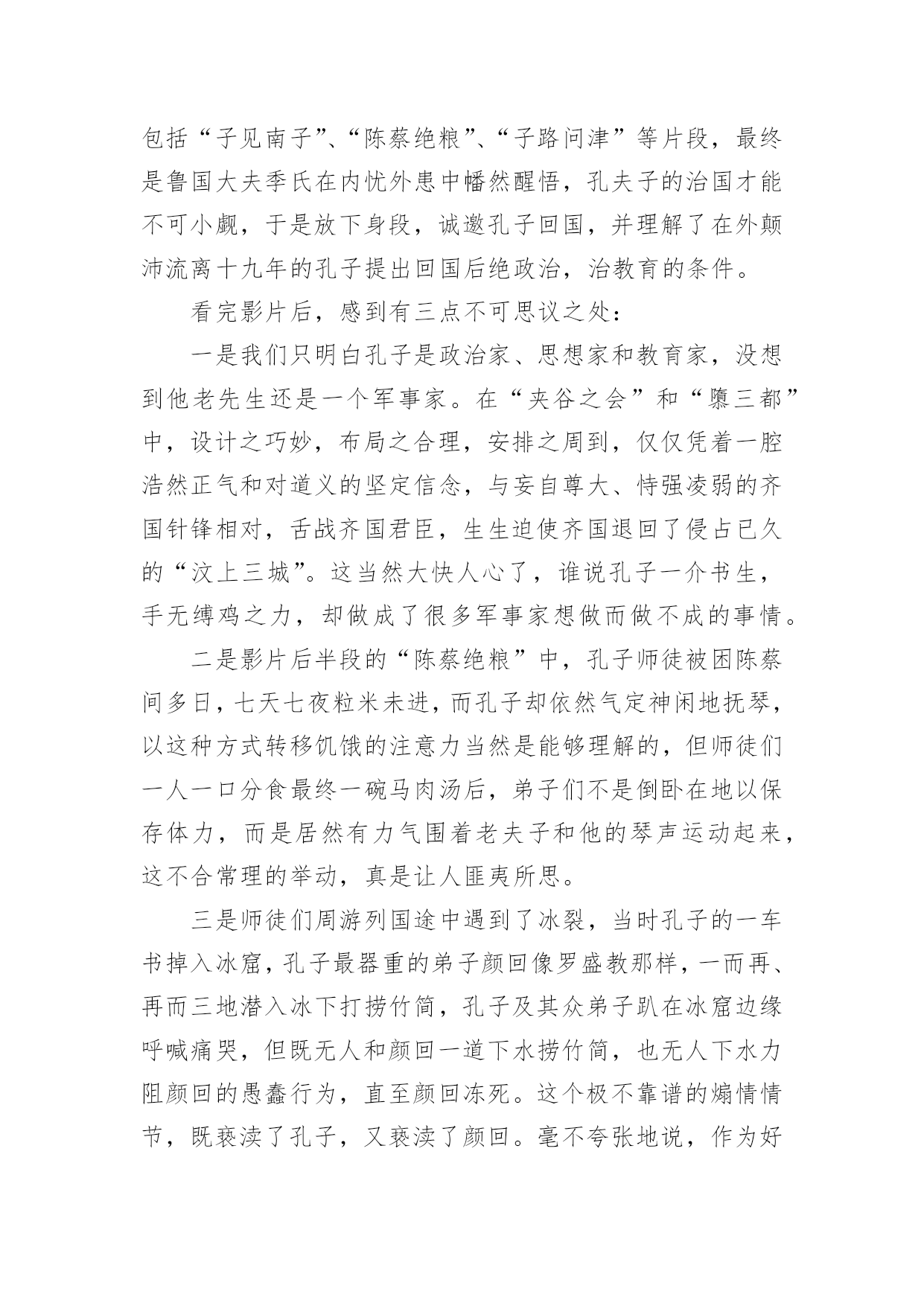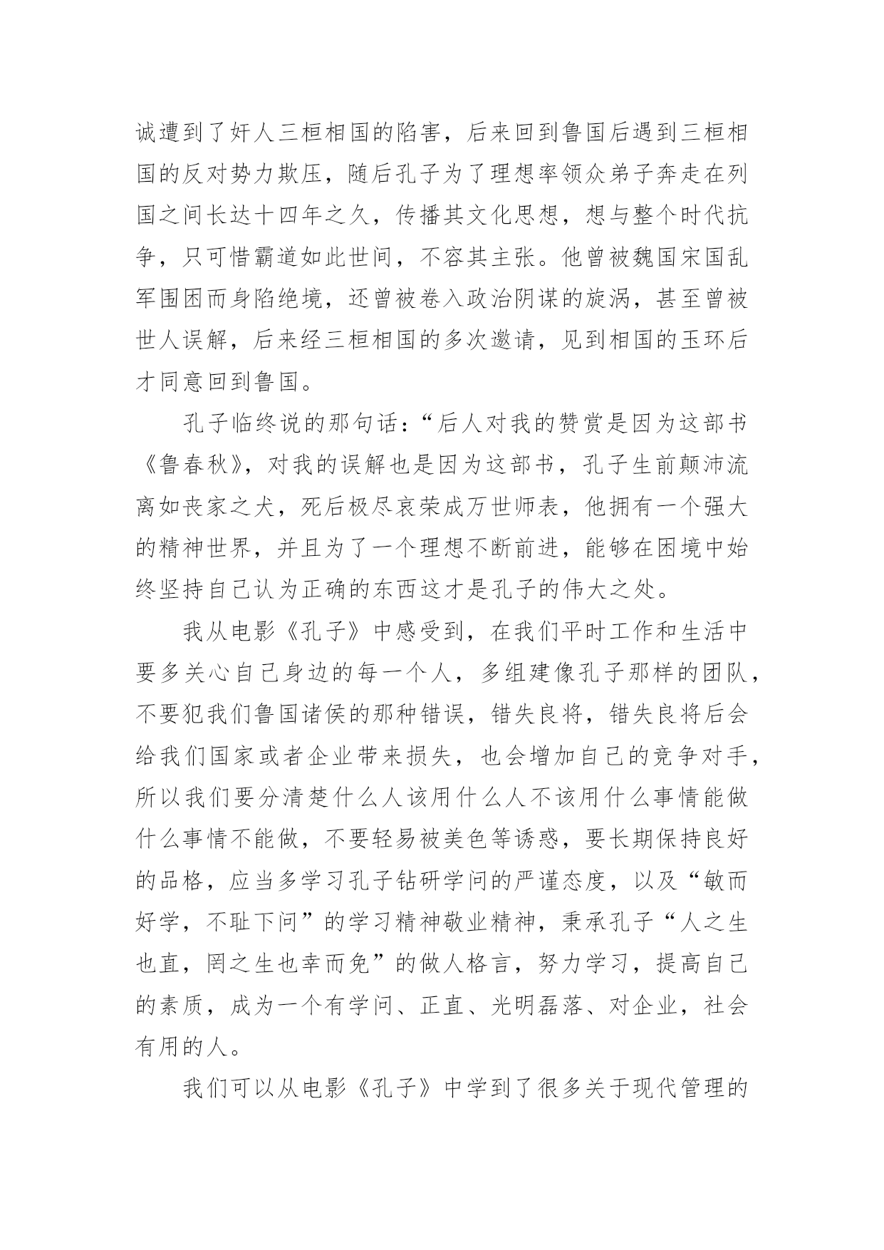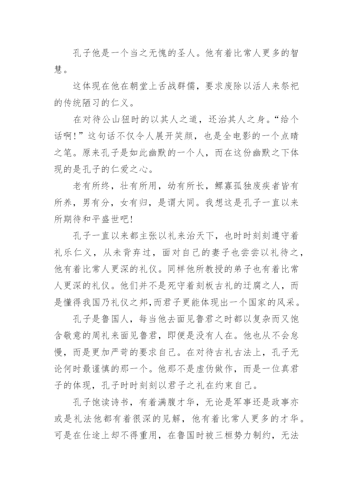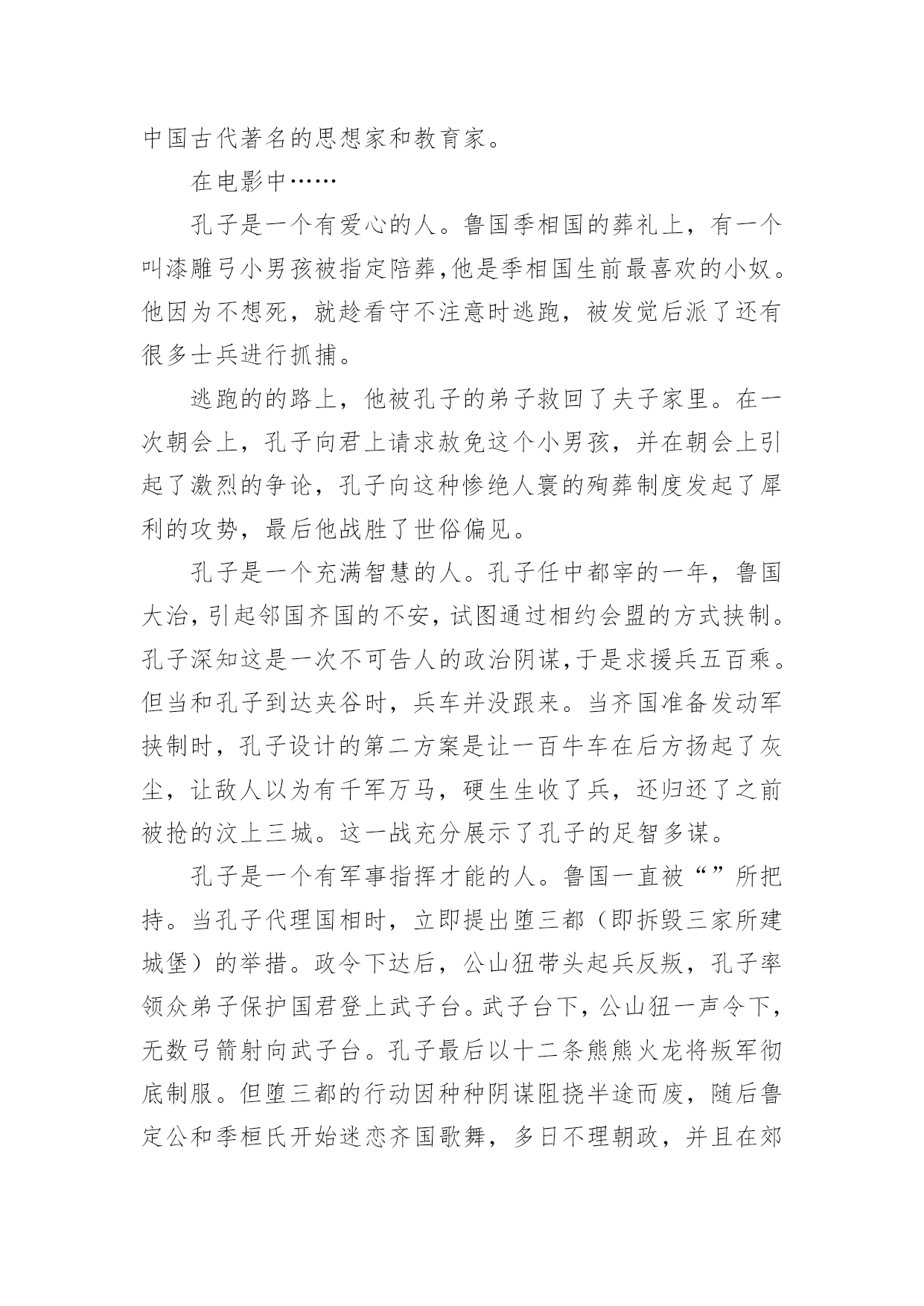《孔子》电影观后感《孔子》电影观后感看完某一作品后,相信大家的视野一定开拓了不少吧,记录下来很重要哦,一起来写一篇观后感吧。那要怎么写好观后感呢?以下是小编为大家整理的《孔子》电影观后感,欢迎大家分享。《孔子》电影观后感1昨晚,去看了这个新年里声势造得很足的电影《孔子》。尽管明白凡动辄投资上千万的大片都是要研究票房的,既要票房就得研究观众的欣赏口味,不可能完全按照或者接近历史的真实去拍,那么编剧和导演究竟会把经过人们千百年的认识并且已经基本定型的孔夫子拍成什么样呢,的确很想明白,却又担心期望越大,失望越大。但听电影《孔子》的某主创人员说,观众看电影《孔子》,如果不哭,就不是人。如此信心满满,言之凿凿,更让人充满期待。影片从51岁的孔子作为政坛新星在鲁国崛起讲起,前半部分一开始便是残忍的活人陪葬,表现了当时周天子已无力掌控天下,而鲁国国君衰微,国家政权实际上由当时掌握军权的三桓掌控,他们嚣张跋扈,为所欲为的时代背景,之后叙述了孔子一生中最值得一提的两大政绩——夹谷之会和隳三都。后半部分则主要讲述孔子如何带领弟子周游列国,包括“子见南子”、“陈蔡绝粮”、“子路问津”等片段,最终是鲁国大夫季氏在内忧外患中幡然醒悟,孔夫子的治国才能不可小觑,于是放下身段,诚邀孔子回国,并理解了在外颠沛流离十九年的孔子提出回国后绝政治,治教育的条件。看完影片后,感到有三点不可思议之处:一是我们只明白孔子是政治家、思想家和教育家,没想到他老先生还是一个军事家。在“夹谷之会”和“隳三都”中,设计之巧妙,布局之合理,安排之周到,仅仅凭着一腔浩然正气和对道义的坚定信念,与妄自尊大、恃强凌弱的齐国针锋相对,舌战齐国君臣,生生迫使齐国退回了侵占已久的“汶上三城”。这当然大快人心了,谁说孔子一介书生,手无缚鸡之力,却做成了很多军事家想做而做不成的事情。二是影片后半段的“陈蔡绝粮”中,孔子师徒被困陈蔡间多日,七天七夜粒米未进,而孔子却依然气定神闲地抚琴,以这种方式转移饥饿的注意力当然是能够理解的,但师徒们一人一口分食最终一碗马肉汤后,弟子们不是倒卧在地以保存体力,而是居然有力气围着老夫子和他的琴声运动起来,这不合常理的举动,真是让人匪夷所思。三是师徒们周游列国途中遇到了冰裂,当时孔子的一车书掉入冰窟,孔子最器重的弟子颜回像罗盛教那样,一而再、再而三地潜入冰下打捞竹简,孔子及其众弟子趴在冰窟边缘呼喊痛哭,但既无人和颜回一道下水捞竹简,也无人下水力阻颜回的愚蠢行为,直至颜回冻死。这个极不靠谱的煽情情节,既亵渎了孔子,又亵渎了颜回。毫不夸张地说,作为好学生,颜回肯定把这些竹简的资料深深刻在脑海里了,难道为了教师的心血,就有必要牺牲性命吗?莫非正如旁边的观众调侃道是为了抢救文化遗产?而孔子坚持万物之灵的人始终是第一位的观点在《论语·乡党十》中就十分清楚。“厩焚。子退朝,曰:‘伤人乎?’不问马。”颜回和竹简,孰轻孰重,这不是明摆着的嘛?!所以,看完电影《孔子》后,我没有哭。环顾四周,在这场满座的电影院中,也没有看到任何一个人哭。《孔子》电影观后感2今天我们上完白天的课,晚上7点在魏老师陪同下我们观看了一部具有强大的教育性质的电影《孔子》说到孔子我想人人都知道这位历史文人名人,在春秋割据,各国战乱时期,孔子的历史就穿插在这样的乱世中。他和他的弟子们颠沛流离,周游列国十多年。一直未曾放弃的是礼义礼节仁和,能让我记住很多故事精彩情节,但他带给我的,不仅是故事和情节那么简单。他留下的,是一个形象,一种非常好团队文法、团队精神,他带着他心爱的弟子和一些文弱的书生一起漂荡。但给我感觉到好像他带领的是我们中国的革命前辈,因为他们改变了一个世界,统领着一个朝代。在影片中孔子出身于当时一个小诸侯国鲁国,当时因为是国难时期鲁国的诸侯非常欣赏他智慧和才华,鲁国的诸侯希望以他超越时代的思想和智慧来改变春秋诸国的历史,然而就在鲁国与齐国会盟之时他利用自己的聪明才智不仅震慑了齐军,还为鲁国夺回了三个城市,正因为他的正义和忠诚遭到了奸人三桓相国的陷害,后来回到鲁国后遇到三桓相国的反对势力欺压,随后孔子为了理想率领众弟子奔走在列国之间长达十四年之久,传播其文化思想,想与整个时代抗争,只可惜霸道如此世间,不容其主张。他曾被魏国宋国乱军围困而身陷绝境,还曾被卷入政治阴谋的旋涡,甚至曾被世人误解,后来经三桓相国的多次邀请,见到相国的玉环后才同意回到鲁国。孔子临终说的那句话:“后人对我的赞赏是因为这部书《鲁春秋》,对我的误解也是因为这部书,孔子生前颠沛流离如丧家之犬,死后极尽哀荣成万世师表,他拥有一个强大的精神世界,并且为了一个理想不断前进,能够在困境中始终坚持自己认为正确的东西这才是孔子的伟大之处。我从电影《孔子》中感受到,在我们平时工作和生活中要多关心自己身边的每一个人,多组建像孔子那样的团队,不要犯我们鲁国
