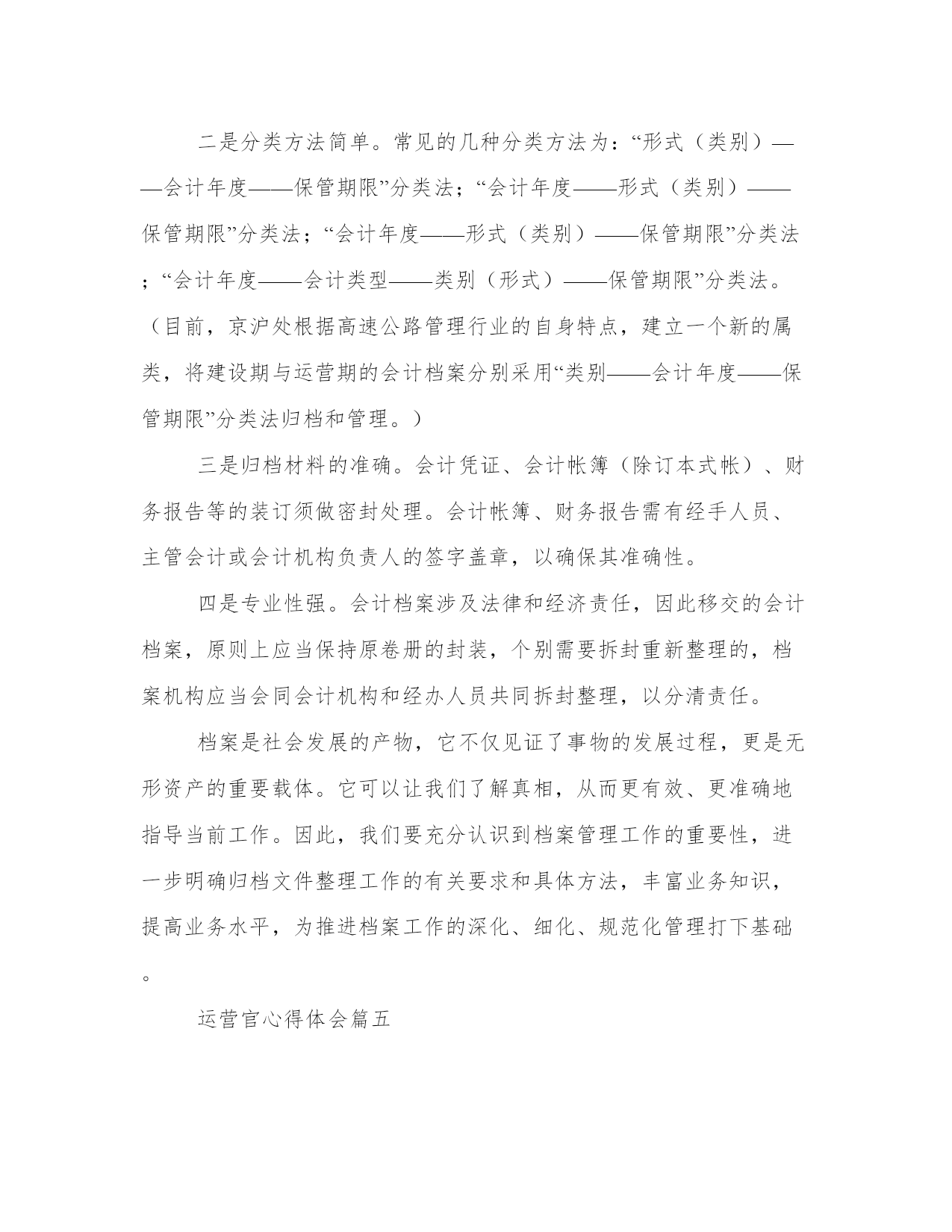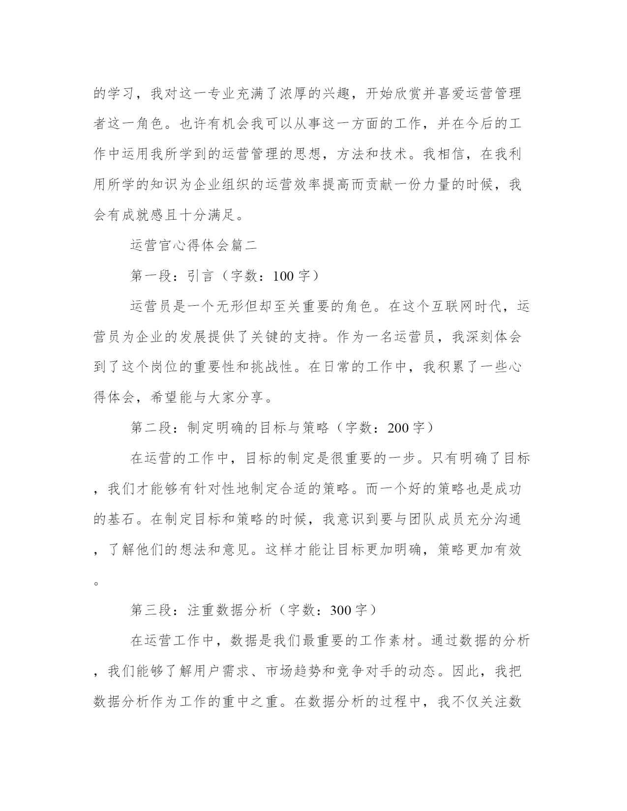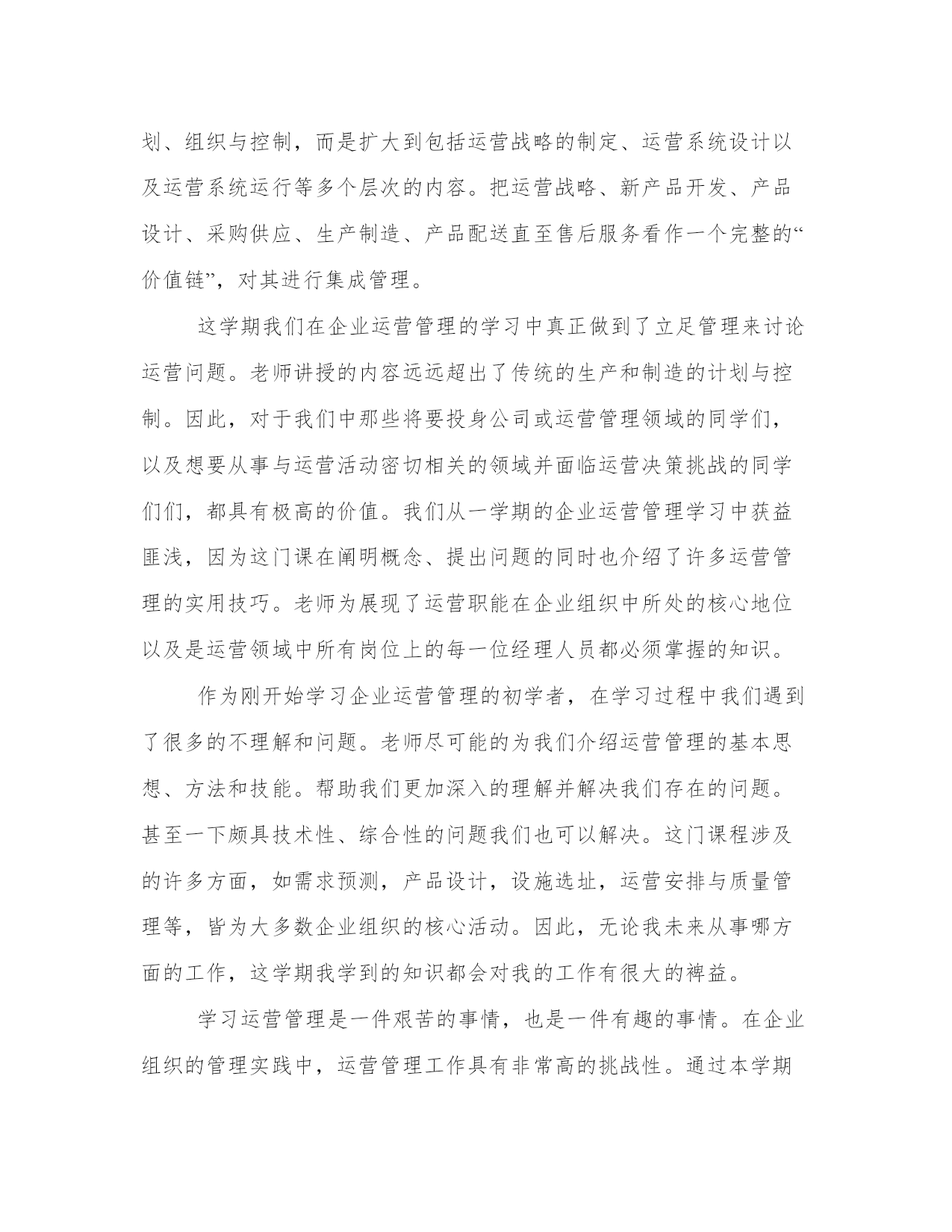 2023年运营官心得体会(汇总9篇)当我们经历一段特殊的时刻,或者完成一项重要的任务时,我们会通过反思和总结来获取心得体会。心得体会对于我们是非常有帮助的,可是应该怎么写心得体会呢?下面我给大家整理了一些心得体会范文,希望能够帮助到大家。运营官心得体会篇一运营管理,顾名思义,即是对组织向社会提供产品或服务整个流程的计划、设计、组织和控制。本学期我们从企业运营管理的基本概念、发展历史和现状,运营管理的作用以及运营管理的绩效评估,如何运用excel求解运营管理问题的基本方法,运营管理的基本流程,和运营管理的计划部分等方面系统的学习了企业运营管理这一门课程。企业运营管理,作为企业生存赢利的关键要素和要素之间的逻辑关系,它决定着一个企业的市场经营成果。从长远来看,能否找到适合企业经营需要的企业运作模式并不断完善决定着一个企业能否有未来。十几年来,随着信息技术突飞猛进的发展,为运营增添了新的有力手段,也使运营学的分析进入了一个新阶段,使其内容更加丰富,范围更加扩大,体系更加完整。现代运营管理涵盖的范围越来越大。现代运营的范围已从传统的制造业企业扩大到非制造业。其分析内容也已不局限于生产过程的计划、组织与控制,而是扩大到包括运营战略的制定、运营系统设计以及运营系统运行等多个层次的内容。把运营战略、新产品开发、产品设计、采购供应、生产制造、产品配送直至售后服务看作一个完整的“价值链”,对其进行集成管理。这学期我们在企业运营管理的学习中真正做到了立足管理来讨论运营问题。老师讲授的内容远远超出了传统的生产和制造的计划与控制。因此,对于我们中那些将要投身公司或运营管理领域的同学们,以及想要从事与运营活动密切相关的领域并面临运营决策挑战的同学们们,都具有极高的价值。我们从一学期的企业运营管理学习中获益匪浅,因为这门课在阐明概念、提出问题的同时也介绍了许多运营管理的实用技巧。老师为展现了运营职能在企业组织中所处的核心地位以及是运营领域中所有岗位上的每一位经理人员都必须掌握的知识。作为刚开始学习企业运营管理的初学者,在学习过程中我们遇到了很多的不理解和问题。老师尽可能的为我们介绍运营管理的基本思想、方法和技能。帮助我们更加深入的理解并解决我们存在的问题。甚至一下颇具技术性、综合性的问题我们也可以解决。这门课程涉及的许多方面,如需求预测,产品设计,设施选址,运营安排与质量管理等,皆为大多数企业组织的核心活动。因此,无论我未来从事哪方面的工作,这学期我学到的知识都会对我的工作有很大的裨益。学习运营管理是一件艰苦的事情,也是一件有趣的事情。在企业组织的管理实践中,运营管理工作具有非常高的挑战性。通过本学期的学习,我对这一专业充满了浓厚的兴趣,开始欣赏并喜爱运营管理者这一角色。也许有机会我可以从事这一方面的工作,并在今后的工作中运用我所学到的运营管理的思想,方法和技术。我相信,在我利用所学的知识为企业组织的运营效率提高而贡献一份力量的时候,我会有成就感且十分满足。运营官心得体会篇二第一段:引言(字数:100字)运营员是一个无形但却至关重要的角色。在这个互联网时代,运营员为企业的发展提供了关键的支持。作为一名运营员,我深刻体会到了这个岗位的重要性和挑战性。在日常的工作中,我积累了一些心得体会,希望能与大家分享。第二段:制定明确的目标与策略(字数:200字)在运营的工作中,目标的制定是很重要的一步。只有明确了目标,我们才能够有针对性地制定合适的策略。而一个好的策略也是成功的基石。在制定目标和策略的时候,我意识到要与团队成员充分沟通,了解他们的想法和意见。这样才能让目标更加明确,策略更加有效。第三段:注重数据分析(字数:300字)在运营工作中,数据是我们最重要的工作素材。通过数据的分析,我们能够了解用户需求、市场趋势和竞争对手的动态。因此,我把数据分析作为工作的重中之重。在数据分析的过程中,我不仅关注数据的表面意义,更注重对数据背后的原因进行深入思考。通过深入分析,我能够更好地把握用户的心理需求,从而制定更切合实际的运营策略。第四段:注重团队合作(字数:300字)作为一名运营员,与团队成员的合作至关重要。只有团队协作,才能够更好地实现目标。在与团队成员合作的过程中,我意识到要积极主动地沟通,了解其他成员的工作进展和需求。此外,我也尝试通过分享自己的经验和知识来提升整个团队的水平。通过团队合作,我们一起攻克了许多困难,取得了令人瞩目的业绩。第五段:追求创新与学习(字数:200字)在这个快速变化的时代,运营员需要不断学习和创新。在我工作的过程中,我时刻保持着学习的心态,不断探索新的运营方式和策略。我还主动参加各种培训和学习课程,不断提升自己的职业技能和知识储备。通过不断学习和创新,我能够应对市场的变化,为企业带来更多的机遇和挑战