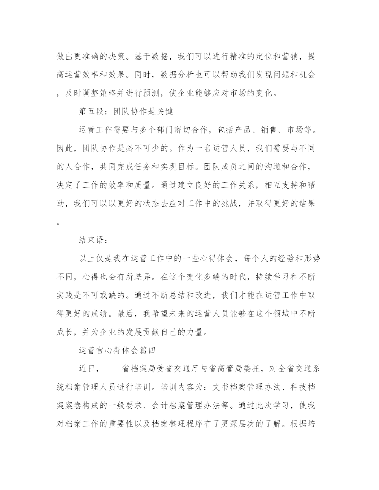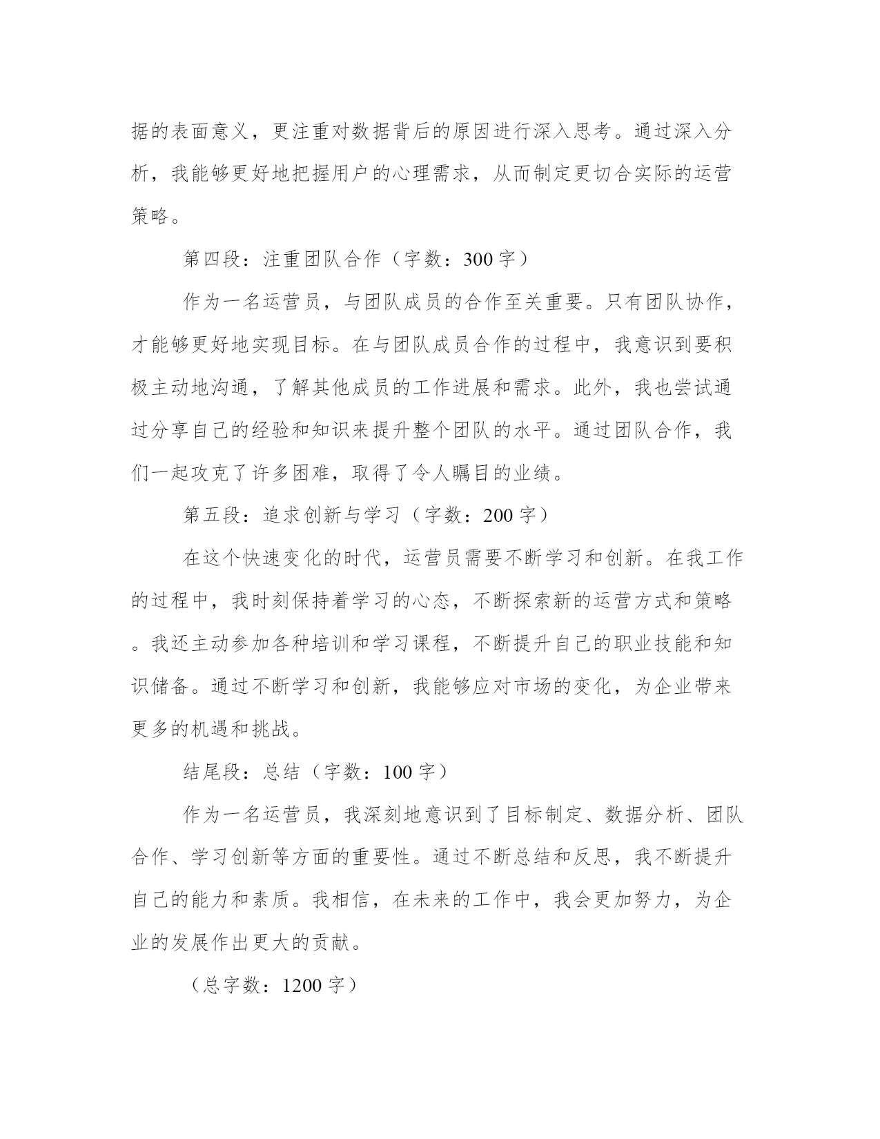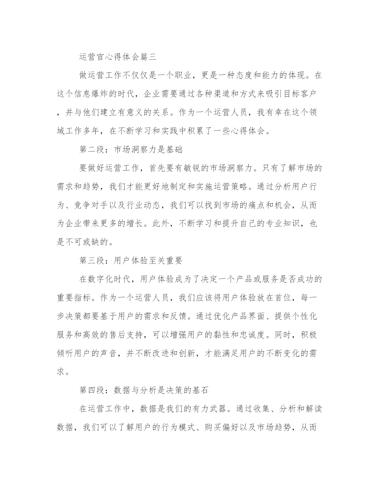 2023年运营官心得体会(汇总9篇)当我们经历一段特殊的时刻,或者完成一项重要的任务时,我们会通过反思和总结来获取心得体会。心得体会对于我们是非常有帮助的,可是应该怎么写心得体会呢?下面我给大家整理了一些心得体会范文,希望能够帮助到大家。运营官心得体会篇一运营管理,顾名思义,即是对组织向社会提供产品或服务整个流程的计划、设计、组织和控制。本学期我们从企业运营管理的基本概念、发展历史和现状,运营管理的作用以及运营管理的绩效评估,如何运用excel求解运营管理问题的基本方法,运营管理的基本流程,和运营管理的计划部分等方面系统的学习了企业运营管理这一门课程。企业运营管理,作为企业生存赢利的关键要素和要素之间的逻辑关系,它决定着一个企业的市场经营成果。从长远来看,能否找到适合企业经营需要的企业运作模式并不断完善决定着一个企业能否有未来。十几年来,随着信息技术突飞猛进的发展,为运营增添了新的有力手段,也使运营学的分析进入了一个新阶段,使其内容更加丰富,范围更加扩大,体系更加完整。现代运营管理涵盖的范围越来越大。现代运营的范围已从传统的制造业企业扩大到非制造业。其分析内容也已不局限于生产过程的计划、组织与控制,而是扩大到包括运营战略的制定、运营系统设计以及运营系统运行等多个层次的内容。把运营战略、新产品开发、产品设计、采购供应、生产制造、产品配送直至售后服务看作一个完整的“价值链”,对其进行集成管理。这学期我们在企业运营管理的学习中真正做到了立足管理来讨论运营问题。老师讲授的内容远远超出了传统的生产和制造的计划与控制。因此,对于我们中那些将要投身公司或运营管理领域的同学们,以及想要从事与运营活动密切相关的领域并面临运营决策挑战的同学们们,都具有极高的价值。我们从一学期的企业运营管理学习中获益匪浅,因为这门课在阐明概念、提出问题的同时也介绍了许多运营管理的实用技巧。老师为展现了运营职能在企业组织中所处的核心地位以及是运营领域中所有岗位上的每一位经理人员都必须掌握的知识。作为刚开始学习企业运营管理的初学者,在学习过程中我们遇到了很多的不理解和问题。老师尽可能的为我们介绍运营管理的基本思想、方法和技能。帮助我们更加深入的理解并解决我们存在的问题。甚至一下颇具技术性、综合性的问题我们也可以解决。这门课程涉及的许多方面,如需求预测,产品设计,设施选址,运营安排与质量管理等,皆为大多数企业组织的核心活动。因此,无论我未来从事哪方面的工作,这学期我学到的知识都会对我的工作有很大的裨益。学习运营管理是一件艰苦的事情,也是一件有趣的事情。在企业组织的管理实践中,运营管理工作具有非常高的挑战性。通过本学期的学习,我对这一专业充满了浓厚的兴趣,开始欣赏并喜爱运营管理者这一角色。也许有机会我可以从事这一方面的工作,并在今后的工作中运用我所学到的运营管理的思想,方法和技术。我相信,在我利用所学的知识为企业组织的运营效率提高而贡献一份力量的时候,我会有成就感且十分满足。运营官心得体会篇二第一段:引言(字数:100字)运营员是一个无形但却至关重要的角色。在这个互联网时代,运营员为企业的发展提供了关键的支持。作为一名运营员,我深刻体会到了这个岗位的重要性和挑战性。在日常的工作中,我积累了一些心得体会,希望能与大家分享。第二段:制定明确的目标与策略(字数:200字)在运营的工作中,目标的制定是很重要的一步。只有明确了目标,我们才能够有针对性地制定合适的策略。而一个好的策略也是成功的基石。在制定目标和策略的时候,我意识到要与团队成员充分沟通,了解他们的想法和意见。这样才能让目标更加明确,策略更加有效。第三段:注重数据分析(字数:300字)在运营工作中,数据是我们最重要的工作素材。通过数据的分析,我们能够了解用户需求、市场趋势和竞争对手的动态。因此,我把数据分析作为工作的重中之重。在数据分析的过程中,我不仅关注数据的表面意义,更注重对数据背后的原因进行深入思考。通过深入分析,我能够更好地把握用户的心理需求,从而制定更切合实际的运营策略。第四段:注重团队合作(字数:300字)作为一名运营员,与团队成员的合作至关重要。只有团队协作,才能够更好地实现目标。在与团队成员合作的过程中,我意识到要积极主动地沟通,了解其他成员的工作进展和需求。此外,我也尝试通过分享自己的经验和知识来提升整个团队的水平。通过团队合作,我们一起攻克了许多困难,取得了令人瞩目的业绩。第五段:追求创新与学习(字数:200字)在这个快速变化的时代,运营员需要不断学习和创新。在我工作的过程中,我时刻保持着学习的心态,不断探索新的运营方式和策略。我还主动参加各种培训和学习课程,不断提升自己的职业技能和知识储备。通过不断学习和创新,我能够应对市场的变化,为企业带来更多的机遇和挑战