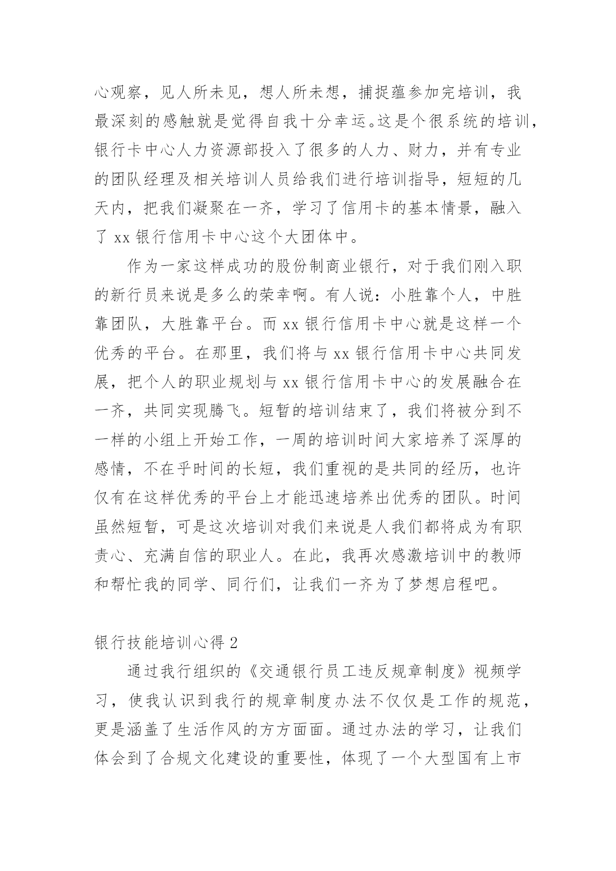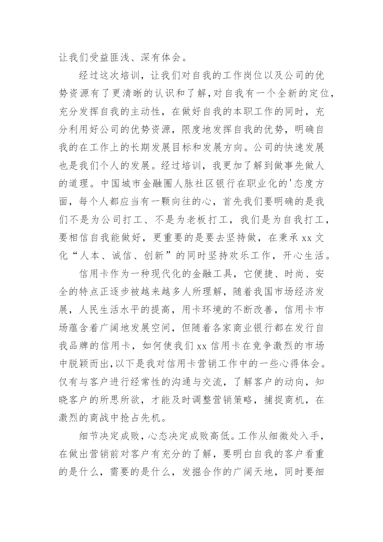银行技能培训心得当我们受到启发,对学习和工作生活有了新的看法时,往往会写一篇心得体会,它可以帮助我们了解自己的这段时间的学习、工作生活状态。一起来学习心得体会是如何写的吧,以下是小编帮大家整理的银行技能培训心得,欢迎大家分享。银行技能培训心得1大学毕业后,开始参加工作,我应聘到一家银行工作,随后参加了xx信用卡中心20xx年新员工培训。从小到大,我们学习了无数课程,历经十年寒窗,不明白参加了多少培训多少考试,但这次的岗前培训对我们的意义是空前的,意义非凡的,它作为一个过渡,一个桥梁,让我们从学习走向实践。对员工培训的重视,反映了公司“重视人才、培养人才”的战略方针。参加这次培训的有以前在别家银行做过信用卡业务的也有没接触过信用卡的,大家都很珍惜这次机会,早早地就来到公司,为培训做准备我们收获的远比想象中的丰富。这一次培训的主要资料主要是公司的基本情景介绍和xx银行信用卡系列产品的介绍,xx银行信用卡中心主任还特地讲了企业文化与发源,使我们在最短的时间里了解到公司的基本运作流程,以及公司的企业文化、企业现状、战略规划和系统的公司营销理念方面的专业知识,经过这次培训,让我们受益匪浅、深有体会。经过这次培训,让我们对自我的工作岗位以及公司的优势资源有了更清晰的认识和了解,对自我有一个全新的定位,充分发挥自我的主动性,在做好自我的本职工作的同时,充分利用好公司的优势资源,限度地发挥自我的优势,明确自我的在工作上的长期发展目标和发展方向。公司的快速发展也是我们个人的发展。经过培训,我更加了解到做事先做人的道理。中国城市金融圈人脉社区银行在职业化的'态度方面,每个人都应当有一颗向往的心,首先我们要明确的是我们不是为公司打工、不是为老板打工,我们是为自我打工,要相信自我能做好,更重要的是要去坚持做,在秉承xx文化“人本、诚信、创新”的同时坚持欢乐工作,开心生活。信用卡作为一种现代化的金融工具,它便捷、时尚、安全的特点正逐步被越来越多人所理解,随着我国市场经济发展,人民生活水平的提高,用卡环境的不断改善,信用卡市场蕴含着广阔地发展空间,但随着各家商业银行都在发行自我品牌的信用卡,如何使我们xx信用卡在竞争激烈的市场中脱颖而出,以下是我对信用卡营销工作中的一些心得体会。仅有与客户进行经常性的沟通与交流,了解客户的动向,知晓客户的所思所欲,才能及时调整营销策略,捕捉商机,在激烈的商战中抢占先机。细节决定成败,心态决定成败高低。工作从细微处入手,在做出营销前对客户有充分的了解,要明白自我的客户看重的是什么,需要的是什么,发掘合作的广阔天地,同时要细心观察,见人所未见,想人所未想,捕捉蕴参加完培训,我最深刻的感触就是觉得自我十分幸运。这是个很系统的培训,银行卡中心人力资源部投入了很多的人力、财力,并有专业的团队经理及相关培训人员给我们进行培训指导,短短的几天内,把我们凝聚在一齐,学习了信用卡的基本情景,融入了xx银行信用卡中心这个大团体中。作为一家这样成功的股份制商业银行,对于我们刚入职的新行员来说是多么的荣幸啊。有人说:小胜靠个人,中胜靠团队,大胜靠平台。而xx银行信用卡中心就是这样一个优秀的平台。在那里,我们将与xx银行信用卡中心共同发展,把个人的职业规划与xx银行信用卡中心的发展融合在一齐,共同实现腾飞。短暂的培训结束了,我们将被分到不一样的小组上开始工作,一周的培训时间大家培养了深厚的感情,不在乎时间的长短,我们重视的是共同的经历,也许仅有在这样优秀的平台上才能迅速培养出优秀的团队。时间虽然短暂,可是这次培训对我们来说是人我们都将成为有职责心、充满自信的职业人。在此,我再次感激培训中的教师和帮忙我的同学、同行们,让我们一齐为了梦想启程吧。银行技能培训心得2通过我行组织的《交通银行员工违反规章制度》视频学习,使我认识到我行的规章制度办法不仅仅是工作的规范,更是涵盖了生活作风的方方面面。通过办法的学习,让我们体会到了合规文化建设的重要性,体现了一个大型国有上市银行在内控和风险防范上面所注重的程度与防范能力。一、加强自身修养,提高合规意识作为交行的一员,点滴小事往往是最能够反映对相关制度办法的理解程度。在思想上要高度重视本次学习的.内容,坚持集中学习与自学相结合,积极参加上级行组织的各类集中培训;在工作上要对所分管的工作,尽力做到让同事与领导满意,以合规、合法为基础;生活上坚持做到廉洁自律,以身作则。二、结合工作实际,领会学习内容我行把提高资产质量和防范案件作均为重要工作之一,这也是规范办法中对业务上所要求的,进一步加大力度,加快步伐,采取有效措施,建立长效机制,将降低不良资产和防范案件“攻坚战”向纵深推进。在对存量不良贷款全力压缩的同时,加强对存量正常贷款和增量贷款的预警和基础管理工作,从贷前、贷中、贷后三个环节严格履行信贷监管的职责,保证信