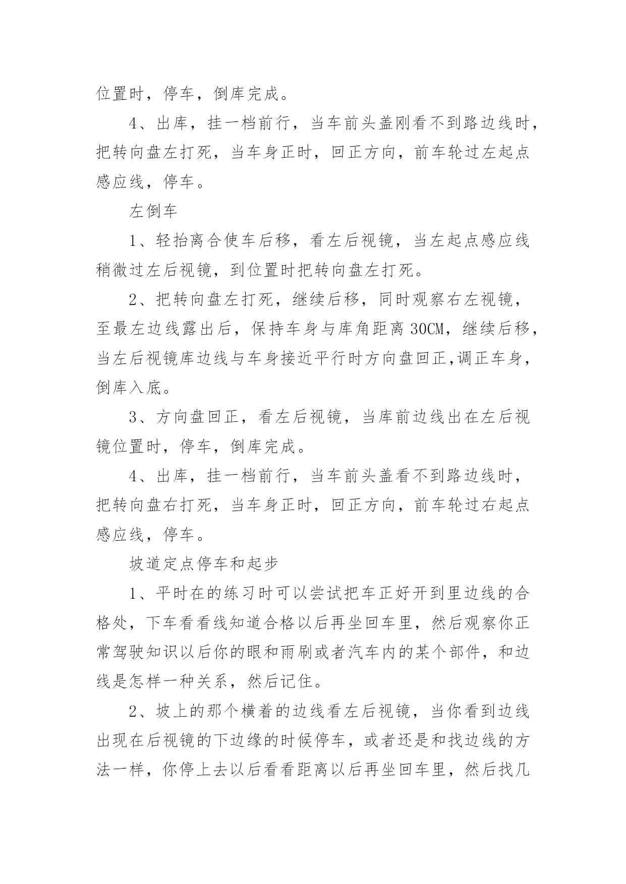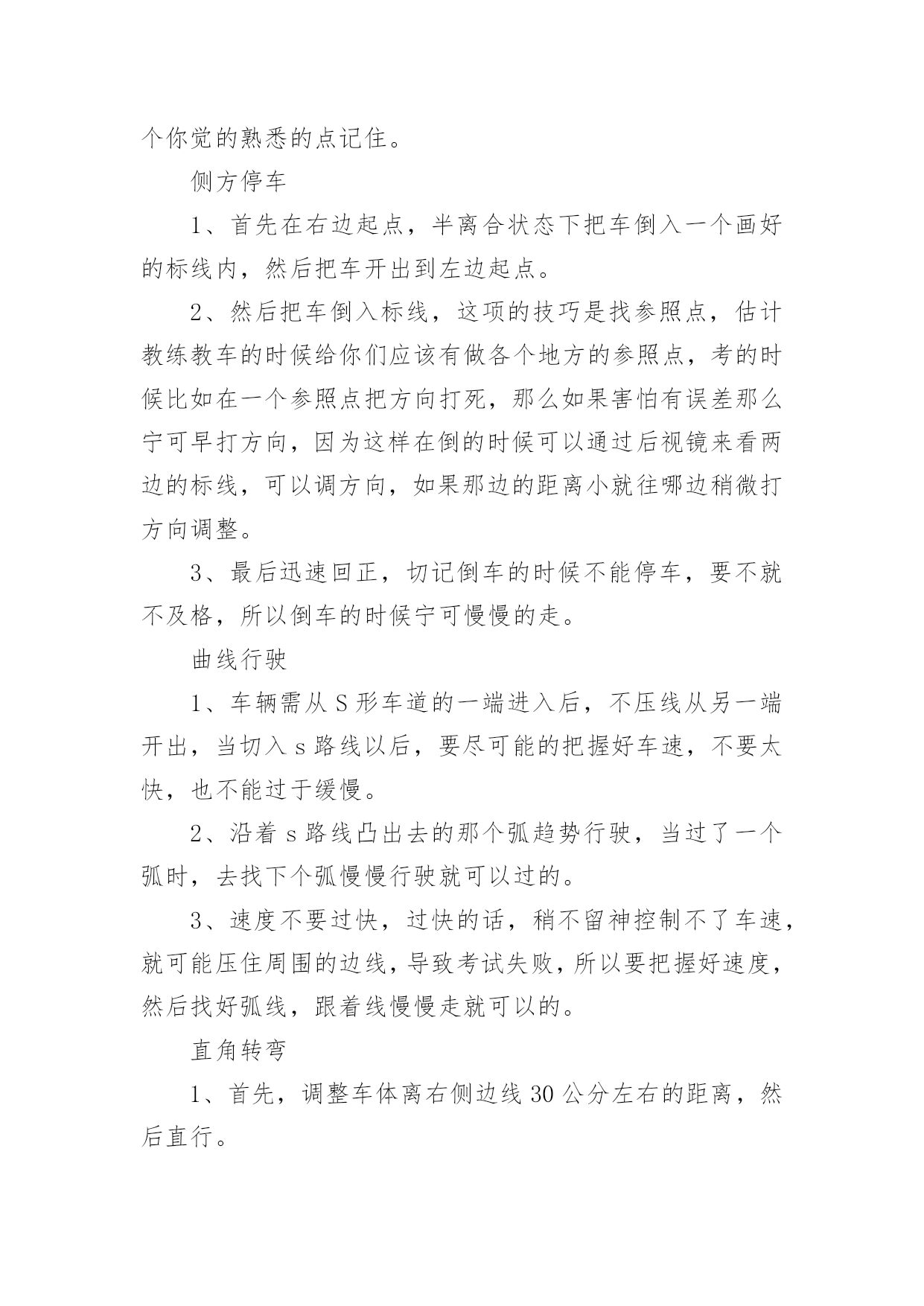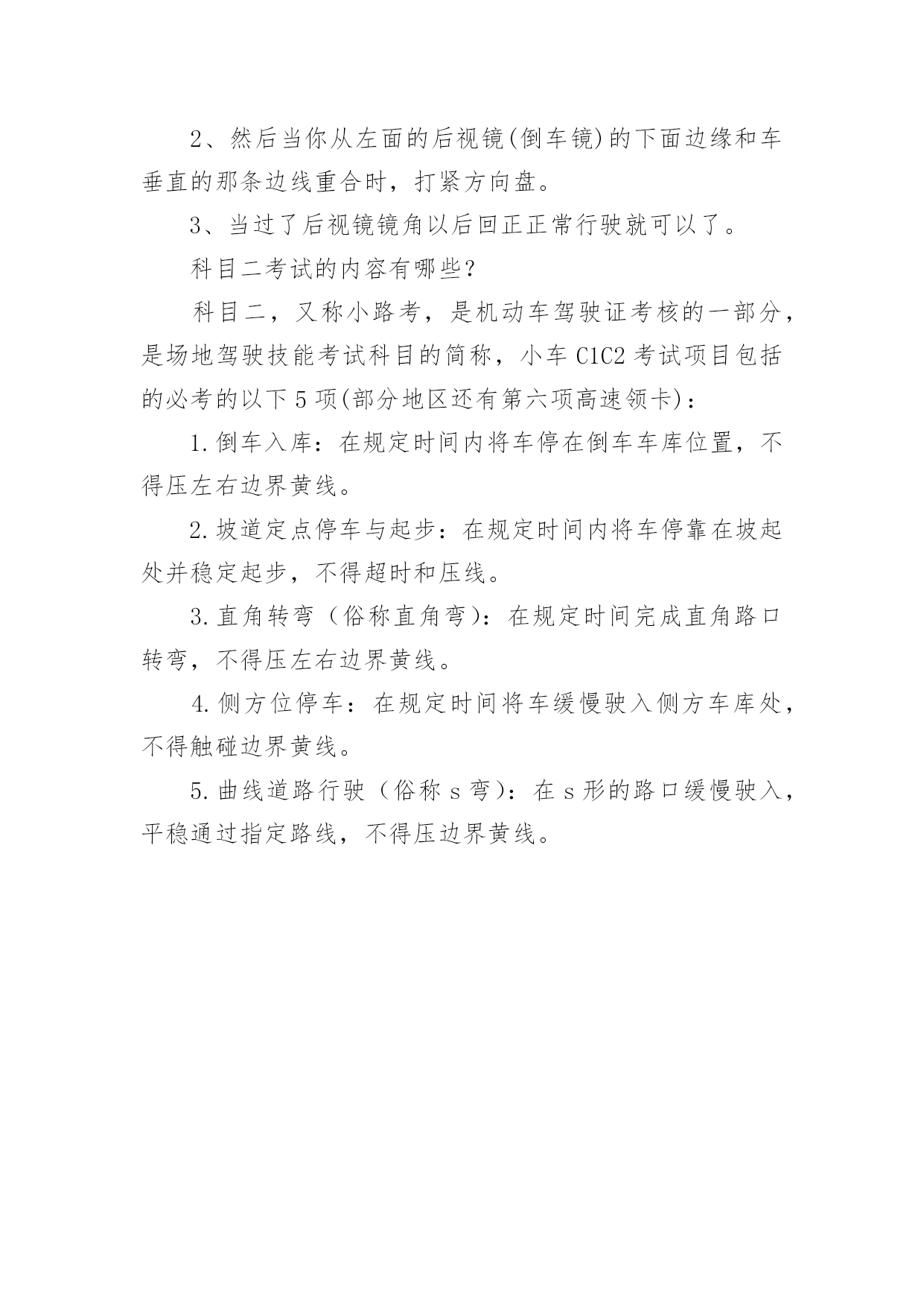 科目二考试内容科目二考试内容科目二是驾照考试中的重要科目,且科目二的考试也是比较难的一个科目,为了方便准备学车的朋友们了解科目二,下面为大家介绍一下科目二考试内容有哪些。科目二考试内容1、倒车入库。2、坡道定点停车和起步。3、侧方停车。4、曲线行驶。5、直角转弯。科目二各项目操作技巧倒车入库右倒车1、轻抬离合使车后移,控制好车速,看左后视镜,当右起点感应线出现在左后视镜位置时把转向盘右打死。2、把转向盘右打死,继续后移,中间不能停车,同时观察右后视镜,至最右边线露出后,保持车身与库角距离30CM,(小于30CM回半圈方向盘调整,大于30CM继续右打死方向,车身正还是大于30CM,可能是看1点时方向盘打的慢,下次提前或加快打方向速度),继续后移,当右后视镜库边线与车身平行时,方向盘回正,调正车身,倒库入底。3、倒库入底时看左后视镜,当库前边线出在左后视镜位置时,停车,倒库完成。4、出库,挂一档前行,当车前头盖刚看不到路边线时,把转向盘左打死,当车身正时,回正方向,前车轮过左起点感应线,停车。左倒车1、轻抬离合使车后移,看左后视镜,当左起点感应线稍微过左后视镜,到位置时把转向盘左打死。2、把转向盘左打死,继续后移,同时观察右左视镜,至最左边线露出后,保持车身与库角距离30CM,继续后移,当左后视镜库边线与车身接近平行时方向盘回正,调正车身,倒库入底。3、方向盘回正,看左后视镜,当库前边线出在左后视镜位置时,停车,倒库完成。4、出库,挂一档前行,当车前头盖看不到路边线时,把转向盘右打死,当车身正时,回正方向,前车轮过右起点感应线,停车。坡道定点停车和起步1、平时在的练习时可以尝试把车正好开到里边线的合格处,下车看看线知道合格以后再坐回车里,然后观察你正常驾驶知识以后你的眼和雨刷或者汽车内的某个部件,和边线是怎样一种关系,然后记住。2、坡上的那个横着的边线看左后视镜,当你看到边线出现在后视镜的下边缘的时候停车,或者还是和找边线的方法一样,你停上去以后看看距离以后再坐回车里,然后找几个你觉的熟悉的点记住。侧方停车1、首先在右边起点,半离合状态下把车倒入一个画好的标线内,然后把车开出到左边起点。2、然后把车倒入标线,这项的技巧是找参照点,估计教练教车的时候给你们应该有做各个地方的参照点,考的时候比如在一个参照点把方向打死,那么如果害怕有误差那么宁可早打方向,因为这样在倒的时候可以通过后视镜来看两边的标线,可以调方向,如果那边的距离小就往哪边稍微打方向调整。3、最后迅速回正,切记倒车的时候不能停车,要不就不及格,所以倒车的时候宁可慢慢的走。曲线行驶1、车辆需从S形车道的一端进入后,不压线从另一端开出,当切入s路线以后,要尽可能的把握好车速,不要太快,也不能过于缓慢。2、沿着s路线凸出去的那个弧趋势行驶,当过了一个弧时,去找下个弧慢慢行驶就可以过的。3、速度不要过快,过快的话,稍不留神控制不了车速,就可能压住周围的边线,导致考试失败,所以要把握好速度,然后找好弧线,跟着线慢慢走就可以的。直角转弯1、首先,调整车体离右侧边线30公分左右的距离,然后直行。2、然后当你从左面的后视镜(倒车镜)的下面边缘和车垂直的那条边线重合时,打紧方向盘。3、当过了后视镜镜角以后回正正常行驶就可以了。科目二考试的内容有哪些?科目二,又称小路考,是机动车驾驶证考核的一部分,是场地驾驶技能考试科目的简称,小车C1C2考试项目包括的必考的以下5项(部分地区还有第六项高速领卡):1.倒车入库:在规定时间内将车停在倒车车库位置,不得压左右边界黄线。2.坡道定点停车与起步:在规定时间内将车停靠在坡起处并稳定起步,不得超时和压线。3.直角转弯(俗称直角弯):在规定时间完成直角路口转弯,不得压左右边界黄线。4.侧方位停车:在规定时间将车缓慢驶入侧方车库处,不得触碰边界黄线。5.曲线道路行驶(俗称s弯):在s形的路口缓慢驶入,平稳通过指定路线,不得压边界黄线。