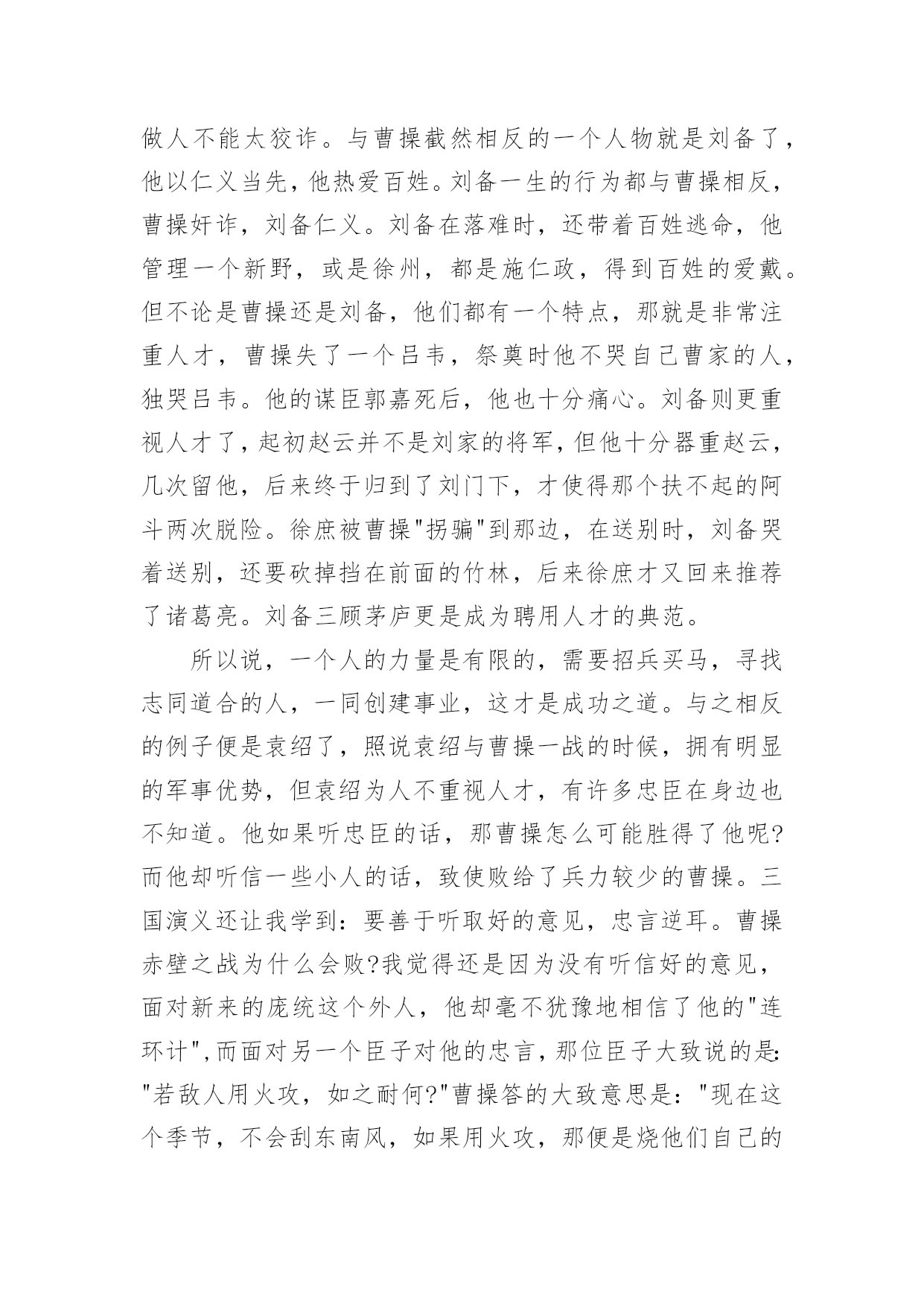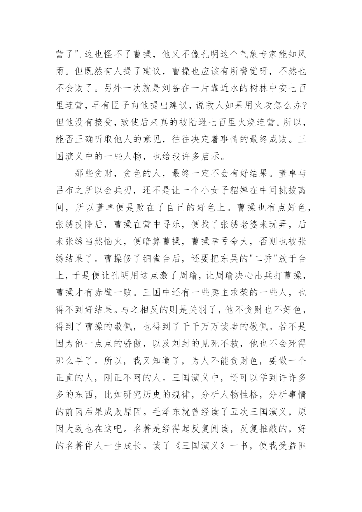 三国演义观后感《三国演义》的观后感三国演义观后感《三国演义》的观后感当观看完一部作品后,对人生或者事物一定产生了许多感想吧,是时候静下心来好好写写观后感了。快来参考观后感是怎么写的吧,下面是小编收集整理的三国演义观后感《三国演义》的观后感,欢迎大家借鉴与参考,希望对大家有所帮助。读完厚厚的一本三国演义,不禁感叹历史的"分久必合,合久必分".三国演义真的为读者生动活现地演义了一个历史故事,也让我从中学到了一些为人处世之道。先来说说曹操这个人物带给我的启示。曹操一生都属于十分大胆型的人物,也是十分奸诈的。他误杀了吕伯奢一家人,最后明知错了,还要继续杀了吕伯奢,其无情无义至此,陈宫便离他而去,曹操后来说的那句话耐人寻味:"宁教我负天下人,休教天下人负我".但反过来想想,如果当时他不赶尽杀绝的话,吕伯奢若真带了些人过来追杀他,可能曹操会就此退出历史舞台了。但是奸诈带来的只会是一时的小利,一直是奸诈的话,自然会遭到报应。后来董承一伙人便刺杀曹操,可惜事败了。后来陆续都有一些人刺杀曹操,但都因一些意外而失败了,否则这位曹阿瞒也不会叱咤风云了。曹操给我的启示就是,做人不能太狡诈。与曹操截然相反的一个人物就是刘备了,他以仁义当先,他热爱百姓。刘备一生的行为都与曹操相反,曹操奸诈,刘备仁义。刘备在落难时,还带着百姓逃命,他管理一个新野,或是徐州,都是施仁政,得到百姓的爱戴。但不论是曹操还是刘备,他们都有一个特点,那就是非常注重人才,曹操失了一个吕韦,祭奠时他不哭自己曹家的人,独哭吕韦。他的谋臣郭嘉死后,他也十分痛心。刘备则更重视人才了,起初赵云并不是刘家的将军,但他十分器重赵云,几次留他,后来终于归到了刘门下,才使得那个扶不起的阿斗两次脱险。徐庶被曹操"拐骗"到那边,在送别时,刘备哭着送别,还要砍掉挡在前面的竹林,后来徐庶才又回来推荐了诸葛亮。刘备三顾茅庐更是成为聘用人才的典范。所以说,一个人的力量是有限的,需要招兵买马,寻找志同道合的人,一同创建事业,这才是成功之道。与之相反的例子便是袁绍了,照说袁绍与曹操一战的时候,拥有明显的军事优势,但袁绍为人不重视人才,有许多忠臣在身边也不知道。他如果听忠臣的话,那曹操怎么可能胜得了他呢?而他却听信一些小人的话,致使败给了兵力较少的曹操。三国演义还让我学到:要善于听取好的意见,忠言逆耳。曹操赤壁之战为什么会败?我觉得还是因为没有听信好的意见,面对新来的庞统这个外人,他却毫不犹豫地相信了他的"连环计",而面对另一个臣子对他的忠言,那位臣子大致说的是:"若敌人用火攻,如之耐何?"曹操答的大致意思是:"现在这个季节,不会刮东南风,如果用火攻,那便是烧他们自己的营了".这也怪不了曹操,他又不像孔明这个气象专家能知风雨。但既然有人提了建议,曹操也应该有所警觉呀,不然也不会败了。另外一次就是刘备在一片靠近水的树林中安七百里连营,早有臣子向他提出建议,说敌人如果用火攻怎么办?但他没有接受,致使后来真的被陆逊七百里火烧连营。所以,能否正确听取他人的意见,往往决定着事情的最终成败。三国演义中的一些人物,也给我许多启示。那些贪财,贪色的人,最终一定不会有好结果。董卓与吕布之所以会兵刃,还不是让一个小女子貂婵在中间挑拨离间,所以董卓便是败在了自己的好色上。曹操也有点好色,张绣投降后,曹操在营中寻乐,便找了张绣老婆来玩弄,后来张绣当然恼火,便暗算曹操,曹操幸亏命大,否则也被张绣结果了。曹操修了铜雀台后,还要把东吴的"二乔"放于台上,于是便让孔明用这点激了周瑜,让周瑜决心出兵打曹操,曹操才有赤壁一败。三国中还有一些卖主求荣的一些人,也得不到好结果。与之相反的则是关羽了,他不贪财也不好色,得到了曹操的敬佩,也得到了千千万万读者的敬佩。若不是因为他一点点的骄傲,以及刘封的见死不救,他也不会死得那么早了。所以,我又知道了,为人不能贪财色,要做一个正直的人,刚正不阿的人。三国演义中,还可以学到许许多多的东西,比如研究历史的规律,分析人物性格,分析事情的前因后果成败原因。毛泽东就曾经读了五次三国演义,原因大致也在这吧。名著是经得起反复阅读,反复推敲的,好的名著伴人一生成长。读了《三国演义》一书,使我受益匪浅。中国四大名著之一的《三国演义》是我国古代历一部重要的文学名著。