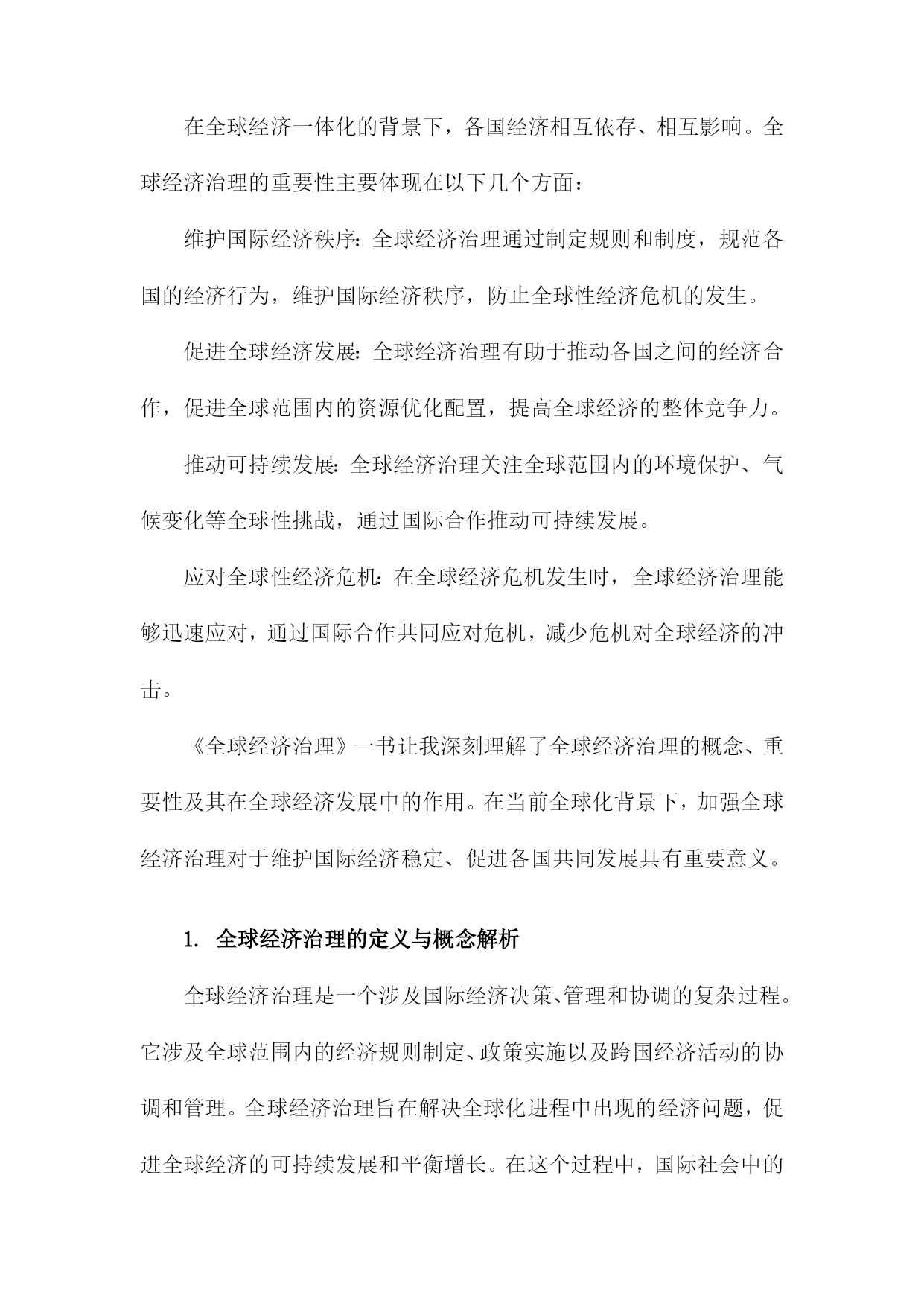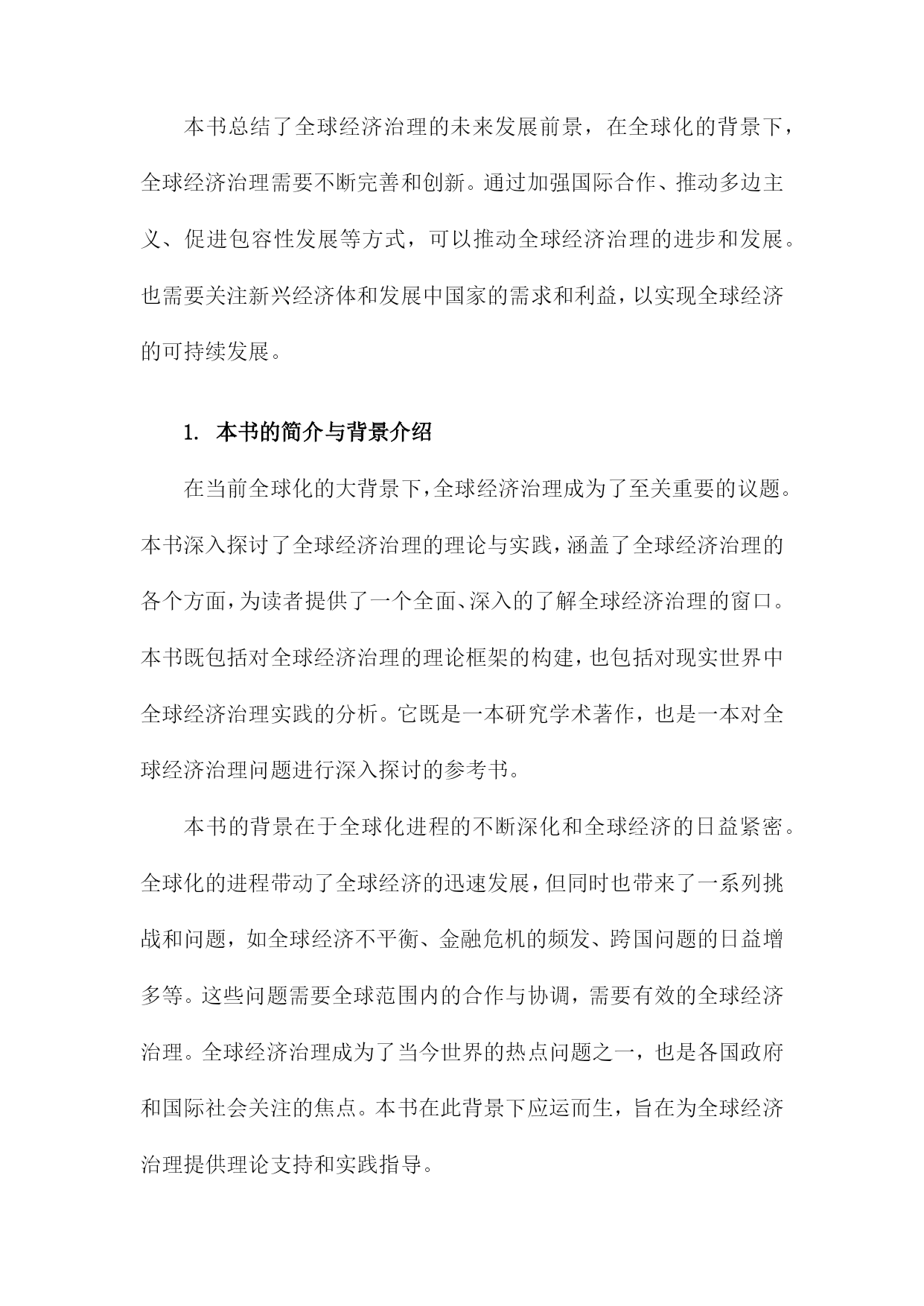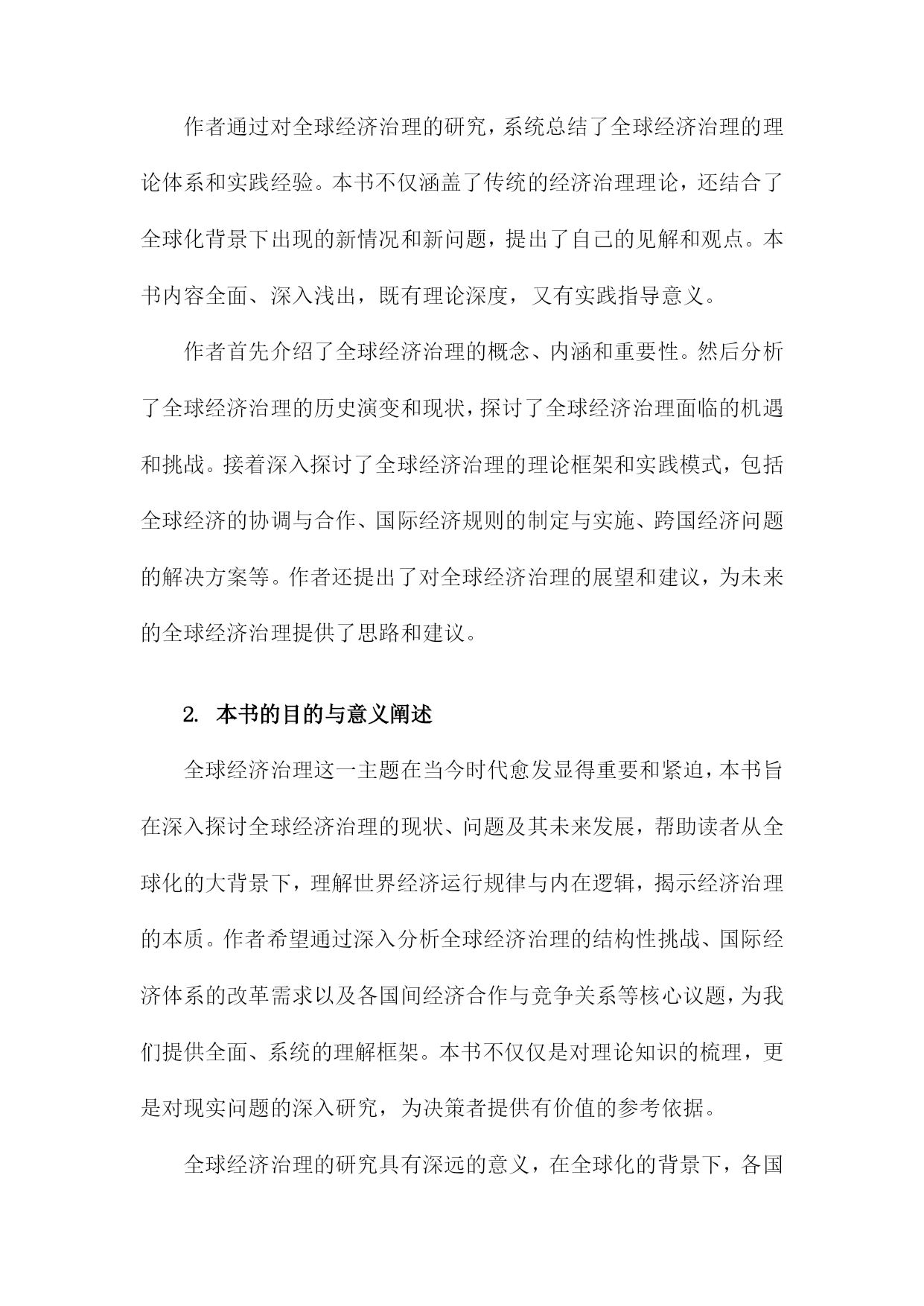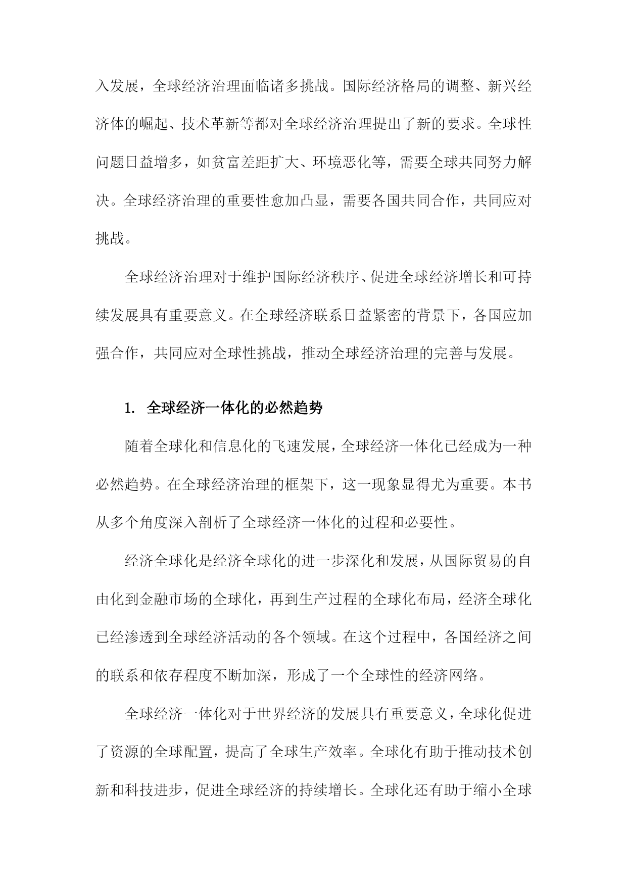 《全球经济治理》读书札记一、内容简述书中介绍了全球经济治理的基本概念及其重要性,全球经济治理作为一种国际经济管理和协调机制,旨在解决全球化进程中出现的经济问题,维护全球经济的稳定与发展。书中分析了全球经济治理的必要性和紧迫性,指出了当前全球经济面临的挑战和困境。该书回顾了全球经济治理的历史演变过程,从布雷顿森林体系的建立到世界贸易组织的成立,再到全球化背景下的经济治理体系变革,书中详细阐述了全球经济治理的发展历程。也指出了在这一进程中存在的各种问题和挑战,如不平等、地缘政治风险、贸易摩擦等。书中探讨了全球经济治理的主要参与者及其角色定位,包括国家、国际组织、跨国公司等在全球经济治理中的责任和角色进行了深入探讨。也分析了不同参与者之间的合作与竞争关系,以及他们如何共同推动全球经济治理的进程。该书还关注了全球经济治理的热点问题,如全球贸易与投资、气候变化、数字经济等议题在书中的重要章节中得到了详细讨论。书中分析了这些热点问题对全球经济治理的影响和挑战,并提出了相应的解决方案和建议。本书总结了全球经济治理的未来发展前景,在全球化的背景下,全球经济治理需要不断完善和创新。通过加强国际合作、推动多边主义、促进包容性发展等方式,可以推动全球经济治理的进步和发展。也需要关注新兴经济体和发展中国家的需求和利益,以实现全球经济的可持续发展。1.本书的简介与背景介绍在当前全球化的大背景下,全球经济治理成为了至关重要的议题。本书深入探讨了全球经济治理的理论与实践,涵盖了全球经济治理的各个方面,为读者提供了一个全面、深入的了解全球经济治理的窗口。本书既包括对全球经济治理的理论框架的构建,也包括对现实世界中全球经济治理实践的分析。它既是一本研究学术著作,也是一本对全球经济治理问题进行深入探讨的参考书。本书的背景在于全球化进程的不断深化和全球经济的日益紧密。全球化的进程带动了全球经济的迅速发展,但同时也带来了一系列挑战和问题,如全球经济不平衡、金融危机的频发、跨国问题的日益增多等。这些问题需要全球范围内的合作与协调,需要有效的全球经济治理。全球经济治理成为了当今世界的热点问题之一,也是各国政府和国际社会关注的焦点。本书在此背景下应运而生,旨在为全球经济治理提供理论支持和实践指导。作者通过对全球经济治理的研究,系统总结了全球经济治理的理论体系和实践经验。本书不仅涵盖了传统的经济治理理论,还结合了全球化背景下出现的新情况和新问题,提出了自己的见解和观点。本书内容全面、深入浅出,既有理论深度,又有实践指导意义。作者首先介绍了全球经济治理的概念、内涵和重要性。然后分析了全球经济治理的历史演变和现状,探讨了全球经济治理面临的机遇和挑战。接着深入探讨了全球经济治理的理论框架和实践模式,包括全球经济的协调与合作、国际经济规则的制定与实施、跨国经济问题的解决方案等。作者还提出了对全球经济治理的展望和建议,为未来的全球经济治理提供了思路和建议。2.本书的目的与意义阐述全球经济治理这一主题在当今时代愈发显得重要和紧迫,本书旨在深入探讨全球经济治理的现状、问题及其未来发展,帮助读者从全球化的大背景下,理解世界经济运行规律与内在逻辑,揭示经济治理的本质。作者希望通过深入分析全球经济治理的结构性挑战、国际经济体系的改革需求以及各国间经济合作与竞争关系等核心议题,为我们提供全面、系统的理解框架。本书不仅仅是对理论知识的梳理,更是对现实问题的深入研究,为决策者提供有价值的参考依据。全球经济治理的研究具有深远的意义,在全球化的背景下,各国经济相互依存,全球性经济问题的解决需要国际合作与协同努力。对于全球经济治理的研究,有助于深化我们对于世界经济秩序的认知,增强我们的全球视野和战略思维。随着新兴经济体的崛起和发展中国家在全球经济中的地位日益重要,全球经济治理结构的变革与调整不可避免。对全球经济治理的研究可以帮助我们预测并把握世界经济的未来发展态势,以期推动世界经济走向更加公正、合理的格局。对于决策者和政策制定者来说,本书的研究结果可以为他们提供决策参考,推动全球经济的可持续发展。本书的意义还在于激发读者对于全球经济治理的深入思考,激发我们积极参与全球治理的热情和使命感。二、全球经济治理概述在阅读《全球经济治理》一书的过程中,我对全球经济治理的概念及其重要性有了更深入的理解。全球经济治理涉及的领域广泛,主要包括国际贸易、国际金融、知识产权保护、环境保护、能源安全等方面。在当前全球化背景下,全球经济治理的作用愈发凸显,对于维护国际经济秩序、促进各国共同发展具有重要意义。全球经济治理是指通过国际机制、规则和制度来管理和调控全球范围内的经济活动和交易,以促进全球经济的可持续发展。它是应对全球化带来的挑战和危机的重要途径,旨在维护国际经济稳定,推动各国共同繁荣。