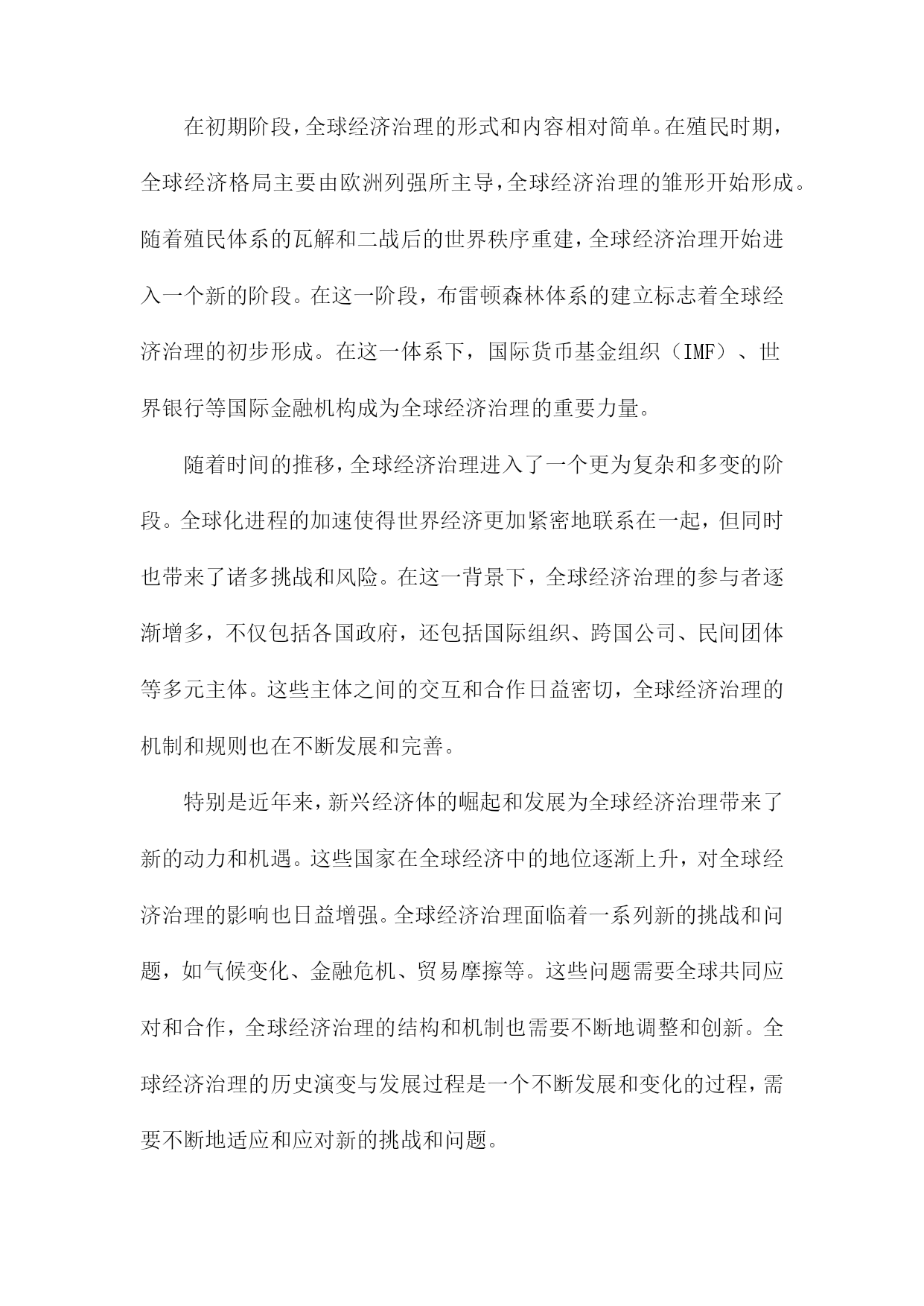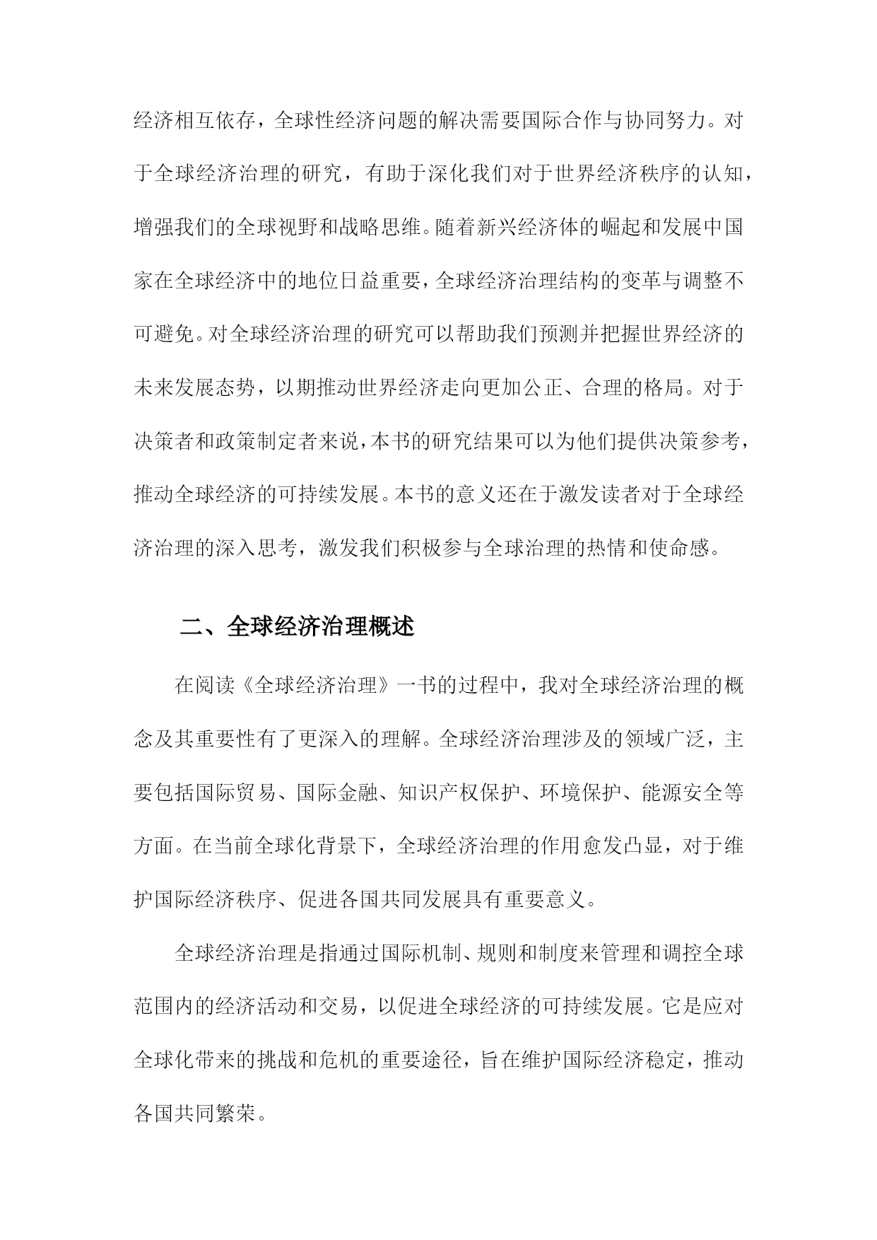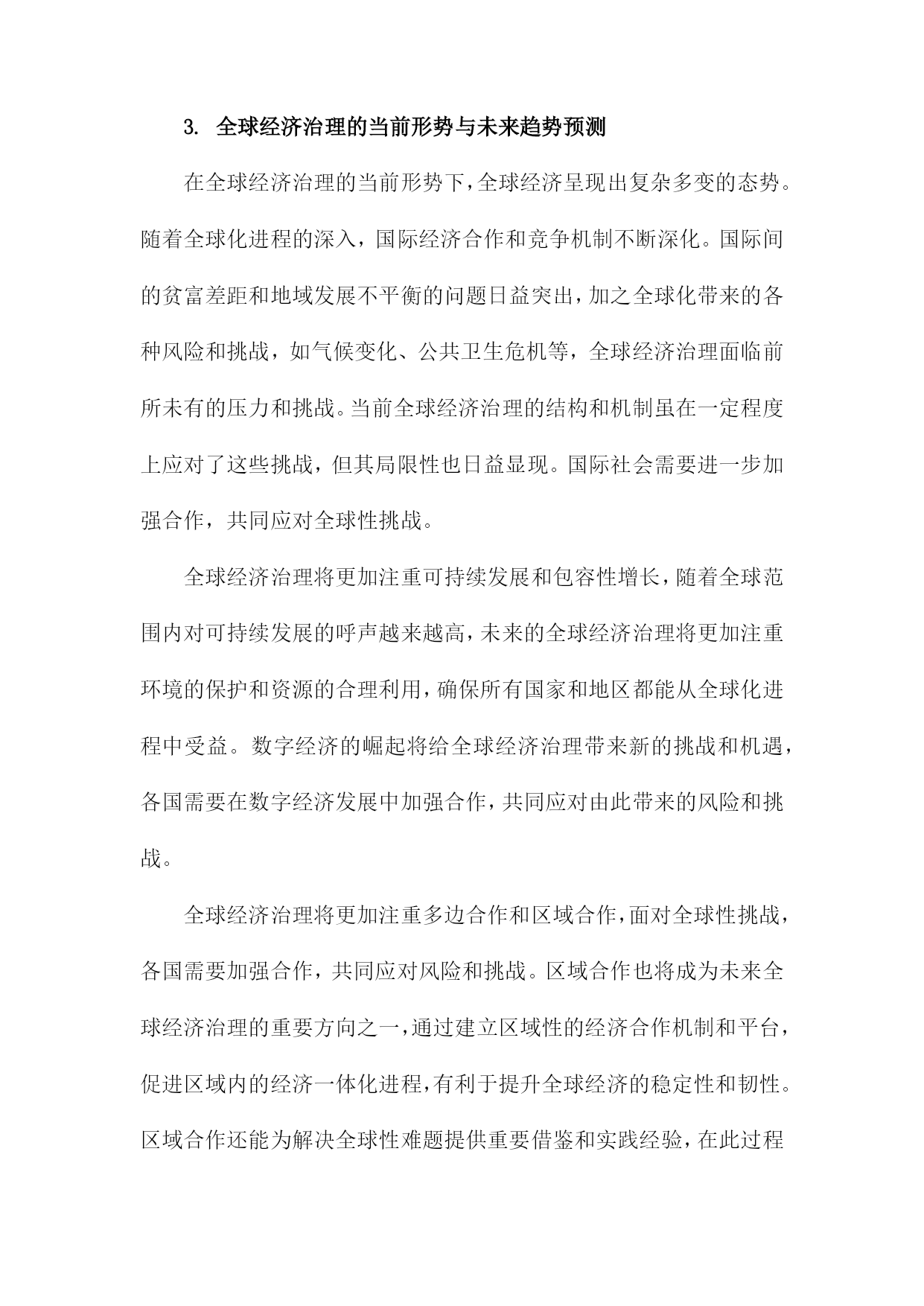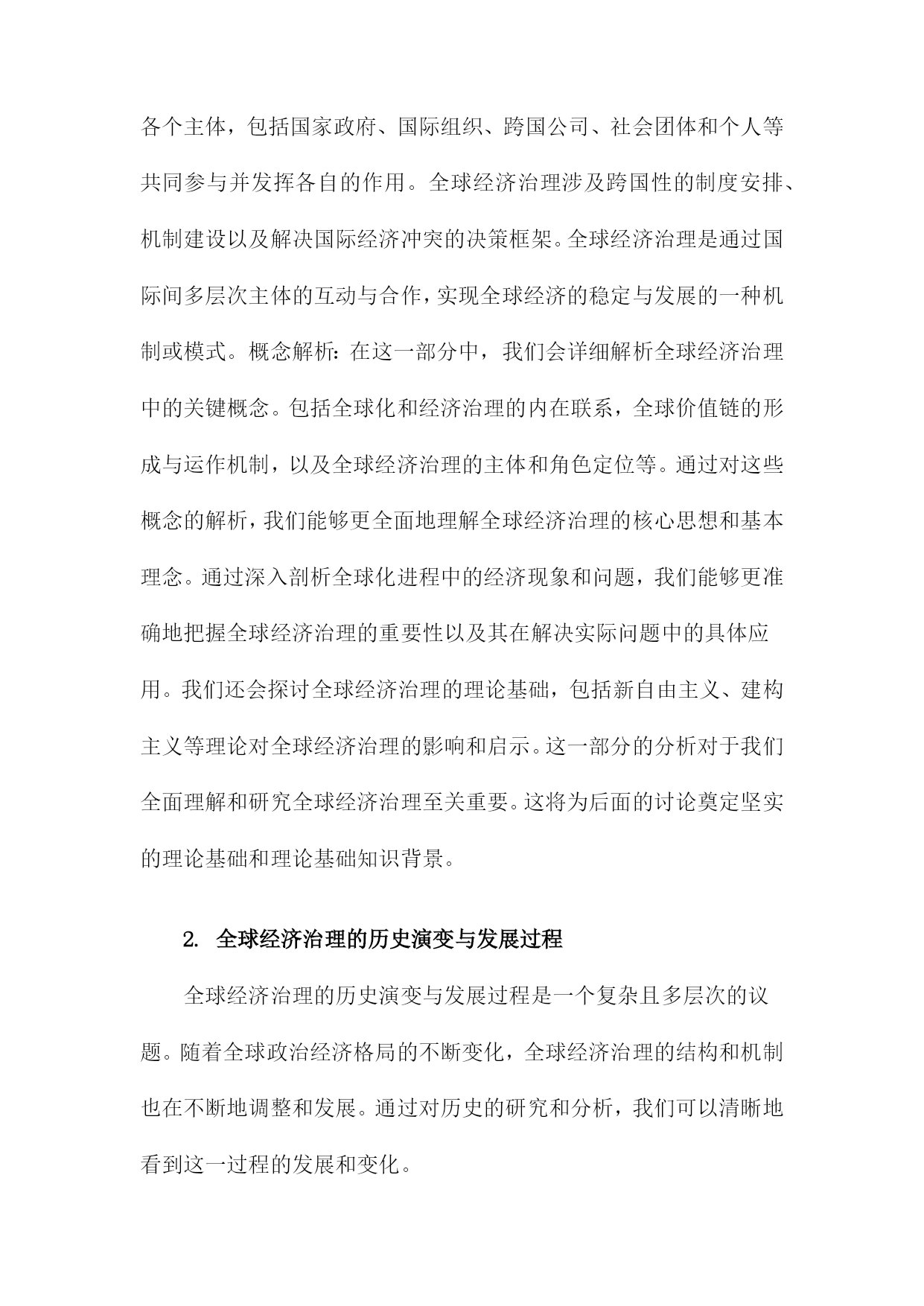 《全球经济治理》读书札记一、内容简述书中介绍了全球经济治理的基本概念及其重要性,全球经济治理作为一种国际经济管理和协调机制,旨在解决全球化进程中出现的经济问题,维护全球经济的稳定与发展。书中分析了全球经济治理的必要性和紧迫性,指出了当前全球经济面临的挑战和困境。该书回顾了全球经济治理的历史演变过程,从布雷顿森林体系的建立到世界贸易组织的成立,再到全球化背景下的经济治理体系变革,书中详细阐述了全球经济治理的发展历程。也指出了在这一进程中存在的各种问题和挑战,如不平等、地缘政治风险、贸易摩擦等。书中探讨了全球经济治理的主要参与者及其角色定位,包括国家、国际组织、跨国公司等在全球经济治理中的责任和角色进行了深入探讨。也分析了不同参与者之间的合作与竞争关系,以及他们如何共同推动全球经济治理的进程。该书还关注了全球经济治理的热点问题,如全球贸易与投资、气候变化、数字经济等议题在书中的重要章节中得到了详细讨论。书中分析了这些热点问题对全球经济治理的影响和挑战,并提出了相应的解决方案和建议。本书总结了全球经济治理的未来发展前景,在全球化的背景下,全球经济治理需要不断完善和创新。通过加强国际合作、推动多边主义、促进包容性发展等方式,可以推动全球经济治理的进步和发展。也需要关注新兴经济体和发展中国家的需求和利益,以实现全球经济的可持续发展。1.本书的简介与背景介绍在当前全球化的大背景下,全球经济治理成为了至关重要的议题。本书深入探讨了全球经济治理的理论与实践,涵盖了全球经济治理的各个方面,为读者提供了一个全面、深入的了解全球经济治理的窗口。本书既包括对全球经济治理的理论框架的构建,也包括对现实世界中全球经济治理实践的分析。它既是一本研究学术著作,也是一本对全球经济治理问题进行深入探讨的参考书。本书的背景在于全球化进程的不断深化和全球经济的日益紧密。全球化的进程带动了全球经济的迅速发展,但同时也带来了一系列挑战和问题,如全球经济不平衡、金融危机的频发、跨国问题的日益增多等。这些问题需要全球范围内的合作与协调,需要有效的全球经济治理。全球经济治理成为了当今世界的热点问题之一,也是各国政府和国际社会关注的焦点。本书在此背景下应运而生,旨在为全球经济治理提供理论支持和实践指导。作者通过对全球经济治理的研究,系统总结了全球经济治理的理论体系和实践经验。本书不仅涵盖了传统的经济治理理论,还结合了全球化背景下出现的新情况和新问题,提出了自己的见解和观点。本书内容全面、深入浅出,既有理论深度,又有实践指导意义。作者首先介绍了全球经济治理的概念、内涵和重要性。然后分析了全球经济治理的历史演变和现状,探讨了全球经济治理面临的机遇和挑战。接着深入探讨了全球经济治理的理论框架和实践模式,包括全球经济的协调与合作、国际经济规则的制定与实施、跨国经济问题的解决方案等。作者还提出了对全球经济治理的展望和建议,为未来的全球经济治理提供了思路和建议。2.本书的目的与意义阐述全球经济治理这一主题在当今时代愈发显得重要和紧迫,本书旨在深入探讨全球经济治理的现状、问题及其未来发展,帮助读者从全球化的大背景下,理解世界经济运行规律与内在逻辑,揭示经济治理的本质。作者希望通过深入分析全球经济治理的结构性挑战、国际经济体系的改革需求以及各国间经济合作与竞争关系等核心议题,为我们提供全面、系统的理解框架。本书不仅仅是对理论知识的梳理,更是对现实问题的深入研究,为决策者提供有价值的参考依据。全球经济治理的研究具有深远的意义,在全球化的背景下,各国经济相互依存,全球性经济问题的解决需要国际合作与协同努力。对于全球经济治理的研究,有助于深化我们对于世界经济秩序的认知,增强我们的全球视野和战略思维。随着新兴经济体的崛起和发展中国家在全球经济中的地位日益重要,全球经济治理结构的变革与调整不可避免。对全球经济治理的研究可以帮助我们预测并把握世界经济的未来发展态势,以期推动世界经济走向更加公正、合理的格局。对于决策者和政策制定者来说,本书的研究结果可以为他们提供决策参考,推动全球经济的可持续发展。本书的意义还在于激发读者对于全球经济治理的深入思考,激发我们积极参与全球治理的热情和使命感。二、全球经济治理概述在阅读《全球经济治理》一书的过程中,我对全球经济治理的概念及其重要性有了更深入的理解。全球经济治理涉及的领域广泛,主要包括国际贸易、国际金融、知识产权保护、环境保护、能源安全等方面。在当前全球化背景下,全球经济治理的作用愈发凸显,对于维护国际经济秩序、促进各国共同发展具有重要意义。全球经济治理是指通过国际机制、规则和制度来管理和调控全球范围内的经济活动和交易,以促进全球经济的可持续发展。它是应对全球化带来的挑战和危机的重要途径,旨在维护国际经济稳定,推动各国共同繁荣。