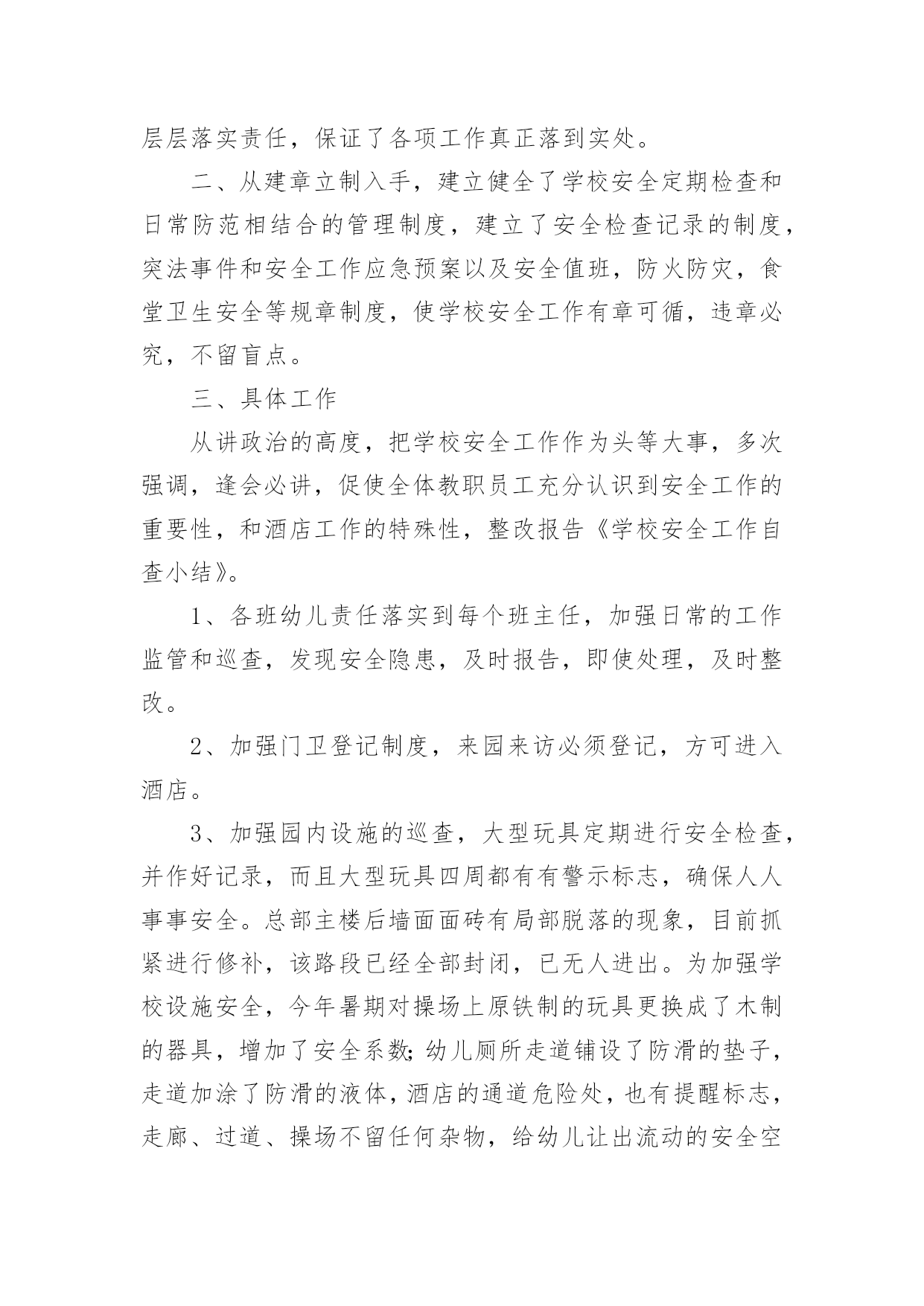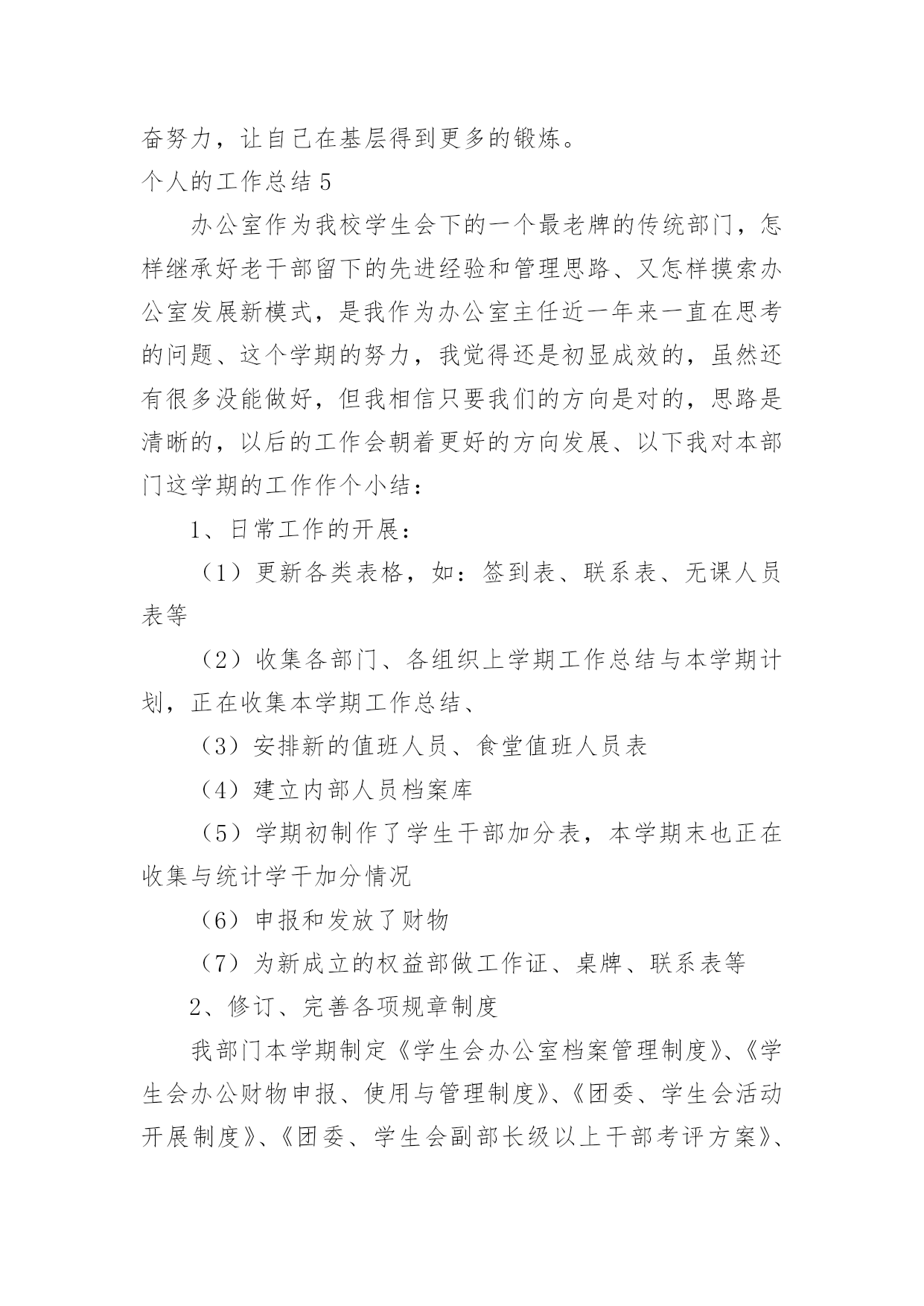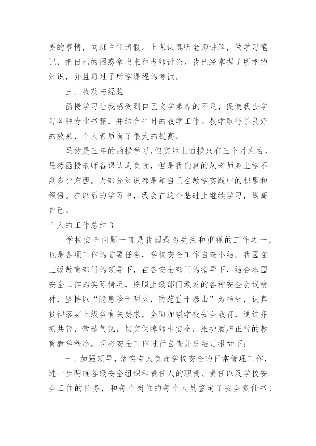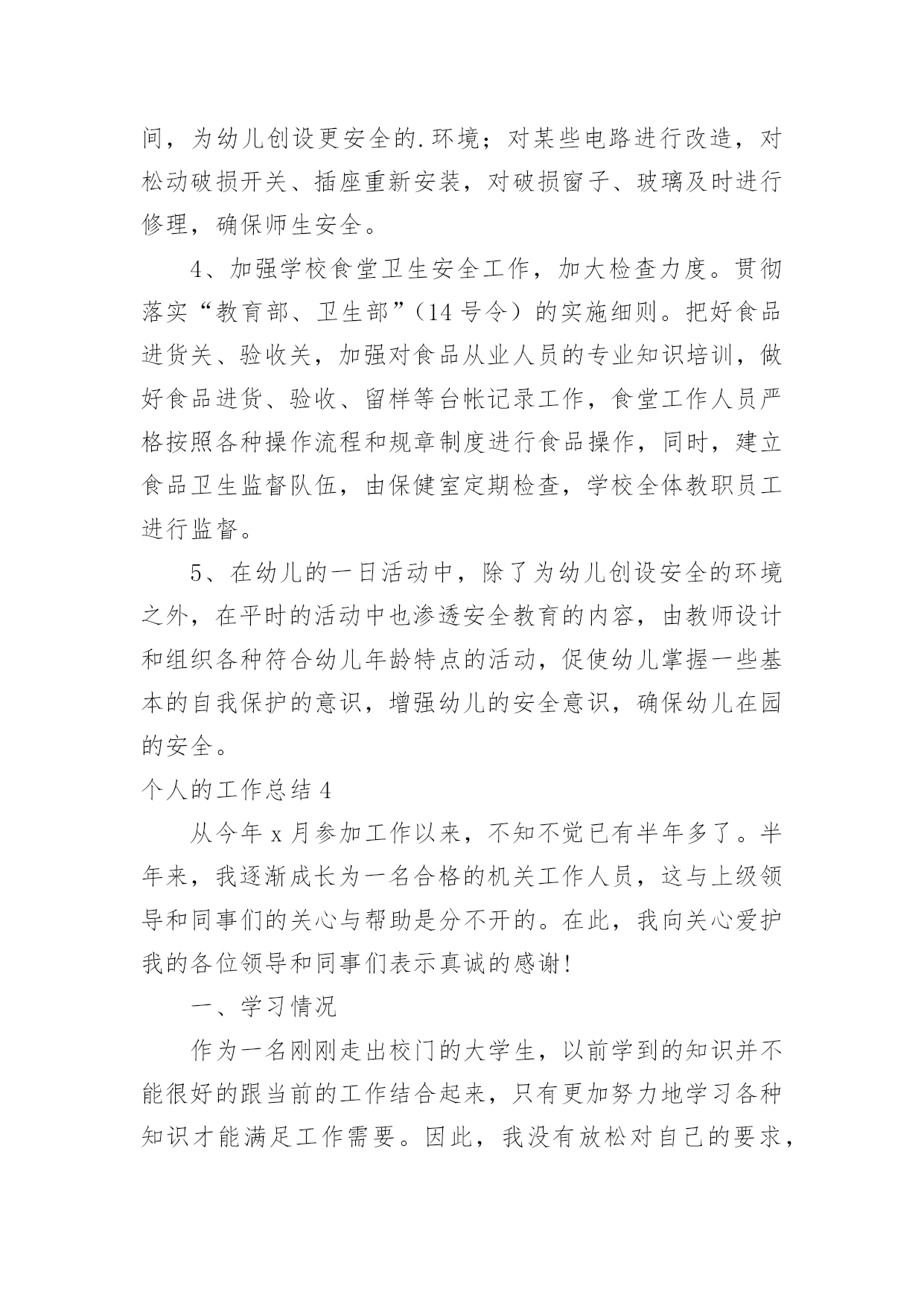 个人的工作总结个人的工作总结15篇总结是事后对某一阶段的学习、工作或其完成情况加以回顾和分析的一种书面材料,它可以明确下一步的工作方向,少走弯路,少犯错误,提高工作效益,不妨让我们认真地完成总结吧。那么总结要注意有什么内容呢?下面是小编为大家整理的个人的工作总结,仅供参考,希望能够帮助到大家。个人的工作总结1我从20xx年xx月xx日开始在xx公司工作,不知不觉已经过了X个月的试用期。在这期间,我收获了很多感悟。虽然这不是我的第一份工作,但在此期间,我对工作的态度一直是谦虚谨慎,认真负责,从未改变。在本部门工作中,我一直严格要求自己,认真及时完成领导交给的每一项任务,虚心向同事学习,不断纠正工作中的不足;对于集团和公司的各项制度和规定都认真学习并严格执行;此外,我有很强的团队精神,能很好地协调和沟通,配合各部门负责人执行和完成公司的工作,热心帮助其他同事与他人相处融洽。试用期间,虽然刚从母校学到了一些理论知识,但这种情况已经不能满足工作的需要。为了尽快掌握服务行业,我坚持每天来公司学习公司的.制度和理论知识,等等。说到工作时间,我跟那些学长学实际操作,帮忙做点小事。夜晚,我的思乡之情与日俱增。经过长时间的锻炼、克服和努力,我逐渐成为一名合格的服务商。三个月的工作,我收获最大的,就是在服务的时候,让我知道了人与人之间最基本的沟通礼仪。在过去的两个月里,通过不断的学习和自我提升,我已经适应了自己的工作。但是对于一个初入公司的新人来说,考虑一些问题可能不够全面。但我相信,在公司领导和同事们的悉心指导和帮助下,我一定能在今后的工作中更好地提高自己的专业水平和综合素质,更好地完成本职工作,不断与公司共谋发展!个人的工作总结2通过两年的函授学习和社会实践,是我不断挑战自己,充实自己的过程。通过学习,我在各方面都有了很大的进步。毕业是对我这两年学习生活的总结和鉴定。一、思想政治方面在函授期间,我尽力遵守学校的规章制度,培养自己的.文学兴趣。尊敬老师,热爱班级,与同学相处融洽,关系融洽。二、学习的目的和态度按照学校的相关规定,可以利用业余时间自学各种课程,积极参加集中面授和讲座,按时完成全部作业。上课期间,我保持着以前学习时代的风格,不迟到不早退。如果你有重要的事情,向班主任请假。上课认真听老师讲解,做学习笔记,把自己的困惑拿出来和老师讨论。我已经掌握了所学的知识,并且通过了所学课程的考试。三、收获与经验函授学习让我感受到自己文学素养的不足,促使我去学习各种专业书籍,并结合平时的教学工作。教学取得了良好的效果,个人素质有了很大的提高。虽然是三年的函授学习,但实际上面授只有三个月左右。虽然函授老师备课认真负责,但是我们真的从老师身上学不到多少东西。大部分知识都是靠自己在教学实践中的积累和领悟。在以后的学习中,我会在这个基础上继续学习,提高自己。个人的工作总结3学校安全问题一直是我园最为关注和重视的工作之一,也是各项工作的首要任务,学校安全工作自查小结。我园在上级教育部门的领导下,在各安全部门的指导下,结合本园安全工作的实际情况,按照上级部门颁发的各种安全会议精神,坚持以“隐患险于明火,防范重于泰山”为指针,认真贯彻落实上级各有关要求,全面加强学校安全教育,通过齐抓共管,营造气氛,切实保障师生安全,维护酒店正常的教育教学秩序。现将安全工作进行自查并总结汇报如下:一、加强领导,落实专人负责学校安全的日常管理工作,进一步明确各级安全组织和责任人的职责、责任以及学校安全工作的任务,和每个岗位的每个人员签定了安全责任书、层层落实责任,保证了各项工作真正落到实处。二、从建章立制入手,建立健全了学校安全定期检查和日常防范相结合的管理制度,建立了安全检查记录的制度,突法事件和安全工作应急预案以及安全值班,防火防灾,食堂卫生安全等规章制度,使学校安全工作有章可循,违章必究,不留盲点。三、具体工作从讲政治的高度,把学校安全工作作为头等大事,多次强调,逢会必讲,促使全体教职员工充分认识到安全工作的重要性,和酒店工作的特殊性,整改报告《学校安全工作自查小结》。1、各班幼儿责任落实到每个班主任,加强日常的工作监管和巡查,发现安全隐患,及时报告,即使处理,及时整改。2、加强门卫登记制度,来园来访必须登记,方可进入酒店。3、加强园内设施的巡查,大型玩具定期进行安全检查,并作好记录,而且大型玩具四周都有有警示标志,确保人人事事安全。总部主楼后墙面面砖有局部脱落的现象,目前抓紧进行修补,该路段已经全部封闭,已无人进出。为加强学校设施安全,今年暑期对操场上原铁制的玩具更换成了木制的器具,增加了安全系数;幼儿厕所走道铺设了防滑的垫子,走道加涂了防滑的液体,酒店的通道危险处,也有提醒标志,走廊、过道、操场不留任何杂物,给幼儿让出流动的安全空间,为幼儿创设更安全的.环境;对某些电路