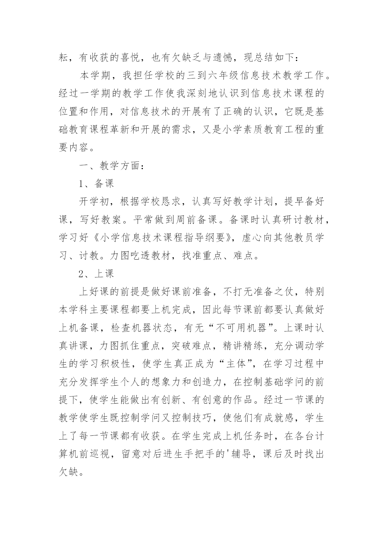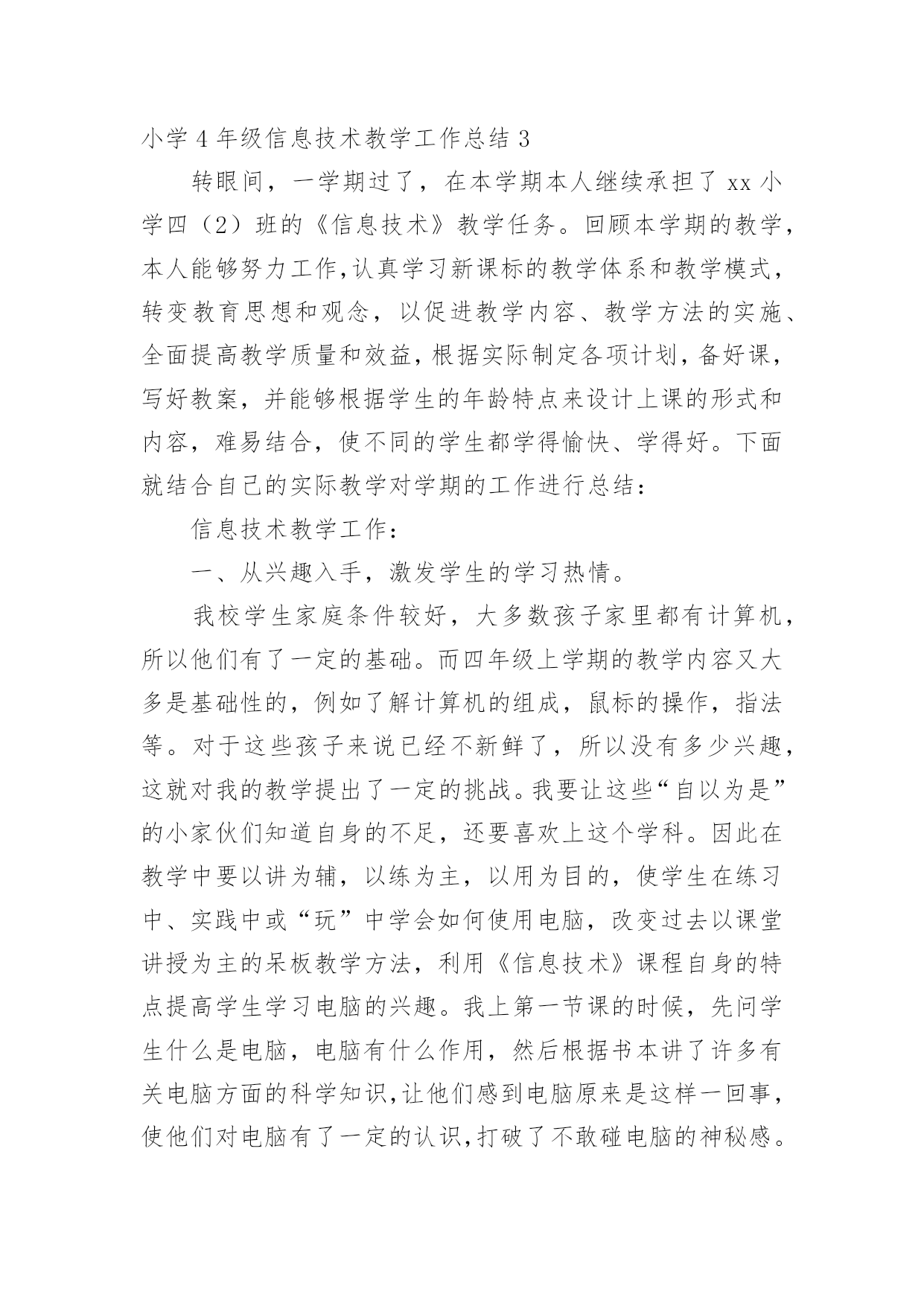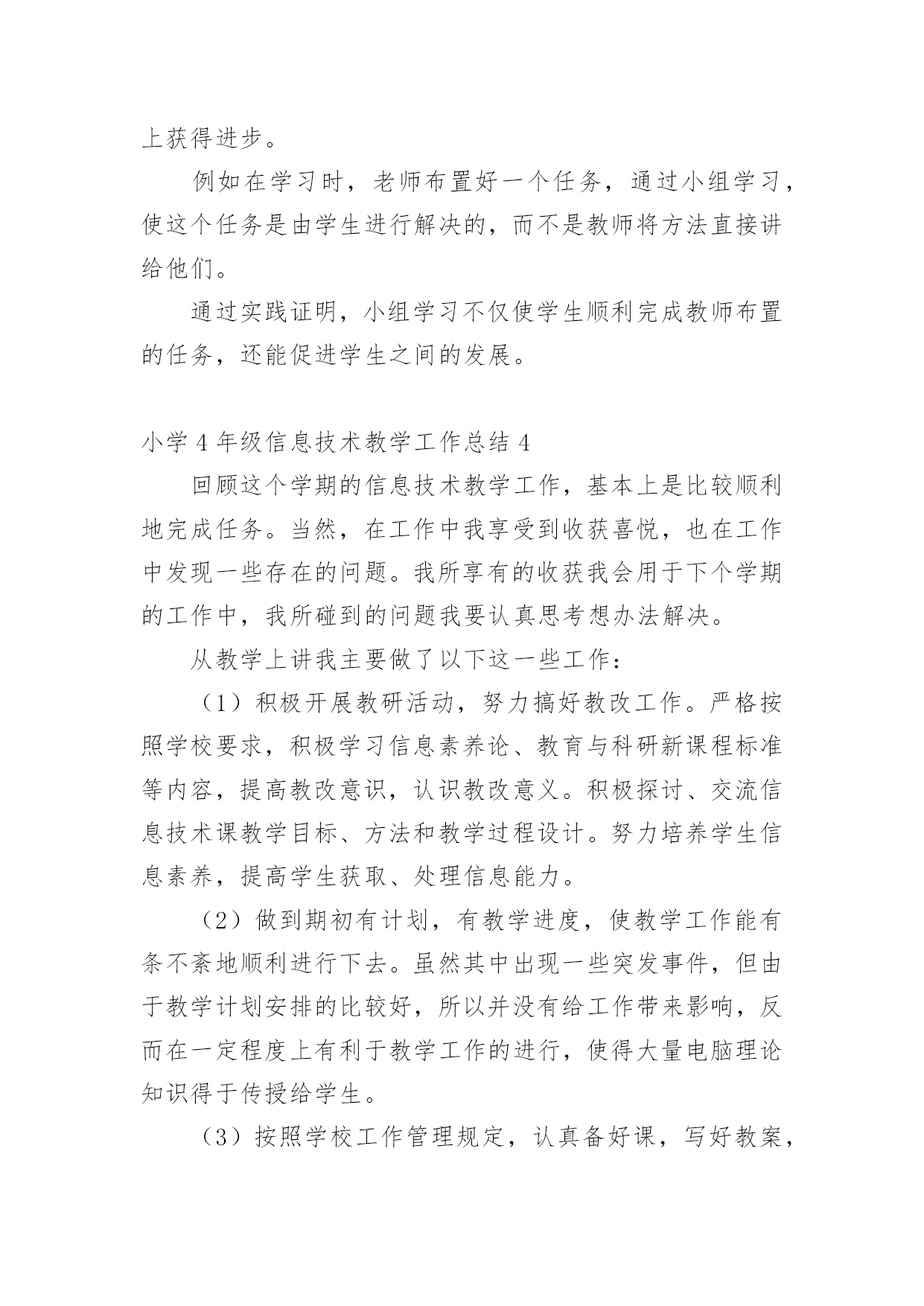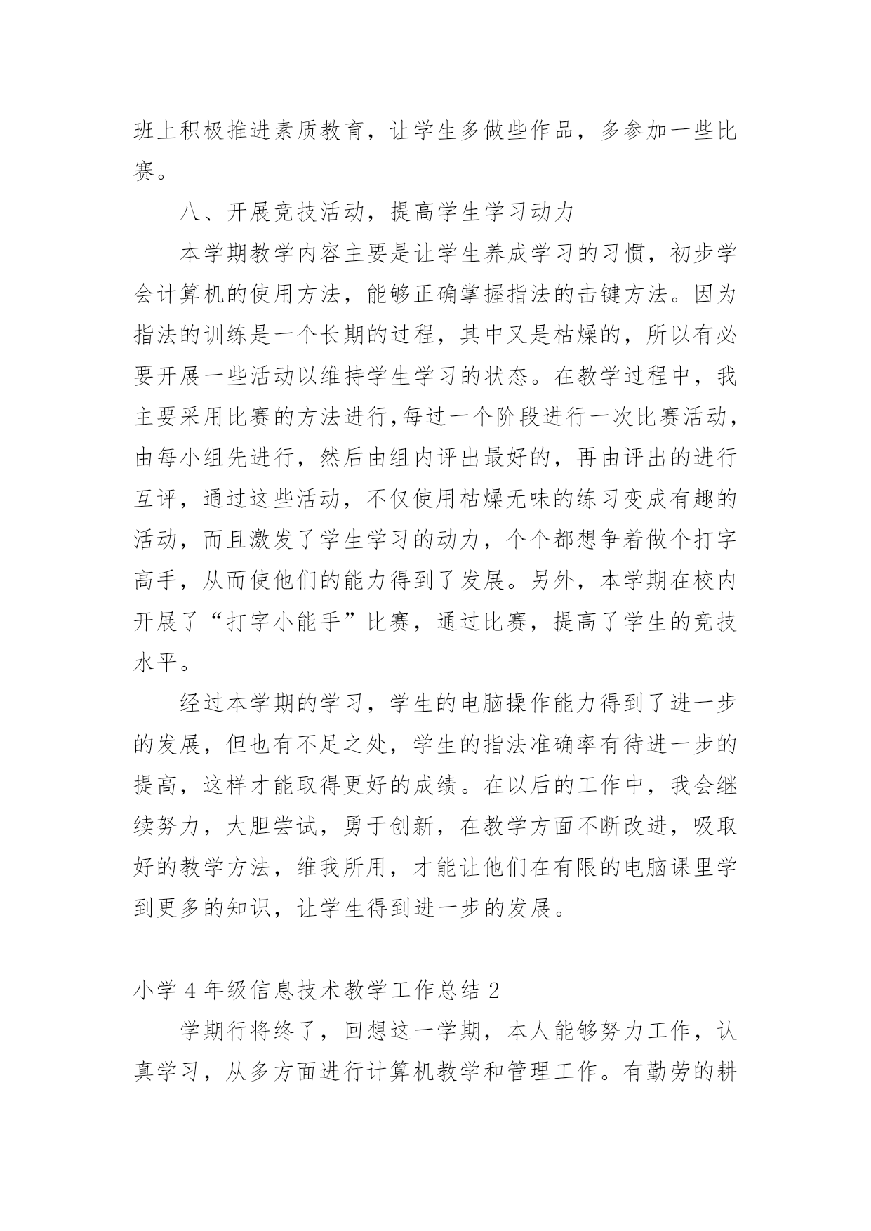 小学4年级信息技术教学工作总结总结是事后对某一阶段的学习或工作情况作加以回顾检查并分析评价的书面材料,它可以促使我们思考,不妨让我们认真地完成总结吧。如何把总结做到重点突出呢?以下是小编收集整理的小学4年级信息技术教学工作总结,希望对大家有所帮助。小学4年级信息技术教学工作总结1立足现在,放眼未来,为使今后的工作取得更大的进步,现对本学期教学工作作出总结,希望能发扬优点,克服不足,总结检验教训,继往开来,以促进教训工作更上一层楼。一、培养学生学习电脑的兴趣。《信息技术》不同于一般的学科,而是一门实践性很强的学科,因此在教学中要以讲为辅,以练为主,以用为目的,使学生在练习中、实践中或“玩”中学会如何使用电脑,改变过去以课堂讲授为主的呆板教学方法,利用《信息技术》课程自身的特点提高学生学习电脑的兴趣。开学时,学生大多数刚接触电脑,对电脑有着一种神秘感,对学习电脑也有着一种极大的兴趣感,作为教师要怎样才能将学生的这种兴趣继续保持下去呢?我上第一节课的时候,先问学生什么是电脑,电脑有什么作用,然后根据书本讲了许多有关电脑方面的科学知识,让他们感到电脑原来是这样一回事,使他们对电脑有了一定的认识,打破了不敢碰电脑的神秘感。接着讲解了电脑的作用,激发了他们学习的欲望。二、认真备课,不但备学生而且备教材备教法,根据教材内容及学生的实际,设计课的类型,拟定采用的教学方法,并对教学过程的程序及时间安排都作了详细的记录,认真写好教案。每一课都做到“有备而来”,每堂课都在课前做好充分的准备,我还要查阅各种资料,能上因特网时还上网寻找好的教学材料,教学课件,把它们和我所从事的工作结合起来,为我所用。三、增强上课技能,提高教学质量使讲解清晰化,条理化,准确化,条理化,准确化,情感化,生动化,做到线索清晰,层次分明,言简意赅,深入浅出。在课堂上特别注意调动学生的积极性,加强师生交流,充分体现学生的主作用,让学生学得容易,学得轻松,学得愉快;注意精讲精练,在课堂上老师讲得尽量少,学生动口动手动脑尽量多;同时在每一堂课上都充分考虑每一个层次的学生学习需求和学习能力,让各个层次的学生都得到提高。四、虚心请教其他老师。在教学上,有疑必问。在各个章节的学习上都积极征求其他老师的意见,学习他们的方法,同时,多听老师的课,做到边听边讲,学习别人的优点,克服自己的不足,并常常邀请其他老师来听课,征求他们的意见,改进工作。五、当堂点评学生作业:根据我们学部的打造博文课堂新模式的要求,对于每节课,要坚决实行堂堂清,对于电脑课这样注重实际操作的课程就具有更重要的意义,所以我一直坚决执行着,而且当堂对每个完成作业的同学堂村小学学随堂点评。使学生能更好的学好知识,使学习效率也大大提高了。六、做好课后辅导工作,注意分层教学。在课后,为不同层次的学生进行相应的辅导,以满足不同层次的学生的需求,避免了一刀切的弊端,同时加大了后进生的辅导力度。对后进生的辅导,并不限于学习知识性的辅导,更重要的是学习思想的辅导,要提高后进生的成绩,首先要解决他们心结,让他们意识到学习的重要性和必要性,使之对学习萌发兴趣。要通过各种途径激发他们的求知欲和上进心,让他们意识到学习并不是一项任务,也不是一件痛苦的事情。而是充满乐趣的。从而自觉的.把身心投放到学习中去。这样,后进生的转化,就由原来的简单粗暴、强制学习转化到自觉的求知上来。使学习成为他们自我意识力度一部分。在此基础上,再教给他们学习的方法,提高他们的技能。并认真细致地做好查漏补缺工作。后进生通常存在很多知识断层,这些都是后进生转化过程中的拌脚石,在做好后进生的转化工作时,要特别注意给他们补课,把他们以前学习的知识断层补充完整,这样,他们就会学得轻松,进步也快,兴趣和求知欲也会随之增加。七、积极推进素质教育。目前的信息技术课程还不需要参加中考,学生学习压力不大,很多学生也就没有用心学习,根据这钟情况,我就在班上积极推进素质教育,让学生多做些作品,多参加一些比赛。八、开展竞技活动,提高学生学习动力本学期教学内容主要是让学生养成学习的习惯,初步学会计算机的使用方法,能够正确掌握指法的击键方法。因为指法的训练是一个长期的过程,其中又是枯燥的,所以有必要开展一些活动以维持学生学习的状态。在教学过程中,我主要采用比赛的方法进行,每过一个阶段进行一次比赛活动,由每小组先进行,然后由组内评出最好的,再由评出的进行互评,通过这些活动,不仅使用枯燥无味的练习变成有趣的活动,而且激发了学生学习的动力,个个都想争着做个打字高手,从而使他们的能力得到了发展。另外,本学期在校内开展了“打字小能手”比赛,通过比赛,提高了学生的竞技水平。经过本学期的学习,学生的电脑操作能力得到了进一步的发展,但也有不足之处,学生的指法准确率有待进一步的提高,这样才能取得更好的成绩。在以后的工