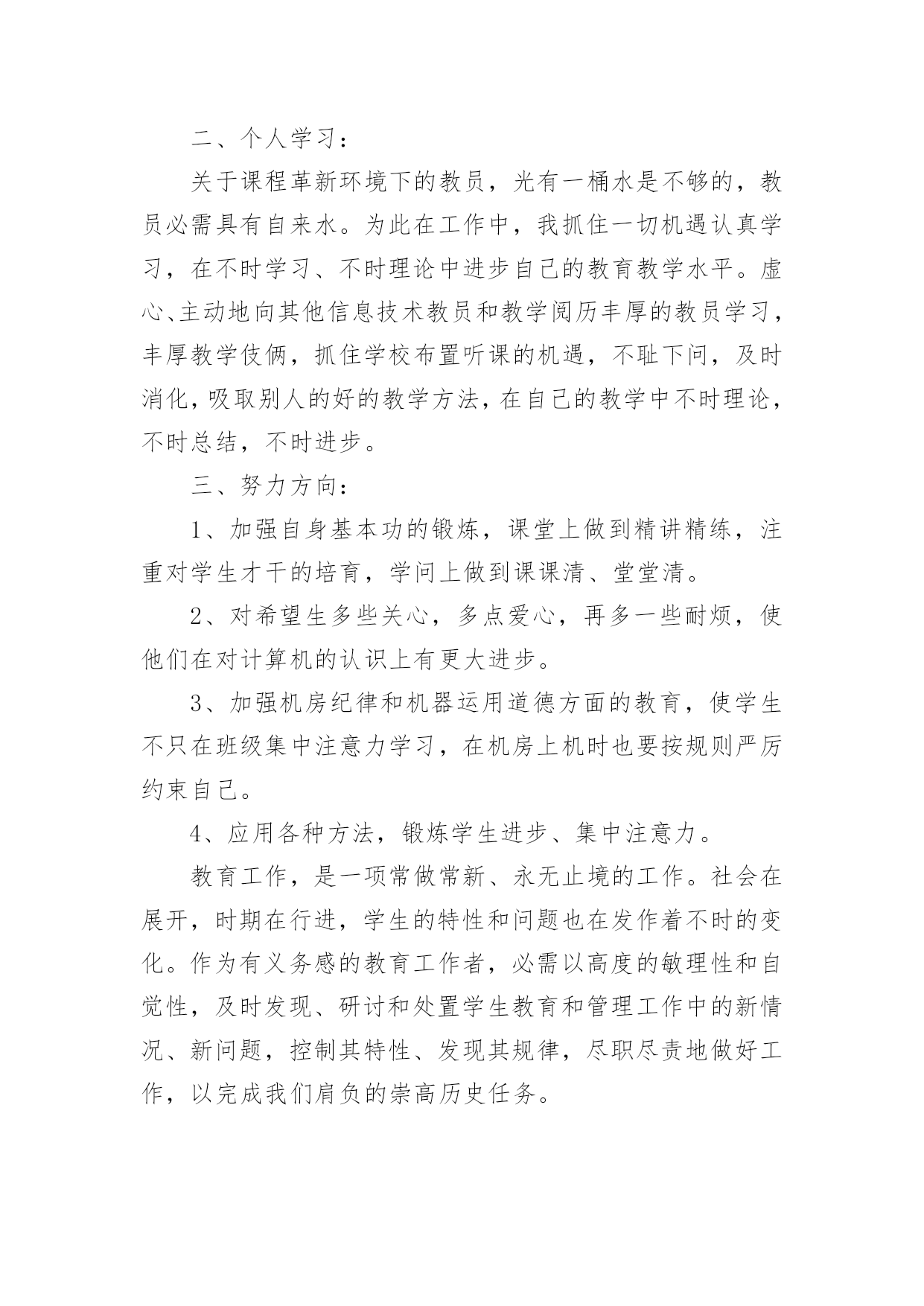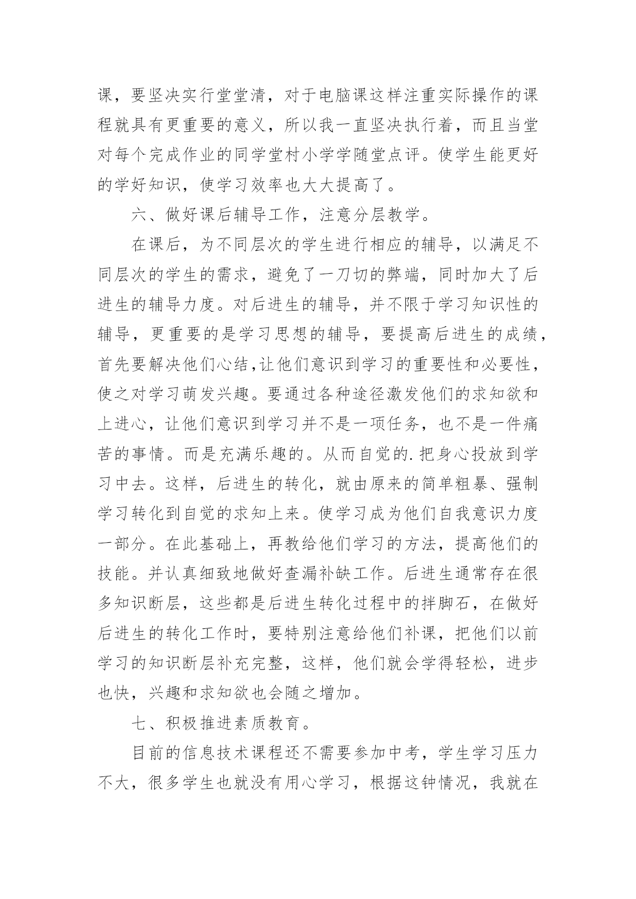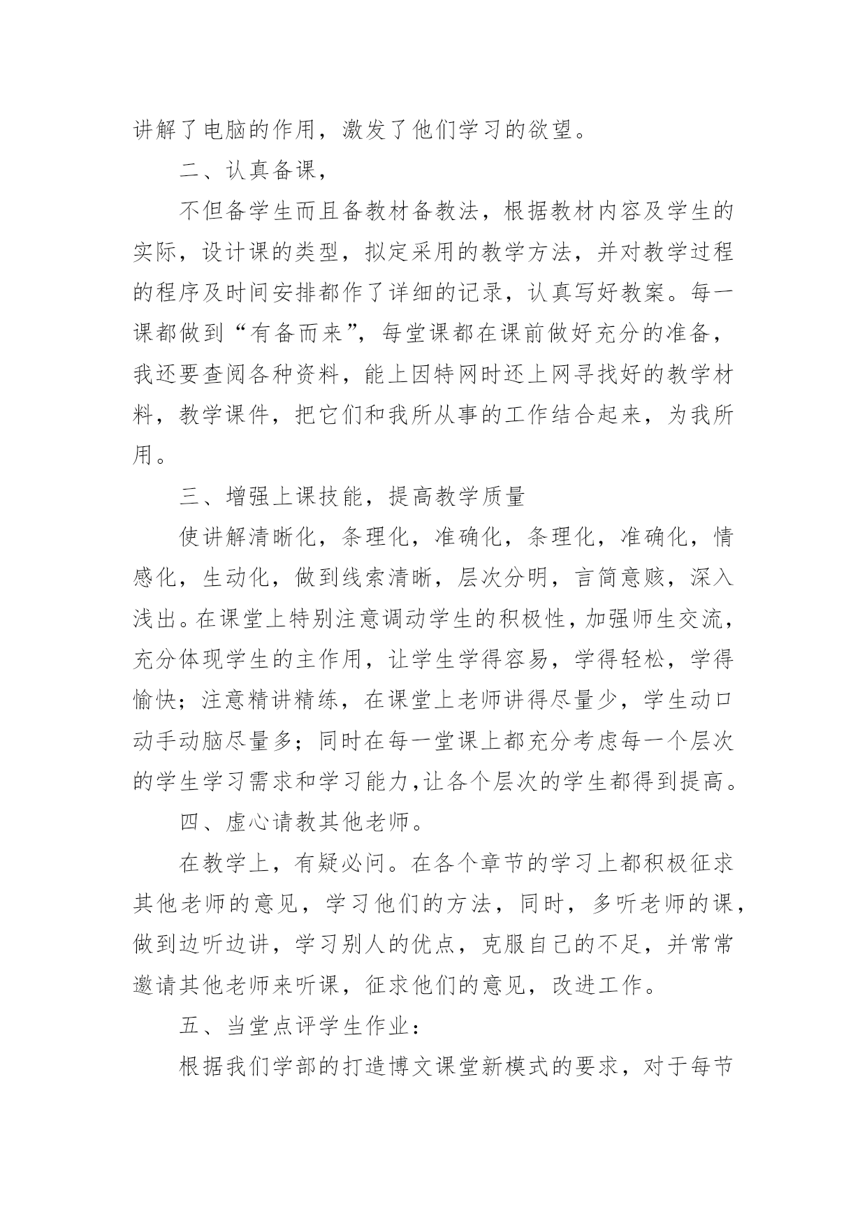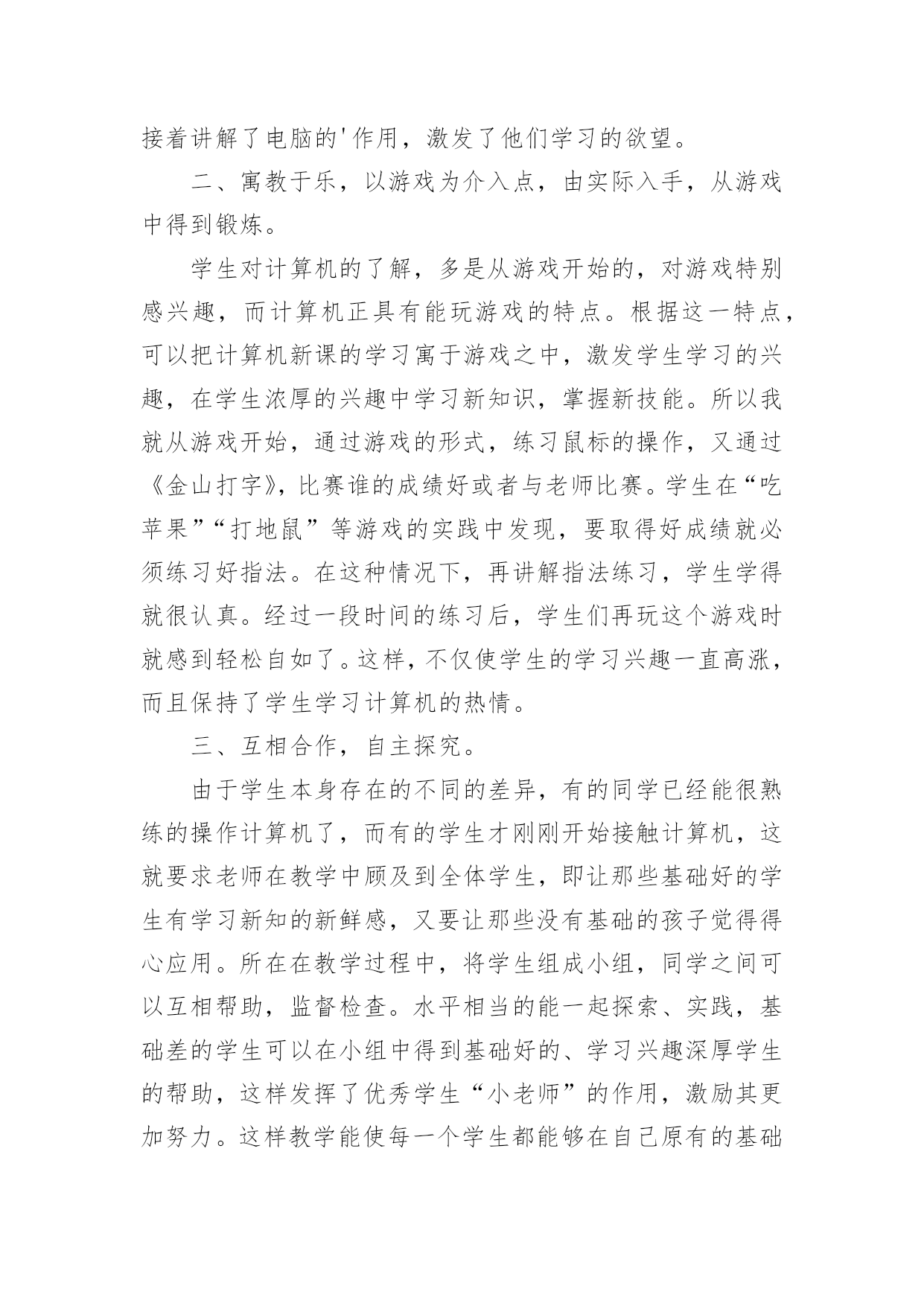 小学4年级信息技术教学工作总结总结是事后对某一阶段的学习或工作情况作加以回顾检查并分析评价的书面材料,它可以促使我们思考,不妨让我们认真地完成总结吧。如何把总结做到重点突出呢?以下是小编收集整理的小学4年级信息技术教学工作总结,希望对大家有所帮助。小学4年级信息技术教学工作总结1立足现在,放眼未来,为使今后的工作取得更大的进步,现对本学期教学工作作出总结,希望能发扬优点,克服不足,总结检验教训,继往开来,以促进教训工作更上一层楼。一、培养学生学习电脑的兴趣。《信息技术》不同于一般的学科,而是一门实践性很强的学科,因此在教学中要以讲为辅,以练为主,以用为目的,使学生在练习中、实践中或“玩”中学会如何使用电脑,改变过去以课堂讲授为主的呆板教学方法,利用《信息技术》课程自身的特点提高学生学习电脑的兴趣。开学时,学生大多数刚接触电脑,对电脑有着一种神秘感,对学习电脑也有着一种极大的兴趣感,作为教师要怎样才能将学生的这种兴趣继续保持下去呢?我上第一节课的时候,先问学生什么是电脑,电脑有什么作用,然后根据书本讲了许多有关电脑方面的科学知识,让他们感到电脑原来是这样一回事,使他们对电脑有了一定的认识,打破了不敢碰电脑的神秘感。接着讲解了电脑的作用,激发了他们学习的欲望。二、认真备课,不但备学生而且备教材备教法,根据教材内容及学生的实际,设计课的类型,拟定采用的教学方法,并对教学过程的程序及时间安排都作了详细的记录,认真写好教案。每一课都做到“有备而来”,每堂课都在课前做好充分的准备,我还要查阅各种资料,能上因特网时还上网寻找好的教学材料,教学课件,把它们和我所从事的工作结合起来,为我所用。三、增强上课技能,提高教学质量使讲解清晰化,条理化,准确化,条理化,准确化,情感化,生动化,做到线索清晰,层次分明,言简意赅,深入浅出。在课堂上特别注意调动学生的积极性,加强师生交流,充分体现学生的主作用,让学生学得容易,学得轻松,学得愉快;注意精讲精练,在课堂上老师讲得尽量少,学生动口动手动脑尽量多;同时在每一堂课上都充分考虑每一个层次的学生学习需求和学习能力,让各个层次的学生都得到提高。四、虚心请教其他老师。在教学上,有疑必问。在各个章节的学习上都积极征求其他老师的意见,学习他们的方法,同时,多听老师的课,做到边听边讲,学习别人的优点,克服自己的不足,并常常邀请其他老师来听课,征求他们的意见,改进工作。五、当堂点评学生作业:根据我们学部的打造博文课堂新模式的要求,对于每节课,要坚决实行堂堂清,对于电脑课这样注重实际操作的课程就具有更重要的意义,所以我一直坚决执行着,而且当堂对每个完成作业的同学堂村小学学随堂点评。使学生能更好的学好知识,使学习效率也大大提高了。六、做好课后辅导工作,注意分层教学。在课后,为不同层次的学生进行相应的辅导,以满足不同层次的学生的需求,避免了一刀切的弊端,同时加大了后进生的辅导力度。对后进生的辅导,并不限于学习知识性的辅导,更重要的是学习思想的辅导,要提高后进生的成绩,首先要解决他们心结,让他们意识到学习的重要性和必要性,使之对学习萌发兴趣。要通过各种途径激发他们的求知欲和上进心,让他们意识到学习并不是一项任务,也不是一件痛苦的事情。而是充满乐趣的。从而自觉的.把身心投放到学习中去。这样,后进生的转化,就由原来的简单粗暴、强制学习转化到自觉的求知上来。使学习成为他们自我意识力度一部分。在此基础上,再教给他们学习的方法,提高他们的技能。并认真细致地做好查漏补缺工作。后进生通常存在很多知识断层,这些都是后进生转化过程中的拌脚石,在做好后进生的转化工作时,要特别注意给他们补课,把他们以前学习的知识断层补充完整,这样,他们就会学得轻松,进步也快,兴趣和求知欲也会随之增加。七、积极推进素质教育。目前的信息技术课程还不需要参加中考,学生学习压力不大,很多学生也就没有用心学习,根据这钟情况,我就在班上积极推进素质教育,让学生多做些作品,多参加一些比赛。八、开展竞技活动,提高学生学习动力本学期教学内容主要是让学生养成学习的习惯,初步学会计算机的使用方法,能够正确掌握指法的击键方法。因为指法的训练是一个长期的过程,其中又是枯燥的,所以有必要开展一些活动以维持学生学习的状态。在教学过程中,我主要采用比赛的方法进行,每过一个阶段进行一次比赛活动,由每小组先进行,然后由组内评出最好的,再由评出的进行互评,通过这些活动,不仅使用枯燥无味的练习变成有趣的活动,而且激发了学生学习的动力,个个都想争着做个打字高手,从而使他们的能力得到了发展。另外,本学期在校内开展了“打字小能手”比赛,通过比赛,提高了学生的竞技水平。经过本学期的学习,学生的电脑操作能力得到了进一步的发展,但也有不足之处,学生的指法准确率有待进一步的提高,这样才能取得更好的成绩。在以后的工