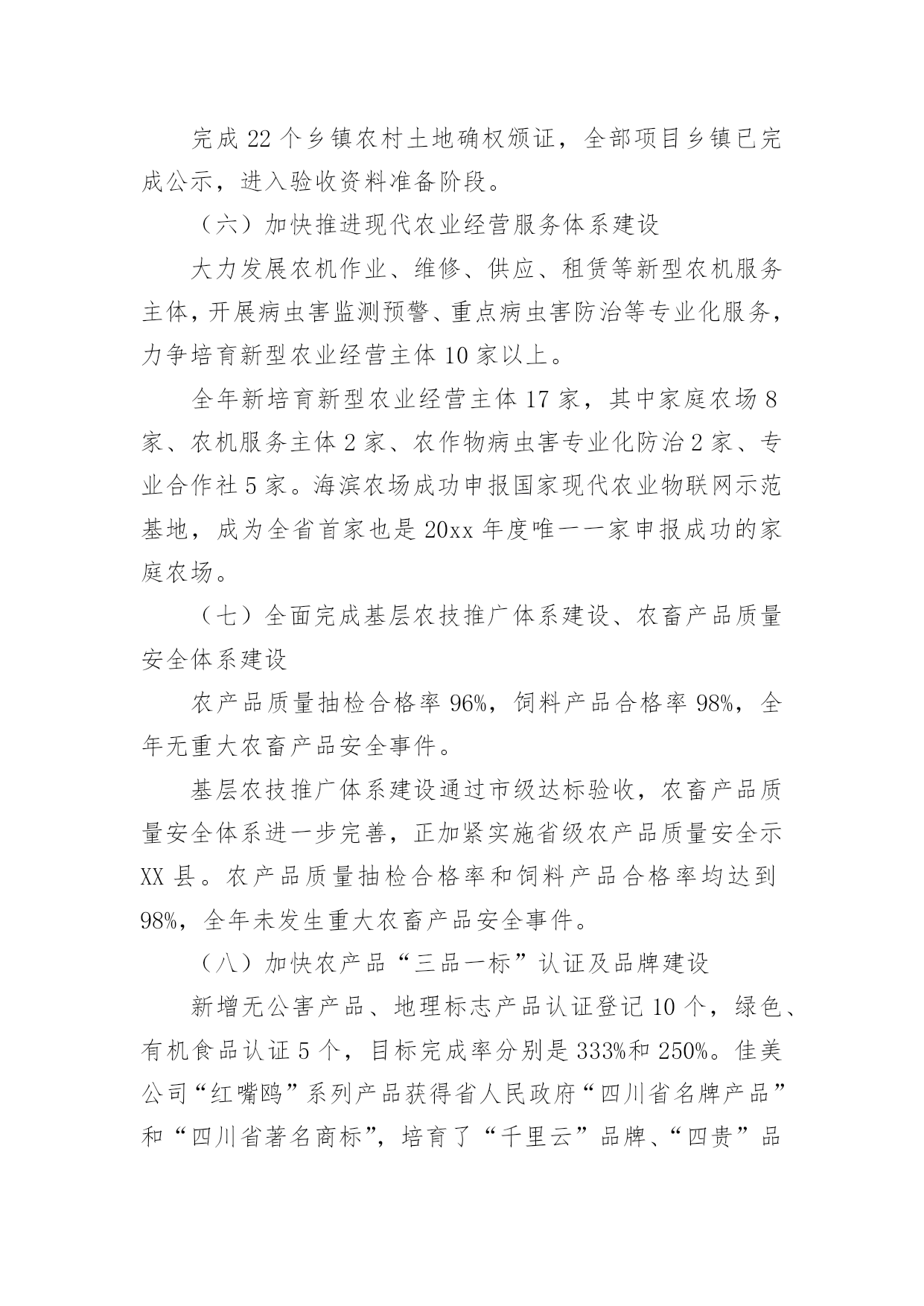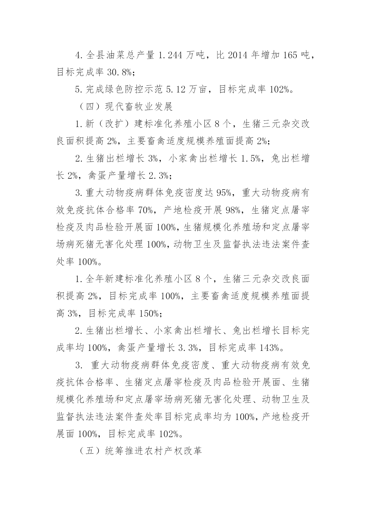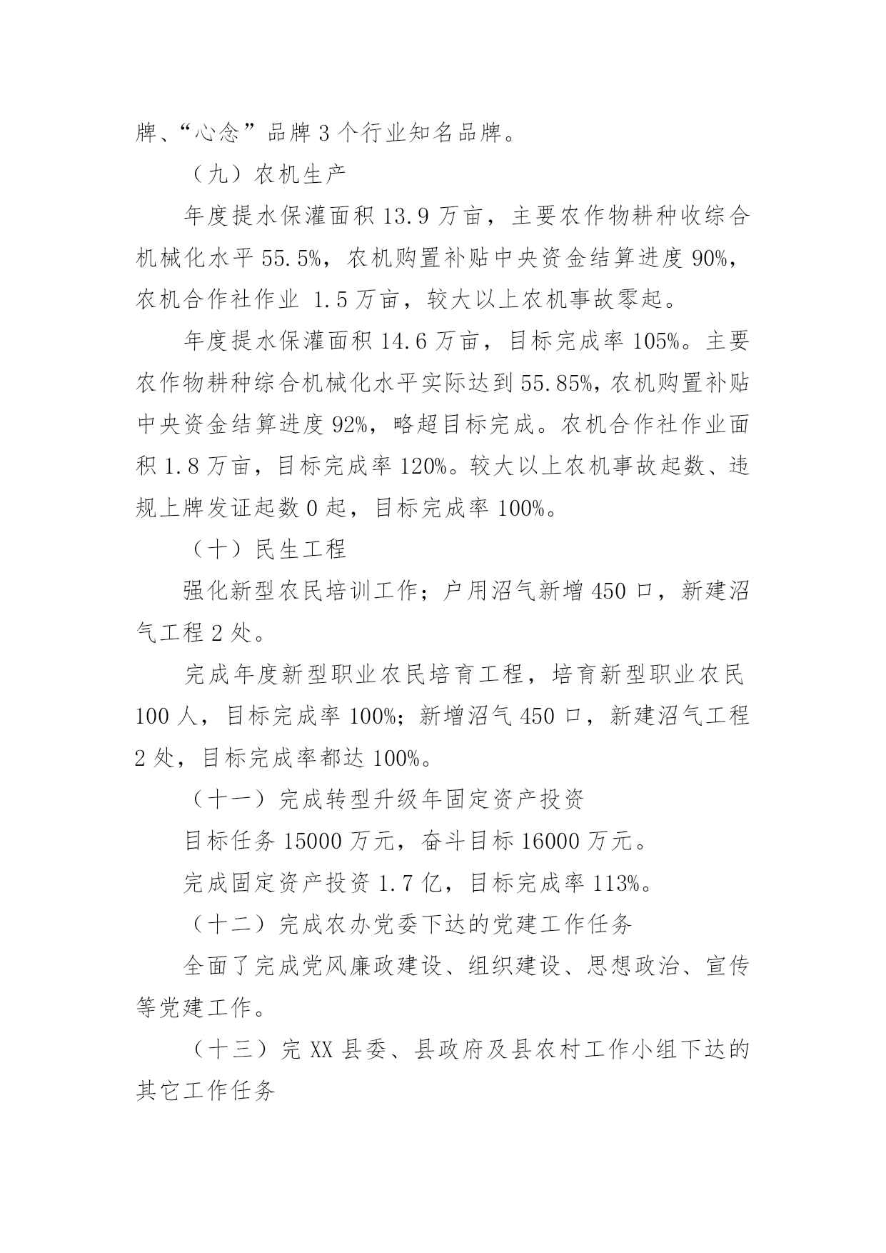 农业工作总结农业工作总结(合集15篇)总结就是对一个时期的学习、工作或其完成情况进行一次全面系统的回顾和分析的书面材料,它可以明确下一步的工作方向,少走弯路,少犯错误,提高工作效益,让我们一起来学习写总结吧。总结怎么写才能发挥它的作用呢?以下是小编为大家收集的农业工作总结,仅供参考,欢迎大家阅读。农业工作总结120xx年,农业局按照县委、县政府部署,签订了《20xx年度“三农”工作目标责任书》。今年,农业局紧紧围绕“转型升级”,认真研究农业发展新常态,全面落实中央、省市县农业农村工作会议精神,奋力推进现代农业和畜牧业重点县建设,强化农业基础设施,抓好产业转型升级,培育打造美丽新村产业,扎实抓好精准扶贫,全力促进农民增收,确保“十二五”的顺利收官与“十三五”的精彩开局。年度目标执行情况如下:一、农业农村经济发展目标责任(一)农牧渔业增加值确保增长3.2%,力争达到3.5%实际实现增加值1.21亿元,总量达到18.78亿元,增幅6.9%。(二)完成省现代农业、现代畜牧业重点县建设任务现代农业和现代畜牧业重点县建设年度任务圆满完成,其中现代畜牧业重点县已通过省级达标验收,现代农业重点县正等待验收。(三)现代农业产业基地建设1.新增粮食520吨,确保总产量10.961吨,建设1个粮经复合区产业基地;2.新建茶园3000亩,改造3000亩,新建1个茶叶万亩亿元示范区;3.新建1个蔬菜万亩示范区,新增蔬菜基地1000亩,改造3000亩;4.巩固和完善油菜产业化基地,新增油菜籽535吨,总产量达到1.281万吨;5.绿色防控示范区面积5万亩。另外:1.全县粮食总产量11.1925万吨,比2014年增加2835吨,增产目标完成率540%;新建成1个粮经复合型产业基地,目标完成率100%;2.新建茶园4000亩,改造4500亩,目标完成率分别是133%和150%,在界牌镇新建成1个茶叶万亩亿元示范区,目标完成率100%;3.在甘霖镇新建成1个蔬菜万亩示范区,目标完成率100%,新增蔬菜基地2000亩,改造5000亩,目标完成率分别是200%和166%;4.全县油菜总产量1.244万吨,比2014年增加165吨,目标完成率30.8%;5.完成绿色防控示范5.12万亩,目标完成率102%。(四)现代畜牧业发展1.新(改扩)建标准化养殖小区8个,生猪三元杂交改良面积提高2%,主要畜禽适度规模养殖面提高2%;2.生猪出栏增长3%,小家禽出栏增长1.5%,兔出栏增长2%,禽蛋产量增长2.3%;3.重大动物疫病群体免疫密度达95%,重大动物疫病有效免疫抗体合格率70%,产地检疫开展98%,生猪定点屠宰检疫及肉品检验开展面100%,生猪规模化养殖场和定点屠宰场病死猪无害化处理100%,动物卫生及监督执法违法案件查处率100%。1.全年新建标准化养殖小区8个,生猪三元杂交改良面积提高2%,目标完成率100%,主要畜禽适度规模养殖面提高3%,目标完成率150%;2.生猪出栏增长、小家禽出栏增长、兔出栏增长目标完成率均100%,禽蛋产量增长3.3%,目标完成率143%。3.重大动物疫病群体免疫密度、重大动物疫病有效免疫抗体合格率、生猪定点屠宰检疫及肉品检验开展面、生猪规模化养殖场和定点屠宰场病死猪无害化处理、动物卫生及监督执法违法案件查处率目标完成率均为100%,产地检疫开展面100%,目标完成率102%。(五)统筹推进农村产权改革完成22个乡镇农村土地确权颁证,全部项目乡镇已完成公示,进入验收资料准备阶段。(六)加快推进现代农业经营服务体系建设大力发展农机作业、维修、供应、租赁等新型农机服务主体,开展病虫害监测预警、重点病虫害防治等专业化服务,力争培育新型农业经营主体10家以上。全年新培育新型农业经营主体17家,其中家庭农场8家、农机服务主体2家、农作物病虫害专业化防治2家、专业合作社5家。海滨农场成功申报国家现代农业物联网示范基地,成为全省首家也是20xx年度唯一一家申报成功的家庭农场。(七)全面完成基层农技推广体系建设、农畜产品质量安全体系建设农产品质量抽检合格率96%,饲料产品合格率98%,全年无重大农畜产品安全事件。基层农技推广体系建设通过市级达标验收,农畜产品质量安全体系进一步完善,正加紧实施省级农产品质量安全示XX县。农产品质量抽检合格率和饲料产品合格率均达到98%,全年未发生重大农畜产品安全事件。(八)加快农产品“三品一标”认证及品牌建设新增无公害产品、地理标志产品认证登记10个,绿色、有机食品认证5个,目标完成率分别是333%和250%。佳美公司“红嘴鸥”系列产品获得省人民政府“四川省名牌产品”和“四川省著名商标”,培育了“千里云”品牌、“四贵”品牌、“心念”品牌3个行业知名品牌。(九)农机生产年度提水保灌面积13.9万亩,主要农作物耕种收综