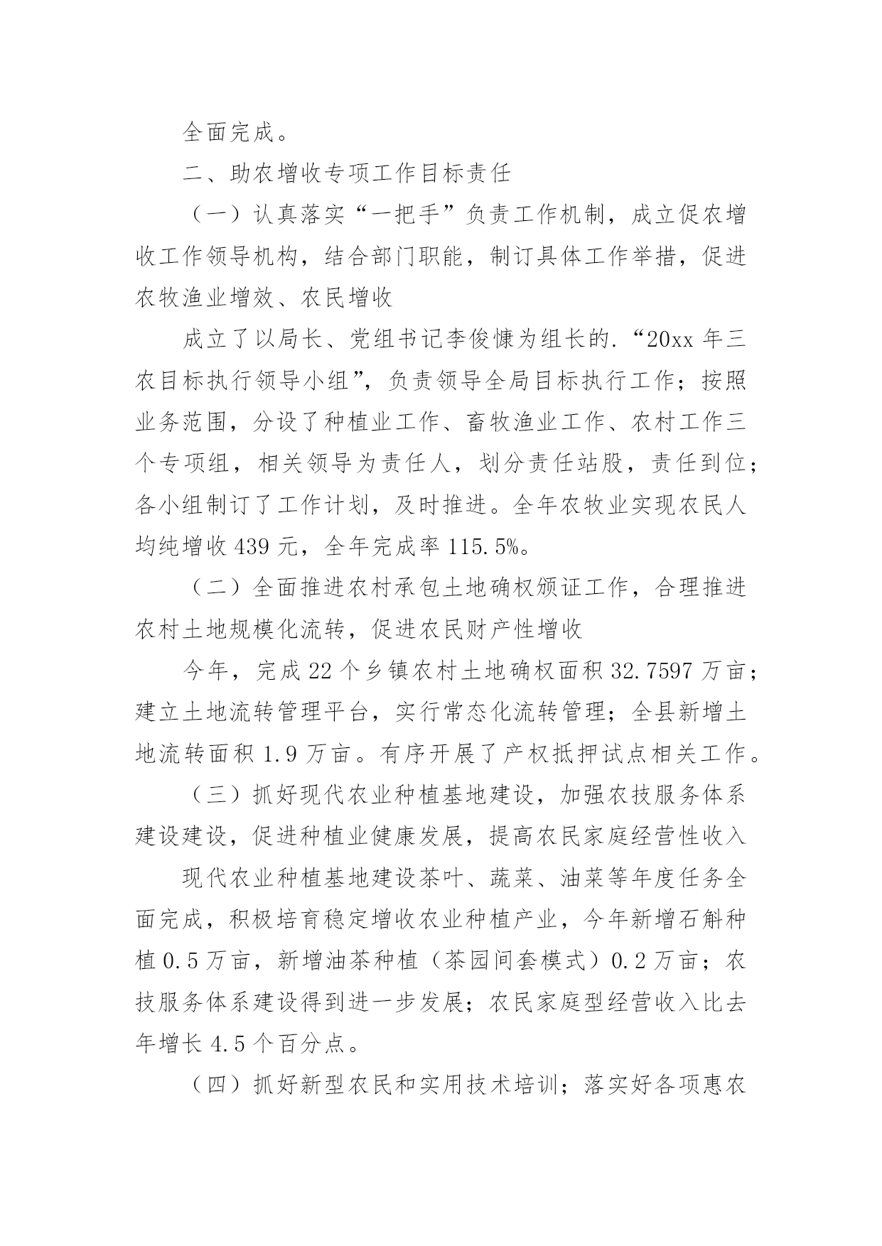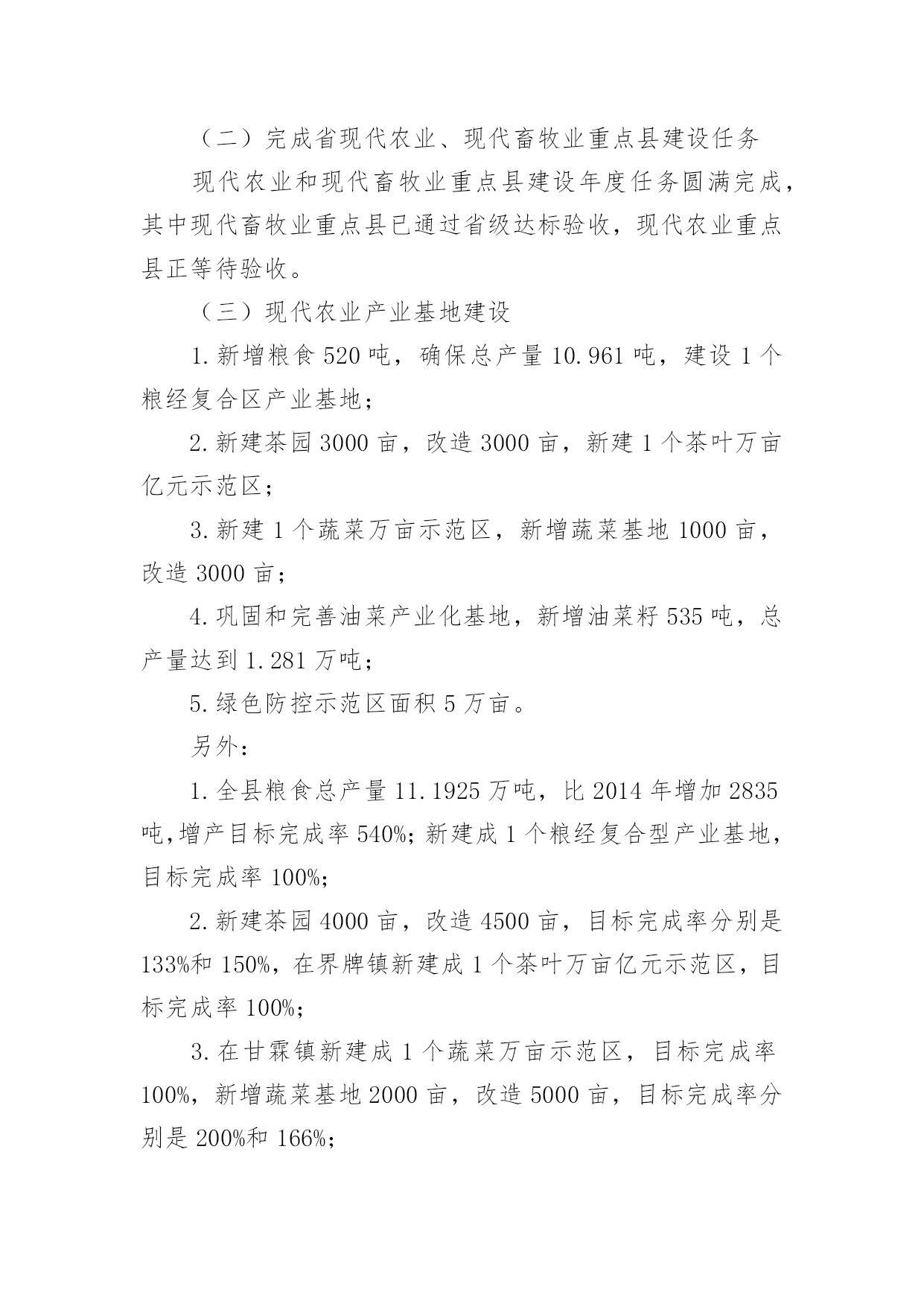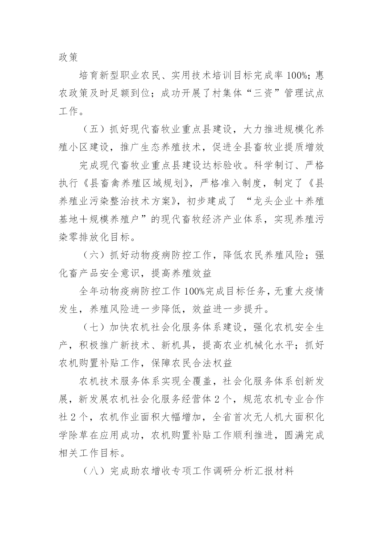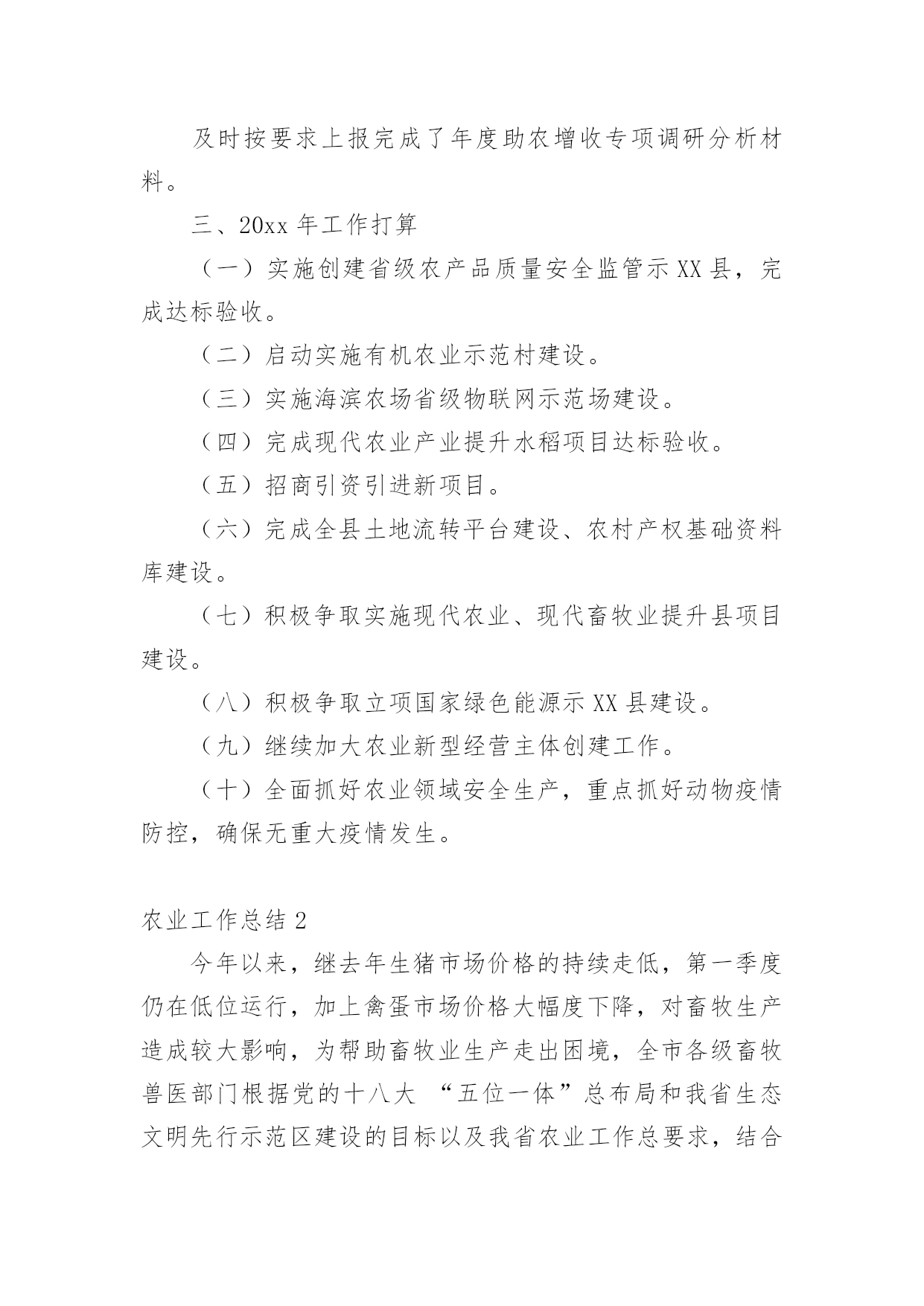 农业工作总结农业工作总结(合集15篇)总结就是对一个时期的学习、工作或其完成情况进行一次全面系统的回顾和分析的书面材料,它可以明确下一步的工作方向,少走弯路,少犯错误,提高工作效益,让我们一起来学习写总结吧。总结怎么写才能发挥它的作用呢?以下是小编为大家收集的农业工作总结,仅供参考,欢迎大家阅读。农业工作总结120xx年,农业局按照县委、县政府部署,签订了《20xx年度“三农”工作目标责任书》。今年,农业局紧紧围绕“转型升级”,认真研究农业发展新常态,全面落实中央、省市县农业农村工作会议精神,奋力推进现代农业和畜牧业重点县建设,强化农业基础设施,抓好产业转型升级,培育打造美丽新村产业,扎实抓好精准扶贫,全力促进农民增收,确保“十二五”的顺利收官与“十三五”的精彩开局。年度目标执行情况如下:一、农业农村经济发展目标责任(一)农牧渔业增加值确保增长3.2%,力争达到3.5%实际实现增加值1.21亿元,总量达到18.78亿元,增幅6.9%。(二)完成省现代农业、现代畜牧业重点县建设任务现代农业和现代畜牧业重点县建设年度任务圆满完成,其中现代畜牧业重点县已通过省级达标验收,现代农业重点县正等待验收。(三)现代农业产业基地建设1.新增粮食520吨,确保总产量10.961吨,建设1个粮经复合区产业基地;2.新建茶园3000亩,改造3000亩,新建1个茶叶万亩亿元示范区;3.新建1个蔬菜万亩示范区,新增蔬菜基地1000亩,改造3000亩;4.巩固和完善油菜产业化基地,新增油菜籽535吨,总产量达到1.281万吨;5.绿色防控示范区面积5万亩。另外:1.全县粮食总产量11.1925万吨,比2014年增加2835吨,增产目标完成率540%;新建成1个粮经复合型产业基地,目标完成率100%;2.新建茶园4000亩,改造4500亩,目标完成率分别是133%和150%,在界牌镇新建成1个茶叶万亩亿元示范区,目标完成率100%;3.在甘霖镇新建成1个蔬菜万亩示范区,目标完成率100%,新增蔬菜基地2000亩,改造5000亩,目标完成率分别是200%和166%;4.全县油菜总产量1.244万吨,比2014年增加165吨,目标完成率30.8%;5.完成绿色防控示范5.12万亩,目标完成率102%。(四)现代畜牧业发展1.新(改扩)建标准化养殖小区8个,生猪三元杂交改良面积提高2%,主要畜禽适度规模养殖面提高2%;2.生猪出栏增长3%,小家禽出栏增长1.5%,兔出栏增长2%,禽蛋产量增长2.3%;3.重大动物疫病群体免疫密度达95%,重大动物疫病有效免疫抗体合格率70%,产地检疫开展98%,生猪定点屠宰检疫及肉品检验开展面100%,生猪规模化养殖场和定点屠宰场病死猪无害化处理100%,动物卫生及监督执法违法案件查处率100%。1.全年新建标准化养殖小区8个,生猪三元杂交改良面积提高2%,目标完成率100%,主要畜禽适度规模养殖面提高3%,目标完成率150%;2.生猪出栏增长、小家禽出栏增长、兔出栏增长目标完成率均100%,禽蛋产量增长3.3%,目标完成率143%。3.重大动物疫病群体免疫密度、重大动物疫病有效免疫抗体合格率、生猪定点屠宰检疫及肉品检验开展面、生猪规模化养殖场和定点屠宰场病死猪无害化处理、动物卫生及监督执法违法案件查处率目标完成率均为100%,产地检疫开展面100%,目标完成率102%。(五)统筹推进农村产权改革完成22个乡镇农村土地确权颁证,全部项目乡镇已完成公示,进入验收资料准备阶段。(六)加快推进现代农业经营服务体系建设大力发展农机作业、维修、供应、租赁等新型农机服务主体,开展病虫害监测预警、重点病虫害防治等专业化服务,力争培育新型农业经营主体10家以上。全年新培育新型农业经营主体17家,其中家庭农场8家、农机服务主体2家、农作物病虫害专业化防治2家、专业合作社5家。海滨农场成功申报国家现代农业物联网示范基地,成为全省首家也是20xx年度唯一一家申报成功的家庭农场。(七)全面完成基层农技推广体系建设、农畜产品质量安全体系建设农产品质量抽检合格率96%,饲料产品合格率98%,全年无重大农畜产品安全事件。基层农技推广体系建设通过市级达标验收,农畜产品质量安全体系进一步完善,正加紧实施省级农产品质量安全示XX县。农产品质量抽检合格率和饲料产品合格率均达到98%,全年未发生重大农畜产品安全事件。(八)加快农产品“三品一标”认证及品牌建设新增无公害产品、地理标志产品认证登记10个,绿色、有机食品认证5个,目标完成率分别是333%和250%。佳美公司“红嘴鸥”系列产品获得省人民政府“四川省名牌产品”和“四川省著名商标”,培育了“千里云”品牌、“四贵”品牌、“心念”品牌3个行业知名品牌。(九)农机生产年度提水保灌面积13.9万亩,主要农作物耕种收综