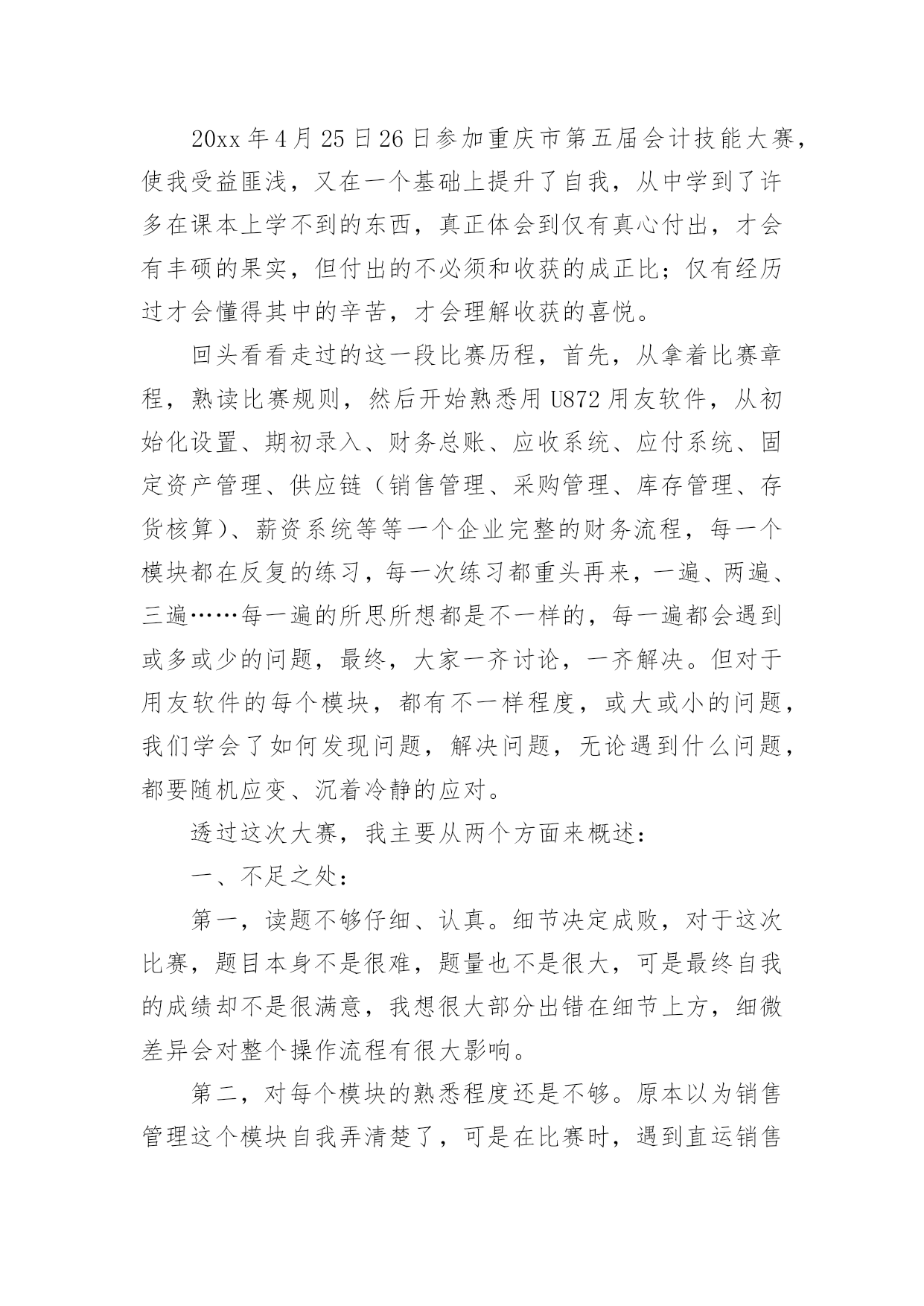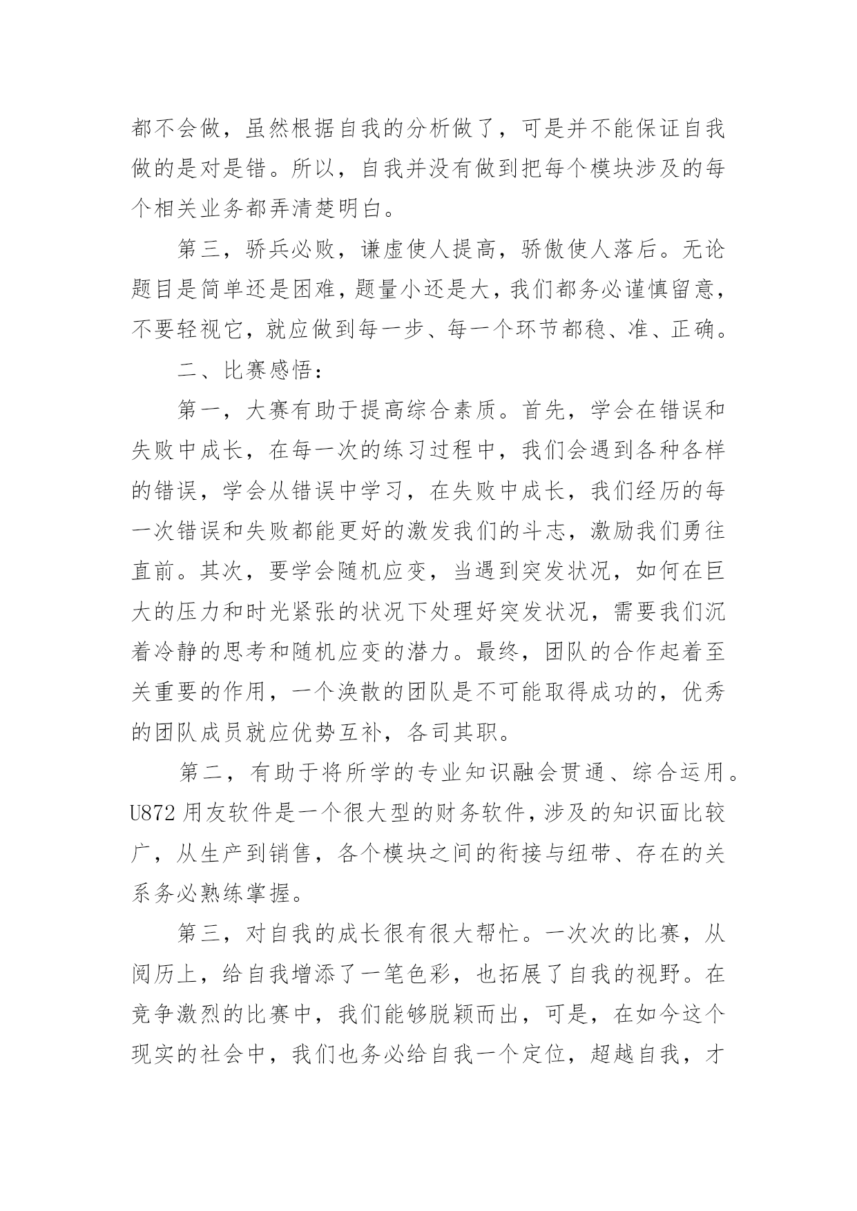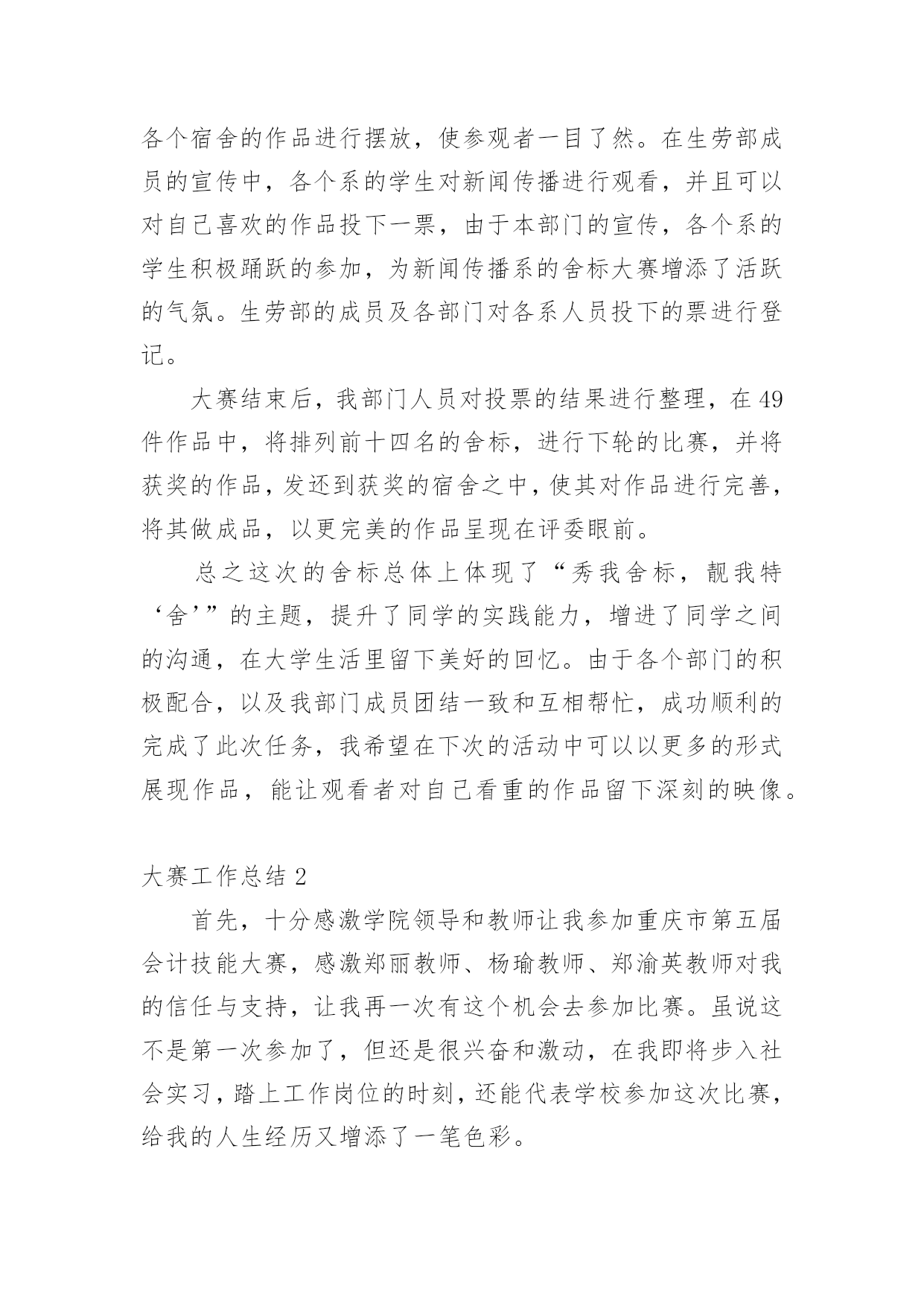 大赛工作总结总结是指社会团体、企业单位和个人在自身的某一时期、某一项目或某些工作告一段落或者全部完成后进行回顾检查、分析评价,从而肯定成绩,得到经验,找出差距,得出教训和一些规律性认识的一种书面材料,通过它可以正确认识以往学习和工作中的优缺点,不妨让我们认真地完成总结吧。如何把总结做到重点突出呢?以下是小编为大家整理的大赛工作总结,仅供参考,大家一起来看看吧。大赛工作总结1“舍标创意大赛”是为丰富校园生活,创造良好的宿舍文化氛围,增进同学之间的友谊。宿舍的精彩照亮你我的心灵。每个宿舍都应有自己的特色,为此目的,由系生劳部策划,在学生会的支持下,新闻系的生劳部与xx年11月22日成功举办了以“秀我舍标,靓我特‘舍’”为主题的第一轮舍标大赛活动。在大赛开展之前,生劳部门成员通知新闻传播系的各舍长,让大家了解整个比赛情况,让大家有足够充分的时间进行准备,展示舍标最完美的一面,再以海报的形式进行全面的宣传,使其影响范围扩大。各宿舍的舍标并在二十号晚上上交到各班生劳部的负责人手中,到二十一号全部上交到总负责人手中,将其进行分类。在11月22日大赛期间,本部门的成员及其他部门,对各个宿舍的作品进行摆放,使参观者一目了然。在生劳部成员的宣传中,各个系的学生对新闻传播进行观看,并且可以对自己喜欢的作品投下一票,由于本部门的宣传,各个系的学生积极踊跃的参加,为新闻传播系的舍标大赛增添了活跃的气氛。生劳部的成员及各部门对各系人员投下的票进行登记。大赛结束后,我部门人员对投票的结果进行整理,在49件作品中,将排列前十四名的舍标,进行下轮的比赛,并将获奖的作品,发还到获奖的宿舍之中,使其对作品进行完善,将其做成品,以更完美的作品呈现在评委眼前。总之这次的舍标总体上体现了“秀我舍标,靓我特‘舍’”的主题,提升了同学的实践能力,增进了同学之间的沟通,在大学生活里留下美好的回忆。由于各个部门的积极配合,以及我部门成员团结一致和互相帮忙,成功顺利的完成了此次任务,我希望在下次的活动中可以以更多的形式展现作品,能让观看者对自己看重的作品留下深刻的映像。大赛工作总结2首先,十分感激学院领导和教师让我参加重庆市第五届会计技能大赛,感激郑丽教师、杨瑜教师、郑渝英教师对我的信任与支持,让我再一次有这个机会去参加比赛。虽说这不是第一次参加了,但还是很兴奋和激动,在我即将步入社会实习,踏上工作岗位的时刻,还能代表学校参加这次比赛,给我的人生经历又增添了一笔色彩。20xx年4月25日26日参加重庆市第五届会计技能大赛,使我受益匪浅,又在一个基础上提升了自我,从中学到了许多在课本上学不到的东西,真正体会到仅有真心付出,才会有丰硕的果实,但付出的不必须和收获的成正比;仅有经历过才会懂得其中的辛苦,才会理解收获的喜悦。回头看看走过的这一段比赛历程,首先,从拿着比赛章程,熟读比赛规则,然后开始熟悉用U872用友软件,从初始化设置、期初录入、财务总账、应收系统、应付系统、固定资产管理、供应链(销售管理、采购管理、库存管理、存货核算)、薪资系统等等一个企业完整的财务流程,每一个模块都在反复的练习,每一次练习都重头再来,一遍、两遍、三遍……每一遍的所思所想都是不一样的,每一遍都会遇到或多或少的问题,最终,大家一齐讨论,一齐解决。但对于用友软件的每个模块,都有不一样程度,或大或小的问题,我们学会了如何发现问题,解决问题,无论遇到什么问题,都要随机应变、沉着冷静的应对。透过这次大赛,我主要从两个方面来概述:一、不足之处:第一,读题不够仔细、认真。细节决定成败,对于这次比赛,题目本身不是很难,题量也不是很大,可是最终自我的成绩却不是很满意,我想很大部分出错在细节上方,细微差异会对整个操作流程有很大影响。第二,对每个模块的熟悉程度还是不够。原本以为销售管理这个模块自我弄清楚了,可是在比赛时,遇到直运销售都不会做,虽然根据自我的分析做了,可是并不能保证自我做的是对是错。所以,自我并没有做到把每个模块涉及的每个相关业务都弄清楚明白。第三,骄兵必败,谦虚使人提高,骄傲使人落后。无论题目是简单还是困难,题量小还是大,我们都务必谨慎留意,不要轻视它,就应做到每一步、每一个环节都稳、准、正确。二、比赛感悟:第一,大赛有助于提高综合素质。首先,学会在错误和失败中成长,在每一次的练习过程中,我们会遇到各种各样的错误,学会从错误中学习,在失败中成长,我们经历的每一次错误和失败都能更好的激发我们的斗志,激励我们勇往直前。其次,要学会随机应变,当遇到突发状况,如何在巨大的压力和时光紧张的状况下处理好突发状况,需要我们沉着冷静的思考和随机应变的潜力。最终,团队的合作起着至关重要的作用,一个涣散的团队是不可能取得成功的,优秀的团队成员就应优势互补,各司其职。第二,有助于将所学的专业知识融会贯通、综合运用。U872用友