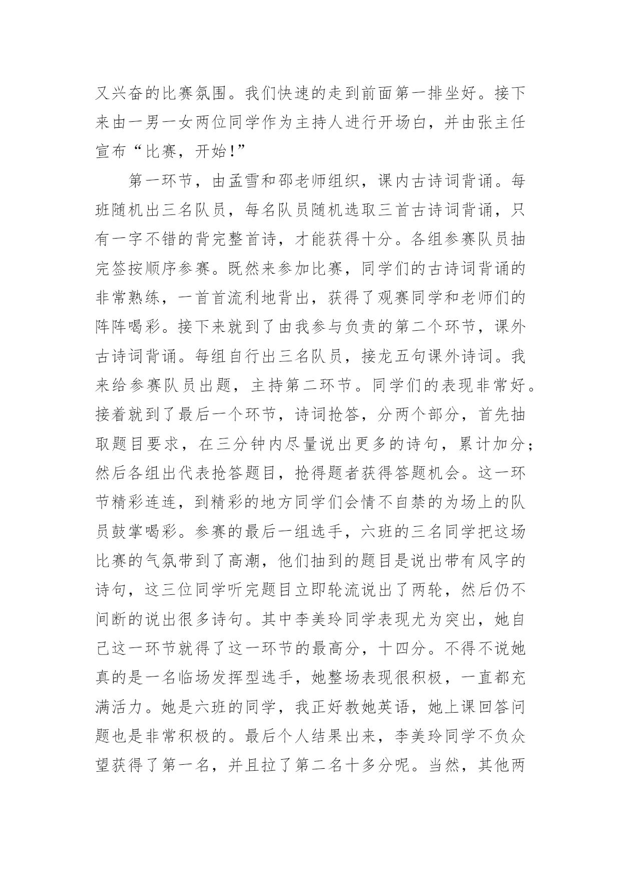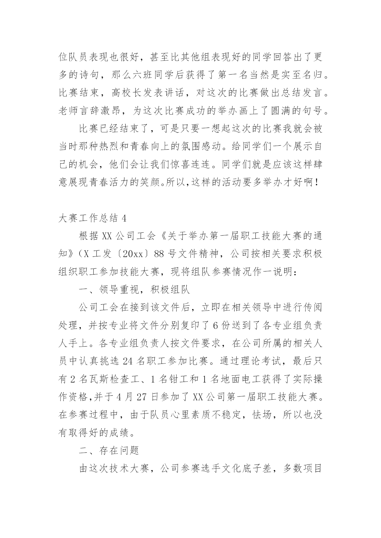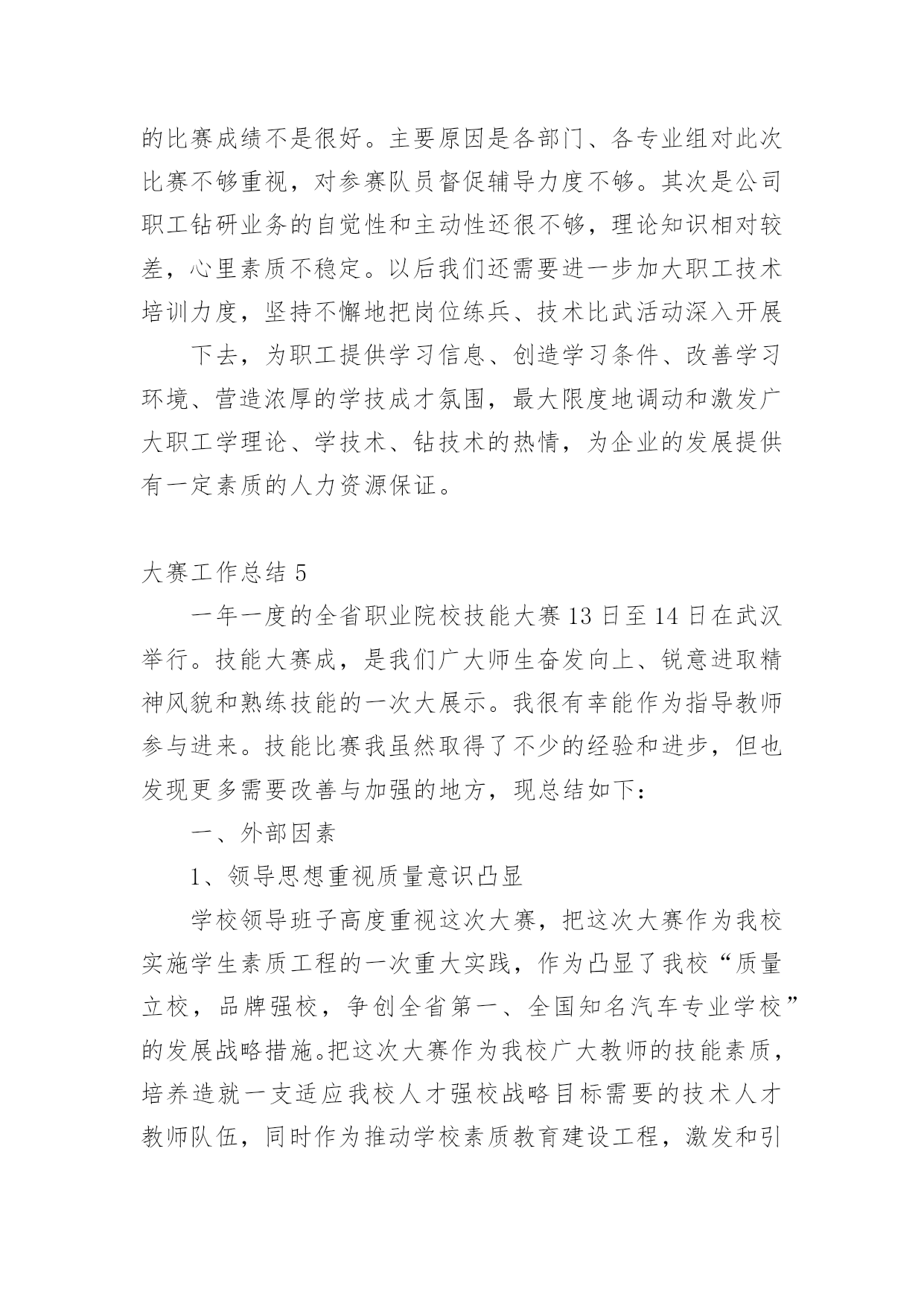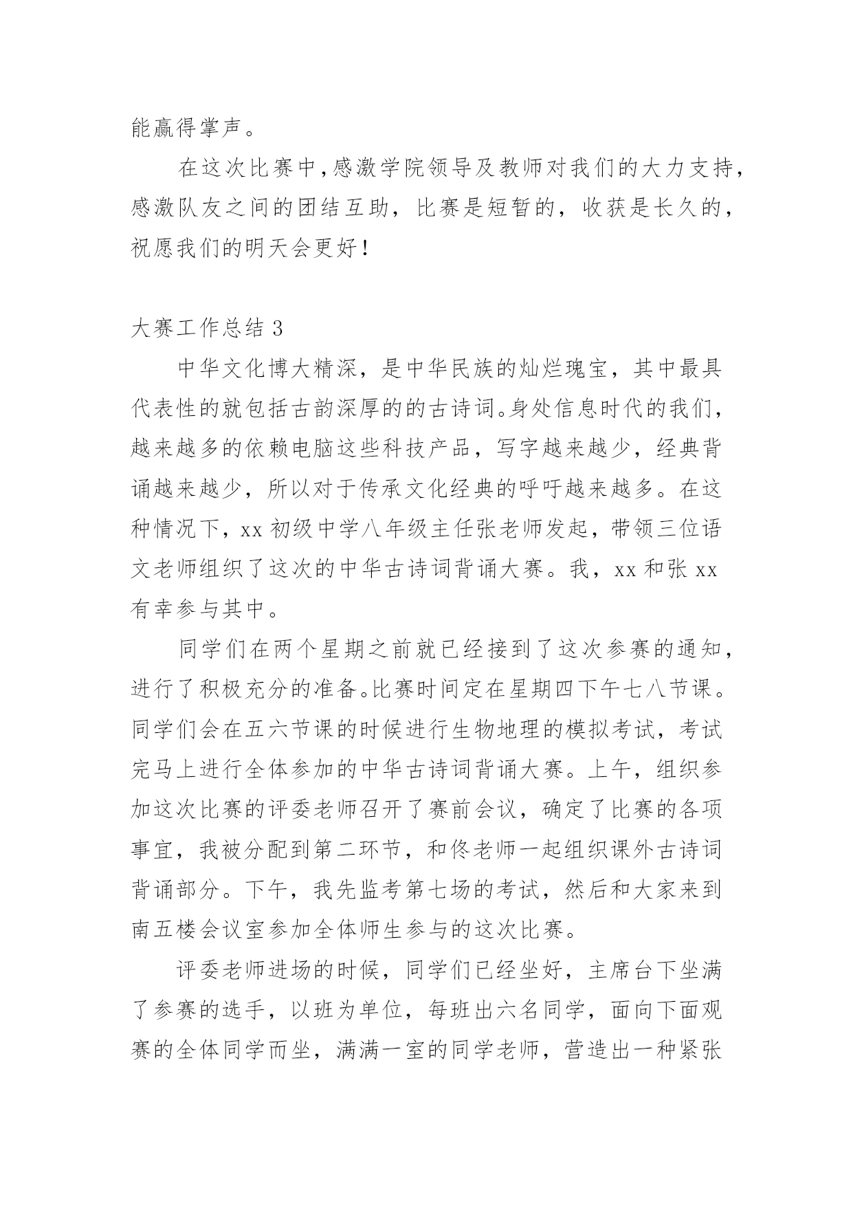 大赛工作总结总结是指社会团体、企业单位和个人在自身的某一时期、某一项目或某些工作告一段落或者全部完成后进行回顾检查、分析评价,从而肯定成绩,得到经验,找出差距,得出教训和一些规律性认识的一种书面材料,通过它可以正确认识以往学习和工作中的优缺点,不妨让我们认真地完成总结吧。如何把总结做到重点突出呢?以下是小编为大家整理的大赛工作总结,仅供参考,大家一起来看看吧。大赛工作总结1“舍标创意大赛”是为丰富校园生活,创造良好的宿舍文化氛围,增进同学之间的友谊。宿舍的精彩照亮你我的心灵。每个宿舍都应有自己的特色,为此目的,由系生劳部策划,在学生会的支持下,新闻系的生劳部与xx年11月22日成功举办了以“秀我舍标,靓我特‘舍’”为主题的第一轮舍标大赛活动。在大赛开展之前,生劳部门成员通知新闻传播系的各舍长,让大家了解整个比赛情况,让大家有足够充分的时间进行准备,展示舍标最完美的一面,再以海报的形式进行全面的宣传,使其影响范围扩大。各宿舍的舍标并在二十号晚上上交到各班生劳部的负责人手中,到二十一号全部上交到总负责人手中,将其进行分类。在11月22日大赛期间,本部门的成员及其他部门,对各个宿舍的作品进行摆放,使参观者一目了然。在生劳部成员的宣传中,各个系的学生对新闻传播进行观看,并且可以对自己喜欢的作品投下一票,由于本部门的宣传,各个系的学生积极踊跃的参加,为新闻传播系的舍标大赛增添了活跃的气氛。生劳部的成员及各部门对各系人员投下的票进行登记。大赛结束后,我部门人员对投票的结果进行整理,在49件作品中,将排列前十四名的舍标,进行下轮的比赛,并将获奖的作品,发还到获奖的宿舍之中,使其对作品进行完善,将其做成品,以更完美的作品呈现在评委眼前。总之这次的舍标总体上体现了“秀我舍标,靓我特‘舍’”的主题,提升了同学的实践能力,增进了同学之间的沟通,在大学生活里留下美好的回忆。由于各个部门的积极配合,以及我部门成员团结一致和互相帮忙,成功顺利的完成了此次任务,我希望在下次的活动中可以以更多的形式展现作品,能让观看者对自己看重的作品留下深刻的映像。大赛工作总结2首先,十分感激学院领导和教师让我参加重庆市第五届会计技能大赛,感激郑丽教师、杨瑜教师、郑渝英教师对我的信任与支持,让我再一次有这个机会去参加比赛。虽说这不是第一次参加了,但还是很兴奋和激动,在我即将步入社会实习,踏上工作岗位的时刻,还能代表学校参加这次比赛,给我的人生经历又增添了一笔色彩。20xx年4月25日26日参加重庆市第五届会计技能大赛,使我受益匪浅,又在一个基础上提升了自我,从中学到了许多在课本上学不到的东西,真正体会到仅有真心付出,才会有丰硕的果实,但付出的不必须和收获的成正比;仅有经历过才会懂得其中的辛苦,才会理解收获的喜悦。回头看看走过的这一段比赛历程,首先,从拿着比赛章程,熟读比赛规则,然后开始熟悉用U872用友软件,从初始化设置、期初录入、财务总账、应收系统、应付系统、固定资产管理、供应链(销售管理、采购管理、库存管理、存货核算)、薪资系统等等一个企业完整的财务流程,每一个模块都在反复的练习,每一次练习都重头再来,一遍、两遍、三遍……每一遍的所思所想都是不一样的,每一遍都会遇到或多或少的问题,最终,大家一齐讨论,一齐解决。但对于用友软件的每个模块,都有不一样程度,或大或小的问题,我们学会了如何发现问题,解决问题,无论遇到什么问题,都要随机应变、沉着冷静的应对。透过这次大赛,我主要从两个方面来概述:一、不足之处:第一,读题不够仔细、认真。细节决定成败,对于这次比赛,题目本身不是很难,题量也不是很大,可是最终自我的成绩却不是很满意,我想很大部分出错在细节上方,细微差异会对整个操作流程有很大影响。第二,对每个模块的熟悉程度还是不够。原本以为销售管理这个模块自我弄清楚了,可是在比赛时,遇到直运销售都不会做,虽然根据自我的分析做了,可是并不能保证自我做的是对是错。所以,自我并没有做到把每个模块涉及的每个相关业务都弄清楚明白。第三,骄兵必败,谦虚使人提高,骄傲使人落后。无论题目是简单还是困难,题量小还是大,我们都务必谨慎留意,不要轻视它,就应做到每一步、每一个环节都稳、准、正确。二、比赛感悟:第一,大赛有助于提高综合素质。首先,学会在错误和失败中成长,在每一次的练习过程中,我们会遇到各种各样的错误,学会从错误中学习,在失败中成长,我们经历的每一次错误和失败都能更好的激发我们的斗志,激励我们勇往直前。其次,要学会随机应变,当遇到突发状况,如何在巨大的压力和时光紧张的状况下处理好突发状况,需要我们沉着冷静的思考和随机应变的潜力。最终,团队的合作起着至关重要的作用,一个涣散的团队是不可能取得成功的,优秀的团队成员就应优势互补,各司其职。第二,有助于将所学的专业知识融会贯通、综合运用。U872用友