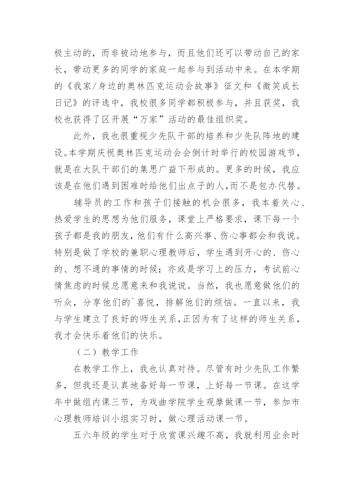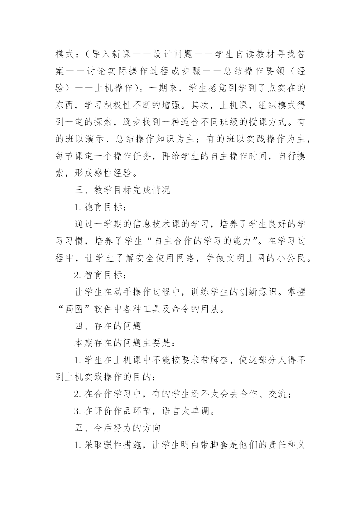 第二学期信息技术教学工作总结总结是指社会团体、企业单位和个人在自身的某一时期、某一项目或某些工作告一段落或者全部完成后进行回顾检查、分析评价,从而肯定成绩,得到经验,找出差距,得出教训和一些规律性认识的一种书面材料,它可以给我们下一阶段的学习和工作生活做指导,是时候写一份总结了。你想知道总结怎么写吗?以下是小编精心整理的第二学期信息技术教学工作总结,仅供参考,大家一起来看看吧。第二学期信息技术教学工作总结1一、教学工作任务本学期承担三年级6个班的信息技术课和四年级3个班的综合实践课教学任务。根据学校的实际条件情况进行教学,主要完成了与课程内容相密切的课本知识教学,如三年级的Windows窗口操作,画图软件中各种工具及命令的使用;综合实践课中让学生了解新疆的地理特征,有哪些物产、特产,动手制作等内容。二、教学目标完成情况1.德育目标:通过一学期的信息技术课的学习,培养了学生良好的学习习惯,培养了学生“自主合作的学习的能力”。在学习过程中,让学生了解安全使用网络,争做文明上网的小公民。2.智育目标:让学生在动手操作过程中,训练学生的创新意识。掌握“画图”软件中各种工具及命令的用法。三、主要教学成绩及经验信息技术课的动手实践操作技术指导这方面取得很大的收获。这主要是注重了教材的钻研,教法的合理利用。教师对教材认真的领会,教材上提示到的操作步骤教师本人先反复的操作,然后再对学生讲解。这方面具体是这样做的:在上机课教学中尽量做到精讲,把理论知识溶缩,一些很抽象的理论把它转变成一些操作性很清楚的操作步骤或师演示操作方法;把理论知识的讲解与实际操作联系起来,尤其是把自己的实践操作得出的经验结合起来,注重实际经验的传授,而且教学时采用激励性的语言来调动学生的学习积极性,把一些干干疤疤的理论讲得很有生色。教法上:注重学生的自学能力的培养。采用这样的教学模式:(导入新课——设计问题——学生自读教材寻找答案——讨论实际操作过程或步骤——总结操作要领(经验)——上机操作)。一期来,学生感觉到学到了点实在的东西,学习积极性不断的增强。其次,上机课,组织模式得到一定的探索,逐步找到一种适合不同班级的授课方式。有的班以演示、总结操作知识为主;有的班以实践操作为主,每节课定一个操作任务,再给学生的自主操作时间,自行摸索,形成感性经验。四、存在的问题本期存在的问题主要是:1.学生在上机课中不能按要求带脚套,使这部分人得不到上机实践操作的目的;2.在合作学习中,有的学生还不太会去合作、交流;3.在评价作品环节,语言太单调。五、今后努力的方向1.采取强性措施,让学生明白带脚套是他们的责任和义务和带脚套的作用;2.还需要继续培养学生的合作方法,交流问题的技巧;3.在评价作品方面,还需要提高自己的评价多元化。第二学期信息技术教学工作总结2本学期教学内容为Photoshop电脑艺术设计,承接上学期的学习内容。原计划讲授完Ps工具箱、路径面板、调整命令与滤镜。结合实际,完成抠图专题、调色专题,并完成书籍装帧设计任务。在实际教学实施过程中,由于不断进行调整。最终部分内容进行删改,删节书籍装帧设计中光盘设计、作品展示竞标环节。添加了寸照修复与排版专题、Ps小挑战。一、本学期实际实施的教学内容如下:模块一:书籍装帧设计。细分:书签设计(1个课时)、摄影构图与素材获取(1个课时)、封面封底文件设置(1个课时)、封面设计(3个课时,其中2个课时为操作实践课)模块二:文字创意设计——矢量工作组的使用。细分:形状工具的使用与路径(1个课时)、文字创意设计——文字图层转形状图层并创意修饰(2个课时)、四季花海——剪贴蒙版(1个课时)、念亲恩——钢笔工具与路径控制文字排版(1个课时)、电脑桌面设计——路径转为选区(1个课时)、绘制念珠——路径描边(1个课时)模块三:寸照制作。细分:祛痘与美白(1个课时)、照片换底色(1个课时)、裁切与排版(1个课时)、实践(1个课时,学生利用课后提交作业)模块四:Ps小挑战。总共2个课时,学生下载素材,按照要求逐关挑战,完成任务举手示意,当堂给分。二、学期主要考核为:期中考试作品(书籍装帧设计,要求完成封面设计,配套光盘等设计作为附加分)+期末考试作品(寸照的处理与排版)+平时成绩三、本学期的教学成果主要有:1.总的来说,本学期课程内容充实,实用性强。根据学生提交的作品看,内容掌握的程度总体良好:期中期末作品基本全数提交,优秀作品占作品总数10%左右;平时作品提交数目在48份左右(每个班级平均人数为72人,机房平均60台电脑能用)。2.在教学实施过程中,我们本着积累校本课程资源的想法,完成课程任务的同时积累了一系列的课件、积件、案例素材。主要完成的课件有:书籍装帧设计课程中《封面尺寸设置》课件;《文字创意设计——Photoshop矢量工作组的使用》课件