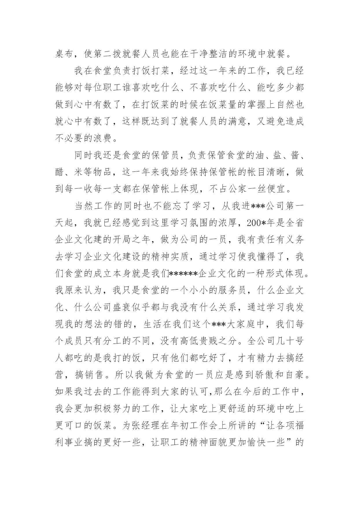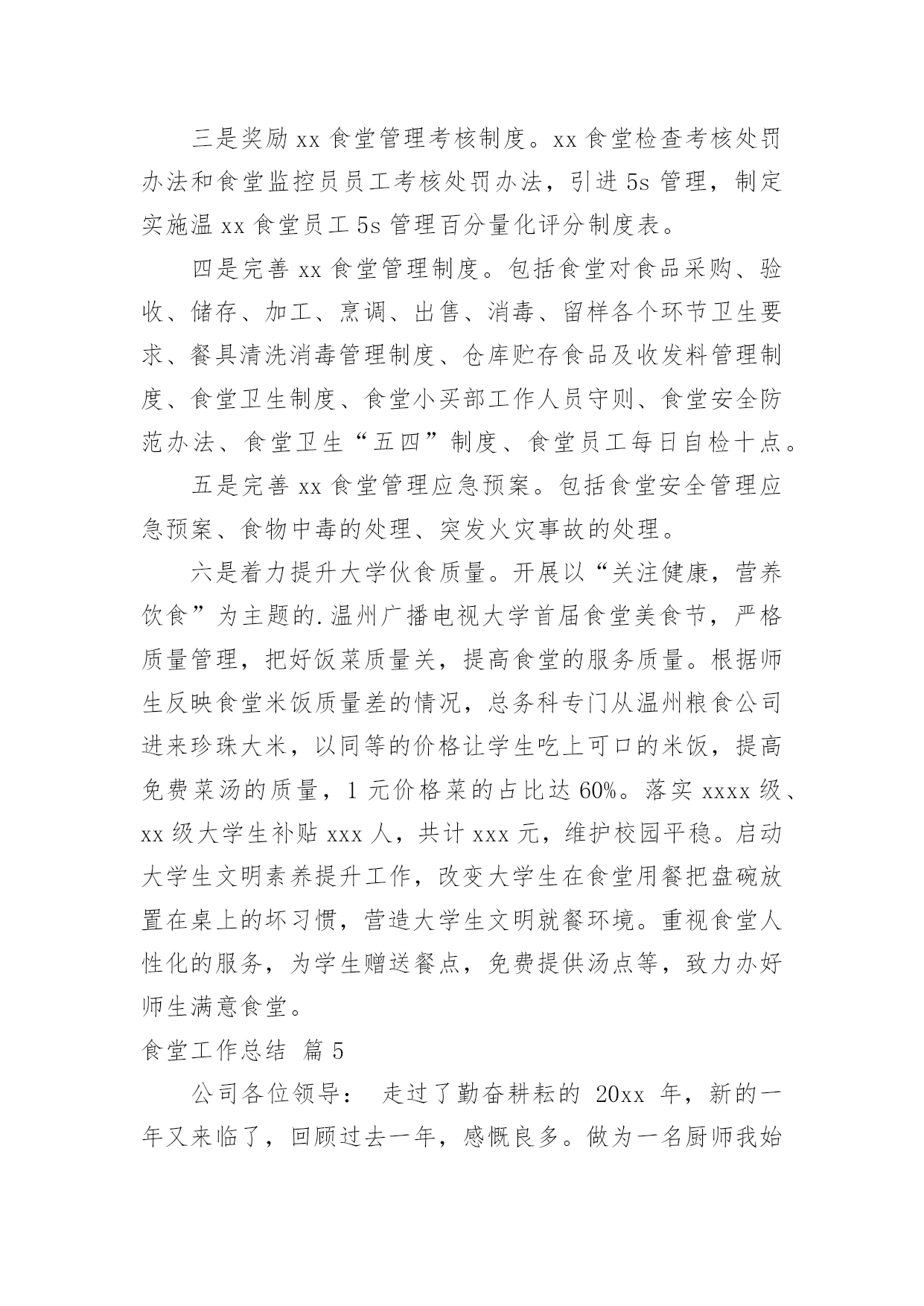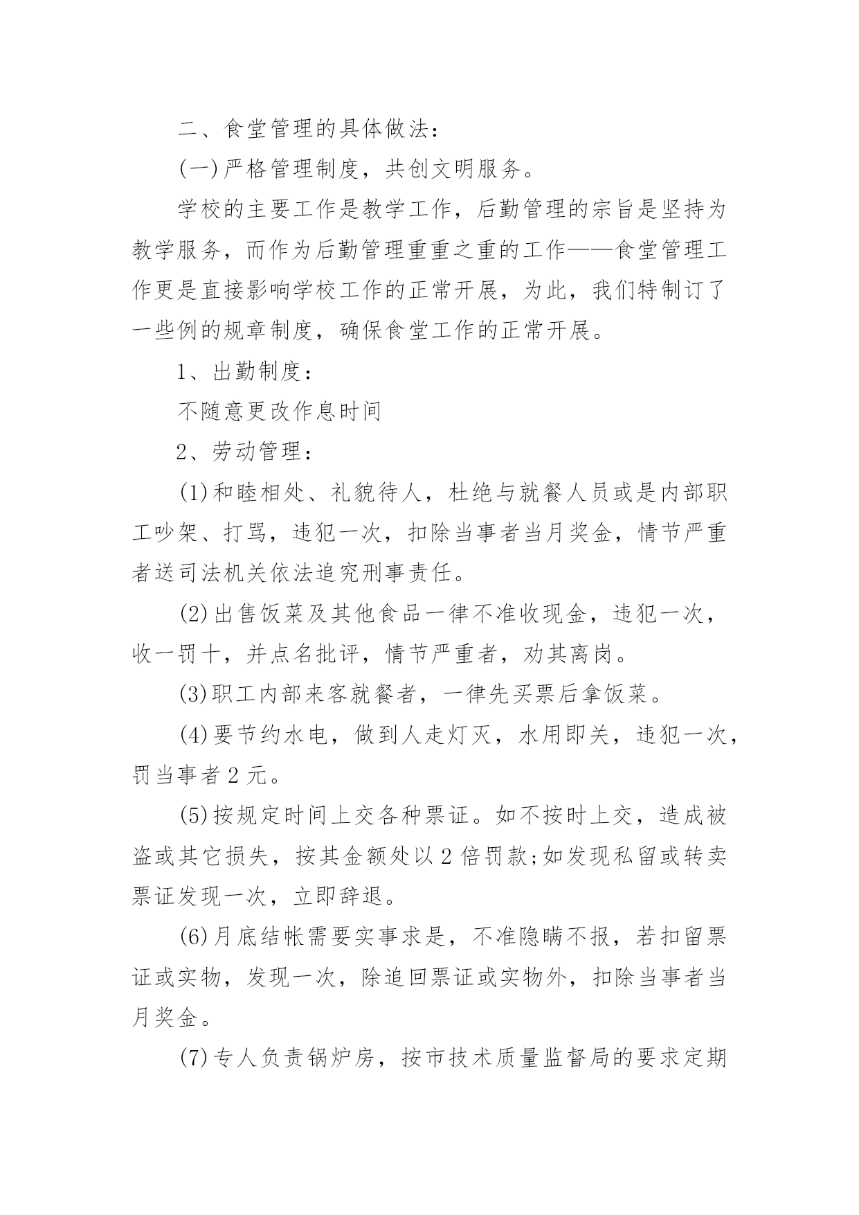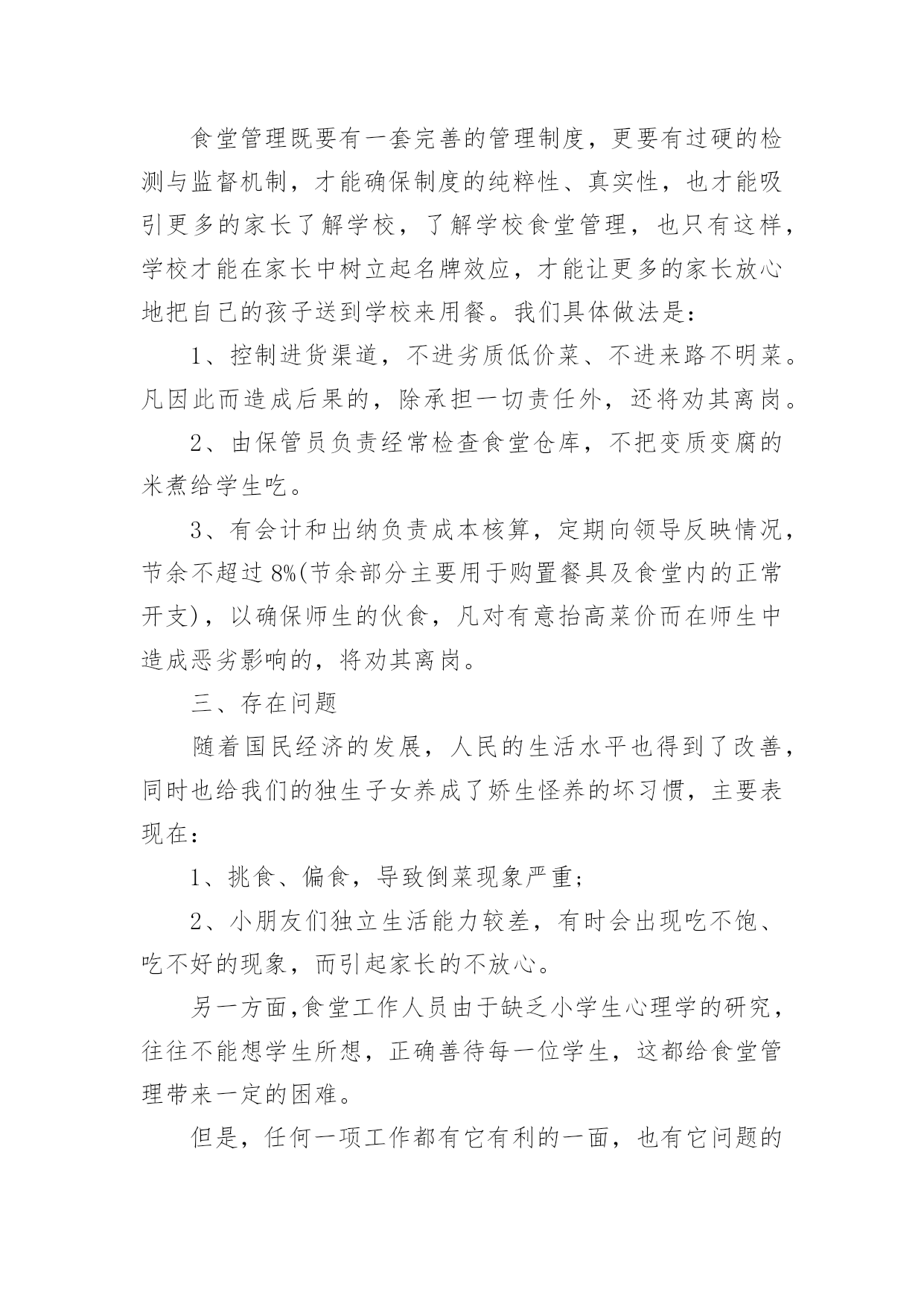 食堂工作总结食堂工作总结范文合集六篇总结是事后对某一阶段的学习、工作或其完成情况加以回顾和分析的一种书面材料,它可使零星的、肤浅的、表面的感性认知上升到全面的、系统的、本质的理性认识上来,让我们一起来学习写总结吧。总结怎么写才能发挥它的作用呢?以下是小编收集整理的食堂工作总结7篇,仅供参考,大家一起来看看吧。食堂工作总结篇1伴随着“突出重点,克难攻坚,为全面提高全市***行业综合经济效益水平和整体竞争实力而努力奋斗”的主旋律,我走过了极其不平凡的一年。一年来,在办公室的领导下,在食堂全体同志的相互配合下,紧紧围绕让每位职工满意就餐的目标,强化服务意识,提高服务质量,为免除职工的后顾之忧,千方百计保障全体职工全身心的投入到经营销售工作中去而努力。现就一年来的工作情况总结食堂是我们***公司全体职工用餐的地方,也是对疾病最为敏感的地方,为了使全体职工都能心情舒畅的放心用餐,作为食堂的工作人员,我有责任有义务搞好食堂的卫生工作。一年来我始终坚持对餐具及时清洗消毒,始终保持食堂地面的干洁,由于人多每天都要分两拨就餐,为了使第二拨就餐人员吃好饭,我总是以最快的速度收拾干净餐桌,换上新的桌布,使第二拨就餐人员也能在干净整洁的环境中就餐。我在食堂负责打饭打菜,经过这一年来的工作,我已经能够对每位职工谁喜欢吃什么、不喜欢吃什么、能吃多少都做到心中有数了,在打饭菜的时候在饭菜量的掌握上自然也就心中有数了,这样既达到了就餐人员的满意,又避免造成不必要的浪费。同时我还是食堂的保管员,负责保管食堂的油、盐、酱、醋、米等物品,这一年来我始终保持保管帐的帐目清晰,做到每一收每一支都在保管帐上体现,不占公家一丝便宜。当然工作的同时也不能忘了学习,从我进***公司第一天起,我就已经感觉到这里学习氛围的浓厚,200*年是全省企业文化建的开局之年,做为公司的一员,我有责任有义务去学习企业文化建设的精神实质,通过学习使我懂得了,我们食堂的成立本身就是我们******企业文化的一种形式体现。我原来认为,我只是食堂的一个小小的服务员,什么企业文化、什么公司盛衰似乎都与我没有什么关系,通过学习我发现我的想法的错的,生活在我们这个***大家庭中,我们每个成员只有分工的不同,没有高低贵贱之分。全公司几十号人都吃的是我打的饭,只有他们都吃好了,才有精力去搞经营,搞销售。所以我做为食堂的一员应是感到骄傲和自豪。如果我过去的工作能得到大家的认可,那么在今后的工作中,我会更加积极努力的工作,让大家吃上更舒适的环境中吃上更可口的饭菜。为张经理在年初工作会上所讲的“让各项福利事业搞的更好一些,让职工的精神面貌更加愉快一些”的目标而努力奋斗!食堂工作总结篇2“为此,自我校食堂创建以来,我们更加努力地探索食堂的新路子。两年多来,我们基本形成了一套我们自己的管理模式,为了更好地总结经验、弥补不足,我将从以下几方面作简要回顾。一、抓机构建立,促组织落实:1、机构设置及人员管理(1)学校成立食堂管理领导小组。其成员由分管校长、总务主任等组成。(2)伙食部所有成员实行聘用制。年度开始,食堂管理领导小组对其进行全面考核,择优录用。被录用的人员必须服从管理,踏实工作,在聘用过程若有违规违纪的,伙食部有权对其进行行政和经济制裁,直至中途解聘。(3)建立建全各项规章制度的组织落实,年终进行考核评比。2、食堂工作人员的身体执行学年度体检制度,发现身体状况欠佳的,采取暂时停用休养的办法,待身体完全恢复后再考虑安排;对食堂环境卫生实行周检查制度,发现问题,立即指出改正。3、抓文明礼貌的落实:我们提倡文明用餐、礼貌服务,要求班主任做好在校用餐学生的文明用餐的教育,而且,每天学生用餐时都要求值周领导入餐厅巡视,值日教师定桌服务,帮助解决学生用餐中的具体问题。二、食堂管理的具体做法:(一)严格管理制度,共创文明服务。学校的主要工作是教学工作,后勤管理的宗旨是坚持为教学服务,而作为后勤管理重重之重的工作——食堂管理工作更是直接影响学校工作的正常开展,为此,我们特制订了一些例的规章制度,确保食堂工作的正常开展。1、出勤制度:不随意更改作息时间2、劳动管理:(1)和睦相处、礼貌待人,杜绝与就餐人员或是内部职工吵架、打骂,违犯一次,扣除当事者当月奖金,情节严重者送司法机关依法追究刑事责任。(2)出售饭菜及其他食品一律不准收现金,违犯一次,收一罚十,并点名批评,情节严重者,劝其离岗。(3)职工内部来客就餐者,一律先买票后拿饭菜。(4)要节约水电,做到人走灯灭,水用即关,违犯一次,罚当事者2元。(5)按规定时间上交各种票证。如不按时上交,造成被盗或其它损失,按其金额处以2倍罚款;如发现私留或转卖票证发现一次,立即辞退。(6)月底结帐需要实事求是,不准隐瞒不报,若扣留票证或实物,发现一次,除追回票证或实物外,扣除当事者当月奖金