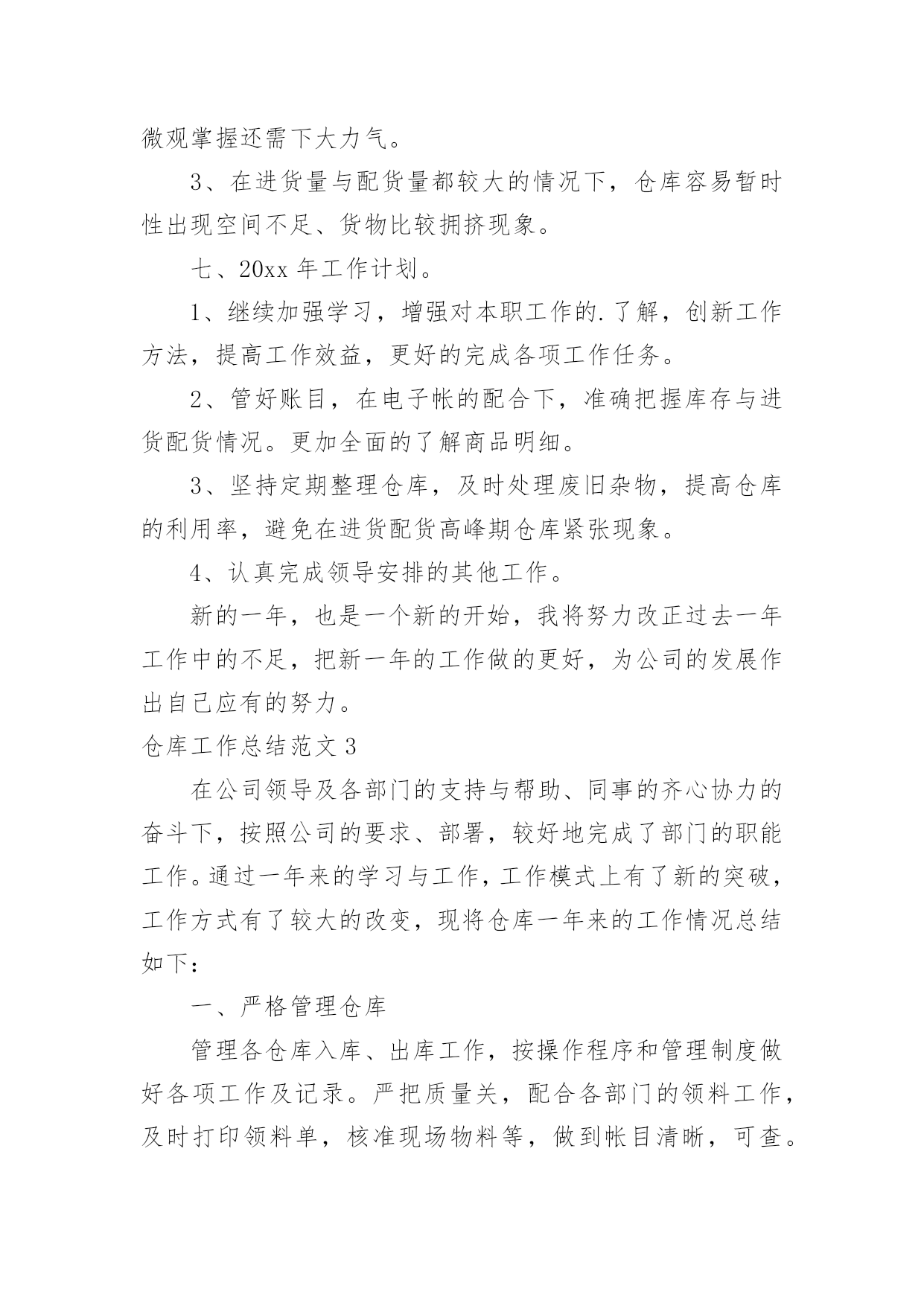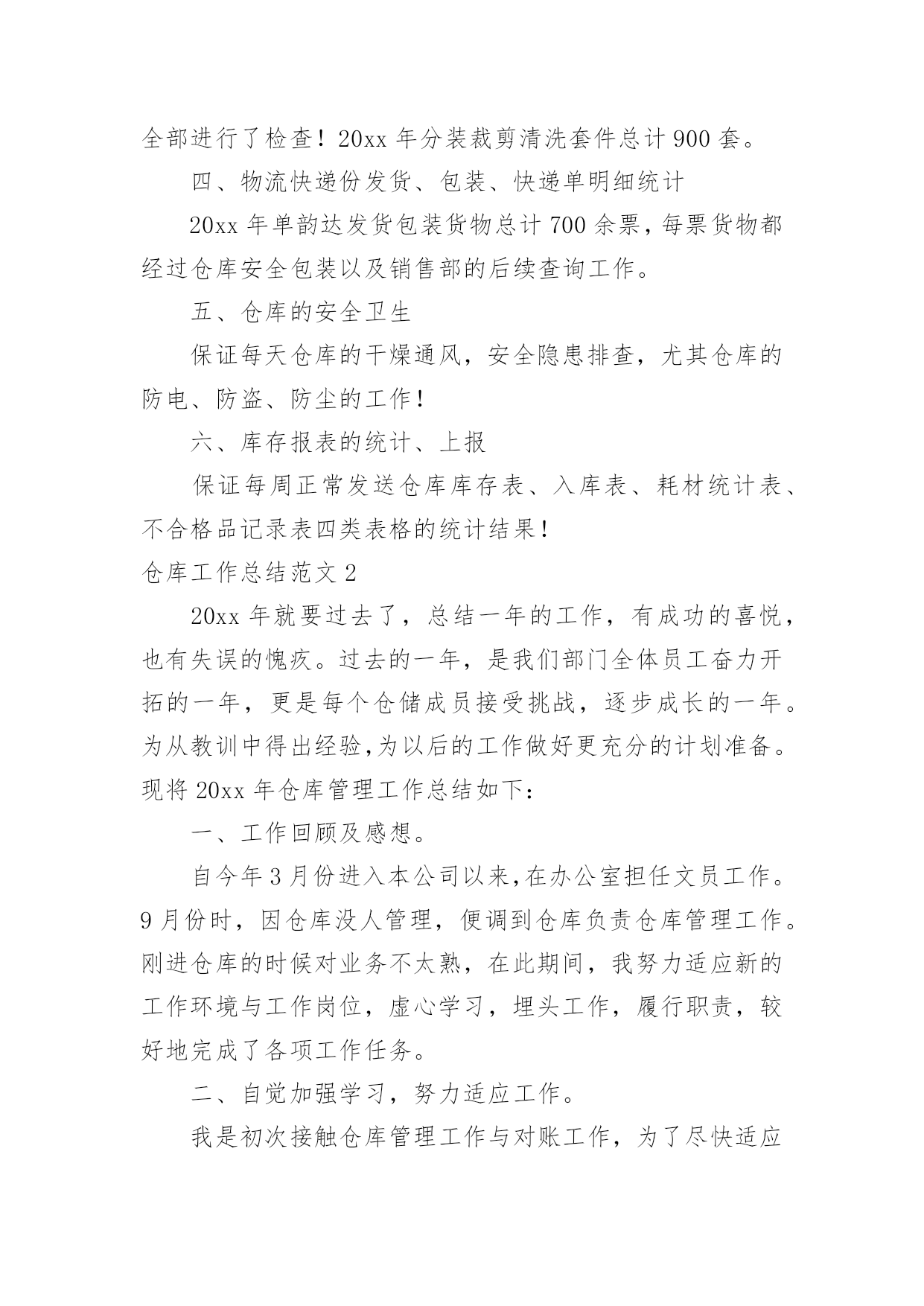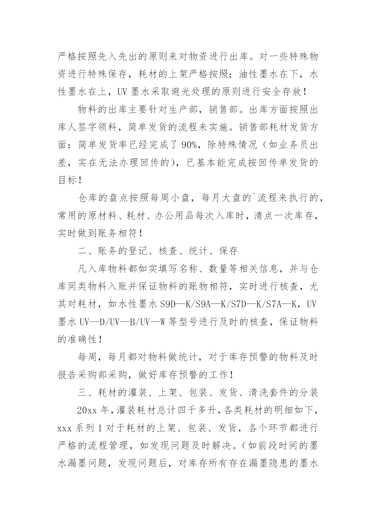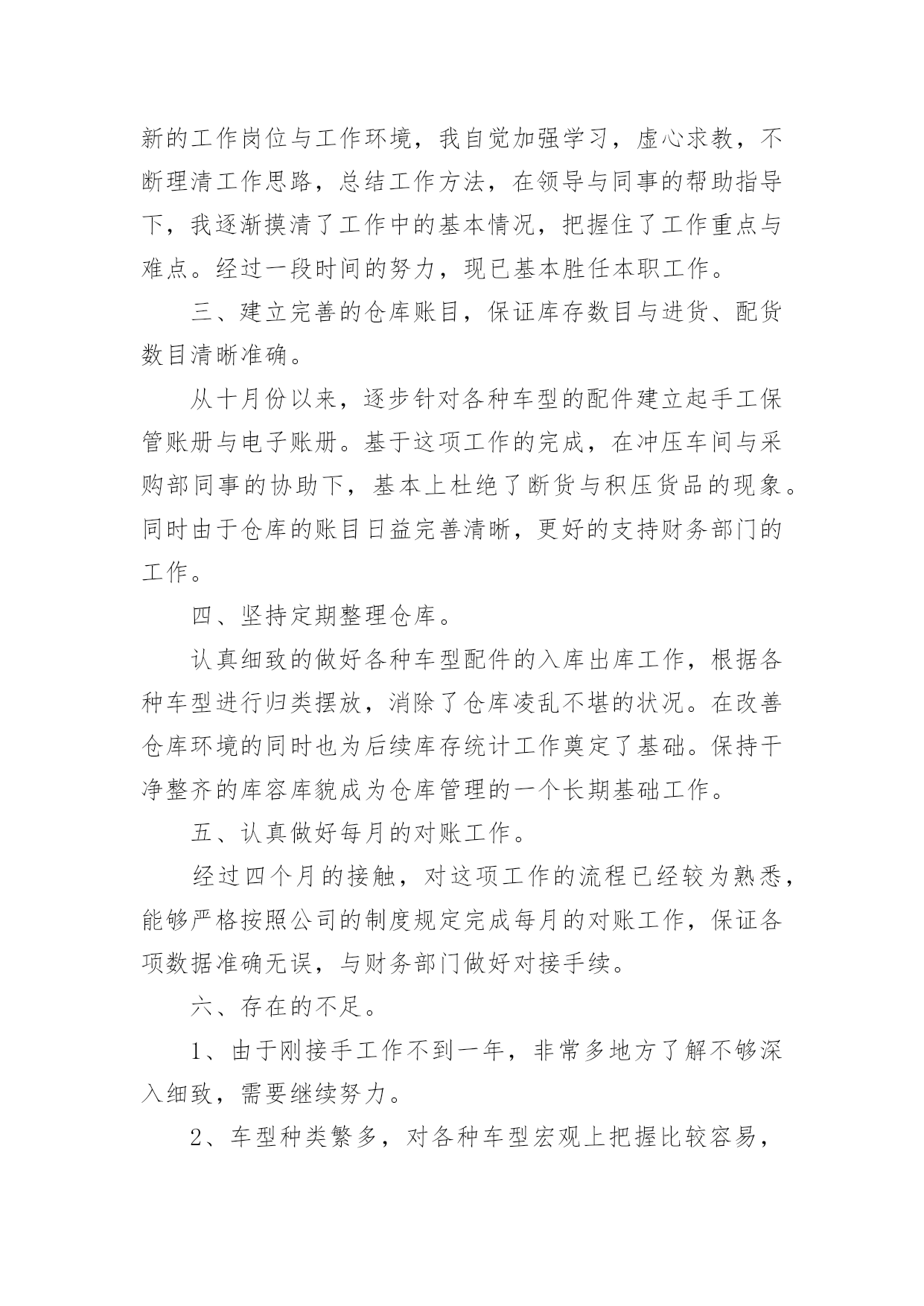 仓库工作总结【热】仓库工作总结范文7篇总结就是把一个时段的学习、工作或其完成情况进行一次全面系统的总结,它能够给人努力工作的动力,不如静下心来好好写写总结吧。你想知道总结怎么写吗?以下是小编为大家收集的仓库工作总结范文,供大家参考借鉴,希望可以帮助到有需要的朋友。仓库工作总结范文120xx年一年,在领导的严格要求和各部门的积极配合下,仓库的各项工作进行的都还顺利。在仓库物资管理中,我都进行了严格把关,认真负责:对各项物料、耗材,都做了详细的账务记录,并根据各部门的实际情况,在工作时也做了灵活应对。总体来讲,仓库在20xx年一年的工作基本按照公司的发展以及20xx年的工作规划正常运作!仓库在20xx年完成的工作主要包括:物料的入库、保存、出库、盘点、预警、滞库处理,账务的登记、核查、统计、保存,耗材的灌装、上架、包装、发货,清洗套件的分装、入库,物流快递的运单统计,仓库内部的安全、卫生。一、物料的入库、保存、出库、盘点、预警、滞库处理20xx年仓库完成各类原材料、半成品、机加工件、办公用品、耗材的入库达两千余项。物资入库后采取及时上架,严格按照先入先出的原则来对物资进行出库。对一些特殊物资进行特殊保存,耗材的上架严格按照;油性墨水在下,水性墨水在上,UV墨水采取避光处理的原则进行安全存放!物料的出库主要针对生产部,销售部。出库方面按照出库人签字领料,简单发货的流程来实施。销售部耗材发货方面:简单发货率已经完成了90%,除特殊情况(如业务员出差,实在无法办理回传的),已基本能完成按回传单发货的目标!仓库的盘点按照每周小盘,每月大盘的`流程来执行的,常用的原材料、耗材、办公用品每次入库时,清点一次库存,实时做到账务相符!二、账务的登记、核查、统计、保存凡入库物料都如实填写名称、数量等相关信息,并与仓库同类物料入账并保证物料的账物相符,实时进行核查,尤其对耗材,如水性墨水S9D—K/S9A—K/S7D—K/S7A—K,UV墨水UV—D/UV—B/UV—W等型号进行及时的核查,保证物料的准确性!每周,每月都对物料做统计,对于库存预警的物料及时报告采购部采购,做好库存预警的工作!三、耗材的灌装、上架、包装、发货、清洗套件的分装20xx年,灌装耗材总计四千多升,各类耗材的明细如下,xxx系列1对于耗材的上架、包装、发货,各个环节都进行严格的流程管理,如发现问题及时解决。(如前段时间的墨水漏墨问题,发现问题后,对库存所有存在漏墨隐患的墨水全部进行了检查!20xx年分装裁剪清洗套件总计900套。四、物流快递份发货、包装、快递单明细统计20xx年单韵达发货包装货物总计700余票,每票货物都经过仓库安全包装以及销售部的后续查询工作。五、仓库的安全卫生保证每天仓库的干燥通风,安全隐患排查,尤其仓库的防电、防盗、防尘的工作!六、库存报表的统计、上报保证每周正常发送仓库库存表、入库表、耗材统计表、不合格品记录表四类表格的统计结果!仓库工作总结范文220xx年就要过去了,总结一年的工作,有成功的喜悦,也有失误的愧疚。过去的一年,是我们部门全体员工奋力开拓的一年,更是每个仓储成员接受挑战,逐步成长的一年。为从教训中得出经验,为以后的工作做好更充分的计划准备。现将20xx年仓库管理工作总结如下:一、工作回顾及感想。自今年3月份进入本公司以来,在办公室担任文员工作。9月份时,因仓库没人管理,便调到仓库负责仓库管理工作。刚进仓库的时候对业务不太熟,在此期间,我努力适应新的工作环境与工作岗位,虚心学习,埋头工作,履行职责,较好地完成了各项工作任务。二、自觉加强学习,努力适应工作。我是初次接触仓库管理工作与对账工作,为了尽快适应新的工作岗位与工作环境,我自觉加强学习,虚心求教,不断理清工作思路,总结工作方法,在领导与同事的帮助指导下,我逐渐摸清了工作中的基本情况,把握住了工作重点与难点。经过一段时间的努力,现已基本胜任本职工作。三、建立完善的仓库账目,保证库存数目与进货、配货数目清晰准确。从十月份以来,逐步针对各种车型的配件建立起手工保管账册与电子账册。基于这项工作的完成,在冲压车间与采购部同事的协助下,基本上杜绝了断货与积压货品的现象。同时由于仓库的账目日益完善清晰,更好的支持财务部门的工作。四、坚持定期整理仓库。认真细致的做好各种车型配件的入库出库工作,根据各种车型进行归类摆放,消除了仓库凌乱不堪的状况。在改善仓库环境的同时也为后续库存统计工作奠定了基础。保持干净整齐的库容库貌成为仓库管理的一个长期基础工作。五、认真做好每月的对账工作。经过四个月的接触,对这项工作的流程已经较为熟悉,能够严格按照公司的制度规定完成每月的对账工作,保证各项数据准确无误,与财务部门做好对接手续。六、存在的不足。1、由于刚接手工作不到一年,非常多地方了解不够深入细致,需要继续努力。2