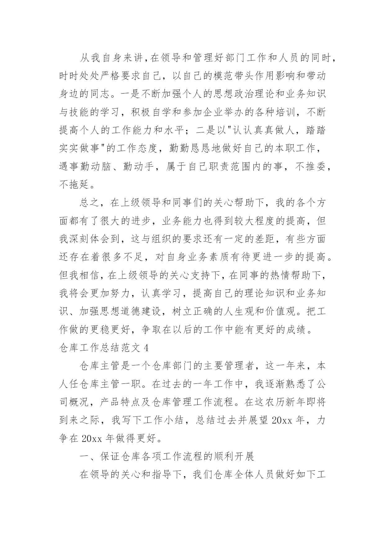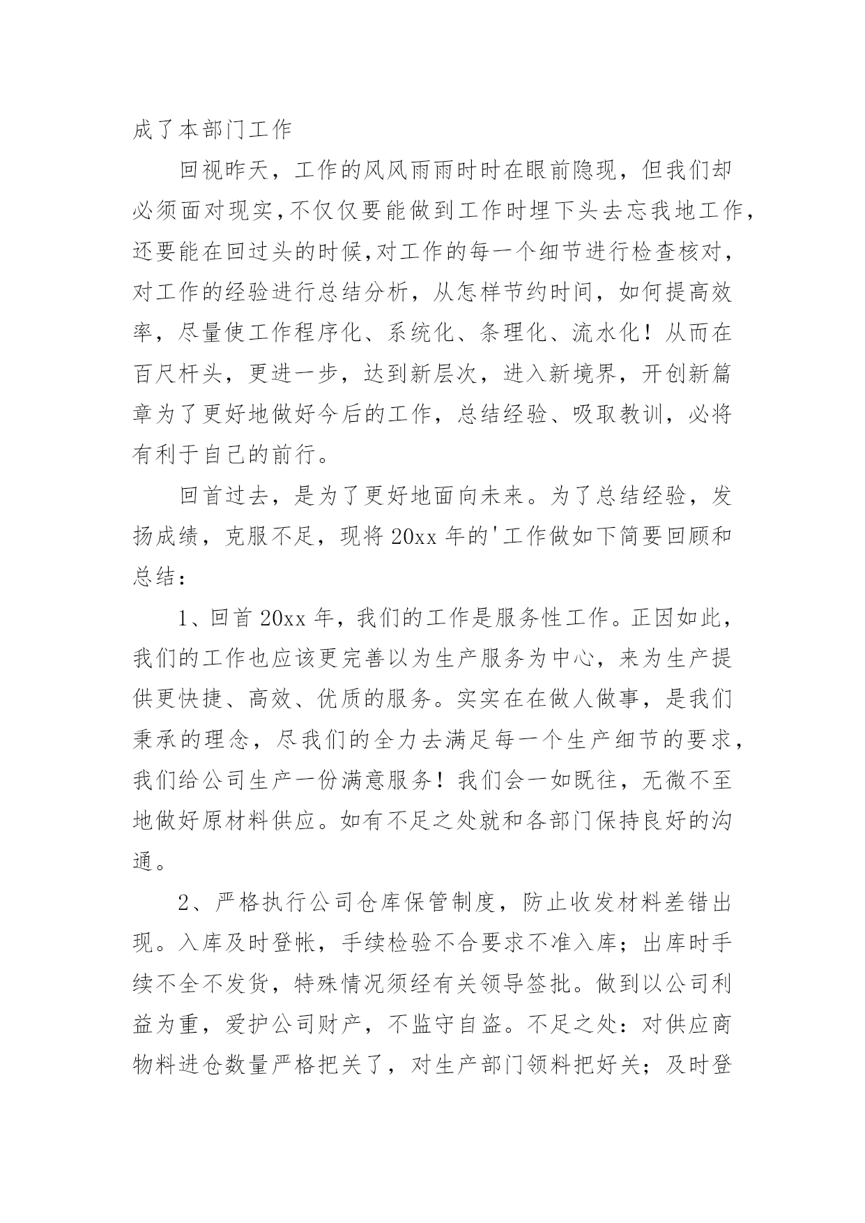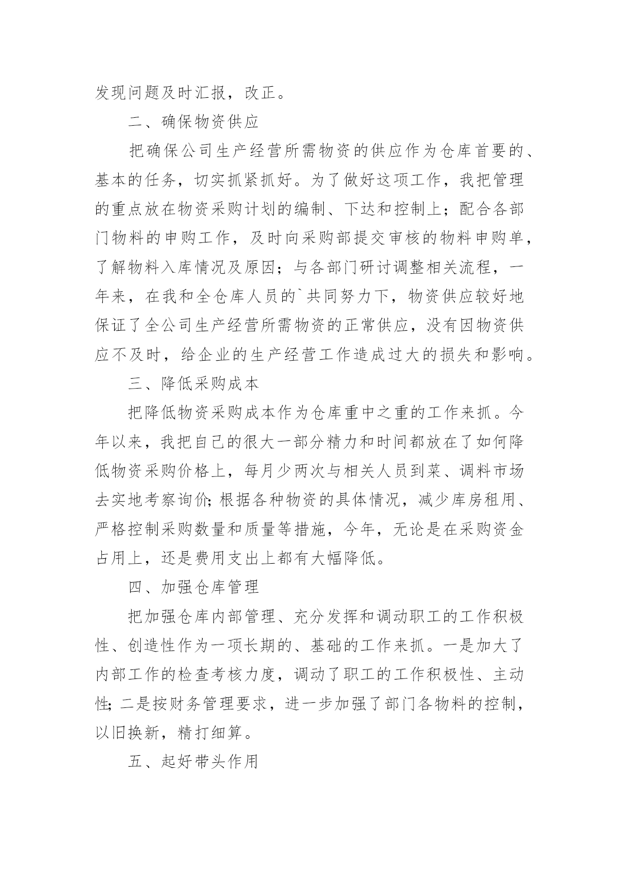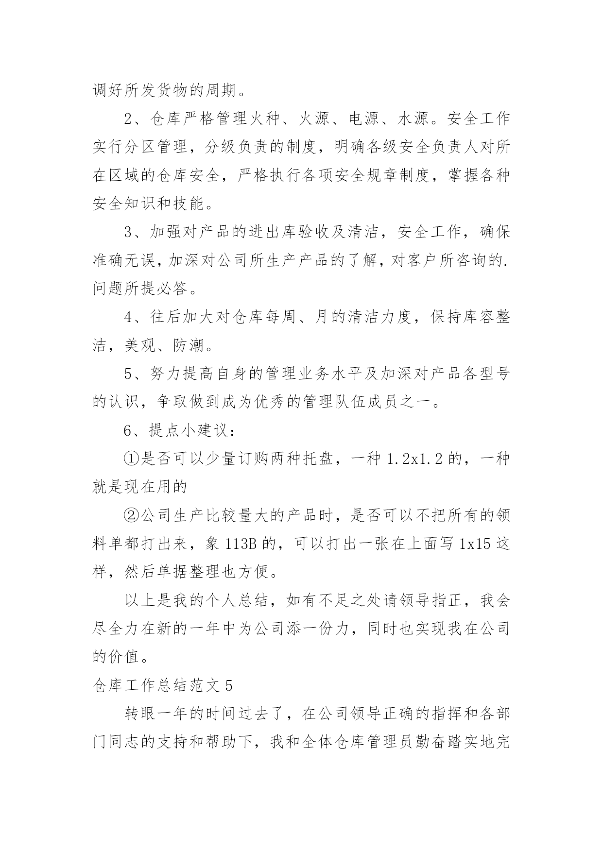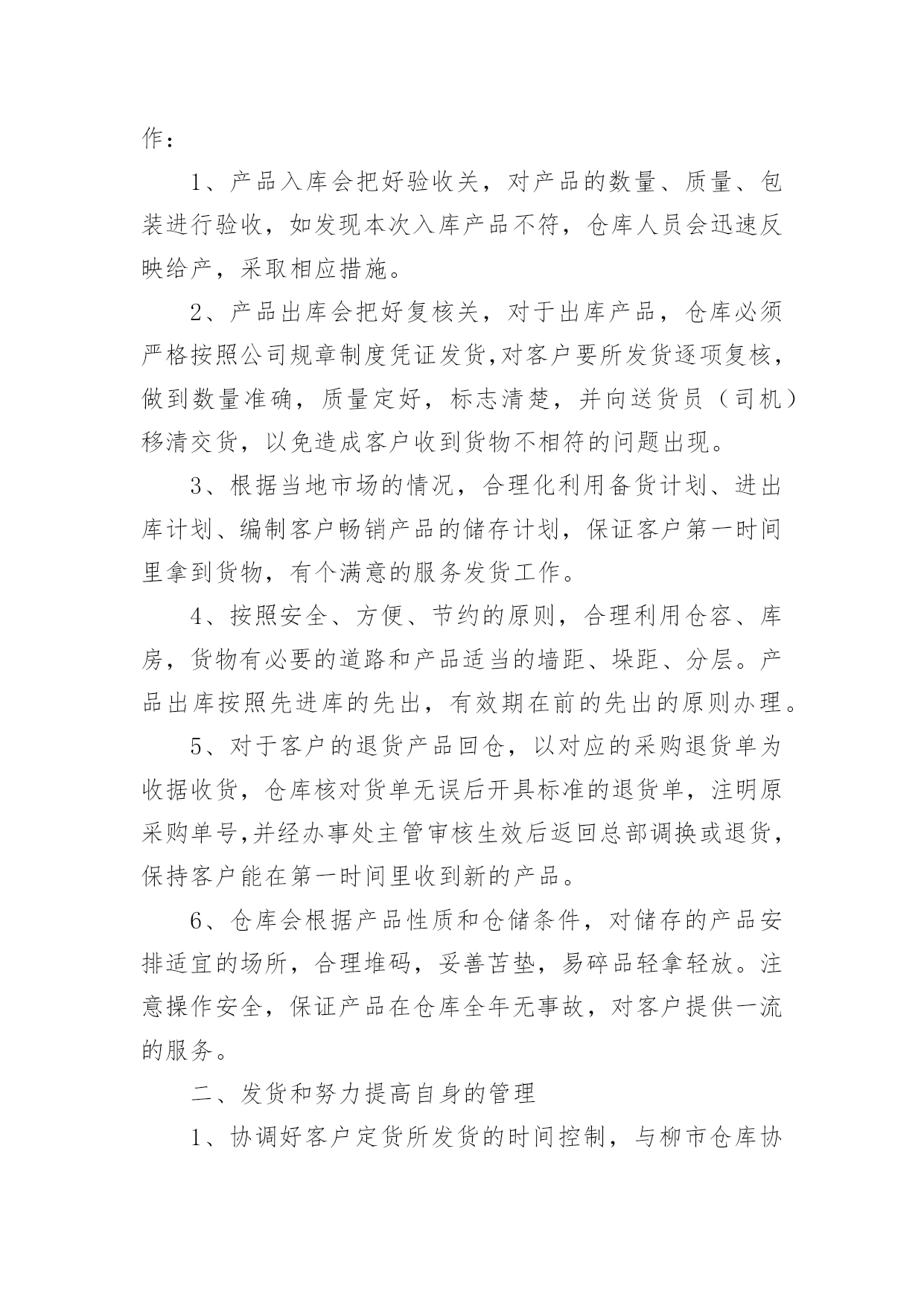 仓库工作总结【热】仓库工作总结范文7篇总结就是把一个时段的学习、工作或其完成情况进行一次全面系统的总结,它能够给人努力工作的动力,不如静下心来好好写写总结吧。你想知道总结怎么写吗?以下是小编为大家收集的仓库工作总结范文,供大家参考借鉴,希望可以帮助到有需要的朋友。仓库工作总结范文120xx年一年,在领导的严格要求和各部门的积极配合下,仓库的各项工作进行的都还顺利。在仓库物资管理中,我都进行了严格把关,认真负责:对各项物料、耗材,都做了详细的账务记录,并根据各部门的实际情况,在工作时也做了灵活应对。总体来讲,仓库在20xx年一年的工作基本按照公司的发展以及20xx年的工作规划正常运作!仓库在20xx年完成的工作主要包括:物料的入库、保存、出库、盘点、预警、滞库处理,账务的登记、核查、统计、保存,耗材的灌装、上架、包装、发货,清洗套件的分装、入库,物流快递的运单统计,仓库内部的安全、卫生。一、物料的入库、保存、出库、盘点、预警、滞库处理20xx年仓库完成各类原材料、半成品、机加工件、办公用品、耗材的入库达两千余项。物资入库后采取及时上架,严格按照先入先出的原则来对物资进行出库。对一些特殊物资进行特殊保存,耗材的上架严格按照;油性墨水在下,水性墨水在上,UV墨水采取避光处理的原则进行安全存放!物料的出库主要针对生产部,销售部。出库方面按照出库人签字领料,简单发货的流程来实施。销售部耗材发货方面:简单发货率已经完成了90%,除特殊情况(如业务员出差,实在无法办理回传的),已基本能完成按回传单发货的目标!仓库的盘点按照每周小盘,每月大盘的`流程来执行的,常用的原材料、耗材、办公用品每次入库时,清点一次库存,实时做到账务相符!二、账务的登记、核查、统计、保存凡入库物料都如实填写名称、数量等相关信息,并与仓库同类物料入账并保证物料的账物相符,实时进行核查,尤其对耗材,如水性墨水S9D—K/S9A—K/S7D—K/S7A—K,UV墨水UV—D/UV—B/UV—W等型号进行及时的核查,保证物料的准确性!每周,每月都对物料做统计,对于库存预警的物料及时报告采购部采购,做好库存预警的工作!三、耗材的灌装、上架、包装、发货、清洗套件的分装20xx年,灌装耗材总计四千多升,各类耗材的明细如下,xxx系列1对于耗材的上架、包装、发货,各个环节都进行严格的流程管理,如发现问题及时解决。(如前段时间的墨水漏墨问题,发现问题后,对库存所有存在漏墨隐患的墨水全部进行了检查!20xx年分装裁剪清洗套件总计900套。四、物流快递份发货、包装、快递单明细统计20xx年单韵达发货包装货物总计700余票,每票货物都经过仓库安全包装以及销售部的后续查询工作。五、仓库的安全卫生保证每天仓库的干燥通风,安全隐患排查,尤其仓库的防电、防盗、防尘的工作!六、库存报表的统计、上报保证每周正常发送仓库库存表、入库表、耗材统计表、不合格品记录表四类表格的统计结果!仓库工作总结范文220xx年就要过去了,总结一年的工作,有成功的喜悦,也有失误的愧疚。过去的一年,是我们部门全体员工奋力开拓的一年,更是每个仓储成员接受挑战,逐步成长的一年。为从教训中得出经验,为以后的工作做好更充分的计划准备。现将20xx年仓库管理工作总结如下:一、工作回顾及感想。自今年3月份进入本公司以来,在办公室担任文员工作。9月份时,因仓库没人管理,便调到仓库负责仓库管理工作。刚进仓库的时候对业务不太熟,在此期间,我努力适应新的工作环境与工作岗位,虚心学习,埋头工作,履行职责,较好地完成了各项工作任务。二、自觉加强学习,努力适应工作。我是初次接触仓库管理工作与对账工作,为了尽快适应新的工作岗位与工作环境,我自觉加强学习,虚心求教,不断理清工作思路,总结工作方法,在领导与同事的帮助指导下,我逐渐摸清了工作中的基本情况,把握住了工作重点与难点。经过一段时间的努力,现已基本胜任本职工作。三、建立完善的仓库账目,保证库存数目与进货、配货数目清晰准确。从十月份以来,逐步针对各种车型的配件建立起手工保管账册与电子账册。基于这项工作的完成,在冲压车间与采购部同事的协助下,基本上杜绝了断货与积压货品的现象。同时由于仓库的账目日益完善清晰,更好的支持财务部门的工作。四、坚持定期整理仓库。认真细致的做好各种车型配件的入库出库工作,根据各种车型进行归类摆放,消除了仓库凌乱不堪的状况。在改善仓库环境的同时也为后续库存统计工作奠定了基础。保持干净整齐的库容库貌成为仓库管理的一个长期基础工作。五、认真做好每月的对账工作。经过四个月的接触,对这项工作的流程已经较为熟悉,能够严格按照公司的制度规定完成每月的对账工作,保证各项数据准确无误,与财务部门做好对接手续。六、存在的不足。1、由于刚接手工作不到一年,非常多地方了解不够深入细致,需要继续努力。2