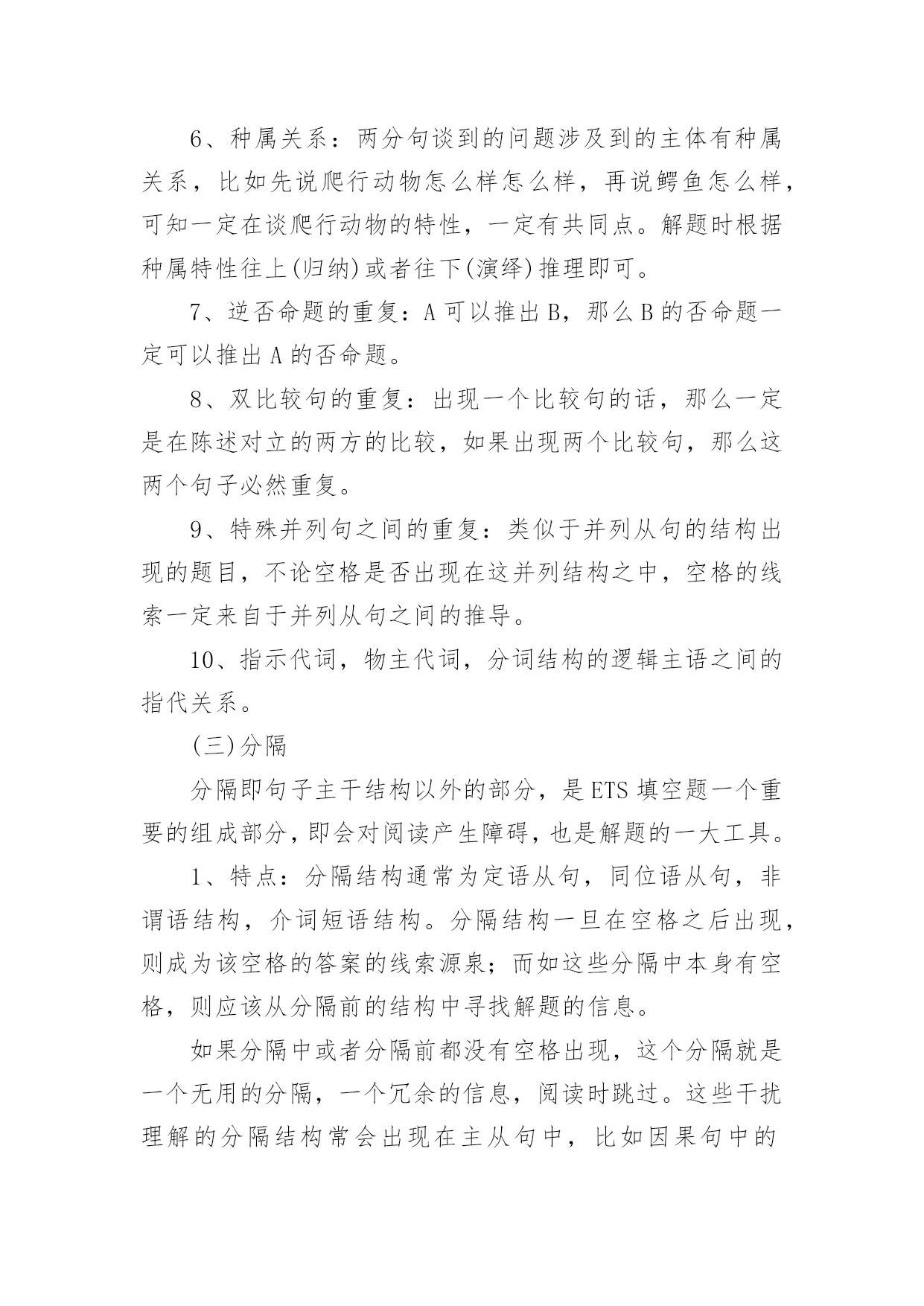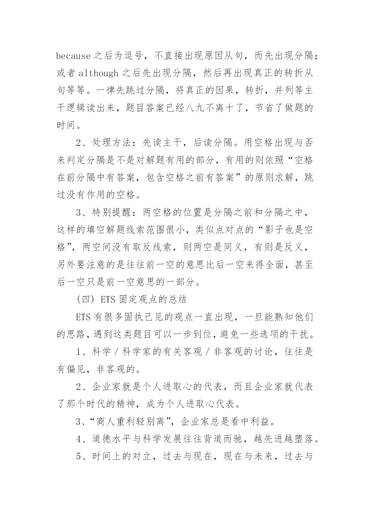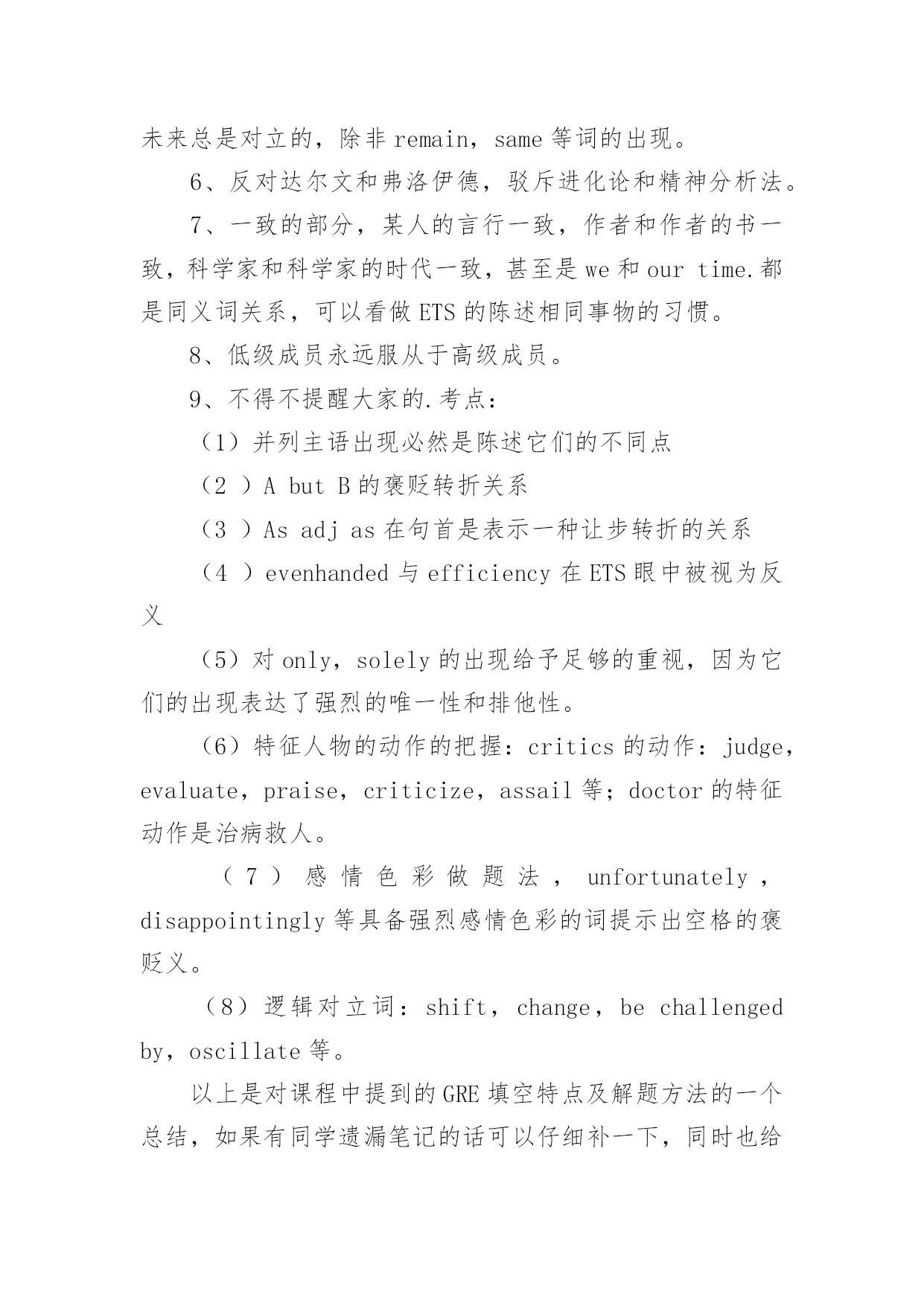 GRE考试技巧:GRE填空GRE考试技巧推荐:GRE填空一、GRE填空特点和相应解题方略GRE填空亘古不变的公理是意义上的重复和结构上的对应,通过对这两点基本填空思想的把握是解题的基础,一切空格线索皆从句子中来,答案的依据若不是从句中而来的任何感觉都必错。从空格解题线索特征来看,可以分为4个大类:(一)点与点的重复1、特征:连接词和对应空格的影子成分。2、连接词:指与空格相关的连词和连词结构,出现在句首或连接两个分句,明确指示出两句的逻辑关系。一般分为因果,并列(同义,近义),转折,让步(反义)和递进(同义但程度加深)。3、空格的影子(counterpart):指与空格充当相同成分,结构相对应的词或词组,通常是实词(n,v,adj,adv)。4、处理的方法:依照连接词提示的逻辑关系,影子做相应的变化就可以得到空格的答案。5、特别提醒:(1)在空格前和影子前隐藏的not,yet等反义提示词的出现使答案再次取反。(2)取反的全面性,不要轻易排除掉中性答案,可能漏了解。(3)影子也是空格,连接词连接两空格,选择选项中符合连接词提示逻辑关系的一对词(填空解题中唯一“横向”阅读答案的题型)。(二)重复1、重复:以分号,逗号,冒号分开的上下两句中的各种重复关系。2、特点:由于没有连接词的存在用别的线索来确定上下句间的逻辑关系,同时不强调点对点,空格对应词,词组,分句都很常见,要抓住其中对应的关键部分或用一些归纳概括或演绎来处理。除了一目了然的重复以外,重复的出现一般分为以下:(1)否定重复:“itiswrong/presumptuous/irony/paradoxically/foolishtosaythat”或者将“paradoxically/ironypuzzlingly/surprisingly"前置于句首。(2)主被动重复:一般用by来引导,AbyB或者将by换为以下短语代替:“istheresultof/istheoutgrowthof/istheproductof”。3、比较的重复:comparedwith...连接的两句4、手段和目的重复:AbyB重复为intermsof5、代词对应:注意粘连中的人称代词,指示代词,定冠词。特别注意suchthisthatitthemthe这种词,可以帮助迅速找出对应关系。6、种属关系:两分句谈到的问题涉及到的主体有种属关系,比如先说爬行动物怎么样怎么样,再说鳄鱼怎么样,可知一定在谈爬行动物的特性,一定有共同点。解题时根据种属特性往上(归纳)或者往下(演绎)推理即可。7、逆否命题的重复:A可以推出B,那么B的否命题一定可以推出A的否命题。8、双比较句的重复:出现一个比较句的话,那么一定是在陈述对立的两方的比较,如果出现两个比较句,那么这两个句子必然重复。9、特殊并列句之间的重复:类似于并列从句的结构出现的题目,不论空格是否出现在这并列结构之中,空格的线索一定来自于并列从句之间的推导。10、指示代词,物主代词,分词结构的逻辑主语之间的指代关系。(三)分隔分隔即句子主干结构以外的部分,是ETS填空题一个重要的组成部分,即会对阅读产生障碍,也是解题的一大工具。1、特点:分隔结构通常为定语从句,同位语从句,非谓语结构,介词短语结构。分隔结构一旦在空格之后出现,则成为该空格的答案的线索源泉;而如这些分隔中本身有空格,则应该从分隔前的结构中寻找解题的信息。如果分隔中或者分隔前都没有空格出现,这个分隔就是一个无用的分隔,一个冗余的信息,阅读时跳过。这些干扰理解的分隔结构常会出现在主从句中,比如因果句中的because之后为逗号,不直接出现原因从句,而先出现分隔;或者although之后先出现分隔,然后再出现真正的转折从句等等。一律先跳过分隔,将真正的因果,转折,并列等主干逻辑读出来,题目答案已经八九不离十了,节省了做题的时间。2、处理方法:先读主干,后读分隔。用空格出现与否来判定分隔是不是对解题有用的部分,有用的则依照“空格在前分隔中有答案,包含空格之前有答案”的原则求解,跳过没有作用的空格。3、特别提醒:两空格的位置是分隔之前和分隔之中,这样的填空解题线索范围很小,类似点对点的“影子也是空格”,两空间没有取反线索,则两空是同义,有则是反义,另外要注意的是往往前一空的意思比后一空来得全面,甚至后一空只是前一空意思的一部分。(四)ETS固定观点的总结ETS有很多固执己见的观点一直出现,一旦能熟知他们的思路,遇到这类题目可以一步到位,避免一些选项的干扰。1、科学/科学家的有关客观/非客观的讨论,往往是有偏见,非客观的。2、企业家就是个人进取心的代表,而且企业家就代表了那个时代的精神,成为个人进取心代表。3、“商人重利轻别离”,企业家总是看中利益。4、道德水平与科学发展往往背道而驰,越先进越堕落。
