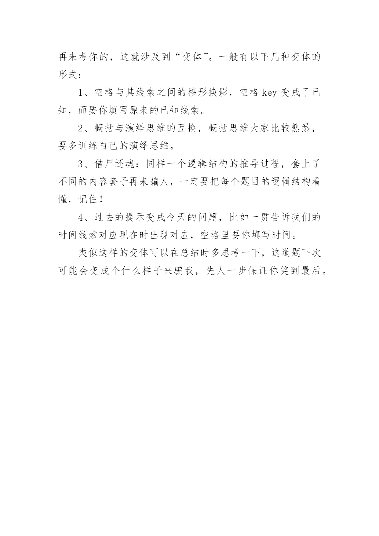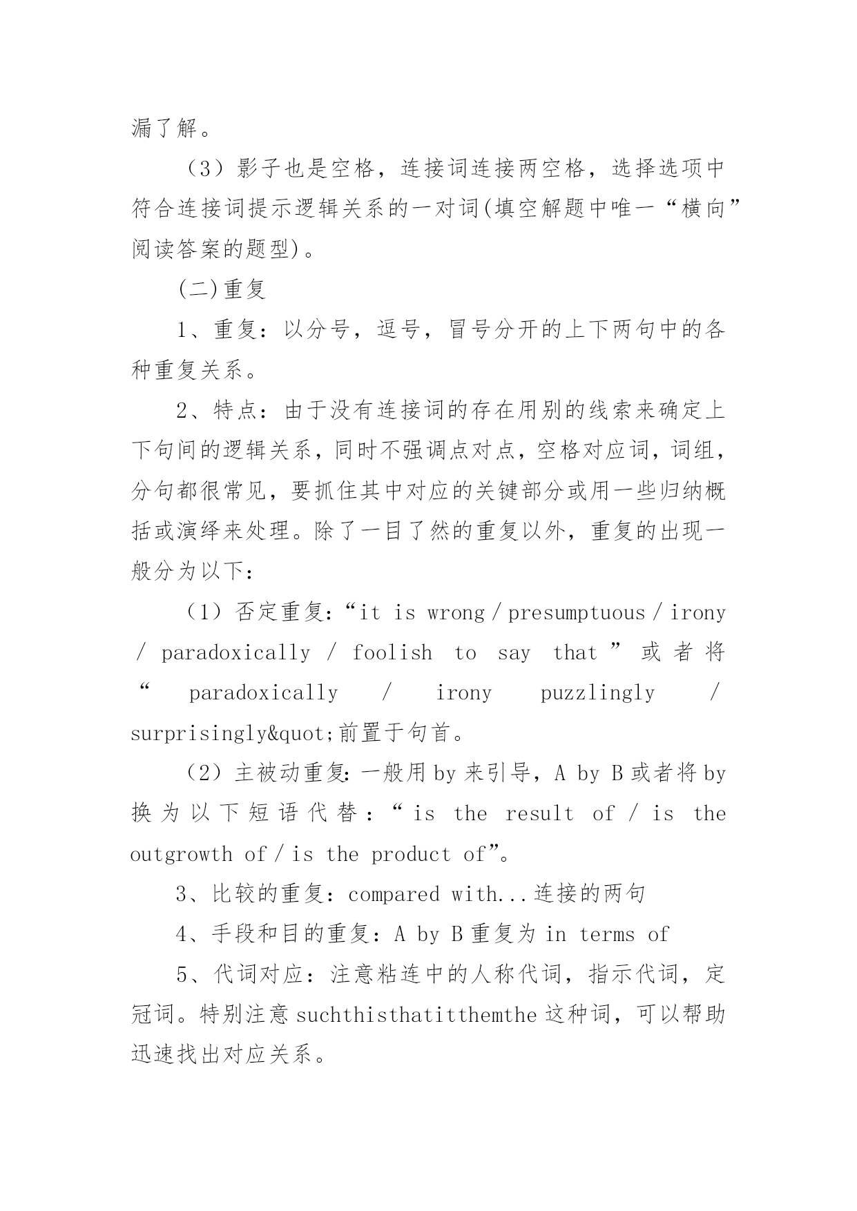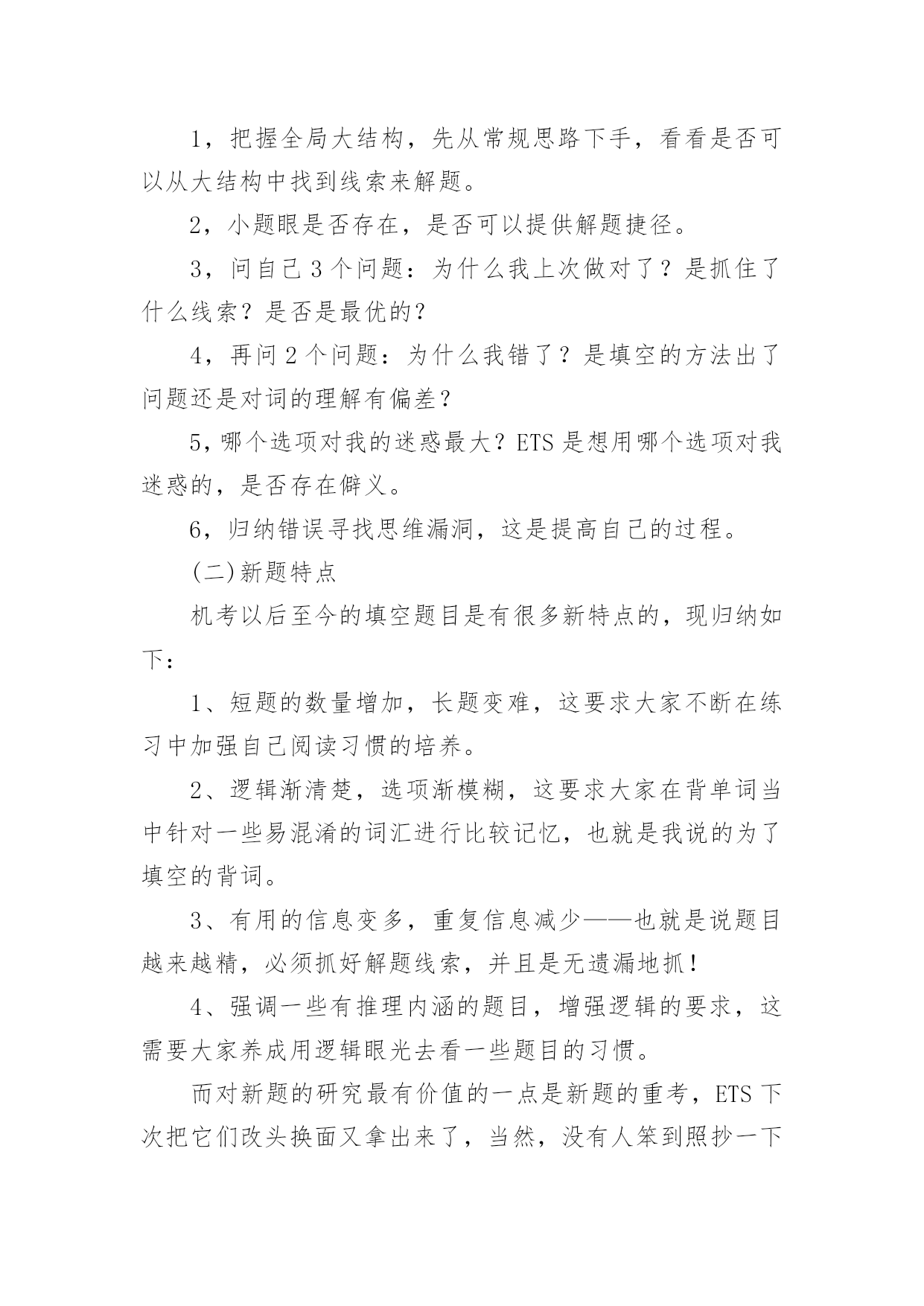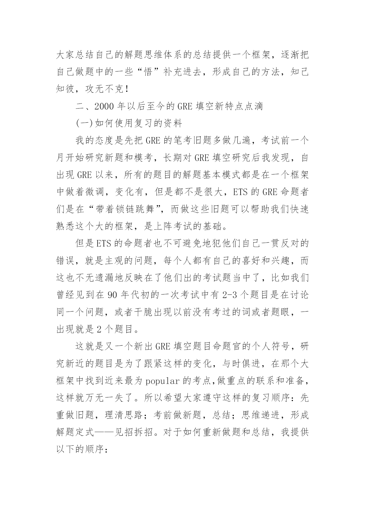 GRE考试技巧:GRE填空GRE考试技巧推荐:GRE填空一、GRE填空特点和相应解题方略GRE填空亘古不变的公理是意义上的重复和结构上的对应,通过对这两点基本填空思想的把握是解题的基础,一切空格线索皆从句子中来,答案的依据若不是从句中而来的任何感觉都必错。从空格解题线索特征来看,可以分为4个大类:(一)点与点的重复1、特征:连接词和对应空格的影子成分。2、连接词:指与空格相关的连词和连词结构,出现在句首或连接两个分句,明确指示出两句的逻辑关系。一般分为因果,并列(同义,近义),转折,让步(反义)和递进(同义但程度加深)。3、空格的影子(counterpart):指与空格充当相同成分,结构相对应的词或词组,通常是实词(n,v,adj,adv)。4、处理的方法:依照连接词提示的逻辑关系,影子做相应的变化就可以得到空格的答案。5、特别提醒:(1)在空格前和影子前隐藏的not,yet等反义提示词的出现使答案再次取反。(2)取反的全面性,不要轻易排除掉中性答案,可能漏了解。(3)影子也是空格,连接词连接两空格,选择选项中符合连接词提示逻辑关系的一对词(填空解题中唯一“横向”阅读答案的题型)。(二)重复1、重复:以分号,逗号,冒号分开的上下两句中的各种重复关系。2、特点:由于没有连接词的存在用别的线索来确定上下句间的逻辑关系,同时不强调点对点,空格对应词,词组,分句都很常见,要抓住其中对应的关键部分或用一些归纳概括或演绎来处理。除了一目了然的重复以外,重复的出现一般分为以下:(1)否定重复:“itiswrong/presumptuous/irony/paradoxically/foolishtosaythat”或者将“paradoxically/ironypuzzlingly/surprisingly"前置于句首。(2)主被动重复:一般用by来引导,AbyB或者将by换为以下短语代替:“istheresultof/istheoutgrowthof/istheproductof”。3、比较的重复:comparedwith...连接的两句4、手段和目的重复:AbyB重复为intermsof5、代词对应:注意粘连中的人称代词,指示代词,定冠词。特别注意suchthisthatitthemthe这种词,可以帮助迅速找出对应关系。6、种属关系:两分句谈到的问题涉及到的主体有种属关系,比如先说爬行动物怎么样怎么样,再说鳄鱼怎么样,可知一定在谈爬行动物的特性,一定有共同点。解题时根据种属特性往上(归纳)或者往下(演绎)推理即可。7、逆否命题的重复:A可以推出B,那么B的否命题一定可以推出A的否命题。8、双比较句的重复:出现一个比较句的话,那么一定是在陈述对立的两方的比较,如果出现两个比较句,那么这两个句子必然重复。9、特殊并列句之间的重复:类似于并列从句的结构出现的题目,不论空格是否出现在这并列结构之中,空格的线索一定来自于并列从句之间的推导。10、指示代词,物主代词,分词结构的逻辑主语之间的指代关系。(三)分隔分隔即句子主干结构以外的部分,是ETS填空题一个重要的组成部分,即会对阅读产生障碍,也是解题的一大工具。1、特点:分隔结构通常为定语从句,同位语从句,非谓语结构,介词短语结构。分隔结构一旦在空格之后出现,则成为该空格的答案的线索源泉;而如这些分隔中本身有空格,则应该从分隔前的结构中寻找解题的信息。如果分隔中或者分隔前都没有空格出现,这个分隔就是一个无用的分隔,一个冗余的信息,阅读时跳过。这些干扰理解的分隔结构常会出现在主从句中,比如因果句中的because之后为逗号,不直接出现原因从句,而先出现分隔;或者although之后先出现分隔,然后再出现真正的转折从句等等。一律先跳过分隔,将真正的因果,转折,并列等主干逻辑读出来,题目答案已经八九不离十了,节省了做题的时间。2、处理方法:先读主干,后读分隔。用空格出现与否来判定分隔是不是对解题有用的部分,有用的则依照“空格在前分隔中有答案,包含空格之前有答案”的原则求解,跳过没有作用的空格。3、特别提醒:两空格的位置是分隔之前和分隔之中,这样的填空解题线索范围很小,类似点对点的“影子也是空格”,两空间没有取反线索,则两空是同义,有则是反义,另外要注意的是往往前一空的意思比后一空来得全面,甚至后一空只是前一空意思的一部分。(四)ETS固定观点的总结ETS有很多固执己见的观点一直出现,一旦能熟知他们的思路,遇到这类题目可以一步到位,避免一些选项的干扰。1、科学/科学家的有关客观/非客观的讨论,往往是有偏见,非客观的。2、企业家就是个人进取心的代表,而且企业家就代表了那个时代的精神,成为个人进取心代表。3、“商人重利轻别离”,企业家总是看中利益。4、道德水平与科学发展往往背道而驰,越先进越堕落。