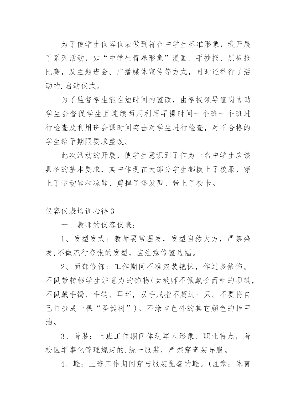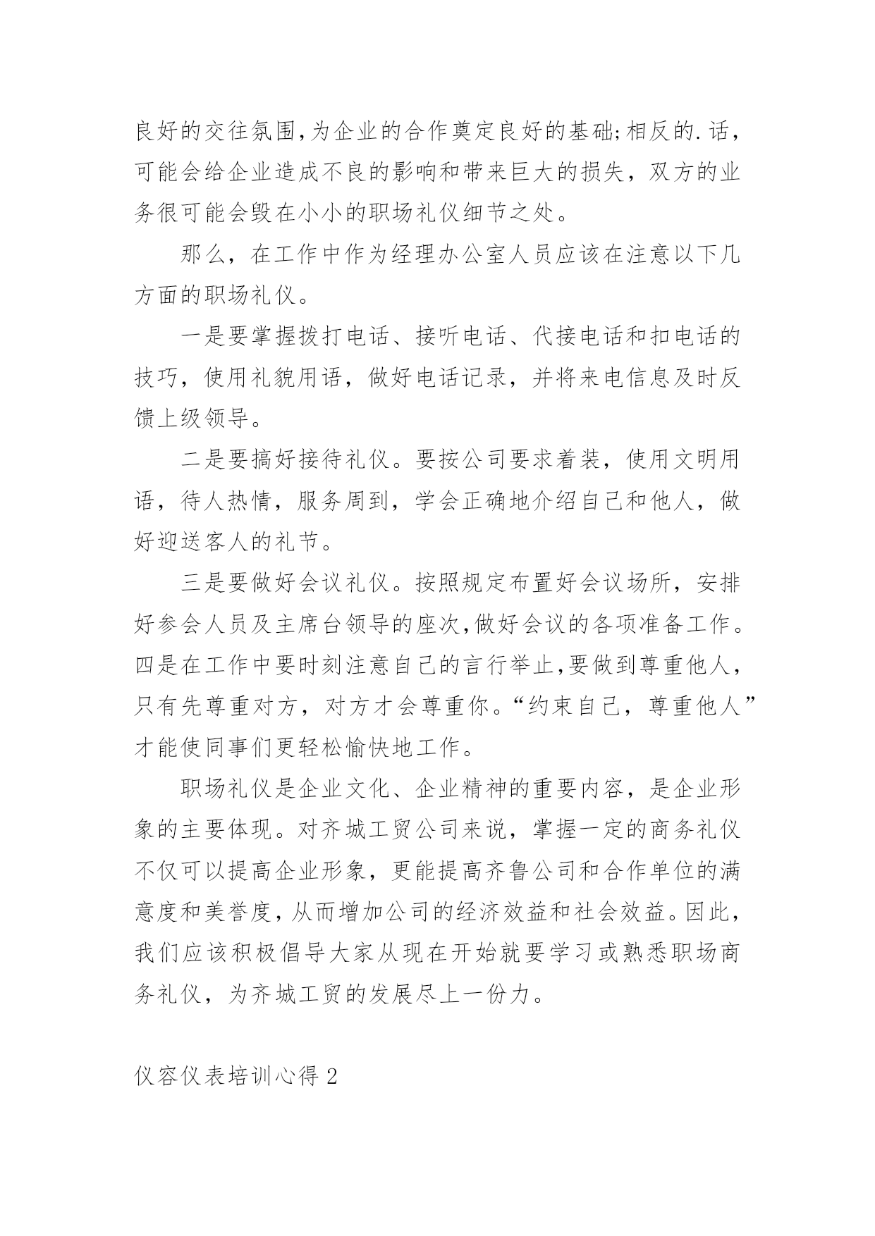 仪容仪表培训心得当我们心中积累了不少感想和见解时,可以通过写心得体会的方式将其记录下来,如此可以一直更新迭代自己的想法。那么心得体会怎么写才能感染读者呢?下面是小编整理的仪容仪表培训心得,仅供参考,大家一起来看看吧。仪容仪表培训心得1泱泱华夏,有着五千年的历史和文明,素称礼仪之邦。中国历来都非常重视礼仪教育,自周朝就出现了《周礼》、春秋时期伟大圣人孔子更是对礼仪的集大成者,进入封建社会后礼仪依旧非常重要,中央行政机构设有吏、户、礼、兵、刑、工六部,礼部就占其一。进入现代社会,在当今市场经济的条件下,经济飞速发展,商务往来变得越来越频繁,职场礼仪在企业的商务活动和对外交流中显得尤为重要,因此我们必须要掌握一定的职场礼仪。所谓:“人无礼则不立,事无礼则不成”。在职场中,礼节、礼貌都是人际关系的“润滑剂”,能够非常有效地减少人与人之间的摩擦,如:与同事们和谐相处也是需要讲礼仪的,文雅、宽厚能使人加深友情,增加好感,与同事沟通必须注重言语礼仪,可以营造一个和睦、友好的人际环境。如果同事之间关系融洽和谐,每天上班就会感到心情愉快,有利于工作的顺利进行,从而促进事业的发展。职场礼仪在工作中最大限度的避免人际冲突,使人际交往成为一件非常愉快的事情。良好职场礼节能营造良好的交往氛围,为企业的合作奠定良好的基础;相反的.话,可能会给企业造成不良的影响和带来巨大的损失,双方的业务很可能会毁在小小的职场礼仪细节之处。那么,在工作中作为经理办公室人员应该在注意以下几方面的职场礼仪。一是要掌握拨打电话、接听电话、代接电话和扣电话的技巧,使用礼貌用语,做好电话记录,并将来电信息及时反馈上级领导。二是要搞好接待礼仪。要按公司要求着装,使用文明用语,待人热情,服务周到,学会正确地介绍自己和他人,做好迎送客人的礼节。三是要做好会议礼仪。按照规定布置好会议场所,安排好参会人员及主席台领导的座次,做好会议的各项准备工作。四是在工作中要时刻注意自己的言行举止,要做到尊重他人,只有先尊重对方,对方才会尊重你。“约束自己,尊重他人”才能使同事们更轻松愉快地工作。职场礼仪是企业文化、企业精神的重要内容,是企业形象的主要体现。对齐城工贸公司来说,掌握一定的商务礼仪不仅可以提高企业形象,更能提高齐鲁公司和合作单位的满意度和美誉度,从而增加公司的经济效益和社会效益。因此,我们应该积极倡导大家从现在开始就要学习或熟悉职场商务礼仪,为齐城工贸的发展尽上一份力。仪容仪表培训心得2为了使学生仪容仪表做到符合中学生标准形象,我开展了系列活动,如“中学生青春形象”漫画、手抄报、黑板报比赛,及主题班会、广播媒体宣传等方式,同时还举行了活动的.启动仪式。为了监督学生能在短时间内整改,由学校领导值岗协助学生会督促学生且连续两周利用早操时间一个班一个班进行检查及利用班会课时间突击对学生进行检查,对不合格的学生给予期限要求整改。此次活动的开展,使学生意识到了作为一名中学生应该具备的基本要求,其中体现在大部分学生都换上了校服、穿上了运动鞋和凉鞋、剪掉了怪发型、带上了校卡。仪容仪表培训心得3一、教师的仪容仪表:1、发型发式:教师要常理发,发型自然大方,严禁染发,不做流行夸张的发型,应注意修整边幅。2、面部修饰:工作期间不准浓装艳抹,作过多修饰。不佩带转移学生注意力的饰物(女教师不佩戴长而粗的项链,不佩戴手镯、手链、耳环,双手戒指不超过一只。不要将自己打扮成一棵“圣诞树”)。不涂本色外的其它颜色的指甲油。3、着装:上班工作期间体现军人形象、职业特点,着校区军事化管理规定的.统一服装,严禁穿奇装异服。4、鞋:上班工作期间穿与服装配套的鞋。(注意:体育老师上课时穿运动鞋,不穿皮鞋。)二、教师的言谈举止应注意的问题1、教师讲普通话,使用文明礼貌用语,言谈举止文明礼貌,严禁讲粗话,脏话。2、与学生交谈时要坦然亲切。3、接待家长要做到“三声”:来有迎声,问有答声,去有送声。4、骑车进入校门要主动下车,不准骑车下坡。5、星期一升旗仪式,教师要做到“三点”:肃立,脱帽、行注目礼;解散前严禁走动、交谈。6、没有特殊情况,不得坐着上课。7、无论在教室还是办公室都不得将脚架在讲台(办公桌)或椅子上。8、严禁在校园内抽烟。9、上课不得接打手机。10、下课铃响前不得提前走出教室三、明确两个观点1、工作是一种幸运,也是一种机遇2、用平平常常的心态,高高兴兴的情绪,快节奏、高效率地做平平凡凡、实实在在的事情。为自己负责、为学生负责、为社会负责。从中享受到自己发展、学生发展、社会发展的快乐。