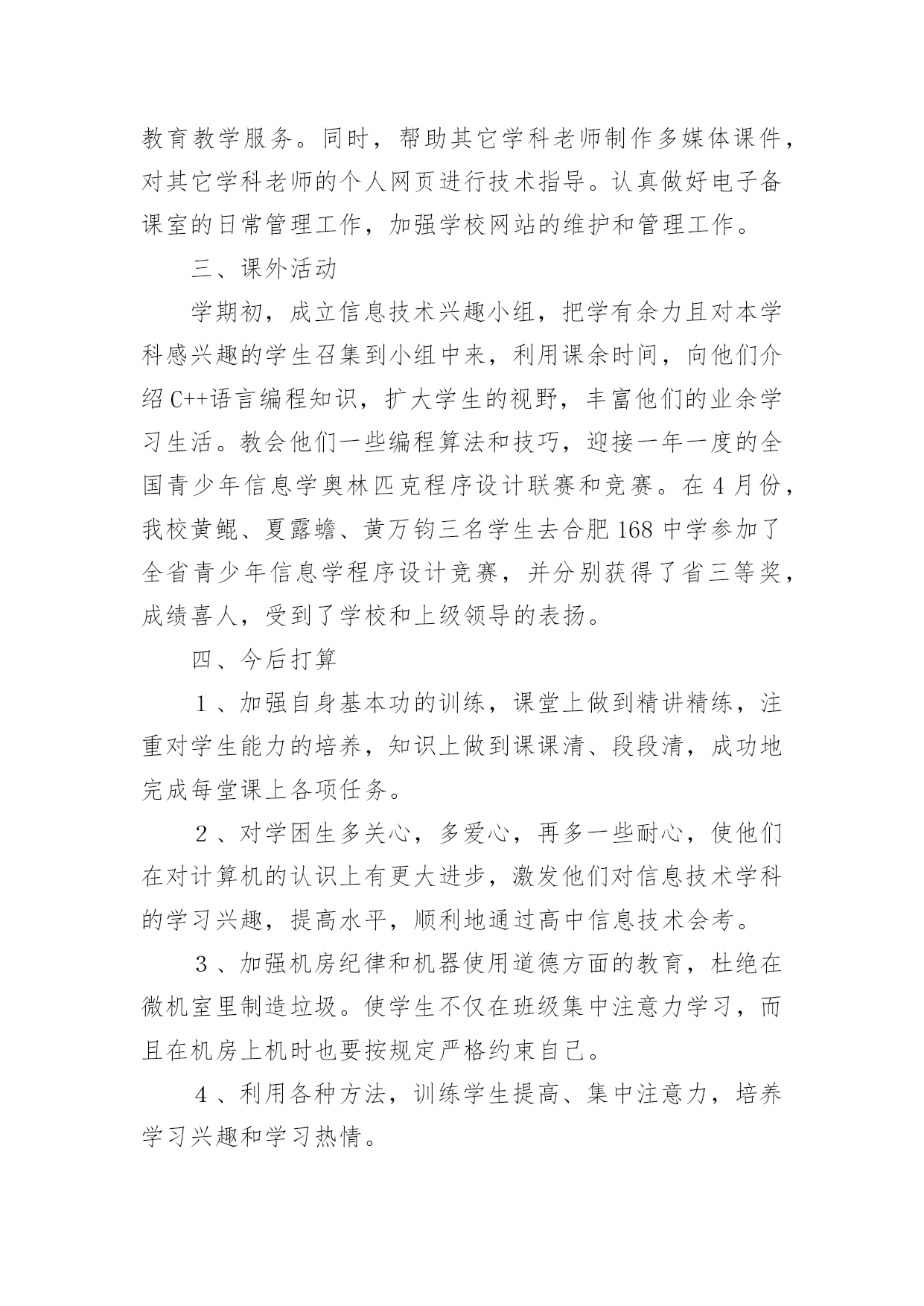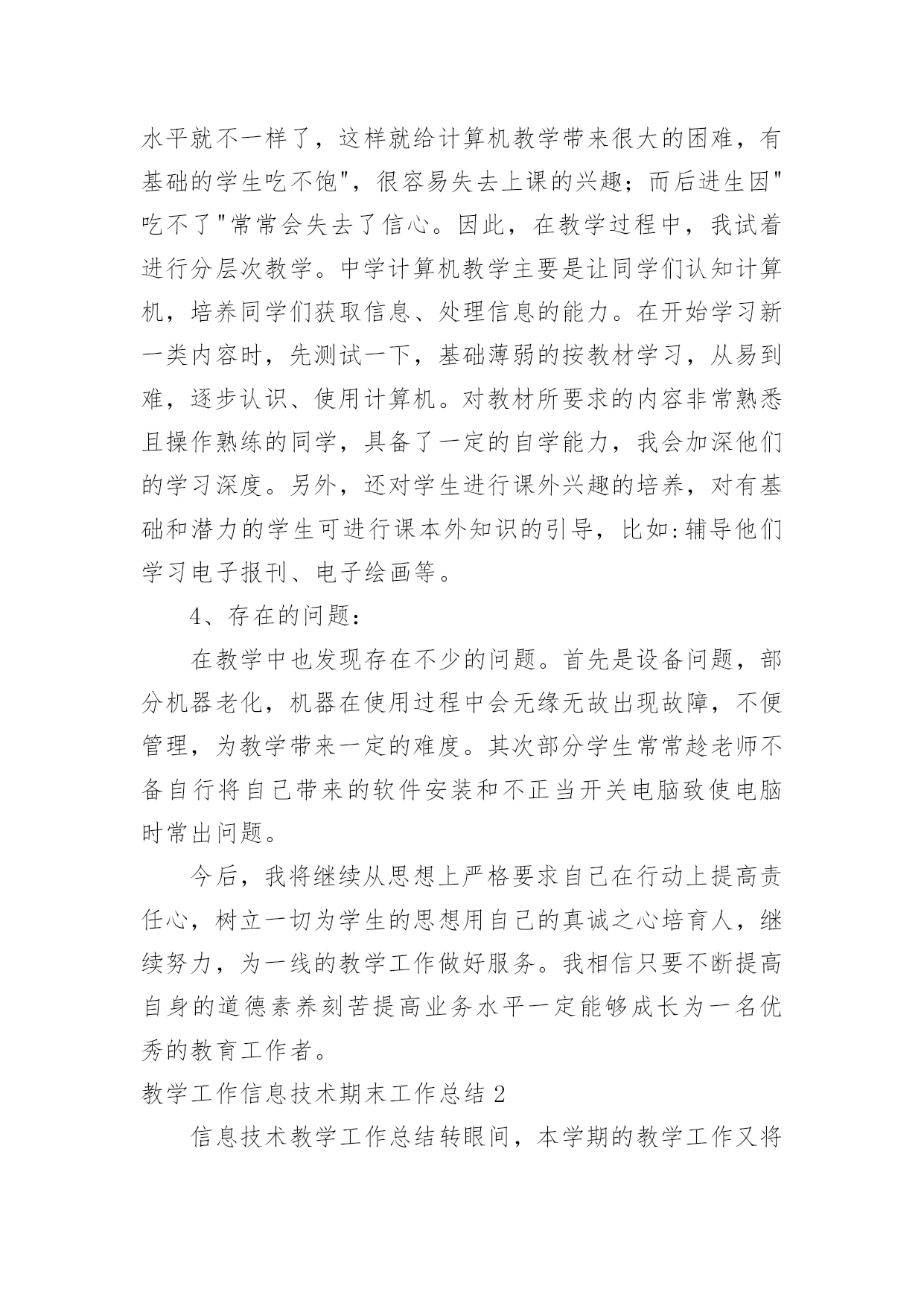 教学工作信息技术期末工作总结教学工作信息技术期末工作总结总结是对某一特定时间段内的学习和工作生活等表现情况加以回顾和分析的一种书面材料,它可以提升我们发现问题的能力,因此我们需要回头归纳,写一份总结了。那么你知道总结如何写吗?下面是小编为大家整理的教学工作信息技术期末工作总结,欢迎大家借鉴与参考,希望对大家有所帮助。教学工作信息技术期末工作总结1与其它必修课相比,信息技术课程的最大特点是一门集知识性和技能性于一体的基础性课程。课堂形式灵活,授课不易掌控。作为一名信息技术课的教师,最理想的教学境界就是让学生既有知识又有技能。回顾一年来的工作和学习,体会颇多,在学校领导关心、支持和鼓励下,在同事们的帮助,支持和积极配合下,我圆满地完成了预期的工作目标和任务,工作在忙碌中收获,我在收获中得到了成长,这一切都激励着我继续奋进。为让学生了解和掌握信息技术的基本知识和技能,提高学生科学文化素质结合我校实际教学需要及校领导下达的教学任务。现将我任信息技术教学工作和主控室日常工作做如下总结:1、边讲边练计算机学科是实践性非常强的学科,强调学生操作能力的`培养。如果在教学过程中教师只是讲授理论知识,而不给学生充分的练习时间,计算机教学就失去了它的意义;反之,教师不讲,只让学生盲目的上机练习,学习效率很难得以保证,并且很多中学生的心理比较脆弱,自学能力较差,面对一无所知的新知识茫然无措,上过一、两节这样满头雾水的课之后,就会失去对该课程的兴趣。所以一堂课我一般只安排10—15分钟进行讲解、示范,按照需要,该堂课的内容可以一次讲完,也可以分几次进行、讲完一个问题就让学生实践一下,等他们掌握以后再讲下一个知识点。这样每堂课讲授的知识学生们都能应用于实践并得到巩固,最后达到熟练掌握。2、精讲多练讲课内容根据学生的实际水平作出适当调整,力求精讲、少讲,仅把同学们普遍感到陌生的知识点及难点作为主要内容来讲,例如在讲到“超链接”时,我就把所以要涉及到这一操作的操作都提出来,这样可以节约很多时间又把握住了重点,让学生重视起来。把时间最大限度的放给学生去操作实习,实践证明,学生在操作时提出的问题远比讲理论时提出的问题要多得多,这说明操作实践有效地促进了学生作为学习主体积极主动的思考。3、分层次教学。目前,计算机在家庭中基本普及,大部分同学都用过,玩过计算机,只有少部分同学从来没碰过计算机,这样学生们有了一定的计算机使用基础,但仅限于游戏,娱乐等,而在应用计算机制作办公文档时,学生们的水平就不一样了,这样就给计算机教学带来很大的困难,有基础的学生吃不饱",很容易失去上课的兴趣;而后进生因"吃不了"常常会失去了信心。因此,在教学过程中,我试着进行分层次教学。中学计算机教学主要是让同学们认知计算机,培养同学们获取信息、处理信息的能力。在开始学习新一类内容时,先测试一下,基础薄弱的按教材学习,从易到难,逐步认识、使用计算机。对教材所要求的内容非常熟悉且操作熟练的同学,具备了一定的自学能力,我会加深他们的学习深度。另外,还对学生进行课外兴趣的培养,对有基础和潜力的学生可进行课本外知识的引导,比如:辅导他们学习电子报刊、电子绘画等。4、存在的问题:在教学中也发现存在不少的问题。首先是设备问题,部分机器老化,机器在使用过程中会无缘无故出现故障,不便管理,为教学带来一定的难度。其次部分学生常常趁老师不备自行将自己带来的软件安装和不正当开关电脑致使电脑时常出问题。今后,我将继续从思想上严格要求自己在行动上提高责任心,树立一切为学生的思想用自己的真诚之心培育人,继续努力,为一线的教学工作做好服务。我相信只要不断提高自身的道德素养刻苦提高业务水平一定能够成长为一名优秀的教育工作者。教学工作信息技术期末工作总结2信息技术教学工作总结转眼间,本学期的教学工作又将接近尾声了,现将自己本学期的收获和感想做个简单的工作总结,帮组梳理下自己的教学工作,希望在今后的工作上有所提高。同样的,本学期我还是担任三到六年级信息技术的教学工作,在有了过去一年多的工作的铺垫,本学期的各项工作开展起来要顺利多了,收获了一些小小的教学经验。但是同时也深感自己的压力越来越大,在不断的摸索中教学,也开始越发多的发现自己的不足,通过教学工作使我深刻地认识到信息技术课程的地位和作用,对信息技术的发展有了正确的认识,它既是基础教育课程改革和发展的需要,又是小学素质教育工程的重要内容。下面我就总结一下这学期事信息技术教学的心得体会。一、教学方面:1、备课开学初,根据学校要求,认真写好教学计划,提前备好课,写好教案。平时做到周前备课。备课时认真钻研教材,虚心向其他教师学习、请教。力求吃透教材,找准重点、难点。2、上课上好课的前提是做好课前准备,不打无准备之仗,尤其本学科主要课程都要上机完成,因此每节课前都要认真做好上机备课