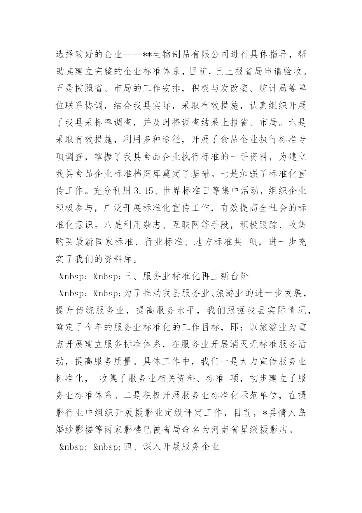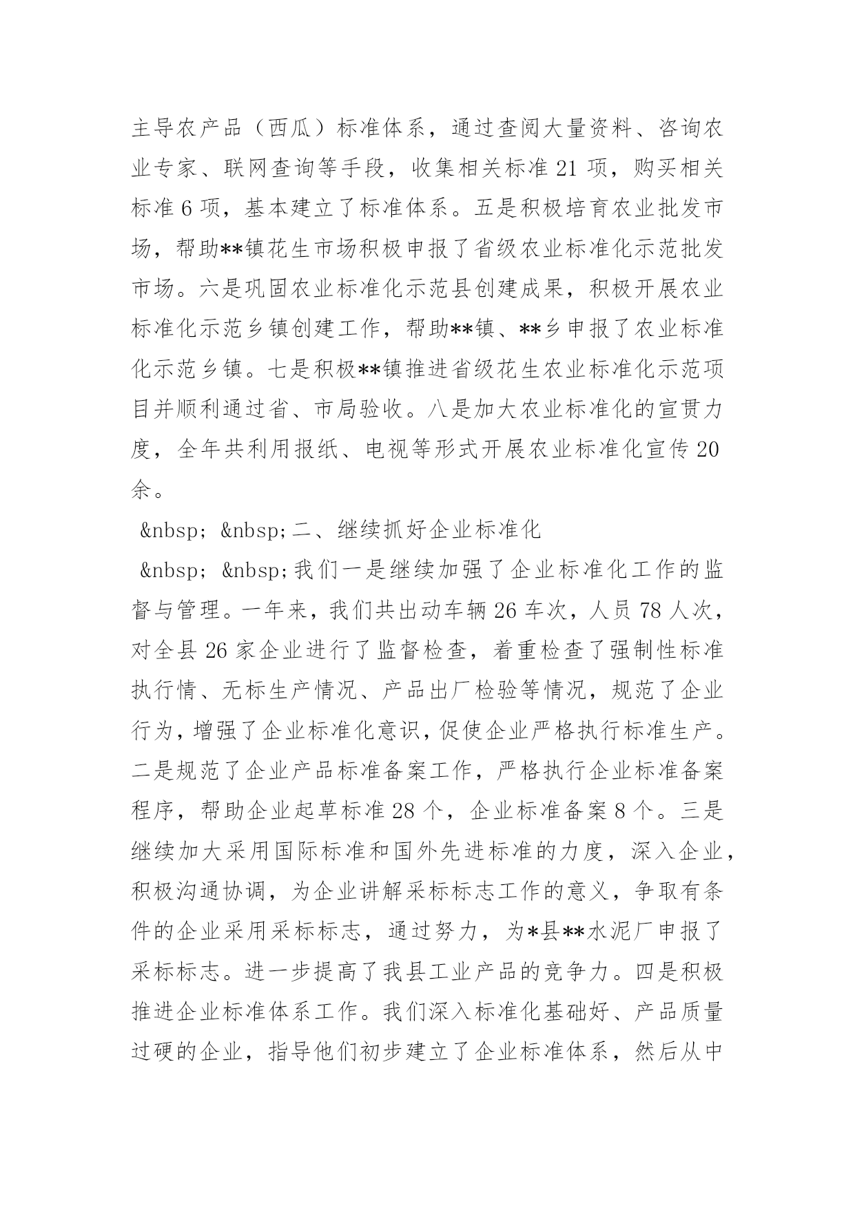 XX年县局标准化工作总结-工作总结XX年县局标准化工作总结-工作总结范文 XX年,标准化管理股在局党组的正确领导下,认真实践“三个代表”重要思想,以“三个面向,一个围绕”为指导,圆满完成了上级下达的各项工作目标,现将标准化各项工作情况总结如下: 一、大力推进农业标准化 在农业标准化工作方面,我们采用了“请进来,走出去”的方法,即:经常请省、市局领导、专家来我县进行指导;“积极参加省、市局组织的业务培训,积极到农业标准化工作突出的兄弟单位如**县等去学习。同时,将学习到的先进经验同我县实际相结合,大力推进农业标准化工作,取得了良好的效果。XX年,我们一是成立了*县农业标准化工作领导小组,健全了工作机构,为下一步顺利开展农业标准化工作提供了组织保障。二是按计划积极推进国家级、省级优质小麦农业标准化示范项目,并以*县人民政府文件“*政文[XX]47号”下发了国家级省级农业标准化优质小麦示范项目实施方案。三是主动上门,与各乡镇联系协调,由**镇申报了《钜桥镇标准化西瓜示范基地》市级农业标准化示范项目,并进行了示范建设工作。四是基本完成了市级主导农产品(西瓜)标准体系,通过查阅大量资料、咨询农业专家、联网查询等手段,收集相关标准21项,购买相关标准6项,基本建立了标准体系。五是积极培育农业批发市场,帮助**镇花生市场积极申报了省级农业标准化示范批发市场。六是巩固农业标准化示范县创建成果,积极开展农业标准化示范乡镇创建工作,帮助**镇、**乡申报了农业标准化示范乡镇。七是积极**镇推进省级花生农业标准化示范项目并顺利通过省、市局验收。八是加大农业标准化的宣贯力度,全年共利用报纸、电视等形式开展农业标准化宣传20余。 二、继续抓好企业标准化 我们一是继续加强了企业标准化工作的监督与管理。一年来,我们共出动车辆26车次,人员78人次,对全县26家企业进行了监督检查,着重检查了强制性标准执行情、无标生产情况、产品出厂检验等情况,规范了企业行为,增强了企业标准化意识,促使企业严格执行标准生产。二是规范了企业产品标准备案工作,严格执行企业标准备案程序,帮助企业起草标准28个,企业标准备案8个。三是继续加大采用国际标准和国外先进标准的力度,深入企业,积极沟通协调,为企业讲解采标标志工作的意义,争取有条件的企业采用采标标志,通过努力,为*县**水泥厂申报了采标标志。进一步提高了我县工业产品的竞争力。四是积极推进企业标准体系工作。我们深入标准化基础好、产品质量过硬的企业,指导他们初步建立了企业标准体系,然后从中选择较好的企业——**生物制品有限公司进行具体指导,帮助其建立完整的企业标准体系,目前,已上报省局申请验收。五是按照省、市局的工作安排,积极与发改委、统计局等单位联系协调,结合我县实际,采取有效措施,认真组织开展了我县采标率调查,并及时将调查结果上报省、市局。六是采取有效措施,利用多种途径,开展了食品企业执行标准专项调查,掌握了我县食品企业执行标准的一手资料,为建立我县食品企业标准档案库奠定了基础。七是加强了标准化宣传工作。充分利用3.15、世界标准日等集中活动,组织企业积极参与,广泛开展标准化宣传工作,有效提高全社会的标准化意识。八是利用杂志、互联网等手段,积极跟踪、收集购买最新国家标准、行业标准、地方标准共项,进一步充实了我们的资料库。 三、服务业标准化再上新台阶 为了推动我县服务业、旅游业的进一步发展,提升传统服务业,提高服务水平,我们跟据我县实际情况,确定了今年的服务业标准化的工作目标,即:以旅游业为重点开展建立服务标准体系,在服务业开展消灭无标准服务活动,提高服务质量。具体工作中,我们一是大力宣传服务业标准化,收集了服务业相关资料、标准项,初步建立了服务业标准体系。二是积极开展服务业标准化示范单位,在摄影行业中组织开展摄影业定级评定工作,目前,*县情人岛婚纱影楼等两家影楼已被省局命名为河南省星级摄影店。 四、深入开展服务企业 我们按照109号文件精神,深入开展服务企业工作,并利用每月26日的集中服务日,主动上门服务企业。确定***厂为我股的重点服务对象,对其开展全方位服务工作。全年共深入企业开展集中服务15次,为企业提供标准修订、查询等服务20多次,受到了企业的好评。