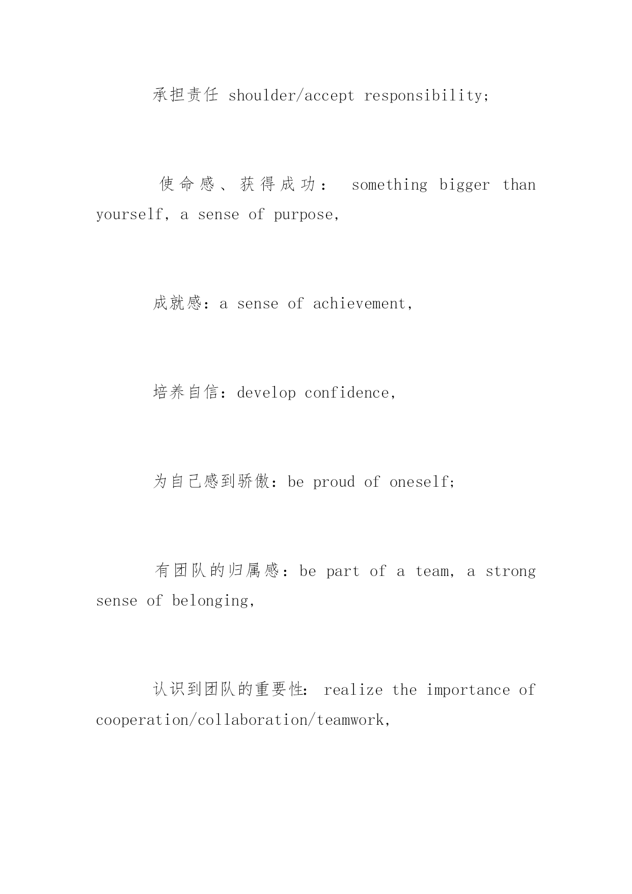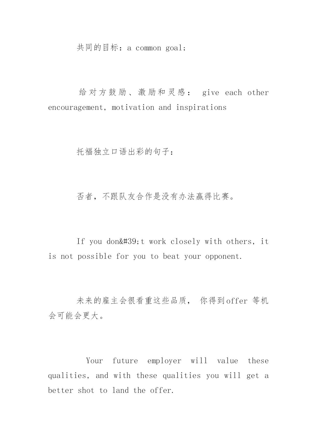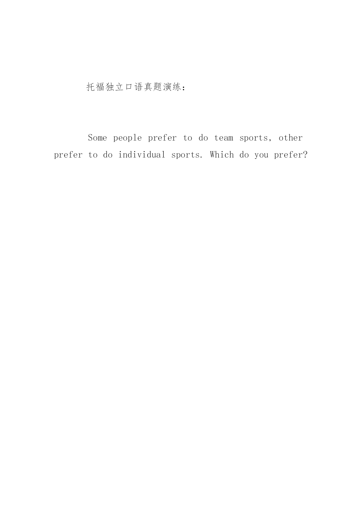 托福独立口语真题练习:体育与合作托福独立口语真题练习:体育与合作引言:还在为托福考试熬夜奋战的.小伙伴们看过来!为了帮助你们更好进行复习,小编特地整理了历年考试真题,先提前预祝大家考试顺利!如想了解更多内容欢迎关注应届毕业生网。托福独立口语真题:体育与合作必杀短语:加深跟队友的感情:connectwith/bondwithteammate,承担责任shoulder/acceptresponsibility;使命感、获得成功:somethingbiggerthanyourself,asenseofpurpose,成就感:asenseofachievement,培养自信:developconfidence,为自己感到骄傲:beproudofoneself;有团队的归属感:bepartofateam,astrongsenseofbelonging,认识到团队的重要性:realizetheimportanceofcooperation/collaboration/teamwork,共同的目标:acommongoal;给对方鼓励、激励和灵感:giveeachotherencouragement,motivationandinspirations托福独立口语出彩的句子:否者,不跟队友合作是没有办法赢得比赛。Ifyoudon'tworkcloselywithothers,itisnotpossibleforyoutobeatyouropponent.未来的雇主会很看重这些品质,你得到offer等机会可能会更大。Yourfutureemployerwillvaluethesequalities,andwiththesequalitiesyouwillgetabettershottolandtheoffer.托福独立口语真题演练:Somepeopleprefertodoteamsports,otherprefertodoindividualsports.Whichdoyouprefer?