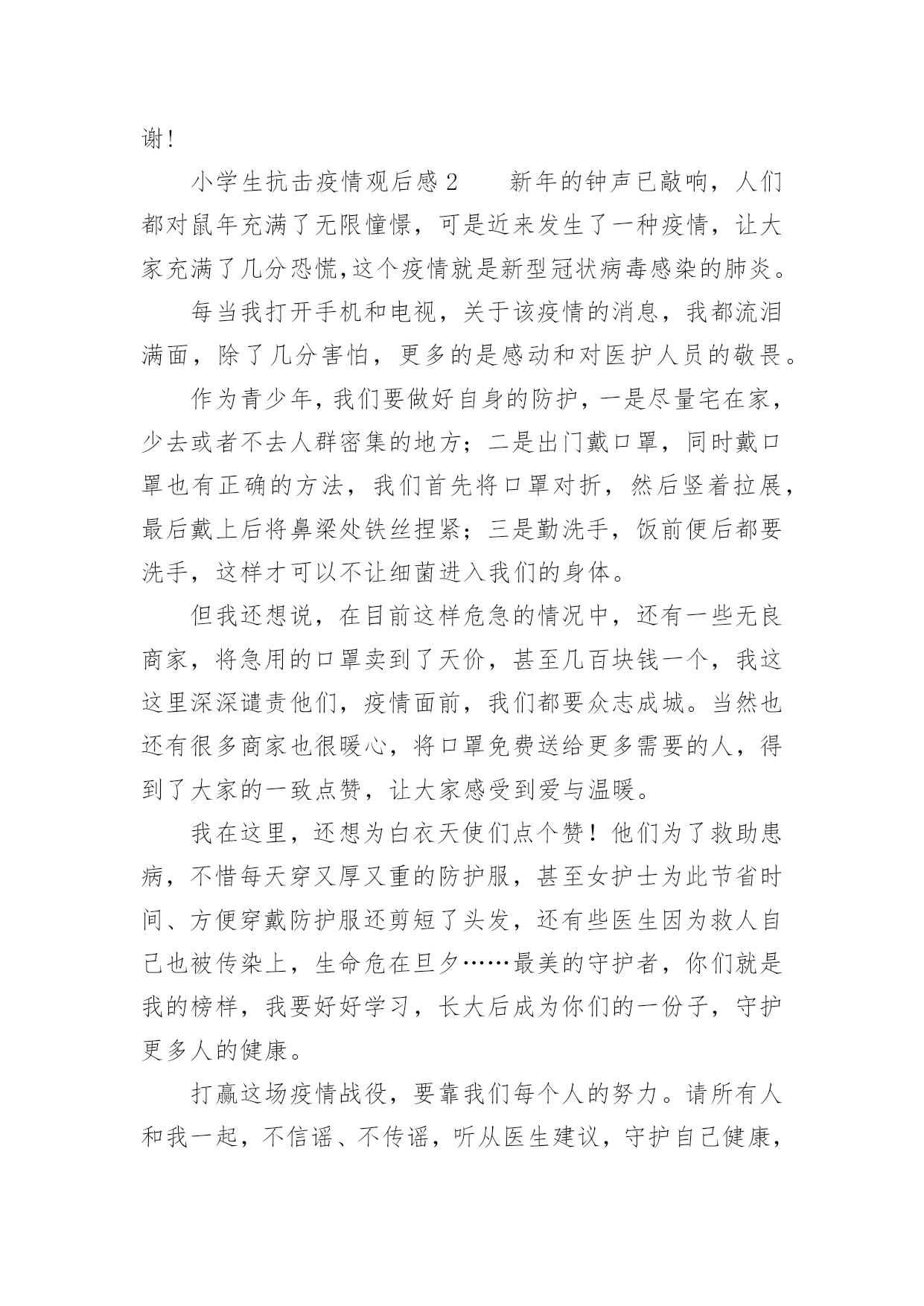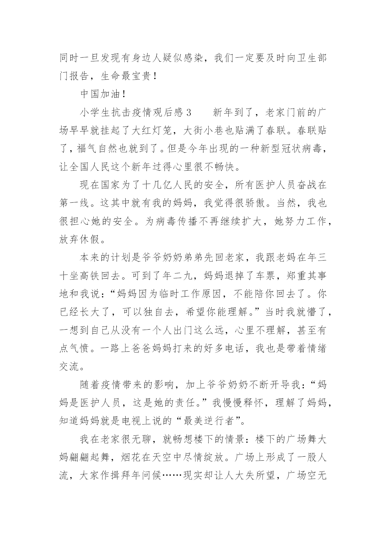 小学生抗击疫情观后感小学生抗击疫情观后感青春就是一次一次的蝶变,卖萌的00后也可以担起中国的未来的。下面是小编收集整理的小学生抗击疫情观后感300字,欢迎阅读参考!小学生抗击疫情观后感1以前热闹的街市,现已空无一人。被疫情吓坏的人们,已经在家里度过了十多天。但是,有一些战士们,永远都在前线战斗着。被感染和被隔离的人,在病房中,是谁在与它们身上的病毒斗争?是医生,是白衣战士,他们不是英雄,也不是穿着铠甲,披着斗篷。他们只戴着口罩,穿着隔离衣,拿着自己的工具,去挽救一个个生命。他们日夜奋战,疲惫不堪,但是他们没有说放弃。每救一个人,他们会无比开心、无比自豪。钟南山院士的智慧,帮助我们走出困境,带着我们走进成功之门。而一些护士、大夫的'殉职,也令我们无比地悲哀。还有一些战士,他们不再拿着警棍,而是拿起了体温计,为了别人,宁愿放弃自己的幸福,坚守在岗位上,给回家的人们一份安全感,可陪伴他们的,只有孤独。他们勇敢地“战斗”在第一线,毫不畏惧地与病魔做斗。我们只有“呆”在家中,才是对他们的帮助。谢谢你们,就是因为有你们在,我们才能打败病毒。谢谢!小学生抗击疫情观后感2新年的钟声已敲响,人们都对鼠年充满了无限憧憬,可是近来发生了一种疫情,让大家充满了几分恐慌,这个疫情就是新型冠状病毒感染的肺炎。每当我打开手机和电视,关于该疫情的消息,我都流泪满面,除了几分害怕,更多的是感动和对医护人员的敬畏。作为青少年,我们要做好自身的防护,一是尽量宅在家,少去或者不去人群密集的地方;二是出门戴口罩,同时戴口罩也有正确的方法,我们首先将口罩对折,然后竖着拉展,最后戴上后将鼻梁处铁丝捏紧;三是勤洗手,饭前便后都要洗手,这样才可以不让细菌进入我们的身体。但我还想说,在目前这样危急的情况中,还有一些无良商家,将急用的口罩卖到了天价,甚至几百块钱一个,我这这里深深谴责他们,疫情面前,我们都要众志成城。当然也还有很多商家也很暖心,将口罩免费送给更多需要的人,得到了大家的一致点赞,让大家感受到爱与温暖。我在这里,还想为白衣天使们点个赞!他们为了救助患病,不惜每天穿又厚又重的防护服,甚至女护士为此节省时间、方便穿戴防护服还剪短了头发,还有些医生因为救人自己也被传染上,生命危在旦夕……最美的守护者,你们就是我的榜样,我要好好学习,长大后成为你们的一份子,守护更多人的健康。打赢这场疫情战役,要靠我们每个人的努力。请所有人和我一起,不信谣、不传谣,听从医生建议,守护自己健康,同时一旦发现有身边人疑似感染,我们一定要及时向卫生部门报告,生命最宝贵!中国加油!小学生抗击疫情观后感3新年到了,老家门前的广场早早就挂起了大红灯笼,大街小巷也贴满了春联。春联贴了,福气自然也就到了。但是今年出现的一种新型冠状病毒,让全国人民这个新年过得心里很不畅快。现在国家为了十几亿人民的安全,所有医护人员奋战在第一线。这其中就有我的妈妈,我觉得很骄傲。当然,我也很担心她的安全。为病毒传播不再继续扩大,她努力工作,放弃休假。本来的计划是爷爷奶奶弟弟先回老家,我跟老妈在年三十坐高铁回去。可到了年二九,妈妈退掉了车票,郑重其事地和我说:“妈妈因为临时工作原因,不能陪你回去了。你已经长大了,可以独自去,希望你能理解。”当时我就懵了,一想到自己从没有一个人出门这么远,心里不理解,甚至有点气愤。一路上爸爸妈妈打来的好多电话,我也是带着情绪交流。随着疫情带来的影响,加上爷爷奶奶不断开导我:“妈妈是医护人员,这是她的责任。”我慢慢释怀,理解了妈妈,知道妈妈就是电视上说的“最美逆行者”。我在老家很无聊,就畅想楼下的情景:楼下的广场舞大妈翩翩起舞,烟花在天空中尽情绽放。广场上形成了一股人流,大家作揖拜年问候……现实却让人大失所望,广场空无一人。我一探脑袋,大声嚷道:“爷爷奶奶,今年广场怎么一个人都没有,我在家里难受啊!我想同学们了,真希望早点开学。”家里最欢快的,就数我那两岁的弟弟了。他时而冲出房间,时而扯着奶奶,时而拽着我。因为他,疫情好像并不存在,大家都沉浸在过年的喜悦中。年夜饭上桌了,虽然比不了大酒店的色香味俱全,爷爷也准备了一天。辛辛苦苦做的一桌子菜,都是我喜欢吃的。我有时候在想:过年到底图什么?不就是图个团圆嘛。现在我深有体会了,妈妈舍小家为大家,虽不在身边,但是我心里觉得很幸福,也很光荣。我能做的就是减少出门,不去人多的地方。只要勤洗手,不去找病毒,病毒自然也不会来找我们。最后,我想对在外的爸爸妈妈说一声:“新年快乐,我爱你们!”