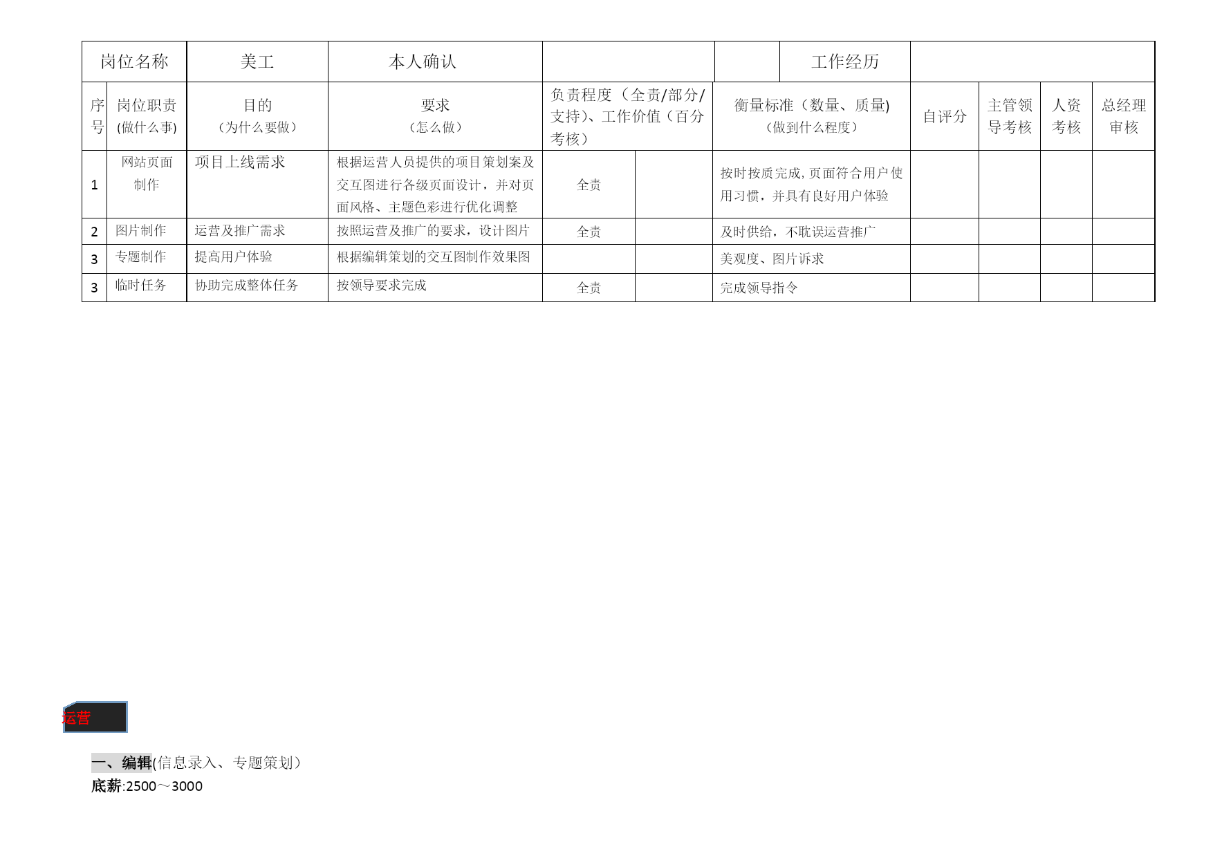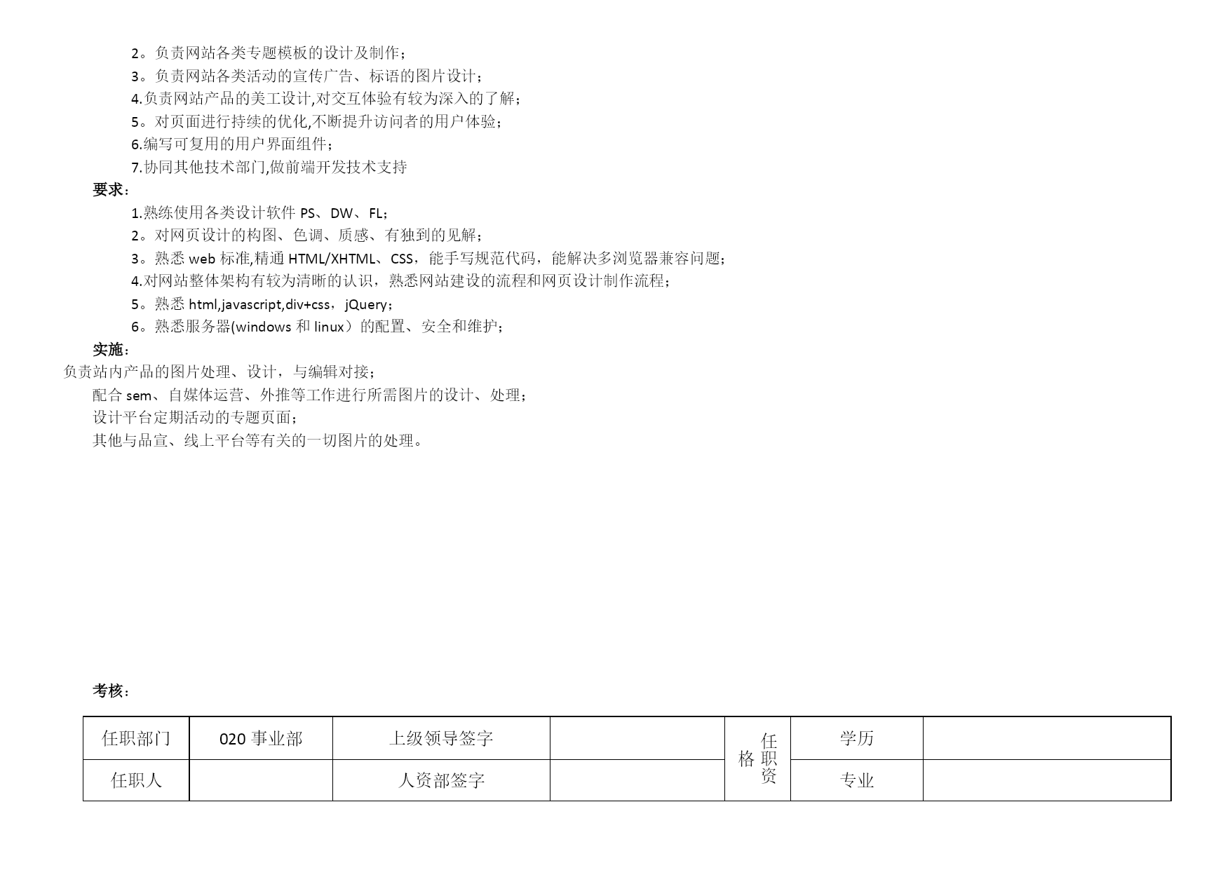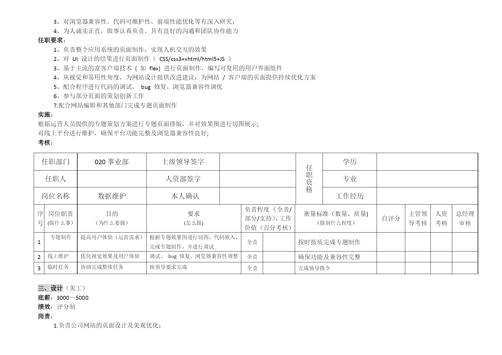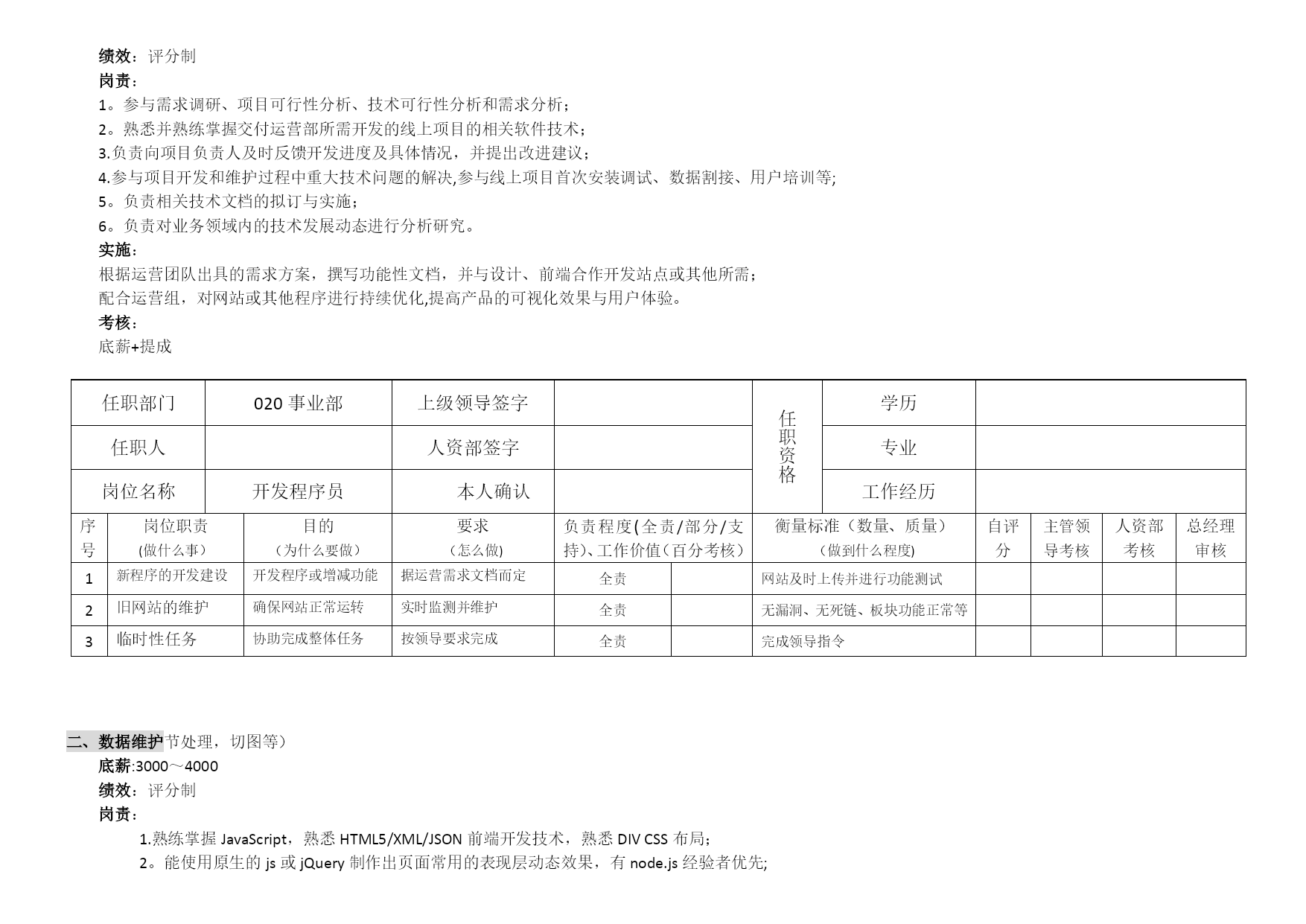 网络部运营组织架构及绩效考核标准(可以直接使用,可编辑优秀版资料,欢迎下载)网络部运营组织架构-———运营经理-张洪组织框架:技术一、开发(程序开发、PHP方向)底薪:5000~7000绩效:评分制岗责:1。参与需求调研、项目可行性分析、技术可行性分析和需求分析;2。熟悉并熟练掌握交付运营部所需开发的线上项目的相关软件技术;3.负责向项目负责人及时反馈开发进度及具体情况,并提出改进建议;4.参与项目开发和维护过程中重大技术问题的解决,参与线上项目首次安装调试、数据割接、用户培训等;5。负责相关技术文档的拟订与实施;6。负责对业务领域内的技术发展动态进行分析研究。实施:根据运营团队出具的需求方案,撰写功能性文档,并与设计、前端合作开发站点或其他所需;配合运营组,对网站或其他程序进行持续优化,提高产品的可视化效果与用户体验。考核:底薪+提成任职部门020事业部上级领导签字任职资格学历任职人人资部签字专业岗位名称开发程序员本人确认工作经历序号岗位职责(做什么事)目的(为什么要做)要求(怎么做)负责程度(全责/部分/支持)、工作价值(百分考核)衡量标准(数量、质量)(做到什么程度)自评分主管领导考核人资部考核总经理审核1新程序的开发建设开发程序或增减功能据运营需求文档而定全责网站及时上传并进行功能测试2旧网站的维护确保网站正常运转实时监测并维护全责无漏洞、无死链、板块功能正常等3临时性任务协助完成整体任务按领导要求完成全责完成领导指令二、数据维护节处理,切图等)底薪:3000~4000绩效:评分制岗责:1.熟练掌握JavaScript,熟悉HTML5/XML/JSON前端开发技术,熟悉DIVCSS布局;2。能使用原生的js或jQuery制作出页面常用的表现层动态效果,有node.js经验者优先;3。对浏览器兼容性、代码可维护性、前端性能优化等有深入研究;4。为人诚实正直,做事认真负责,具有良好的沟通和团队协作能力任职要求:1。负责整个应用系统的页面制作、实现人机交互的效果2。对UI设计的结果进行页面制作(CSS/css3+xhtml/html5+JS)3。基于主流的富客户端技术(如flex)进行页面制作,编写可复用的用户界面组件4。从视觉和易用性角度,为网站设计提供改进建议,为网站/客户端的页面提供持续优化方案5。配合程序进行代码的调试、bug修复、浏览器兼容性调优6。参与部分页面的策划创新工作7.配合网站编辑和其他部门完成专题页面制作实施:根据运营人员提供的专题策划方案进行专题页面排版,并对效果图进行切图展示;对线上平台进行维护,确保平台功能完整及浏览器兼容性良好;考核:任职部门020事业部上级领导签字任职资格学历任职人人资部签字专业岗位名称数据维护本人确认工作经历序号岗位职责(做什么事)目的(为什么要做)要求(怎么做)负责程度(全责/部分/支持)、工作价值(百分考核)衡量标准(数量、质量)(做到什么程度)自评分主管领导考核人资考核总经理审核1专题制作提高用户体验(运营需求)根据专题效果图进行切图、代码嵌入,完成专题制作,并进行调试全责按时按质完成专题制作2线上维护优化视觉效果及用户体验调试、bug修复、浏览器兼容性调整全责确保功能及兼容性完整3临时任务协助完成整体任务按领导要求完成全责完成领导指令三、设计(美工)底薪:3000~5000绩效:评分制岗责:1.负责公司网站的页面设计及美观优化;2。负责网站各类专题模板的设计及制作;3。负责网站各类活动的宣传广告、标语的图片设计;4.负责网站产品的美工设计,对交互体验有较为深入的了解;5。对页面进行持续的优化,不断提升访问者的用户体验;6.编写可复用的用户界面组件;7.协同其他技术部门,做前端开发技术支持要求:1.熟练使用各类设计软件PS、DW、FL;2。对网页设计的构图、色调、质感、有独到的见解;3。熟悉web标准,精通HTML/XHTML、CSS,能手写规范代码,能解决多浏览器兼容问题;4.对网站整体架构有较为清晰的认识,熟悉网站建设的流程和网页设计制作流程;5。熟悉html,javascript,div+css,jQuery;6。熟悉服务器(windows和linux)的配置、安全和维护;实施:负责站内产品的图片处理、设计,与编辑对接;配合sem、自媒体运营、外推等工作进行所需图片的设计、处理;设计平台定期活动的专题页面;其他与品宣、线上平台等有关的一切图片的处理。考核:任职部门020事业部上级领导签字任职资格学历任职人人资部签字专业岗位名称