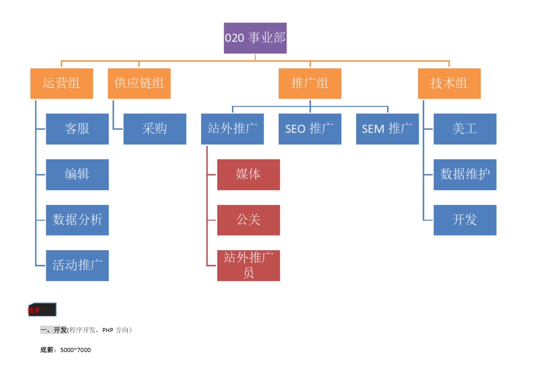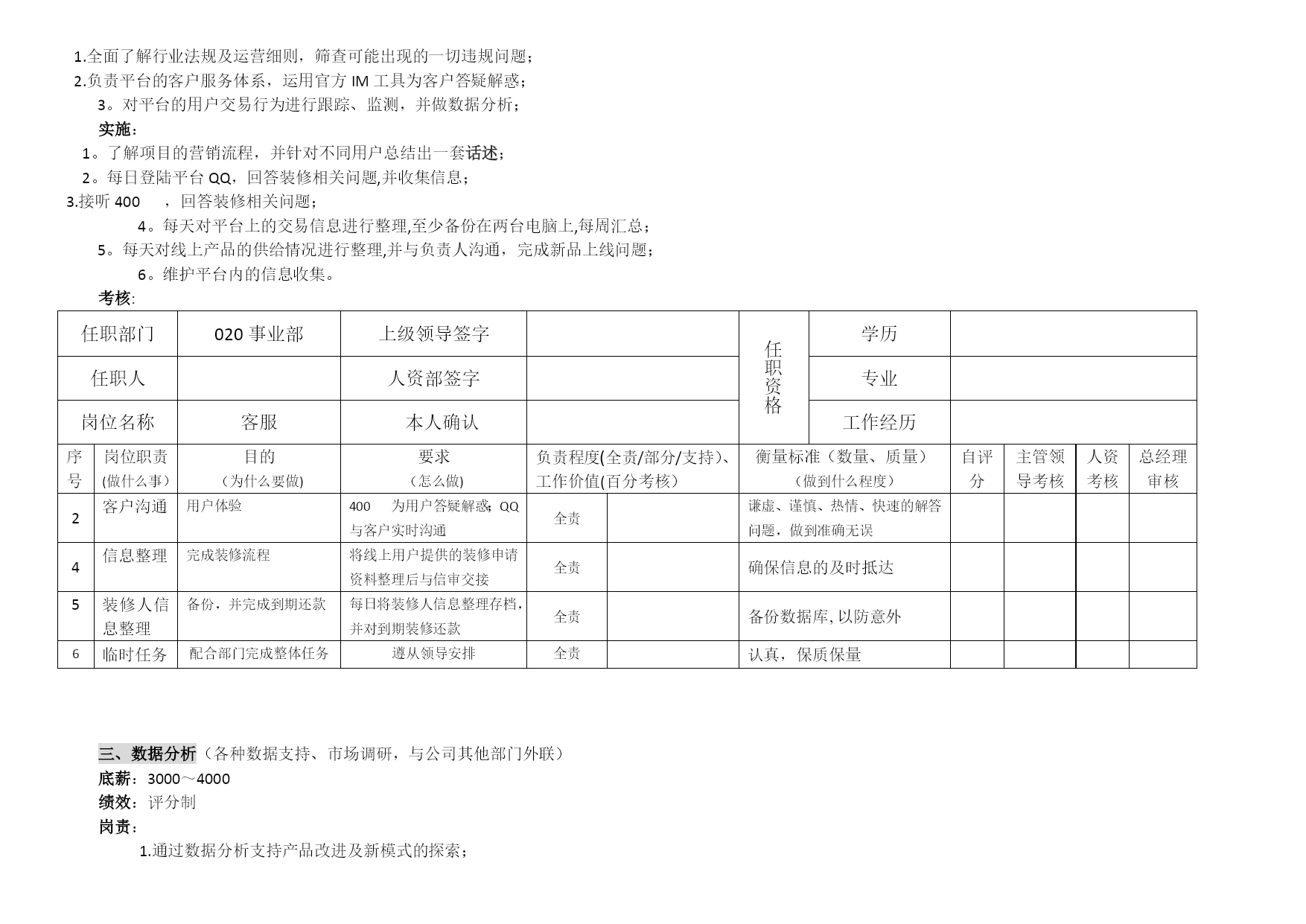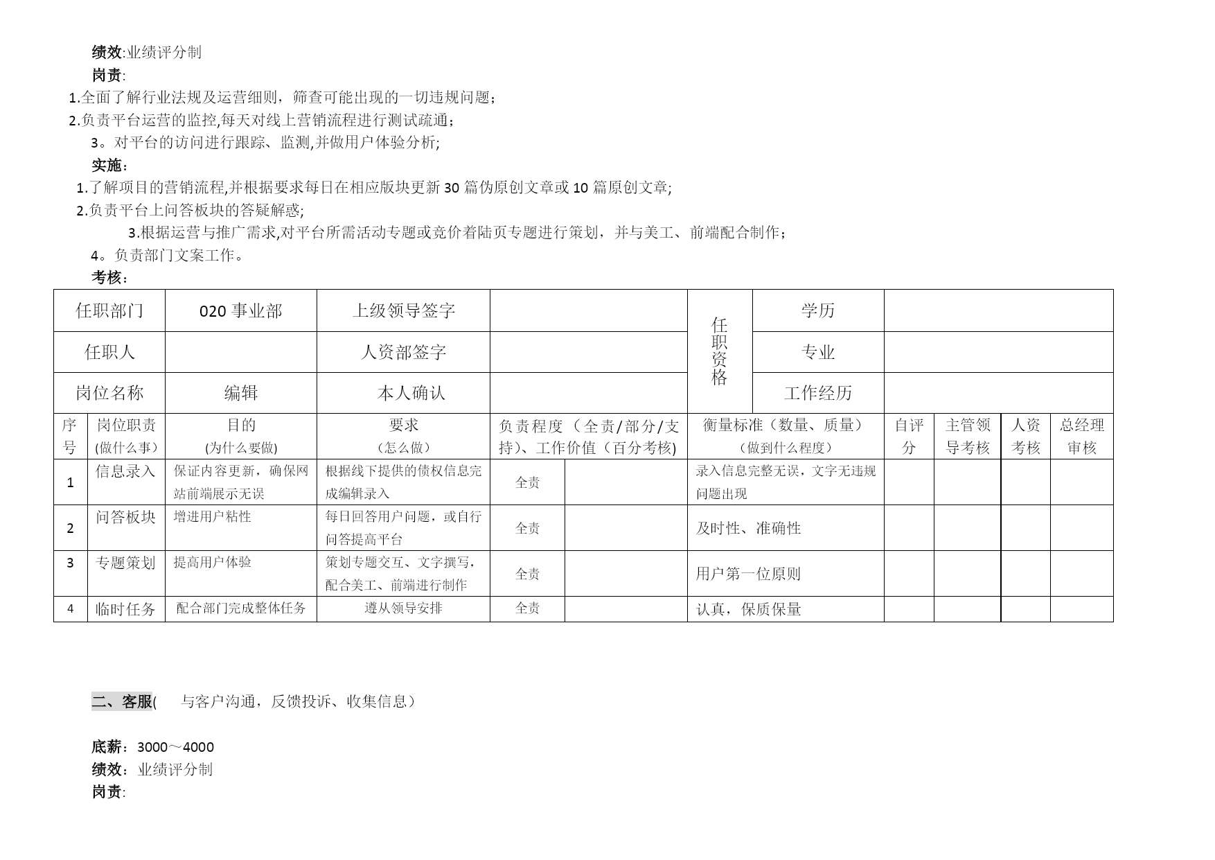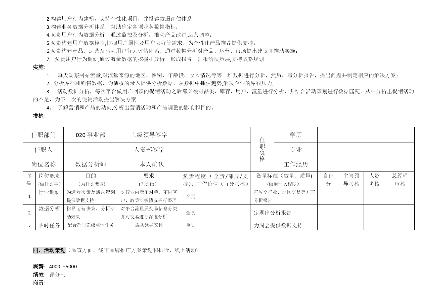 网络部运营组织架构及绩效考核标准(可以直接使用,可编辑优秀版资料,欢迎下载)网络部运营组织架构-———运营经理-张洪组织框架:技术一、开发(程序开发、PHP方向)底薪:5000~7000绩效:评分制岗责:1。参与需求调研、项目可行性分析、技术可行性分析和需求分析;2。熟悉并熟练掌握交付运营部所需开发的线上项目的相关软件技术;3.负责向项目负责人及时反馈开发进度及具体情况,并提出改进建议;4.参与项目开发和维护过程中重大技术问题的解决,参与线上项目首次安装调试、数据割接、用户培训等;5。负责相关技术文档的拟订与实施;6。负责对业务领域内的技术发展动态进行分析研究。实施:根据运营团队出具的需求方案,撰写功能性文档,并与设计、前端合作开发站点或其他所需;配合运营组,对网站或其他程序进行持续优化,提高产品的可视化效果与用户体验。考核:底薪+提成任职部门020事业部上级领导签字任职资格学历任职人人资部签字专业岗位名称开发程序员本人确认工作经历序号岗位职责(做什么事)目的(为什么要做)要求(怎么做)负责程度(全责/部分/支持)、工作价值(百分考核)衡量标准(数量、质量)(做到什么程度)自评分主管领导考核人资部考核总经理审核1新程序的开发建设开发程序或增减功能据运营需求文档而定全责网站及时上传并进行功能测试2旧网站的维护确保网站正常运转实时监测并维护全责无漏洞、无死链、板块功能正常等3临时性任务协助完成整体任务按领导要求完成全责完成领导指令二、数据维护节处理,切图等)底薪:3000~4000绩效:评分制岗责:1.熟练掌握JavaScript,熟悉HTML5/XML/JSON前端开发技术,熟悉DIVCSS布局;2。能使用原生的js或jQuery制作出页面常用的表现层动态效果,有node.js经验者优先;3。对浏览器兼容性、代码可维护性、前端性能优化等有深入研究;4。为人诚实正直,做事认真负责,具有良好的沟通和团队协作能力任职要求:1。负责整个应用系统的页面制作、实现人机交互的效果2。对UI设计的结果进行页面制作(CSS/css3+xhtml/html5+JS)3。基于主流的富客户端技术(如flex)进行页面制作,编写可复用的用户界面组件4。从视觉和易用性角度,为网站设计提供改进建议,为网站/客户端的页面提供持续优化方案5。配合程序进行代码的调试、bug修复、浏览器兼容性调优6。参与部分页面的策划创新工作7.配合网站编辑和其他部门完成专题页面制作实施:根据运营人员提供的专题策划方案进行专题页面排版,并对效果图进行切图展示;对线上平台进行维护,确保平台功能完整及浏览器兼容性良好;考核:任职部门020事业部上级领导签字任职资格学历任职人人资部签字专业岗位名称数据维护本人确认工作经历序号岗位职责(做什么事)目的(为什么要做)要求(怎么做)负责程度(全责/部分/支持)、工作价值(百分考核)衡量标准(数量、质量)(做到什么程度)自评分主管领导考核人资考核总经理审核1专题制作提高用户体验(运营需求)根据专题效果图进行切图、代码嵌入,完成专题制作,并进行调试全责按时按质完成专题制作2线上维护优化视觉效果及用户体验调试、bug修复、浏览器兼容性调整全责确保功能及兼容性完整3临时任务协助完成整体任务按领导要求完成全责完成领导指令三、设计(美工)底薪:3000~5000绩效:评分制岗责:1.负责公司网站的页面设计及美观优化;2。负责网站各类专题模板的设计及制作;3。负责网站各类活动的宣传广告、标语的图片设计;4.负责网站产品的美工设计,对交互体验有较为深入的了解;5。对页面进行持续的优化,不断提升访问者的用户体验;6.编写可复用的用户界面组件;7.协同其他技术部门,做前端开发技术支持要求:1.熟练使用各类设计软件PS、DW、FL;2。对网页设计的构图、色调、质感、有独到的见解;3。熟悉web标准,精通HTML/XHTML、CSS,能手写规范代码,能解决多浏览器兼容问题;4.对网站整体架构有较为清晰的认识,熟悉网站建设的流程和网页设计制作流程;5。熟悉html,javascript,div+css,jQuery;6。熟悉服务器(windows和linux)的配置、安全和维护;实施:负责站内产品的图片处理、设计,与编辑对接;配合sem、自媒体运营、外推等工作进行所需图片的设计、处理;设计平台定期活动的专题页面;其他与品宣、线上平台等有关的一切图片的处理。考核:任职部门020事业部上级领导签字任职资格学历任职人人资部签字专业岗位名称